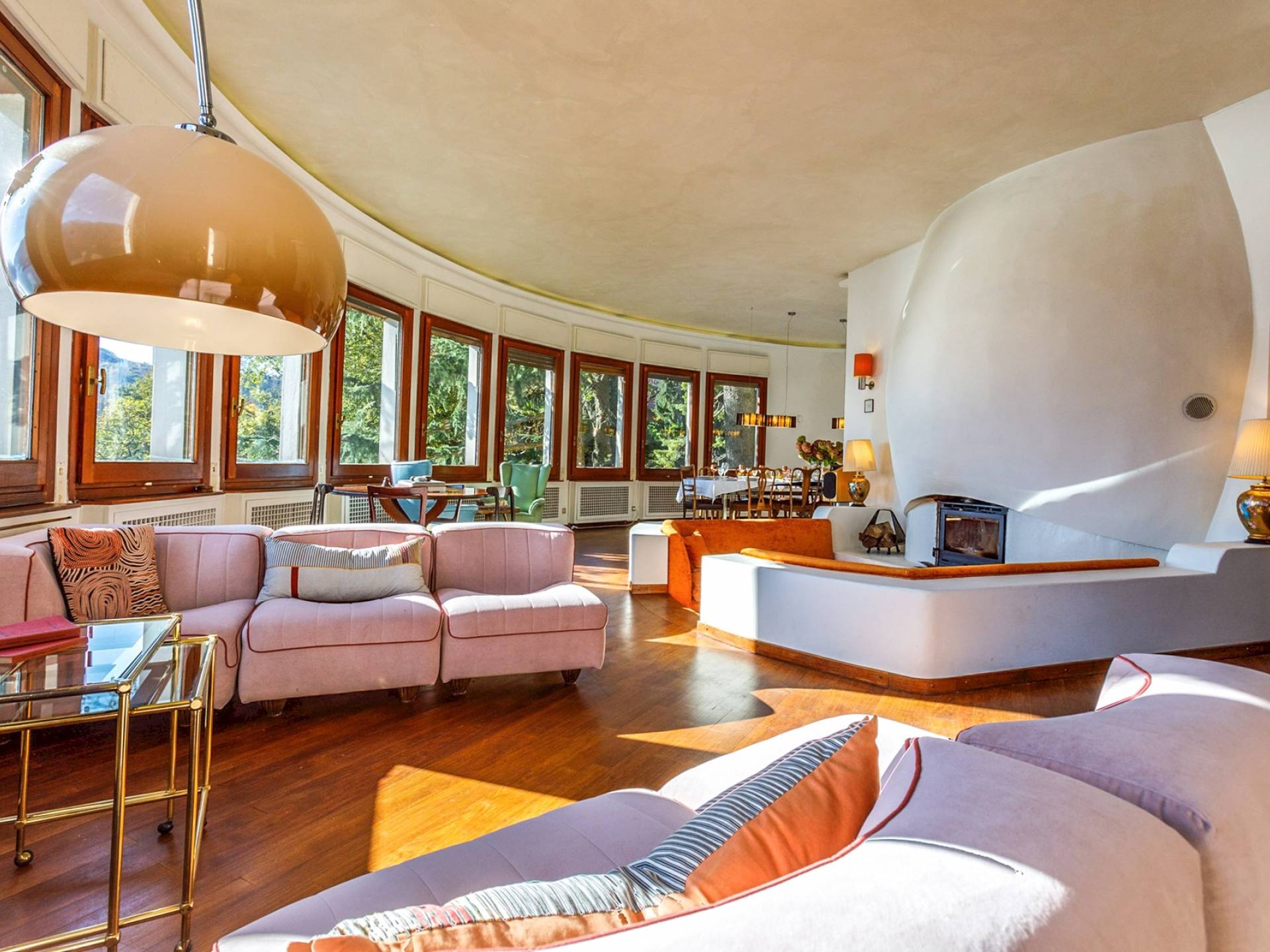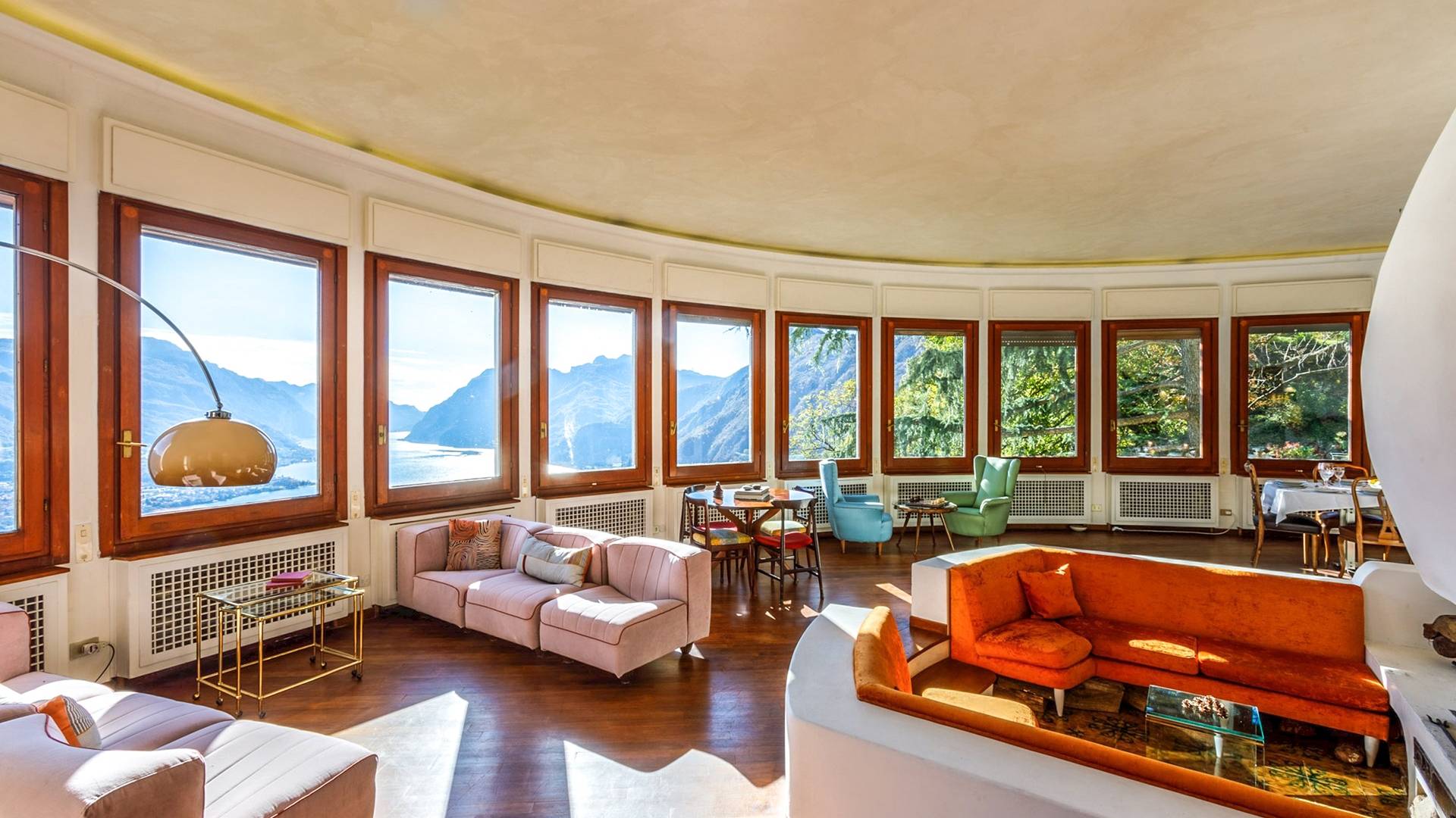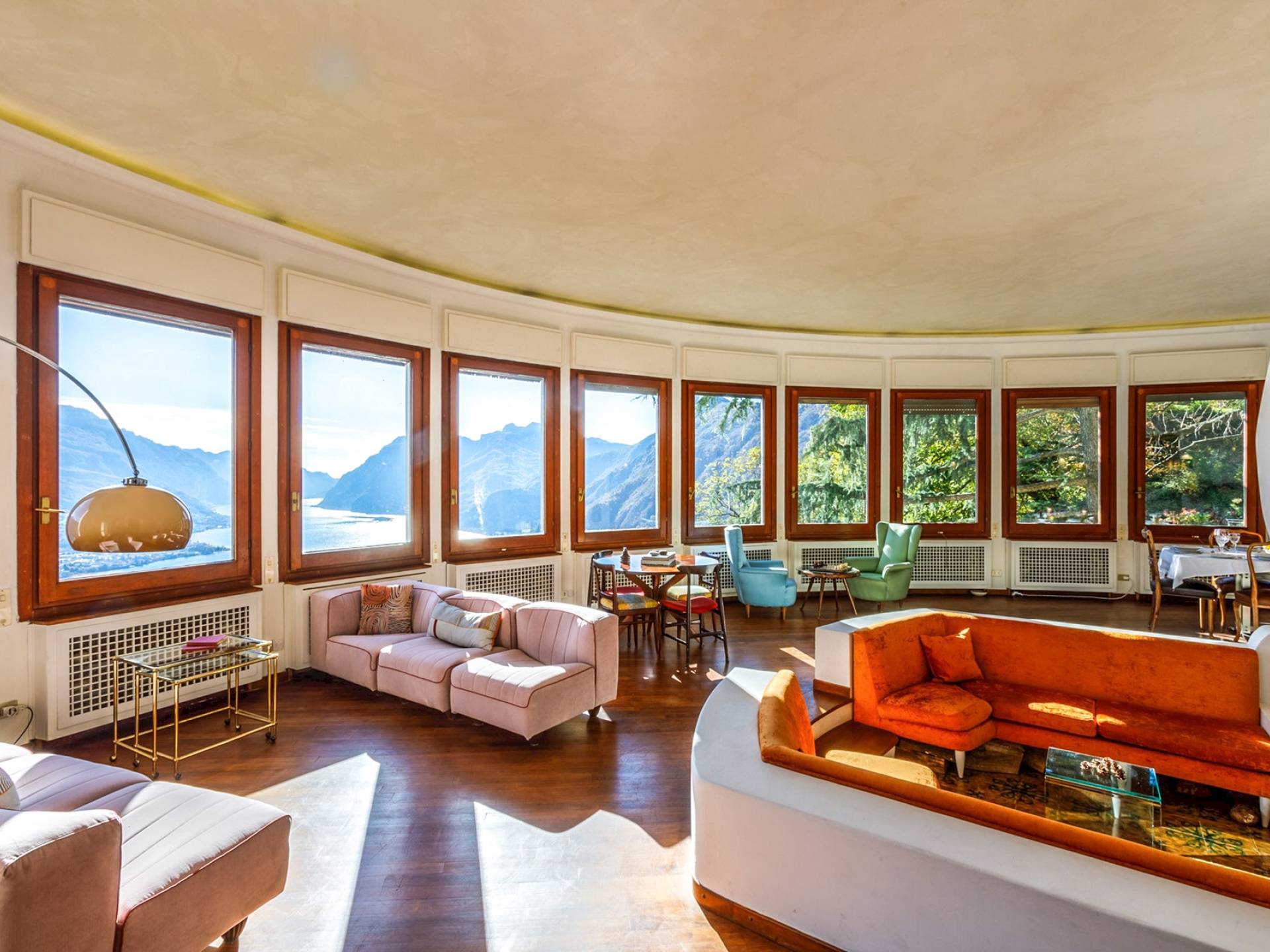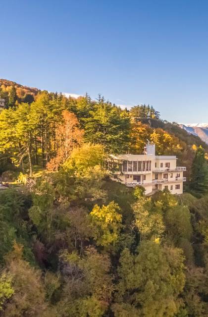Villa escénica y llamativa con piscina e impresionantes vistas al lago, ubicada en un bosque privado en Civenna en el lago de Como. Villa Barbara es una elegante villa de mediados de siglo, privada y profundamente tranquila, pero muy cerca de Bellagio, el punto turístico del lago de Como. Esta villa (400 m²) presenta una fachada curva única y moderna, inspirada en un famoso arquitecto italiano, y está construida sobre una colina con entrada desde el último piso, con capacidad para 12 personas en 6 habitaciones