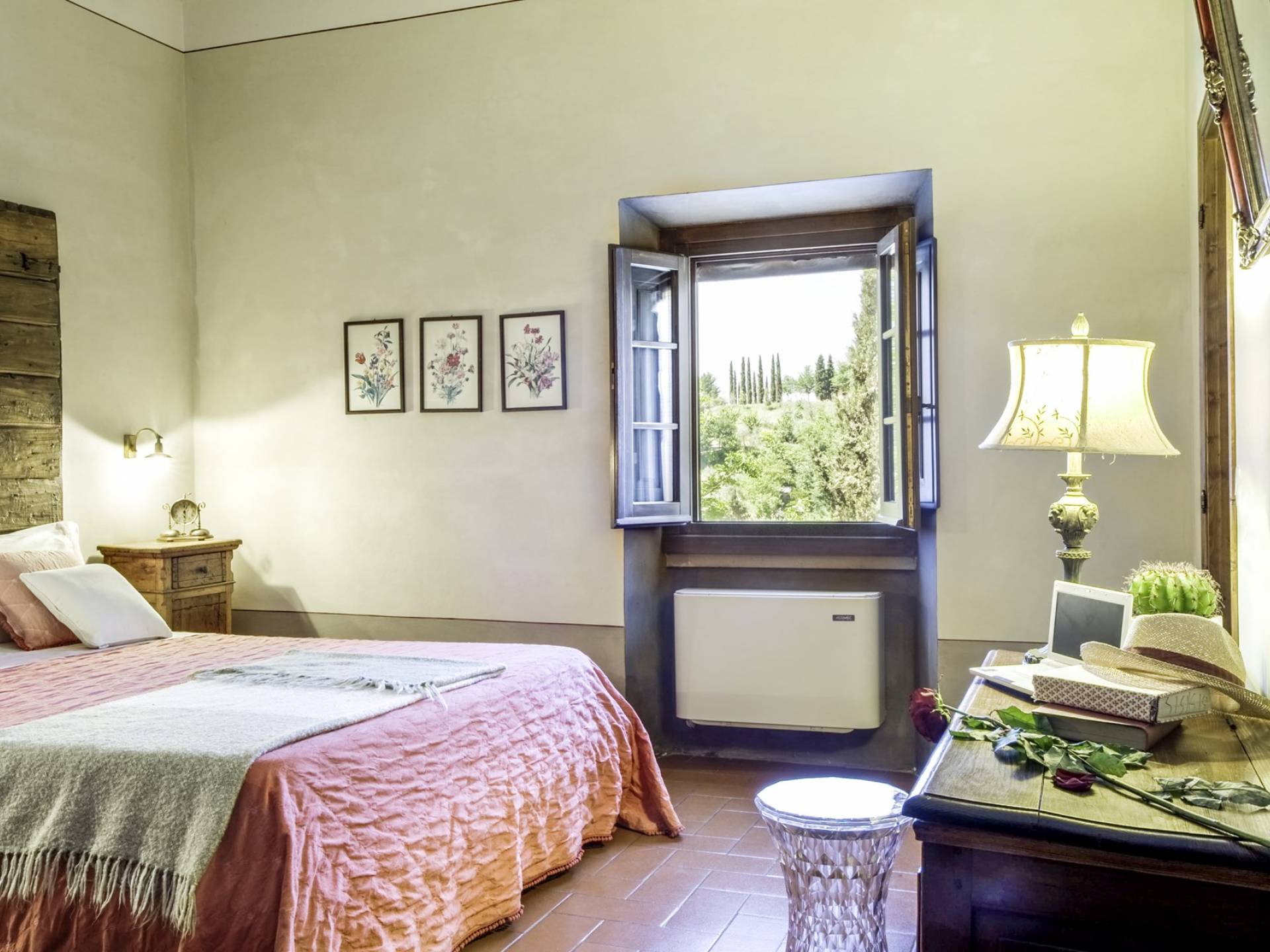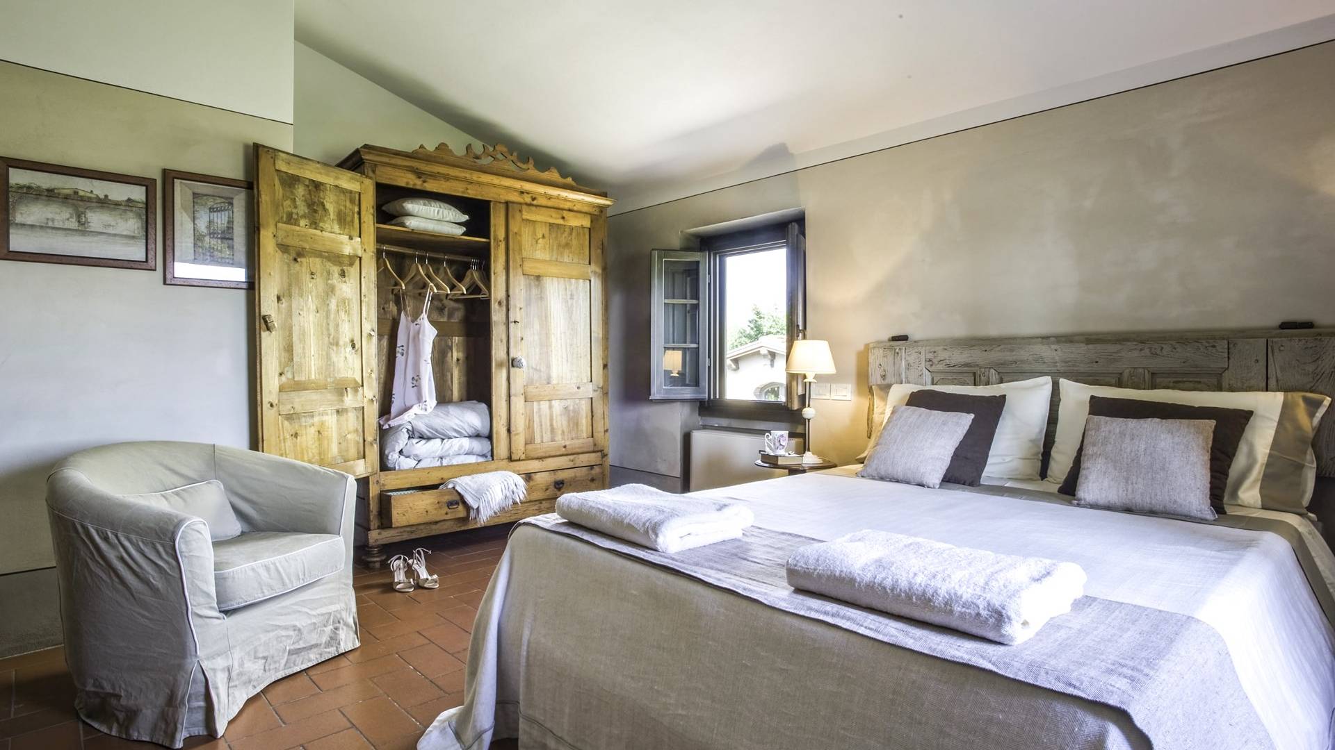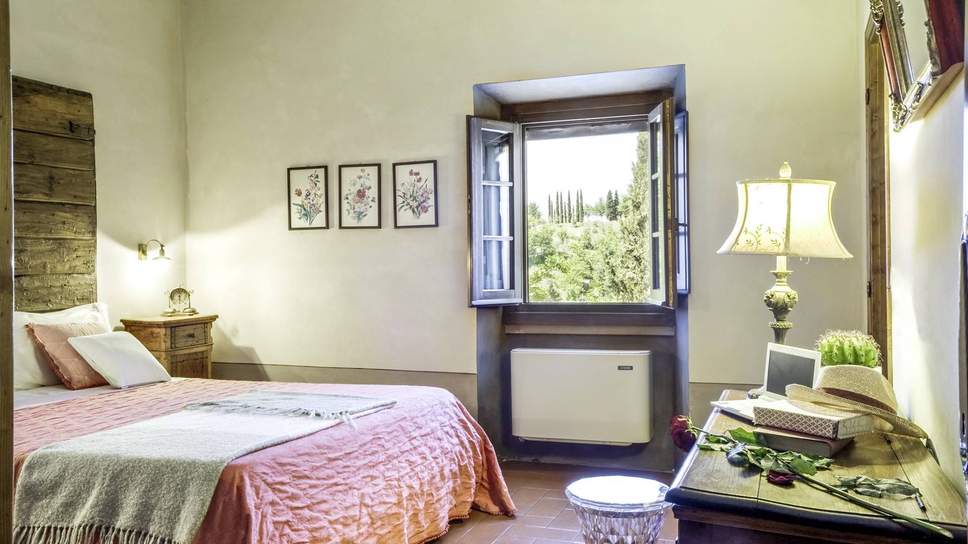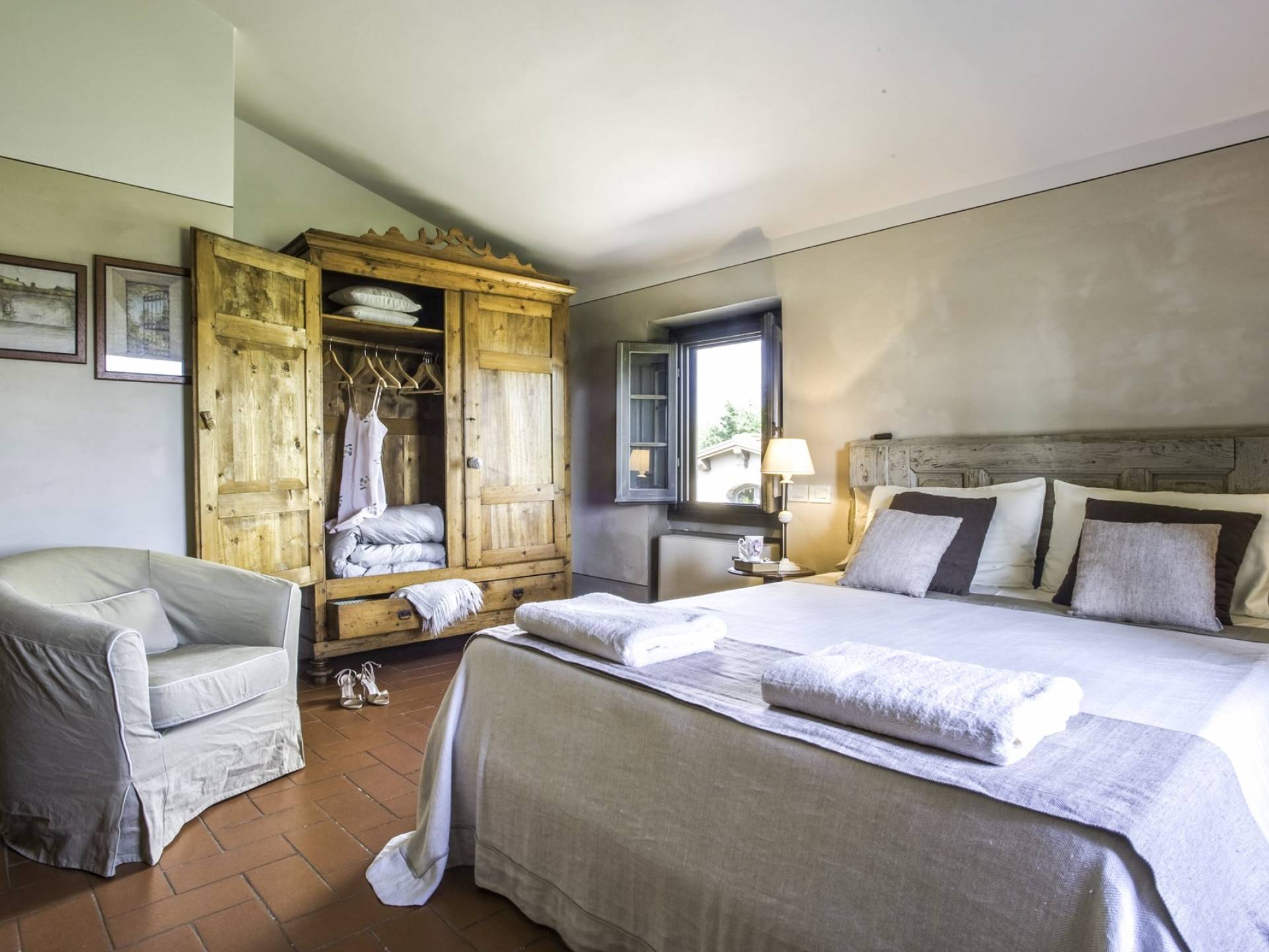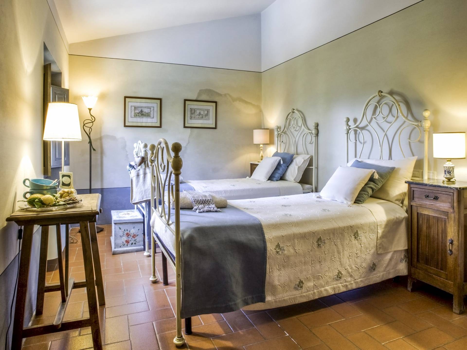 Siempre conectado internamente se llega a la antigua torre medieval, amueblada como una acogedora habitación doble, cuyas ventanas en tres lados ofrecen una vista única de los alrededores. La villa, de hecho, está situada en la cima de una colina desde la que se pueden ver, no muy lejos, los riscos del Valdarno, cantos rodados de arcilla prehistóricos que el paso del tiempo ha cambiado en su forma original.