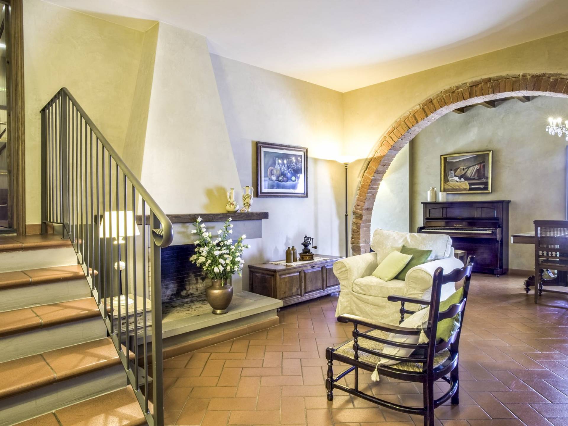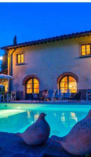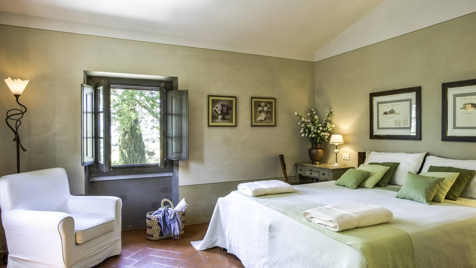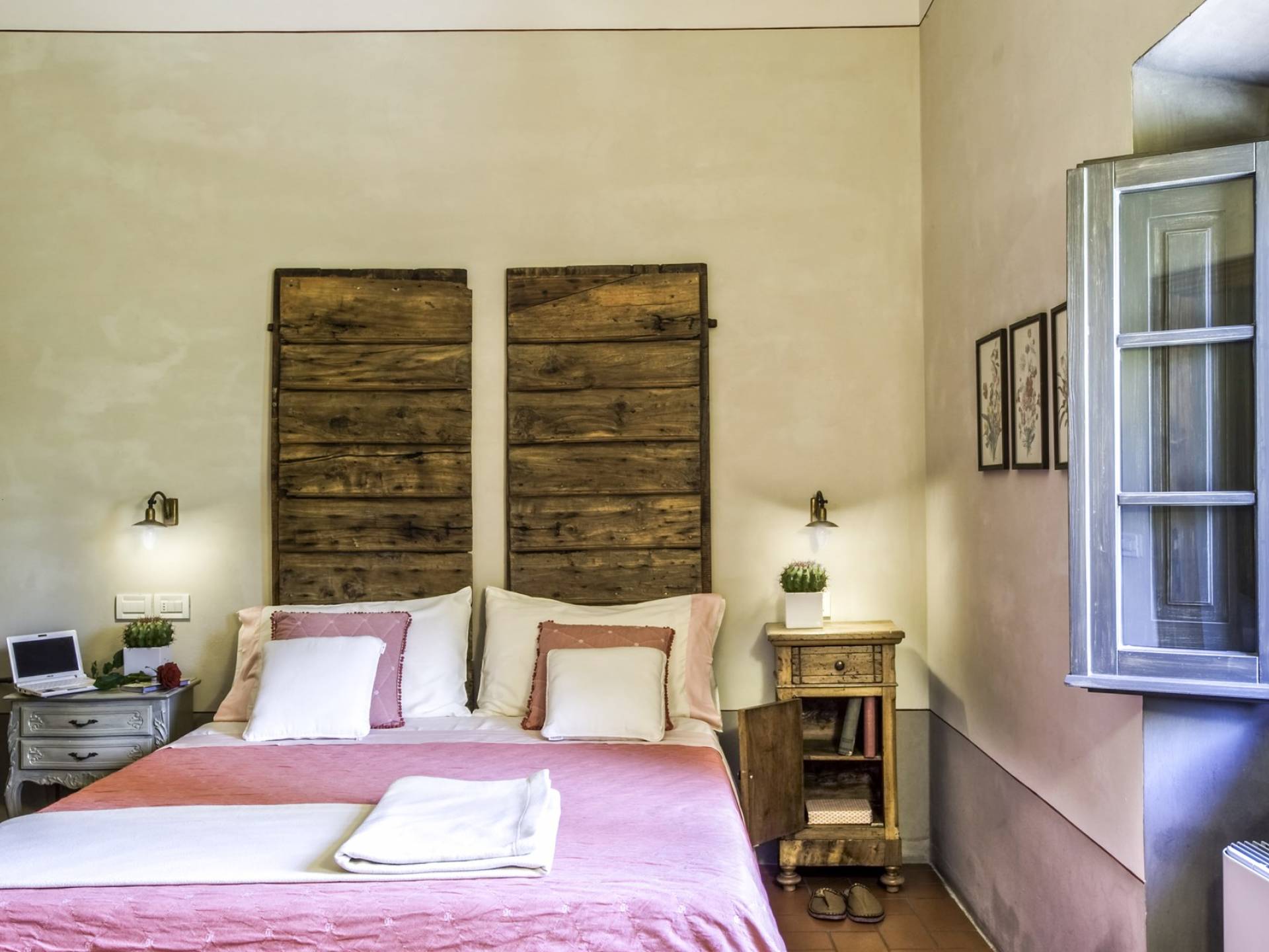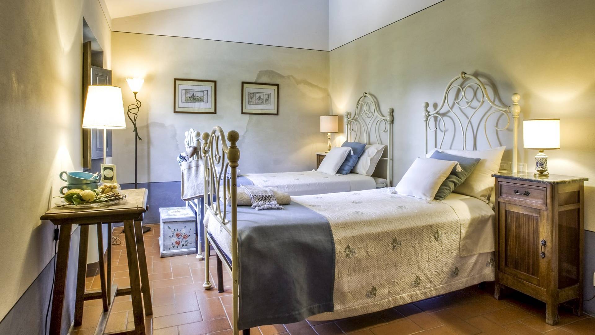 Siempre conectado internamente se llega a la antigua torre medieval, amueblada como una acogedora habitación doble, cuyas ventanas en tres lados ofrecen una vista única de los alrededores. La villa, de hecho, está situada en la cima de una colina desde la que se pueden ver, no muy lejos, los riscos del Valdarno, cantos rodados de arcilla prehistóricos que el paso del tiempo ha cambiado en su forma original.