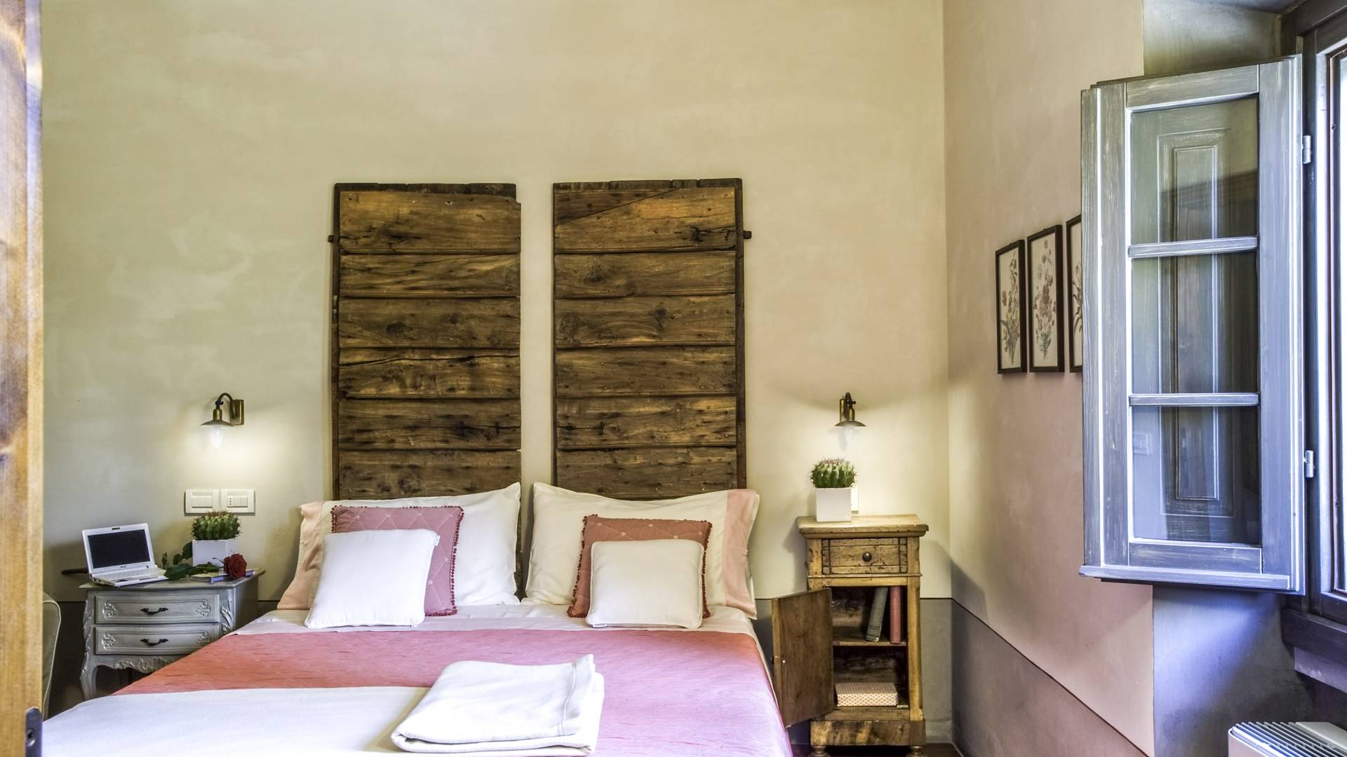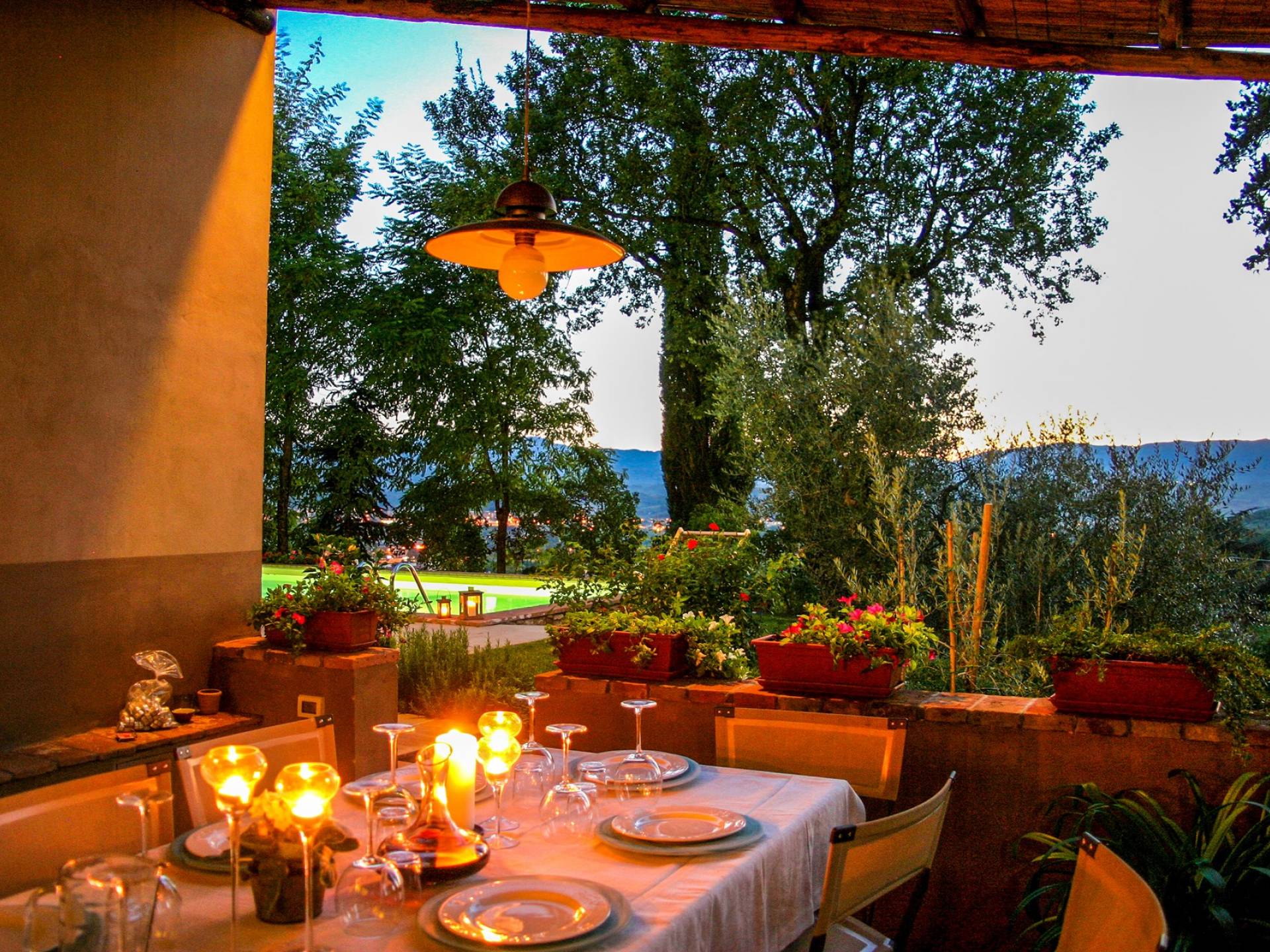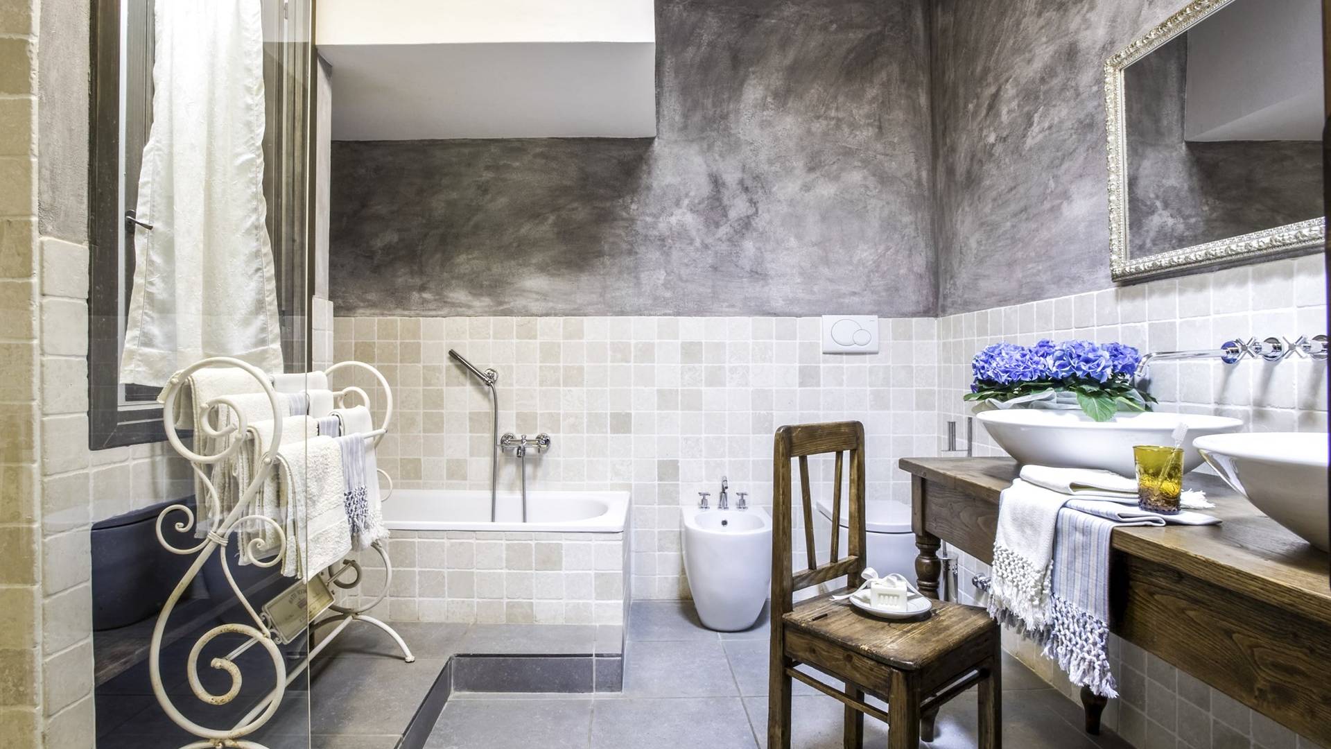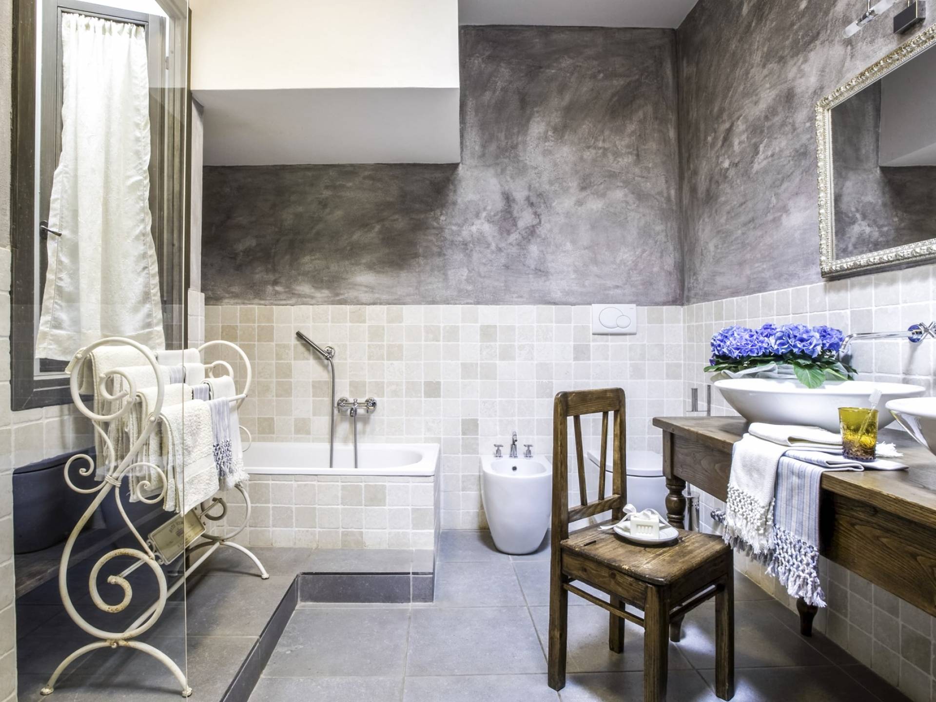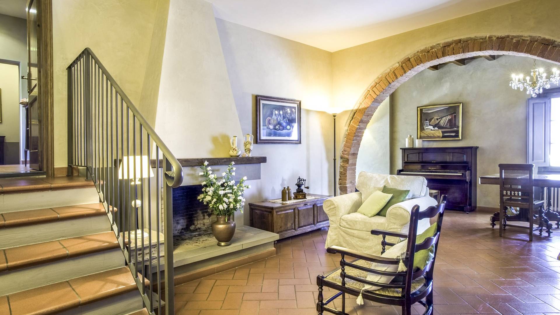 Siempre conectado internamente se llega a la antigua torre medieval, amueblada como una acogedora habitación doble, cuyas ventanas en tres lados ofrecen una vista única de los alrededores. La villa, de hecho, está situada en la cima de una colina desde la que se pueden ver, no muy lejos, los riscos del Valdarno, cantos rodados de arcilla prehistóricos que el paso del tiempo ha cambiado en su forma original.
