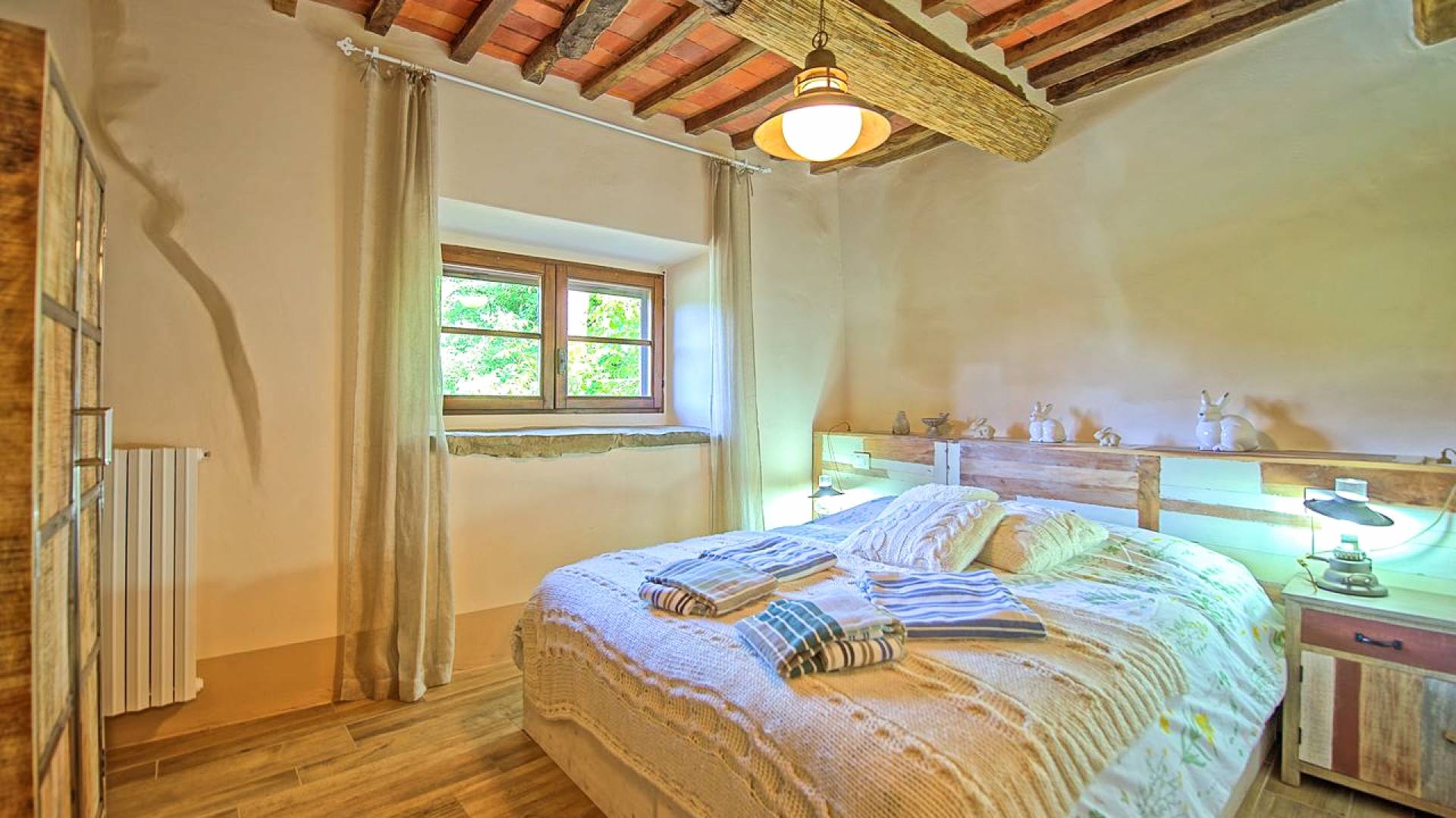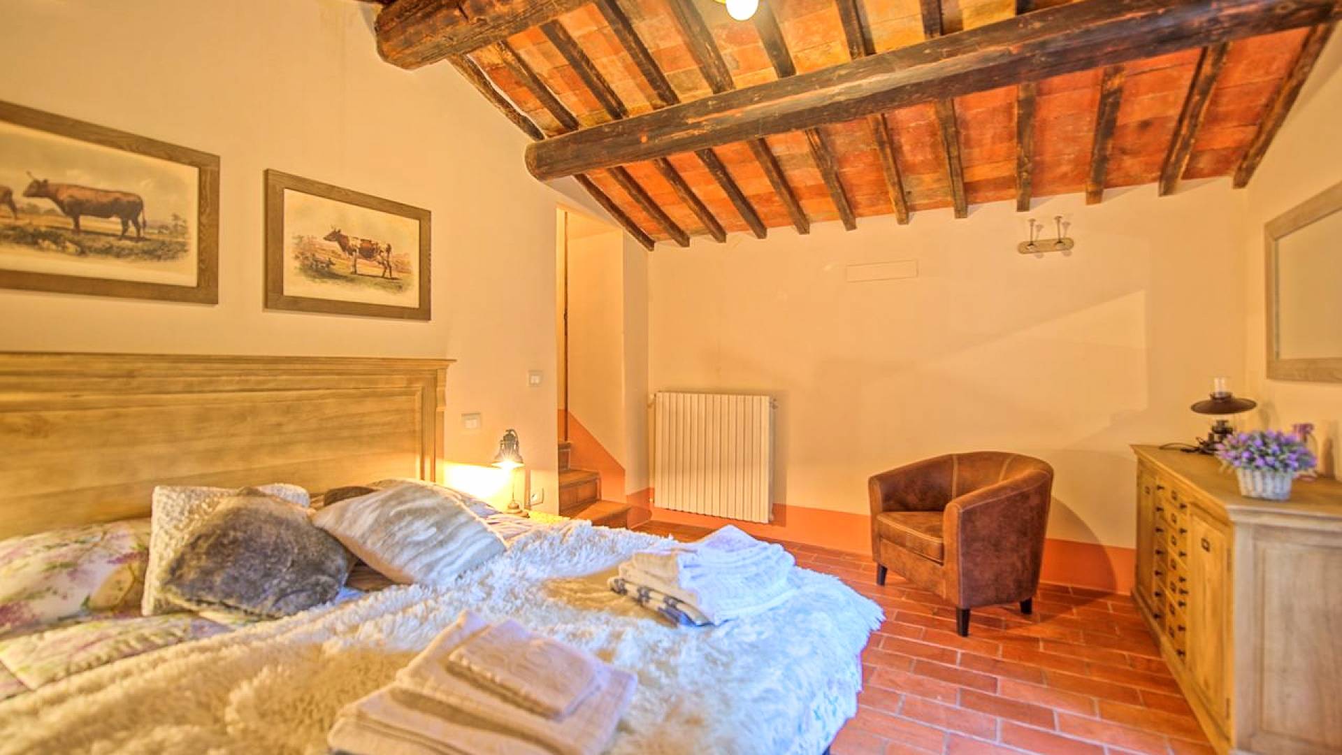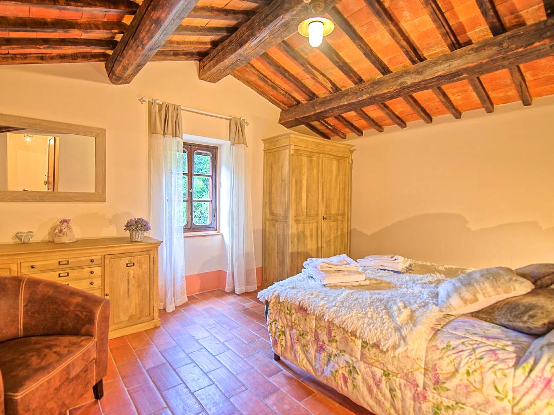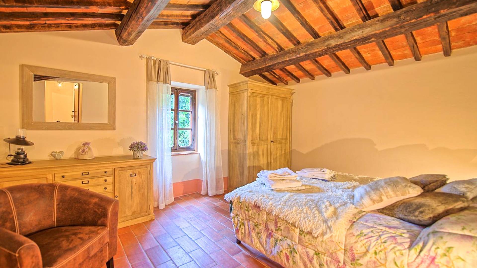 Hay tres habitaciones disponibles, cada una con baño privado, todas con un encanto moderno pero con la calidez antigua dictada por los pisos de terracota, vigas de madera en los techos y puertas y ventanas aún originales. Las dimensiones de cada habitación son notables y ciertamente no le harán sentir la nostalgia de una habitación de hotel.
