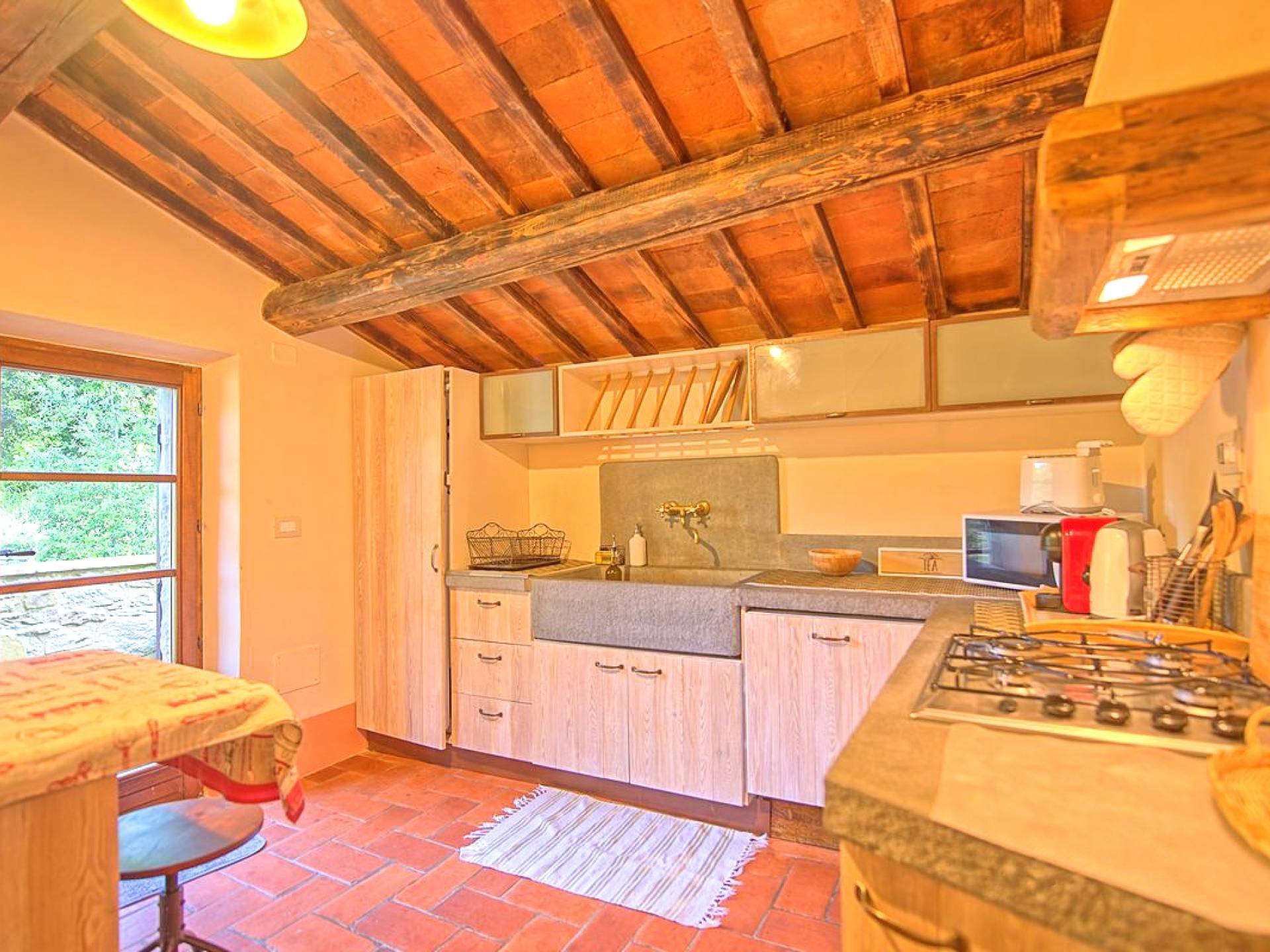 Entre la tranquilidad del bosque y la naturaleza verde que te rodeará, vivirás una estancia inolvidable aquí. La Villa también ofrece hospitalidad a las mascotas y es especialmente adecuada para vacaciones en familia o en grupo. En la zona de estar encontrarás un gran salón con una enorme chimenea, para calentar hasta los días más fríos o para hacer una velada especial romántica, y una bonita zona para dedicar a la conversación, con sofá y sillones, además de un Cocina muy cómoda con gran encimera de pórfido, una cómoda península y todo lo necesario para pasar momentos agradables y felices.