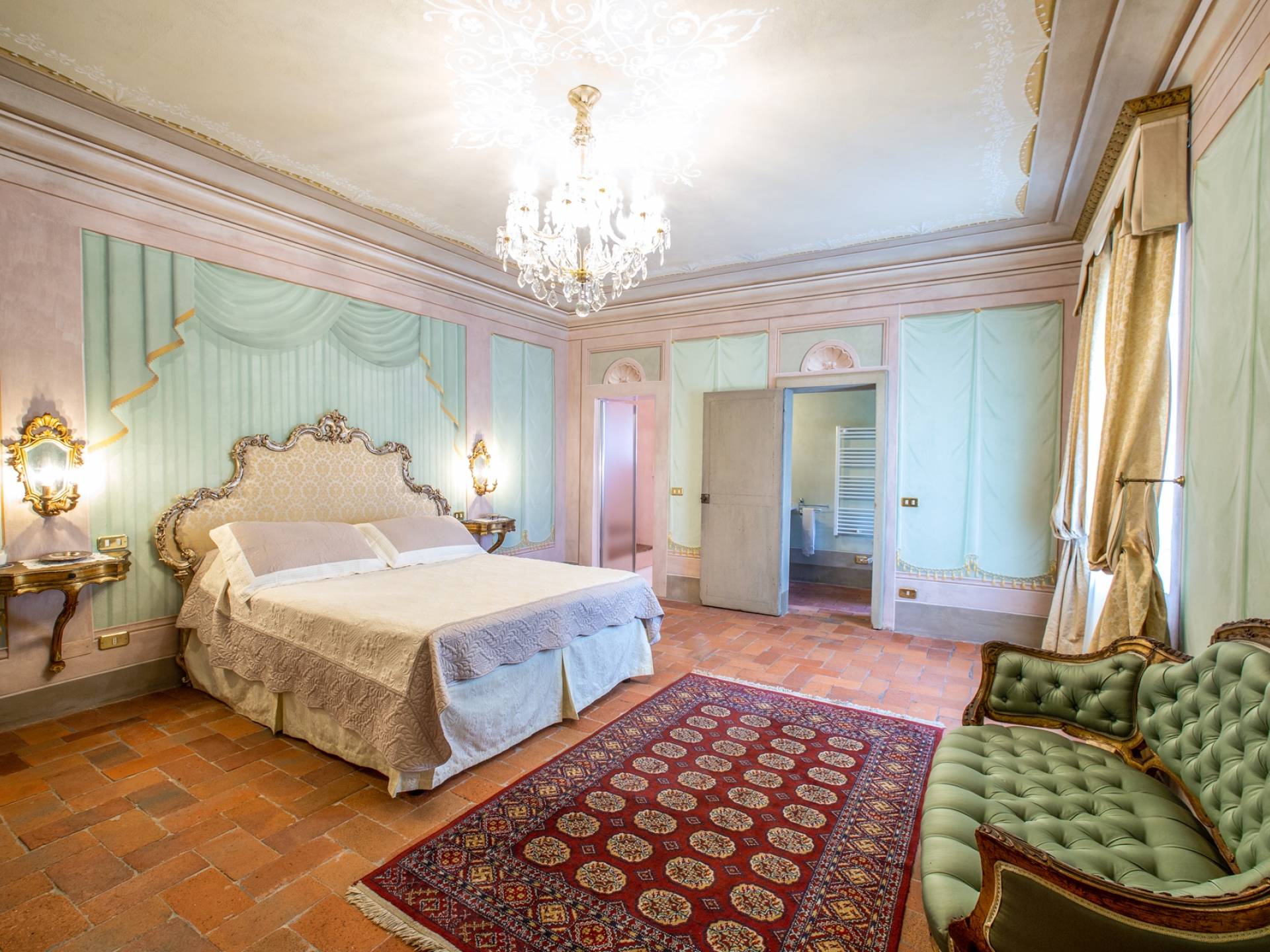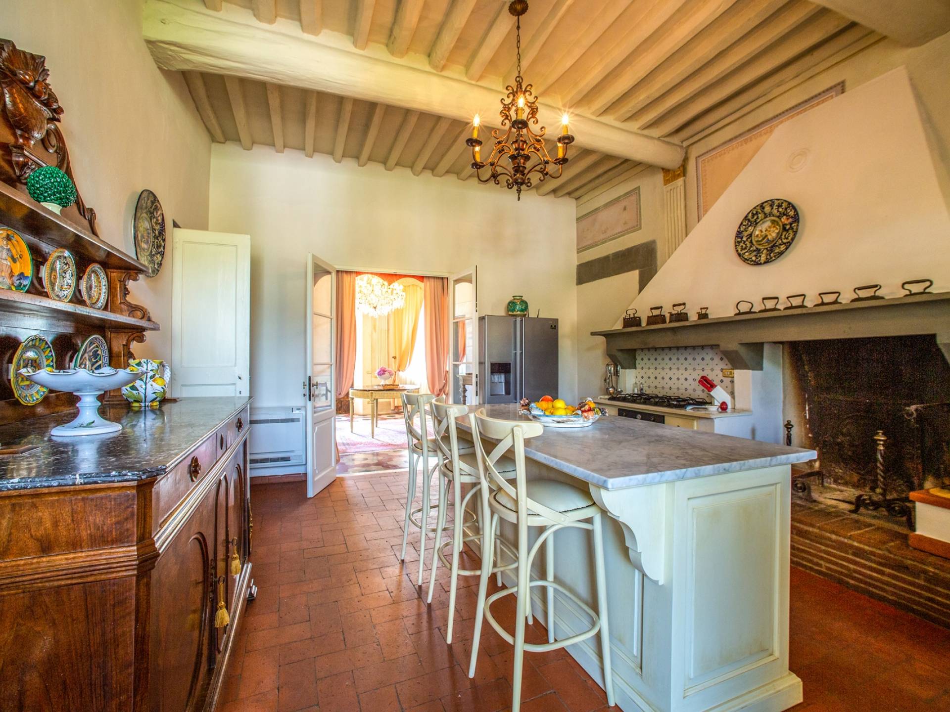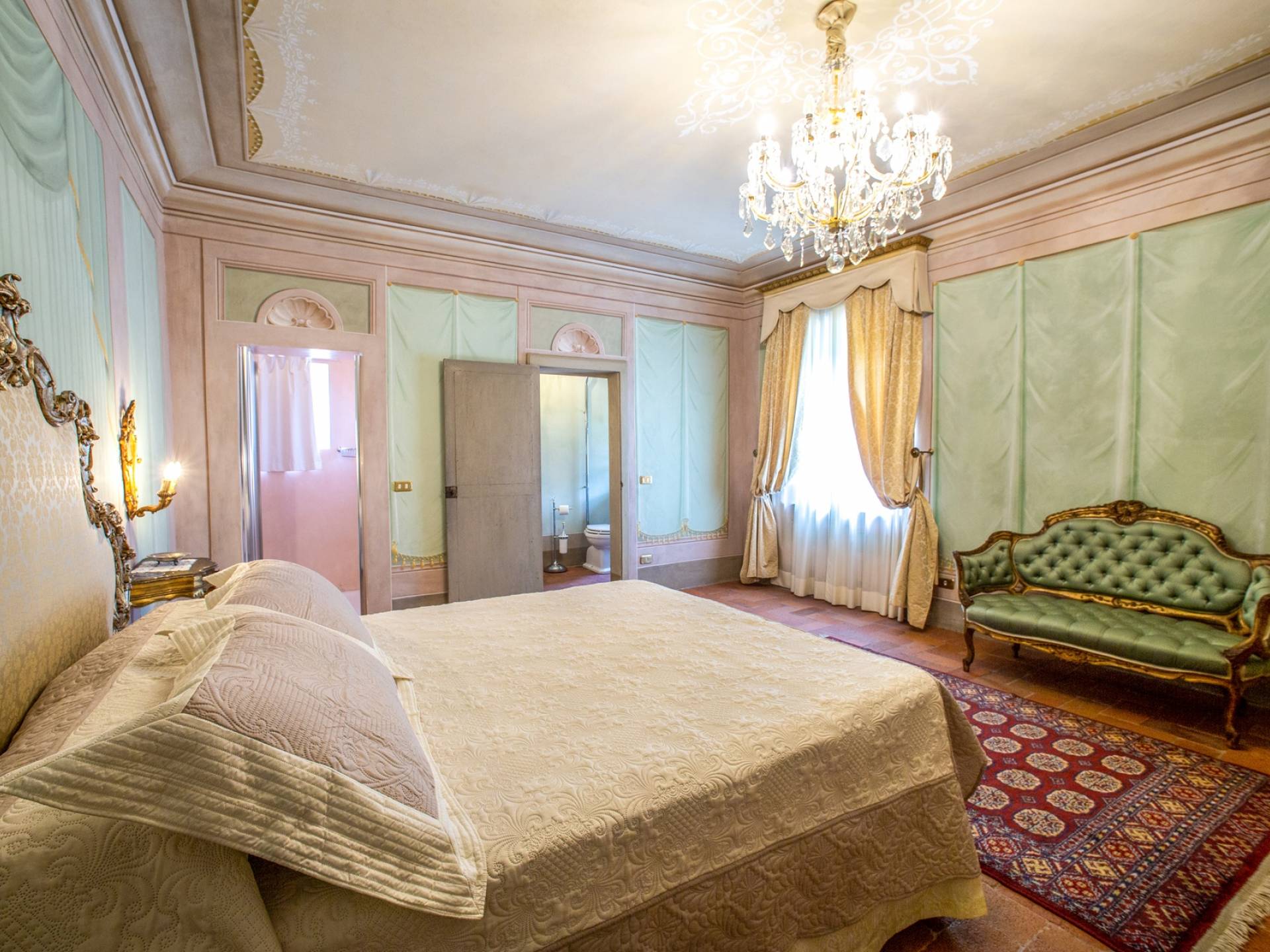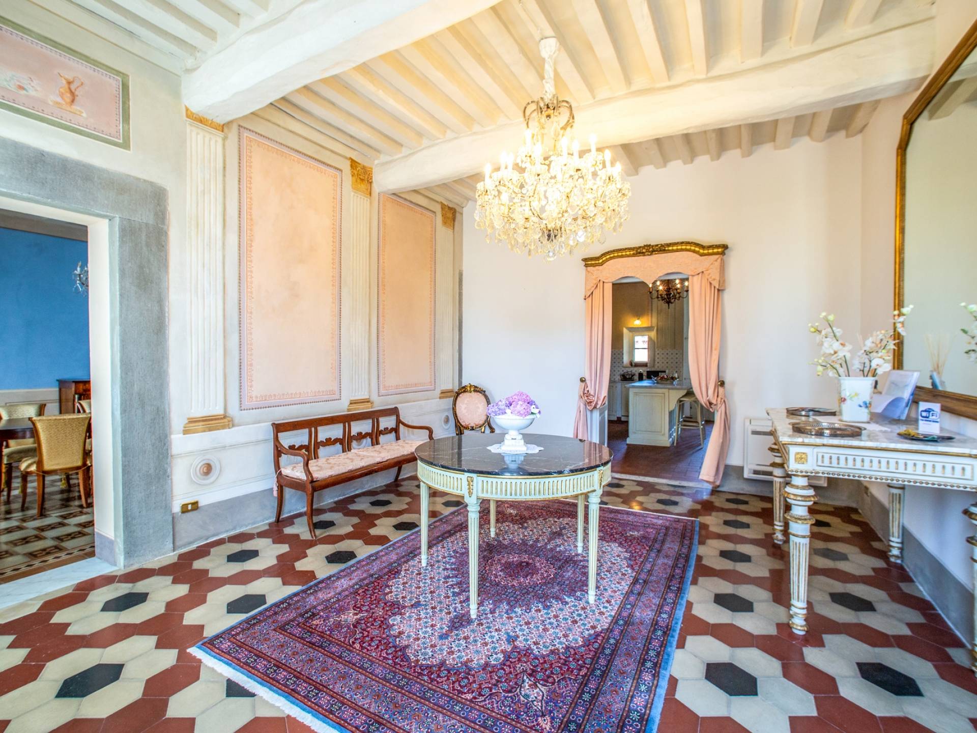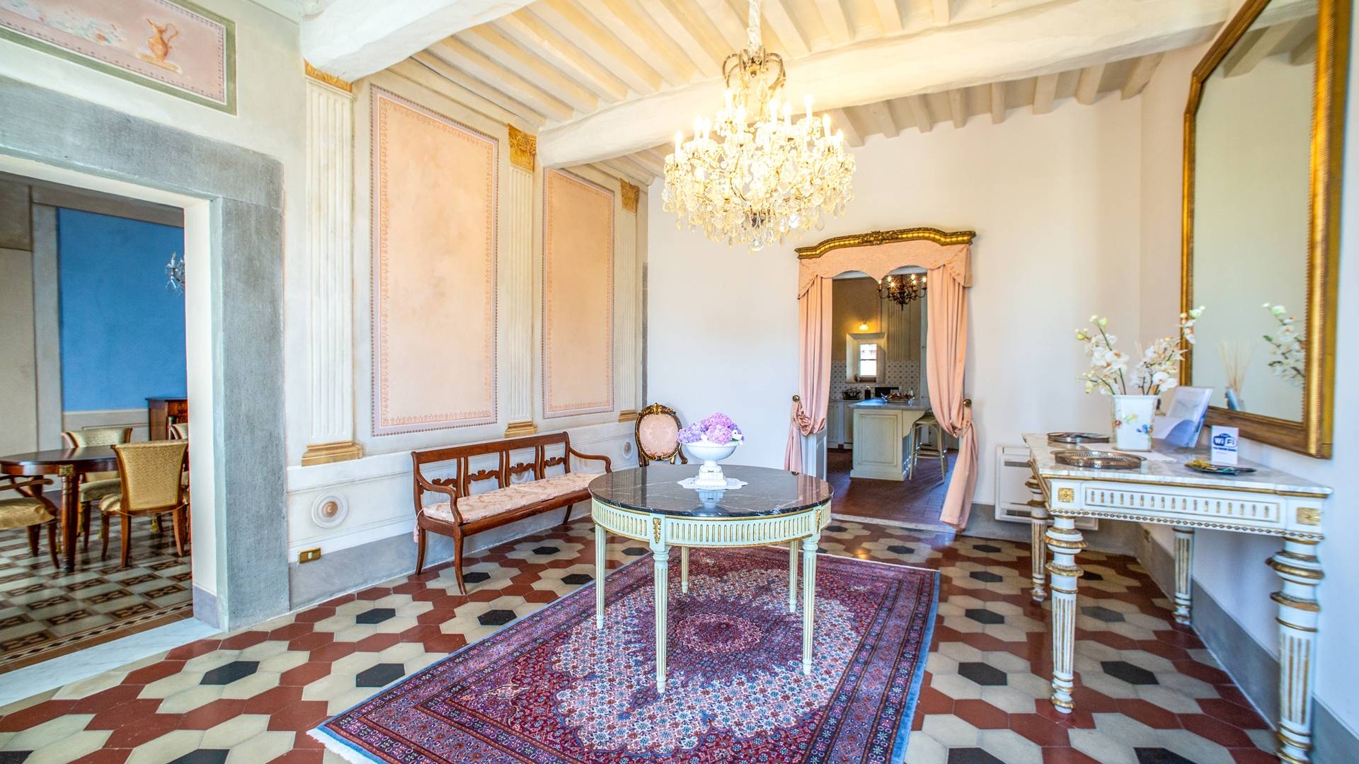 El interior de la villa está decorado con frescos de 1600/1700, restaurados a su esplendor original en 2018. Todos los elementos que decoran esta espectacular propiedad son del más alto valor histórico debido a su autenticidad. Desde los originales pavimentos de terracota hasta los techos con vigas de madera, las encantadoras chimeneas, las columnas de mármol, los preciosos frescos y las decoraciones. Los muebles elegantes y sofisticados con materiales preciosos y dorados elegantes otorgan un gran encanto y emociones únicas a este edificio antiguo. La villa, de aproximadamente 1.000 m2, tiene tres plantas y tiene capacidad para 20 invitados.