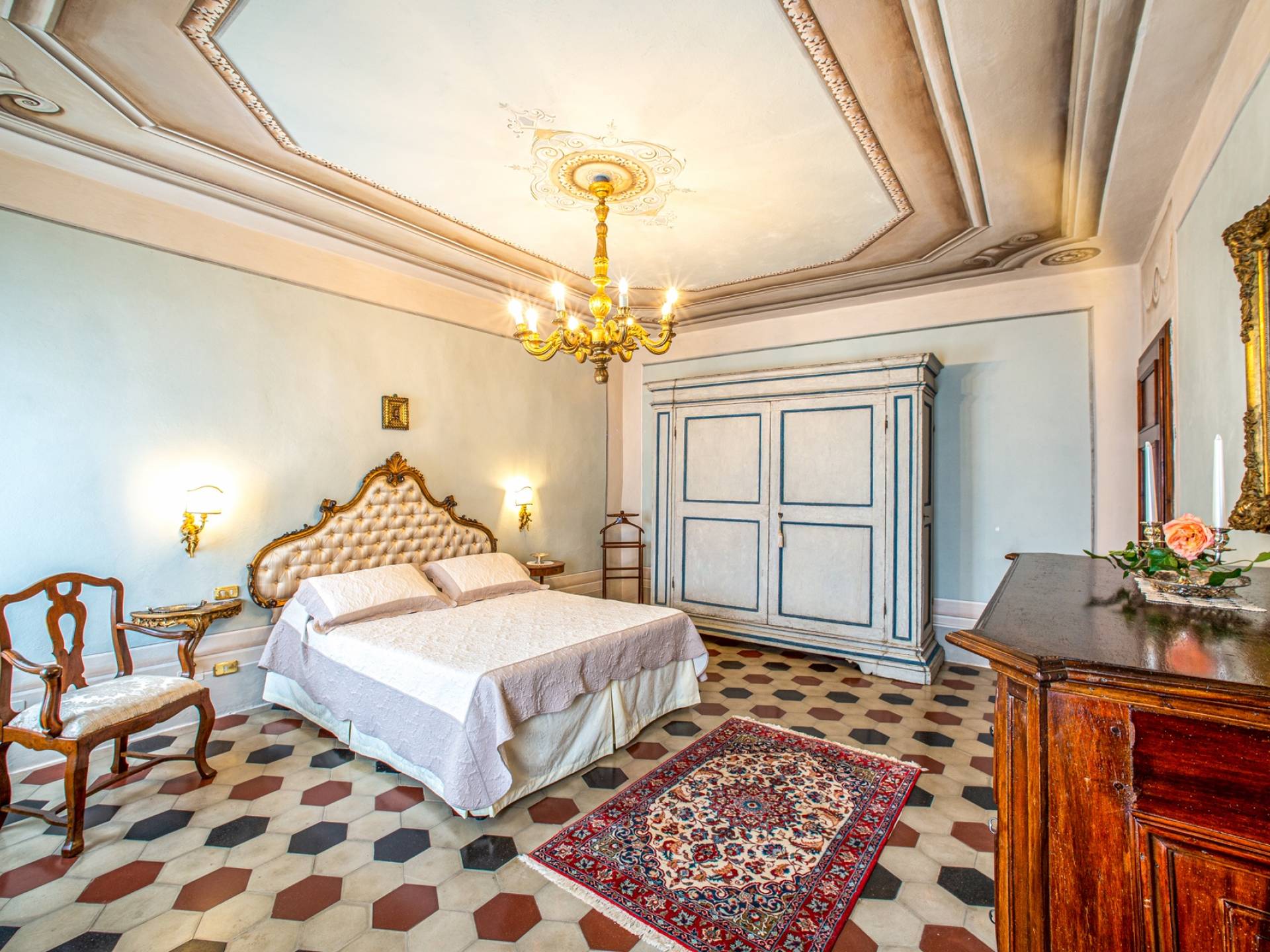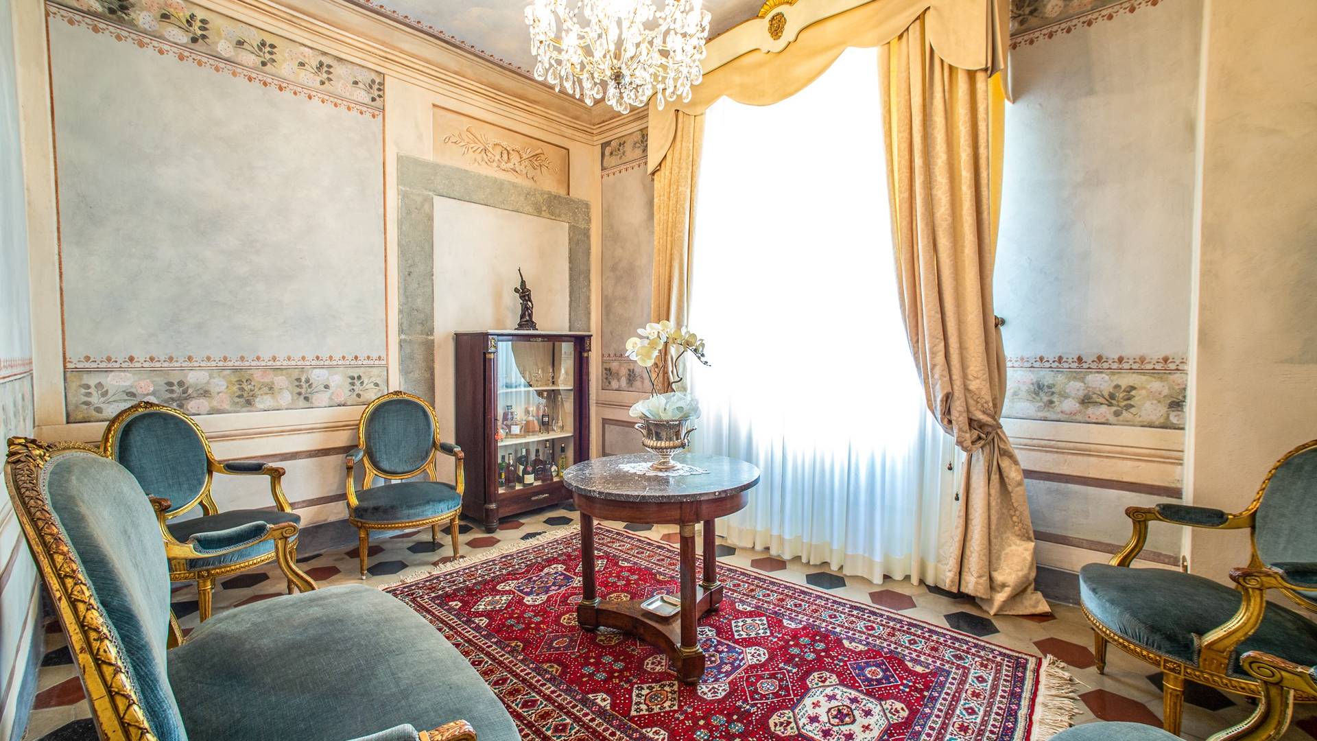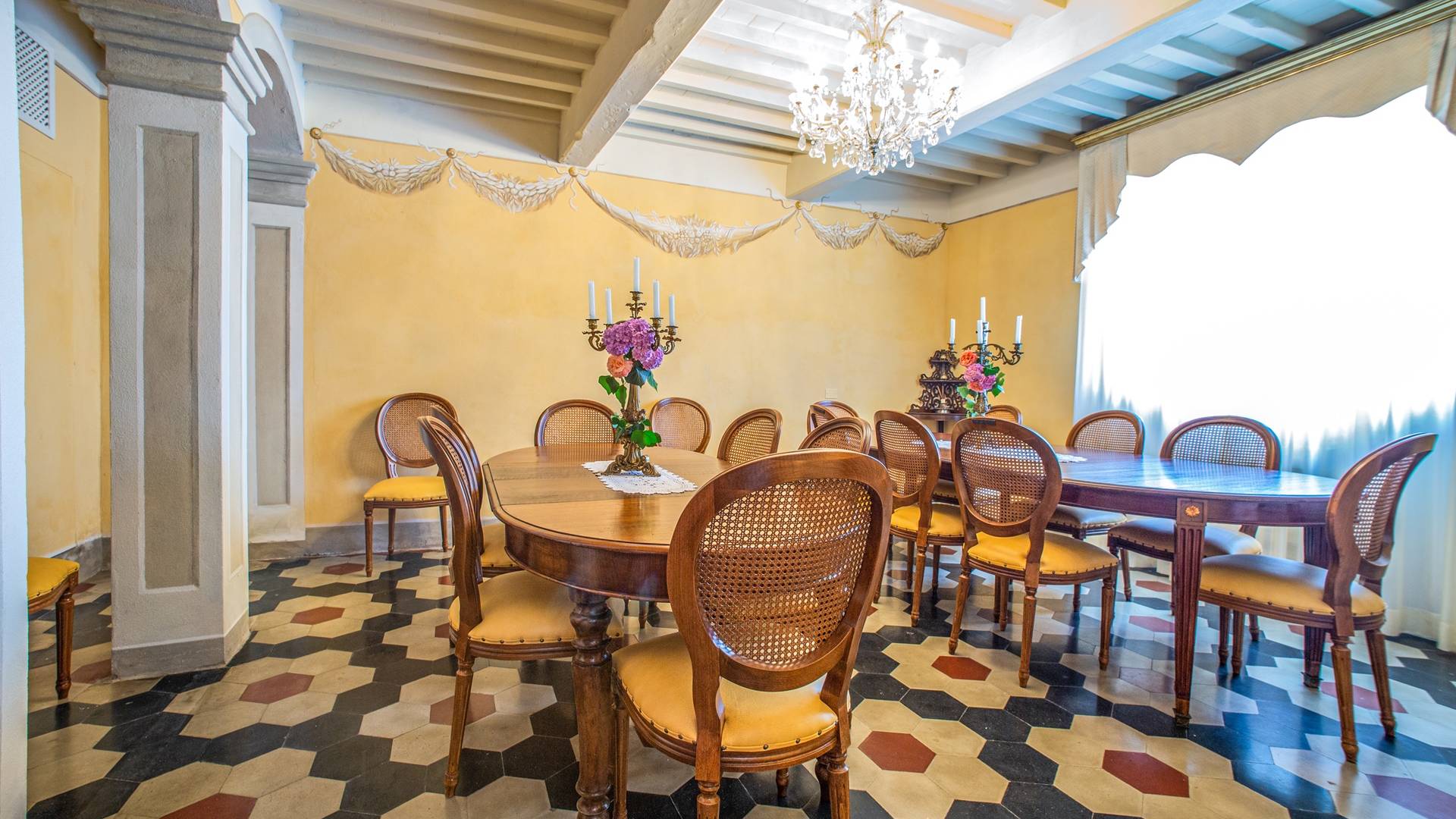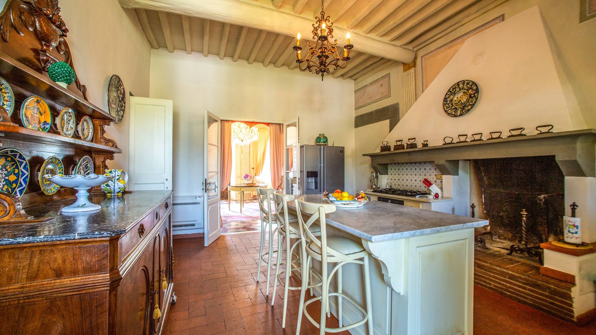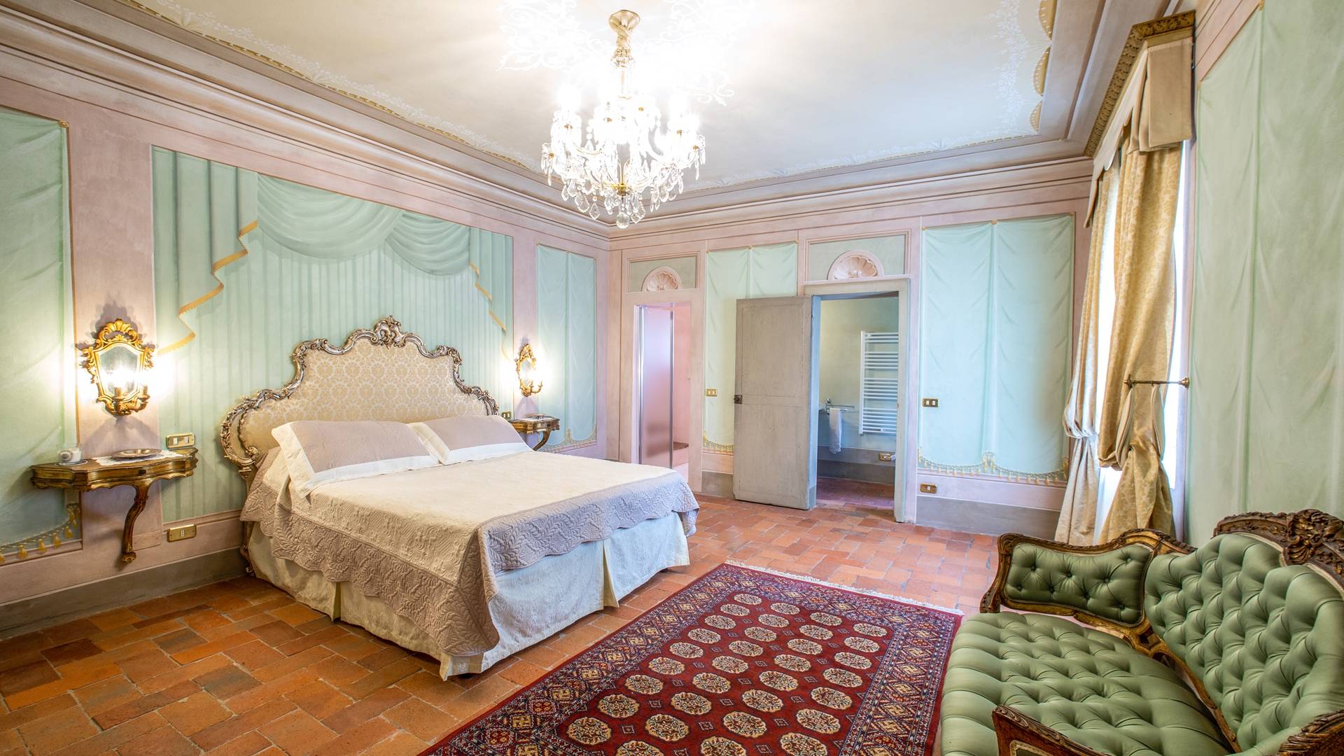 El interior de la villa está decorado con frescos de 1600/1700, restaurados a su esplendor original en 2018. Todos los elementos que decoran esta espectacular propiedad son del más alto valor histórico debido a su autenticidad. Desde los originales pavimentos de terracota hasta los techos con vigas de madera, las encantadoras chimeneas, las columnas de mármol, los preciosos frescos y las decoraciones. Los muebles elegantes y sofisticados con materiales preciosos y dorados elegantes otorgan un gran encanto y emociones únicas a este edificio antiguo. La villa, de aproximadamente 1.000 m2, tiene tres plantas y tiene capacidad para 20 invitados.
