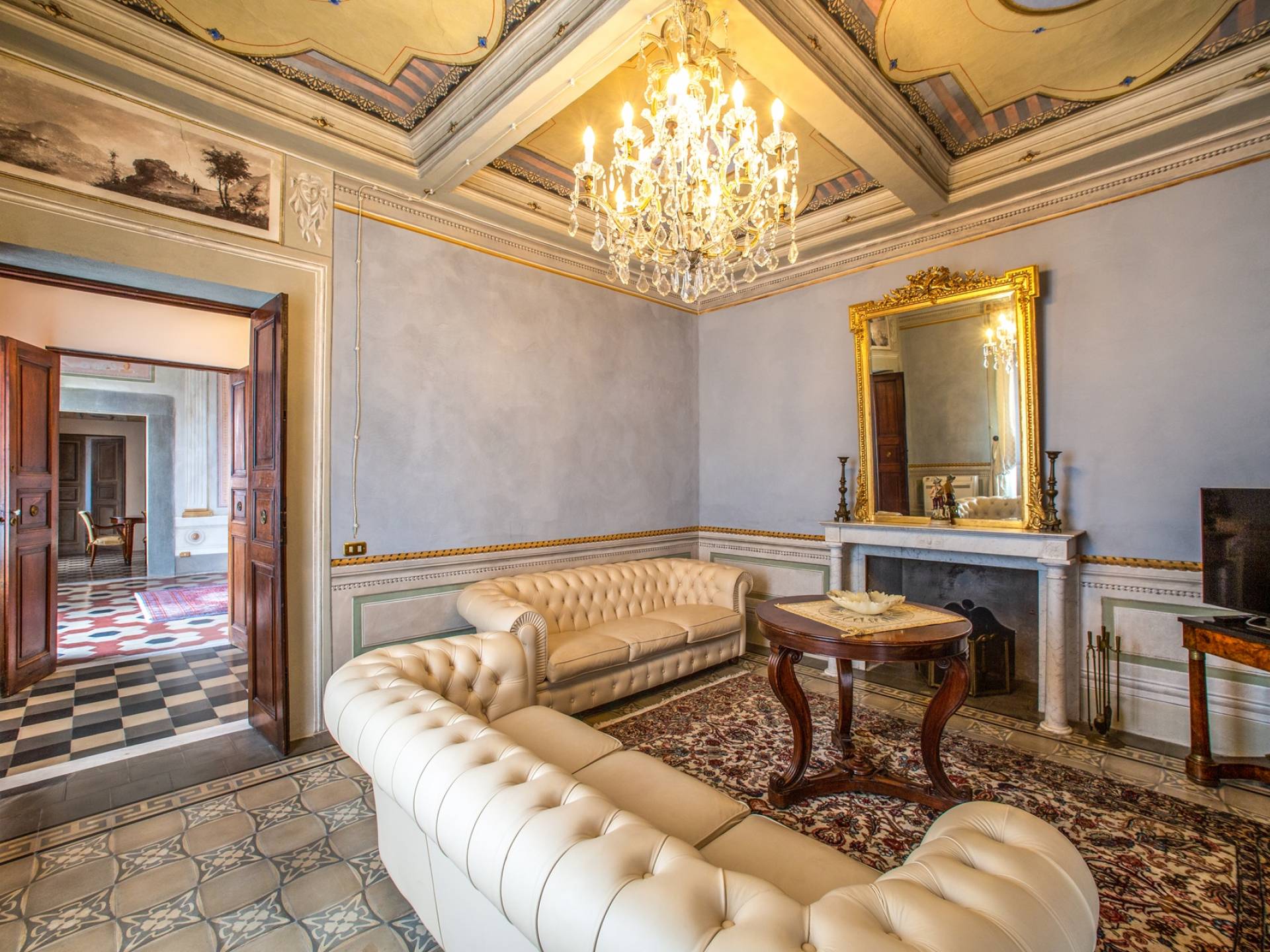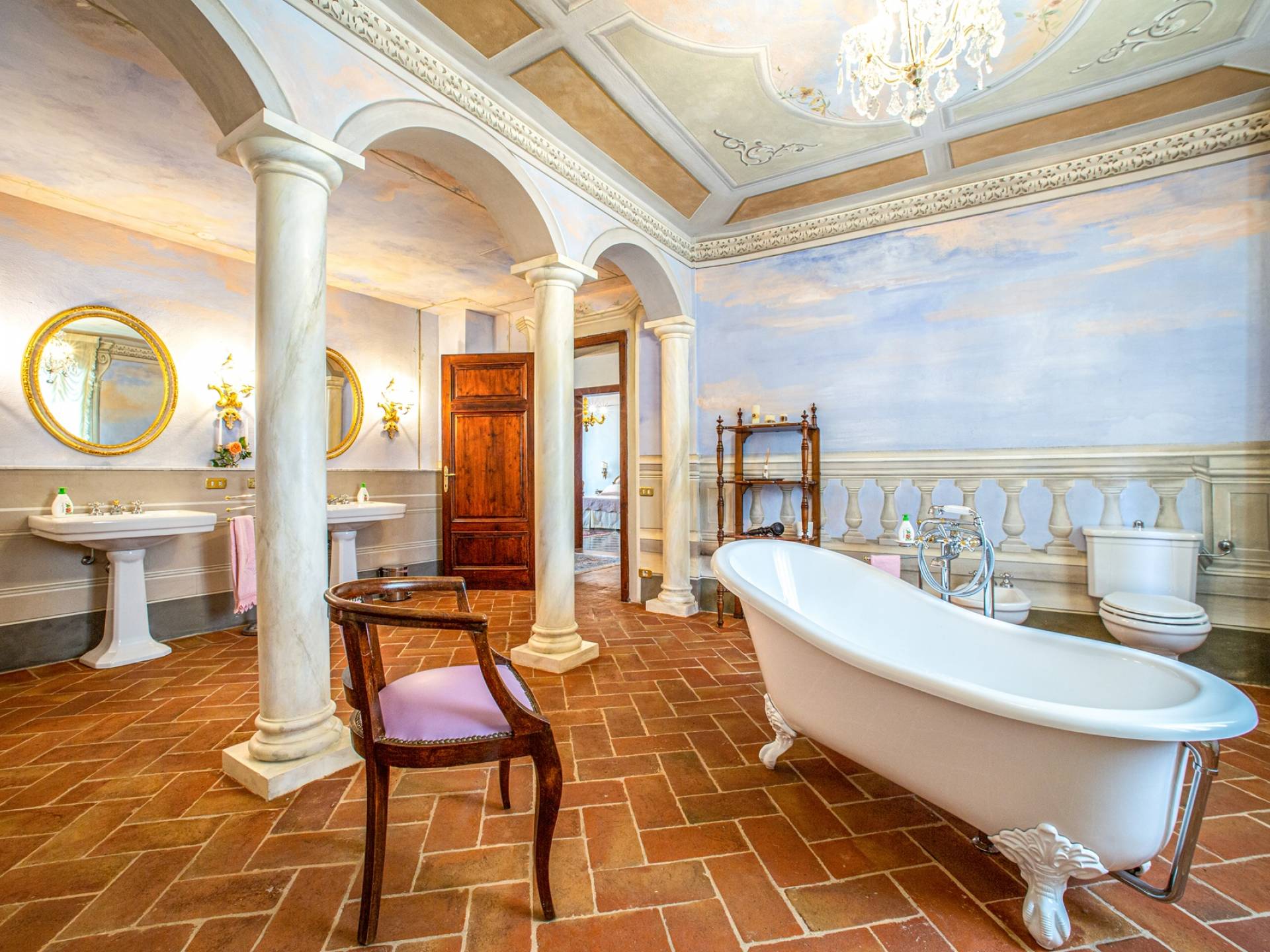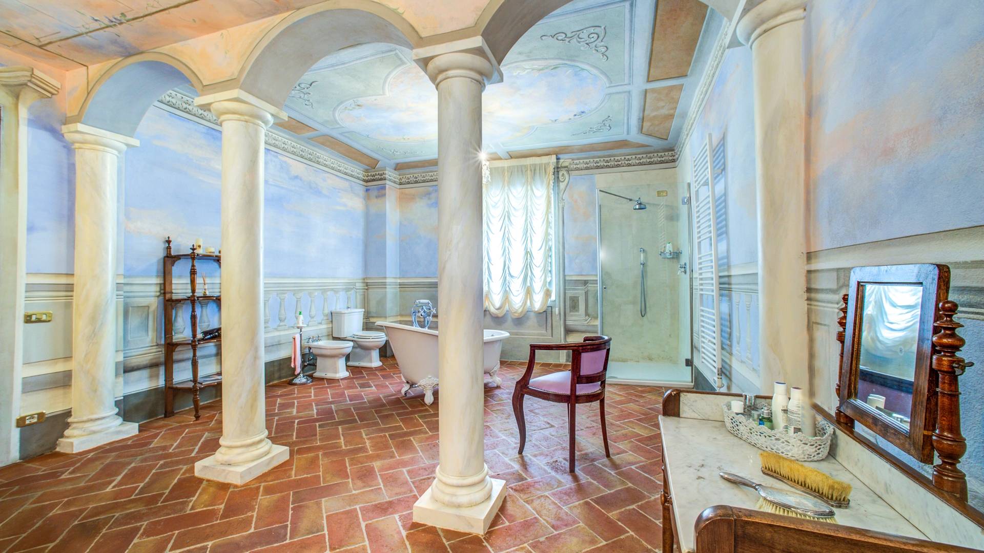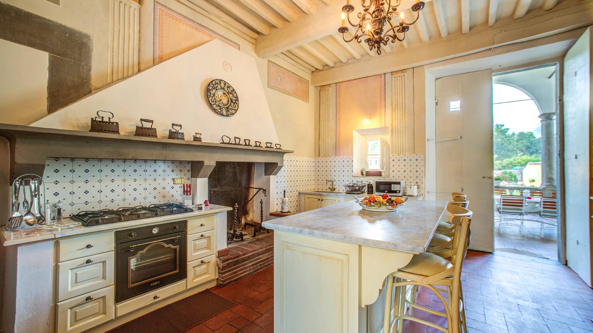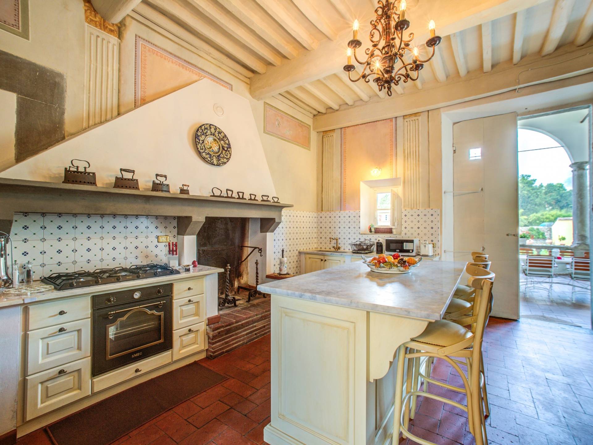 El interior de la villa está decorado con frescos de 1600/1700, restaurados a su esplendor original en 2018. Todos los elementos que decoran esta espectacular propiedad son del más alto valor histórico debido a su autenticidad. Desde los originales pavimentos de terracota hasta los techos con vigas de madera, las encantadoras chimeneas, las columnas de mármol, los preciosos frescos y las decoraciones. Los muebles elegantes y sofisticados con materiales preciosos y dorados elegantes otorgan un gran encanto y emociones únicas a este edificio antiguo. La villa, de aproximadamente 1.000 m2, tiene tres plantas y tiene capacidad para 20 invitados.