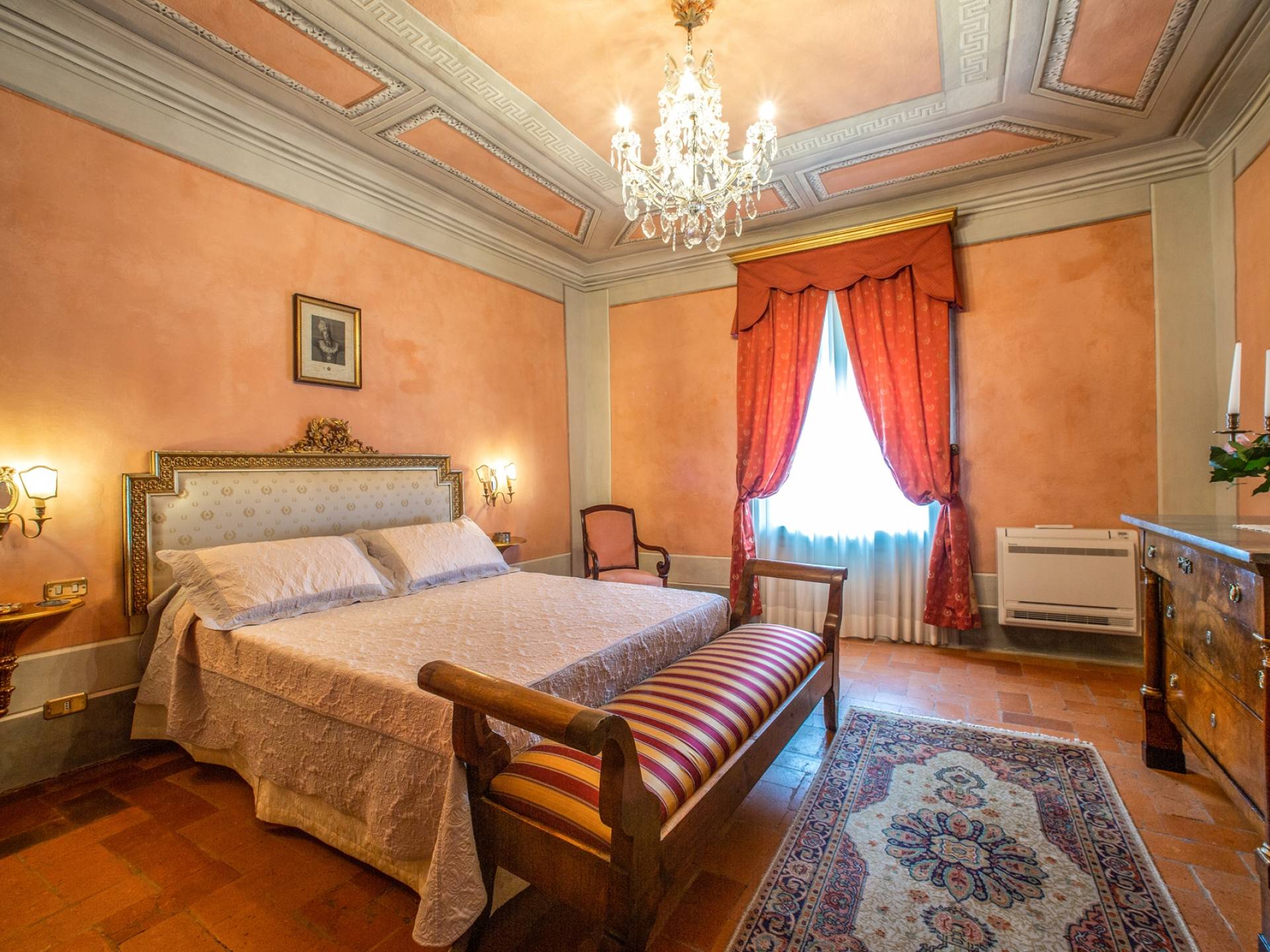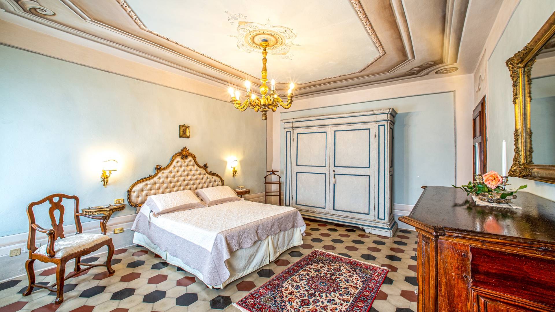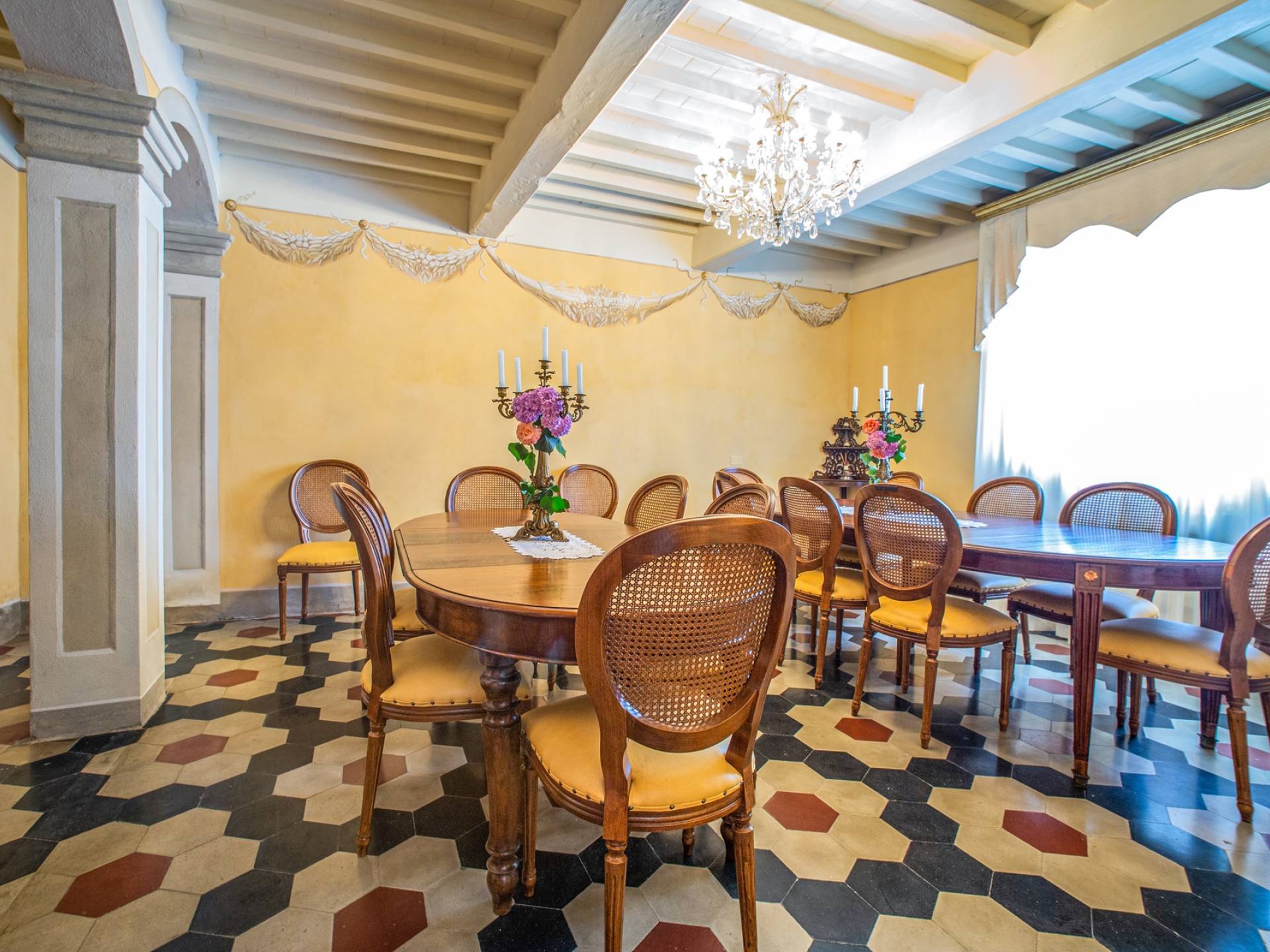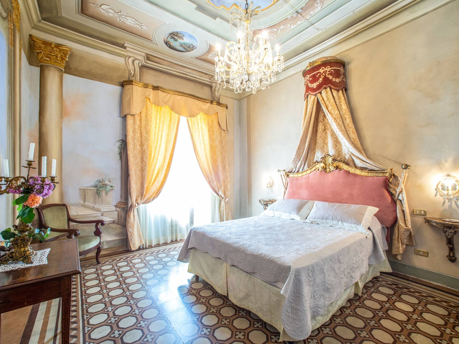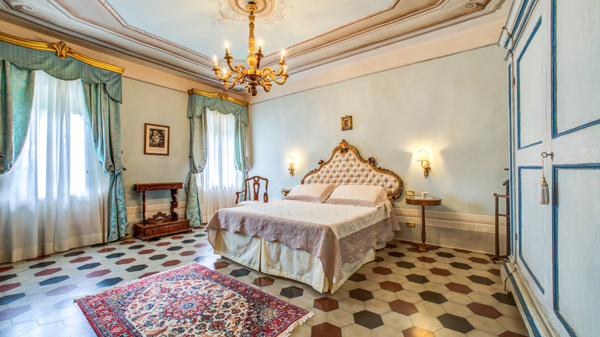 El interior de la villa está decorado con frescos de 1600/1700, restaurados a su esplendor original en 2018. Todos los elementos que decoran esta espectacular propiedad son del más alto valor histórico debido a su autenticidad. Desde los originales pavimentos de terracota hasta los techos con vigas de madera, las encantadoras chimeneas, las columnas de mármol, los preciosos frescos y las decoraciones. Los muebles elegantes y sofisticados con materiales preciosos y dorados elegantes otorgan un gran encanto y emociones únicas a este edificio antiguo. La villa, de aproximadamente 1.000 m2, tiene tres plantas y tiene capacidad para 20 invitados.