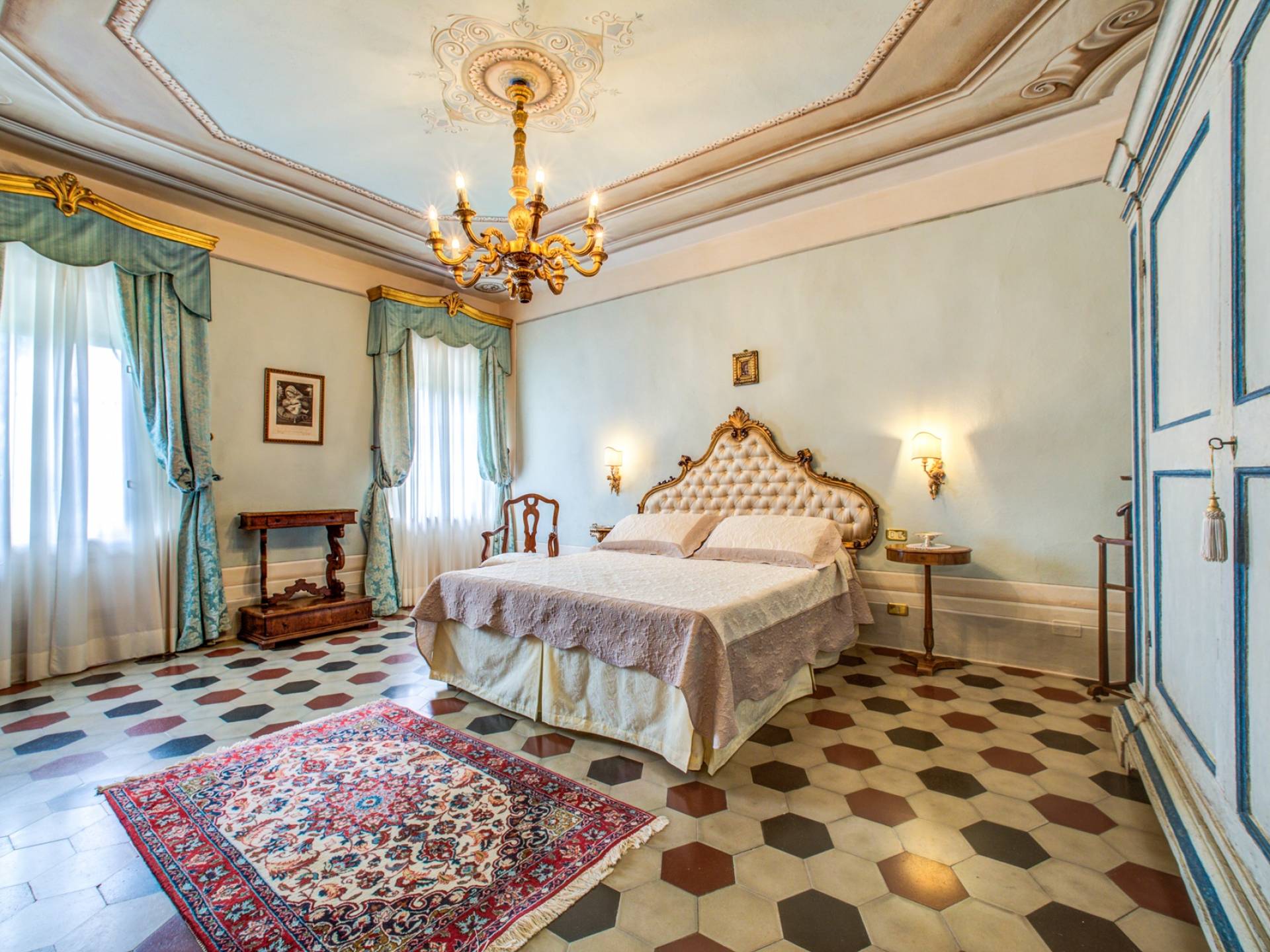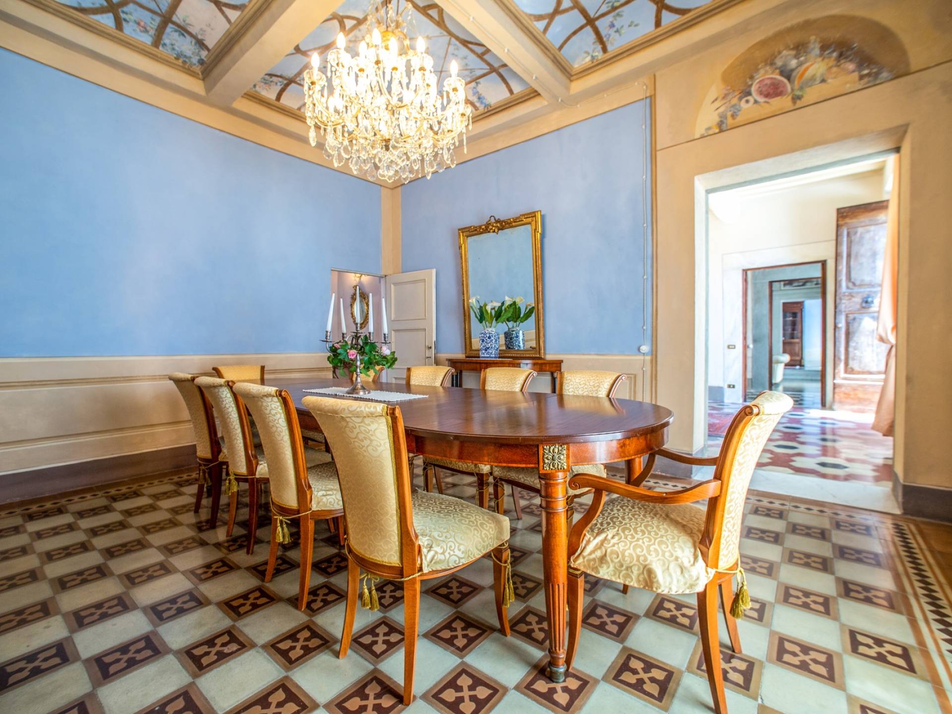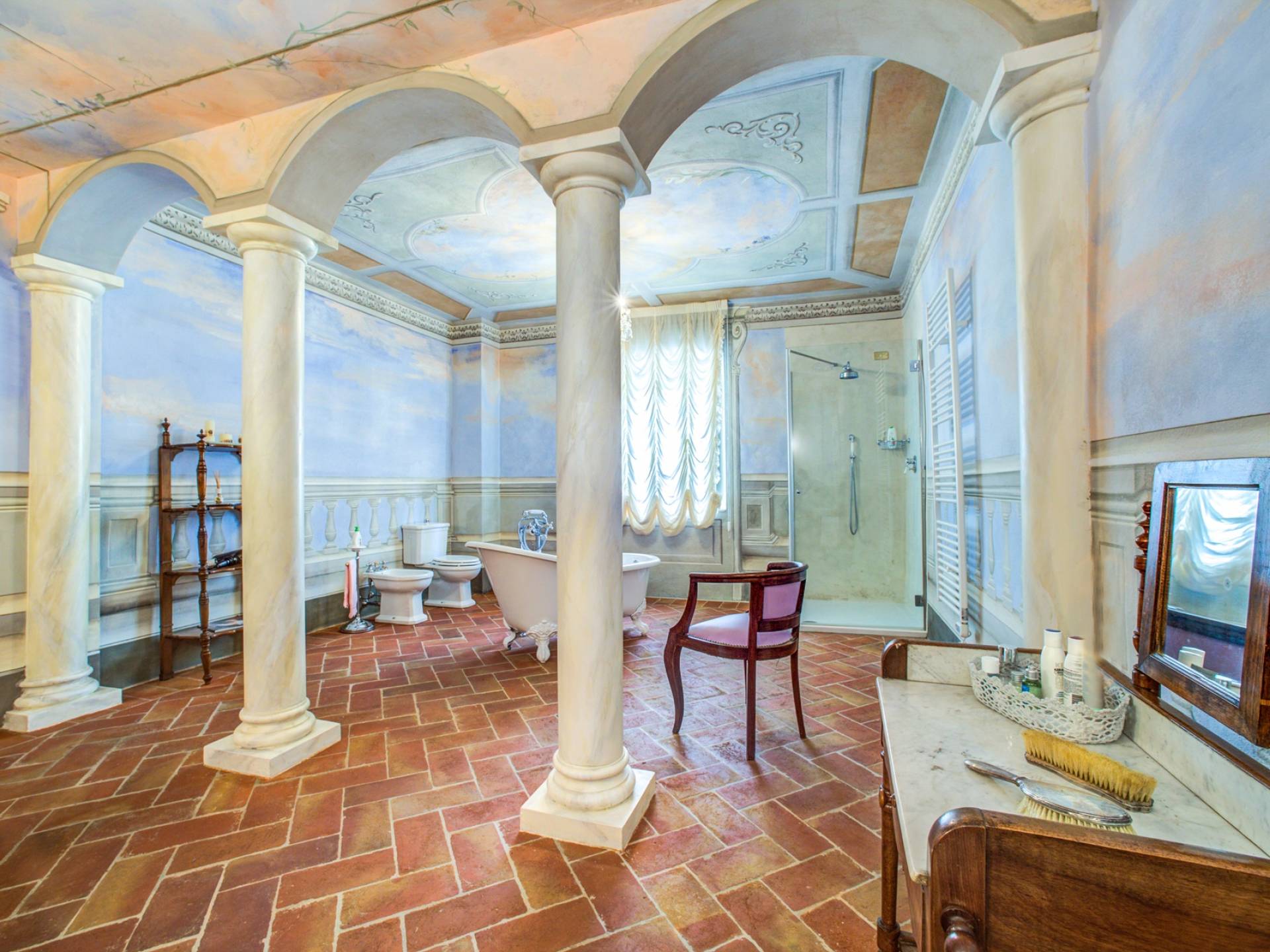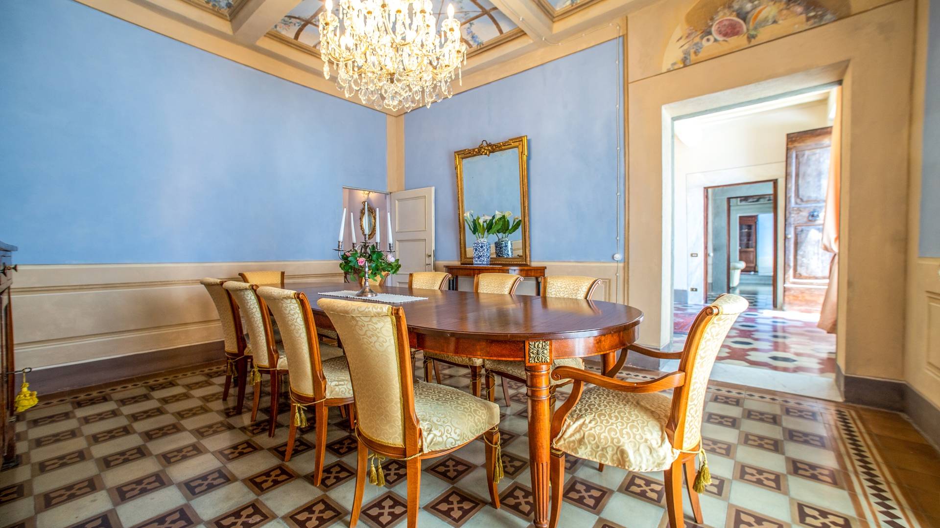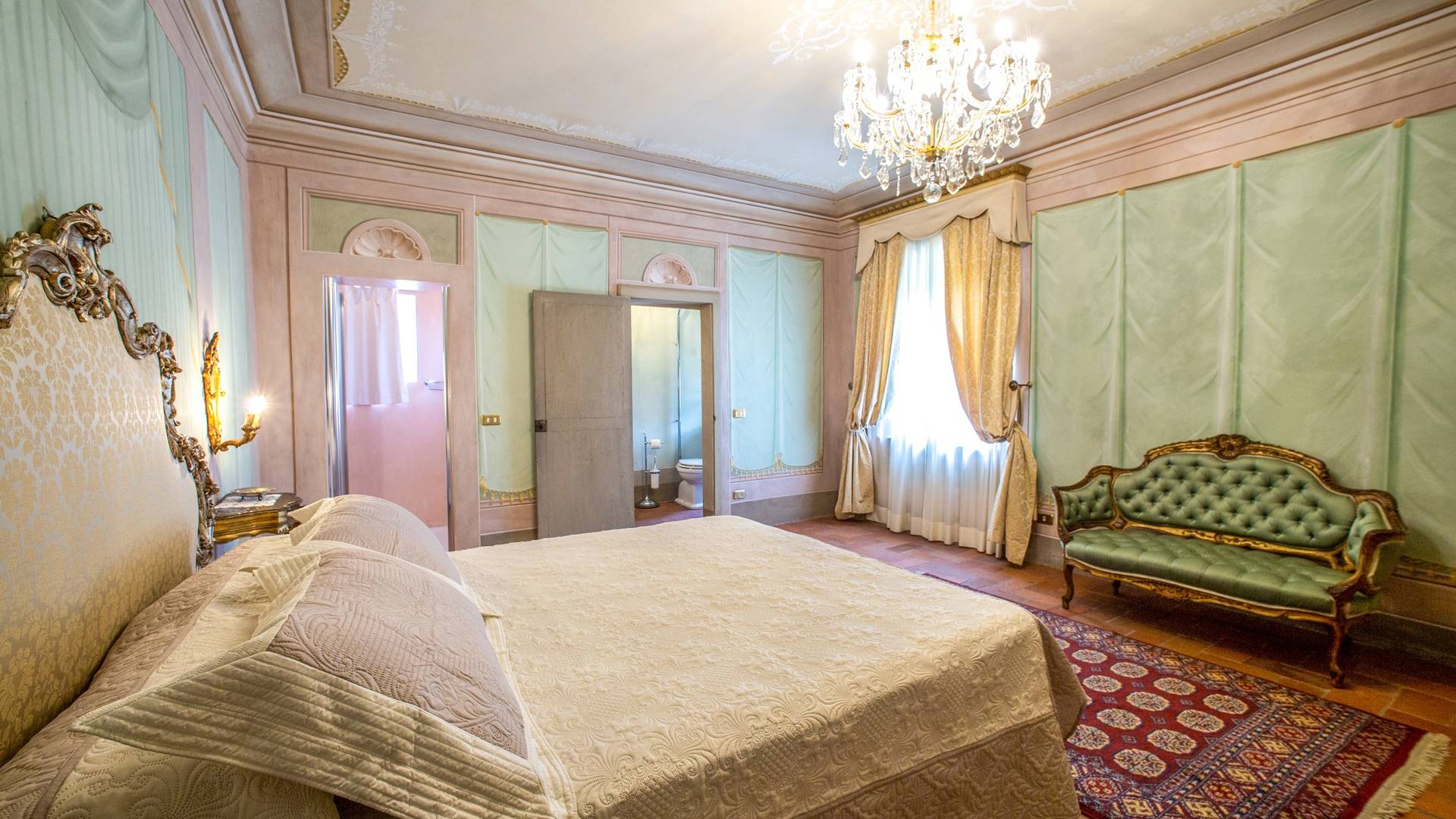 El interior de la villa está decorado con frescos de 1600/1700, restaurados a su esplendor original en 2018. Todos los elementos que decoran esta espectacular propiedad son del más alto valor histórico debido a su autenticidad. Desde los originales pavimentos de terracota hasta los techos con vigas de madera, las encantadoras chimeneas, las columnas de mármol, los preciosos frescos y las decoraciones. Los muebles elegantes y sofisticados con materiales preciosos y dorados elegantes otorgan un gran encanto y emociones únicas a este edificio antiguo. La villa, de aproximadamente 1.000 m2, tiene tres plantas y tiene capacidad para 20 invitados.