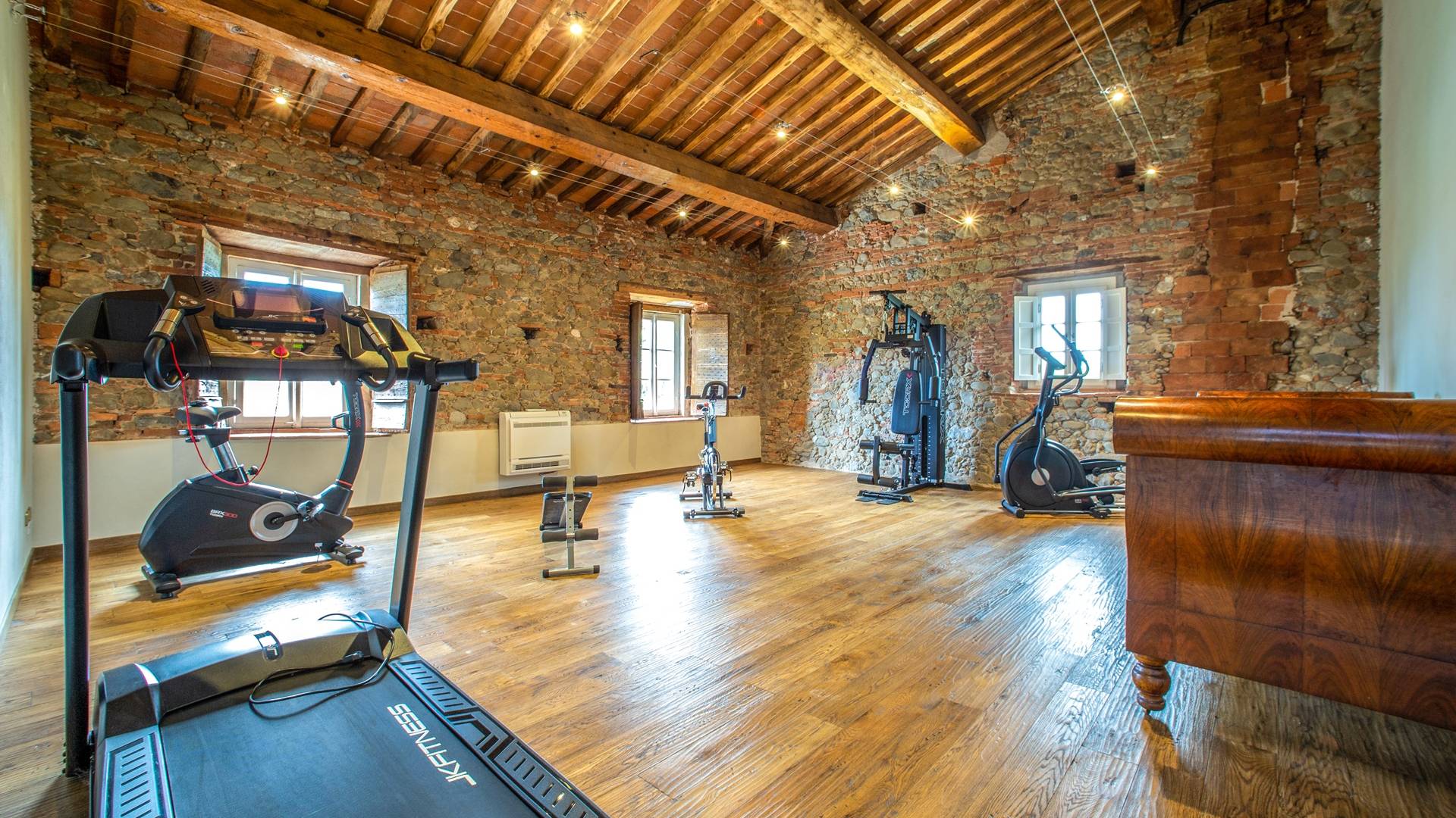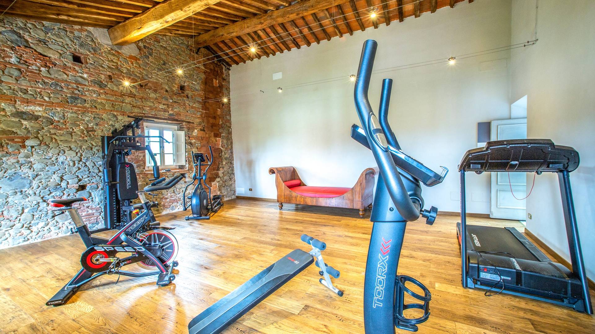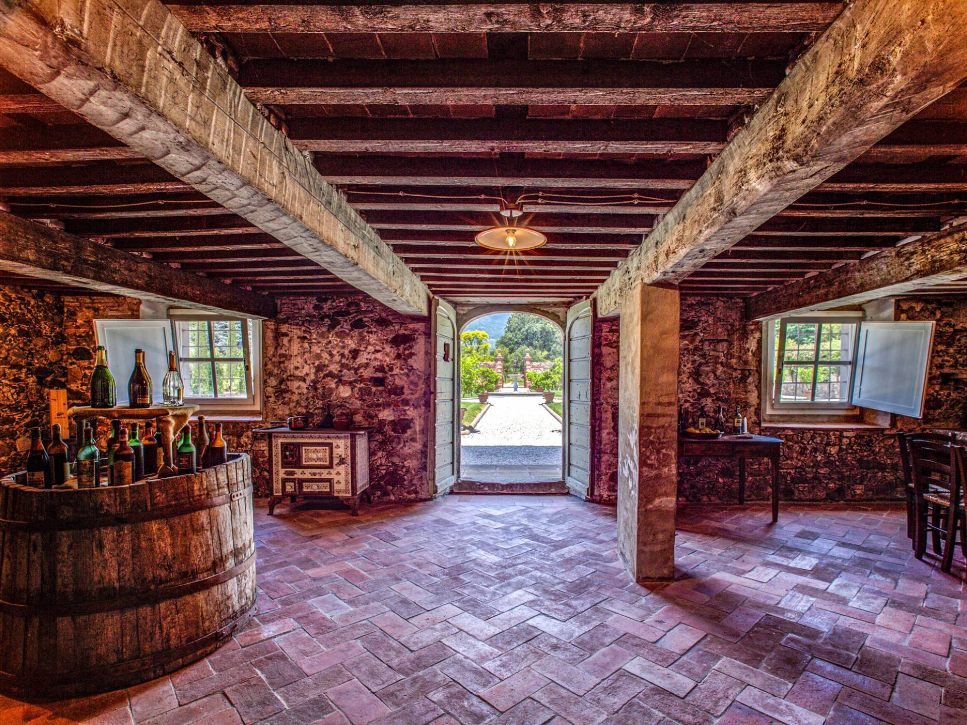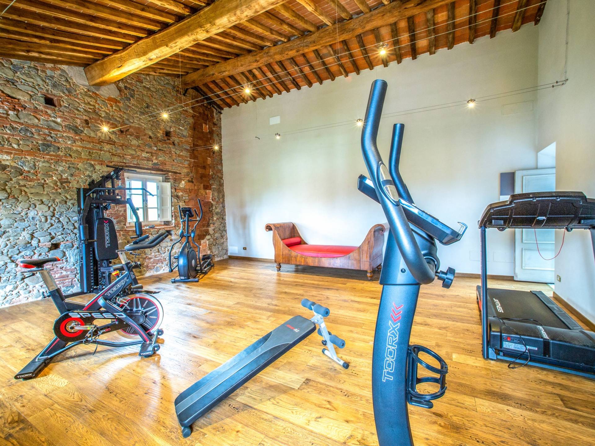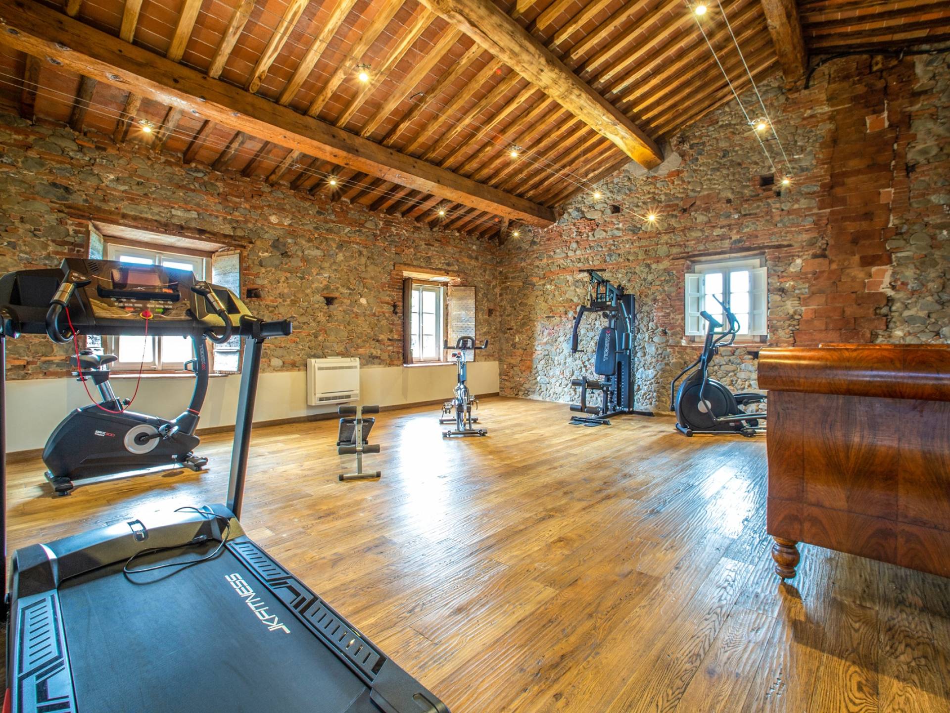 La entrada a un salón por una típica escalera del siglo XVI al estilo de Lucca. Desde este salón central se accede a: un salón con chimenea, un comedor, una cocina que da a un patio cubierto, dos habitaciones dobles, un baño compartido, otra habitación doble con baño independiente, una sala de música con frescos y piano, un estudio, un salón y un baño con ducha. En el segundo piso, hay una gran sala de fitness con todo el equipamiento deportivo moderno, 4 dormitorios dobles, otros 3 dormitorios dobles y 4 baños.