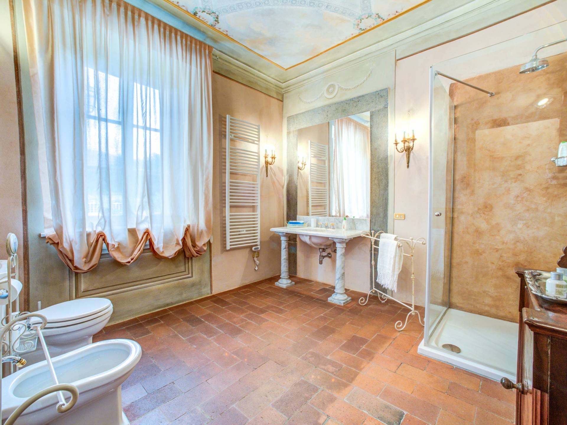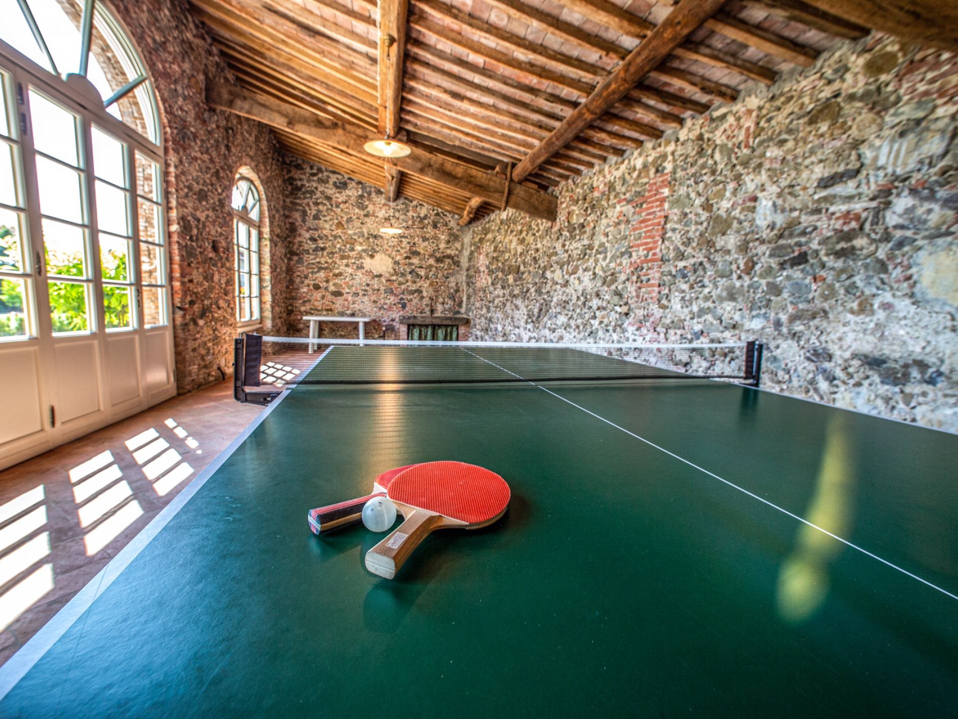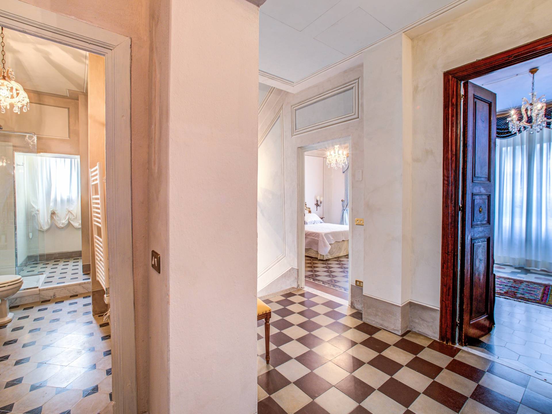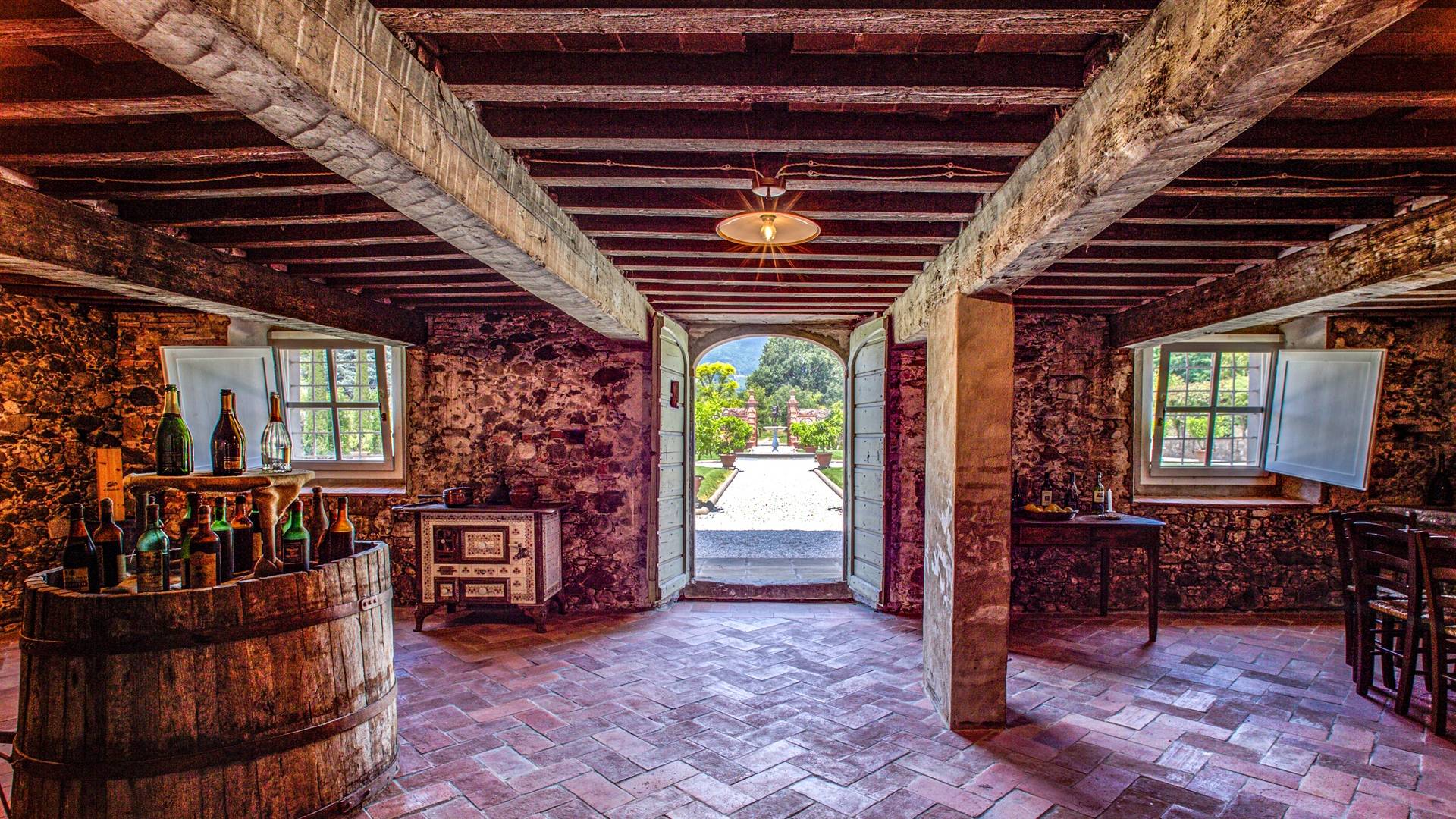 La entrada a un salón por una típica escalera del siglo XVI al estilo de Lucca. Desde este salón central se accede a: un salón con chimenea, un comedor, una cocina que da a un patio cubierto, dos habitaciones dobles, un baño compartido, otra habitación doble con baño independiente, una sala de música con frescos y piano, un estudio, un salón y un baño con ducha. En el segundo piso, hay una gran sala de fitness con todo el equipamiento deportivo moderno, 4 dormitorios dobles, otros 3 dormitorios dobles y 4 baños.