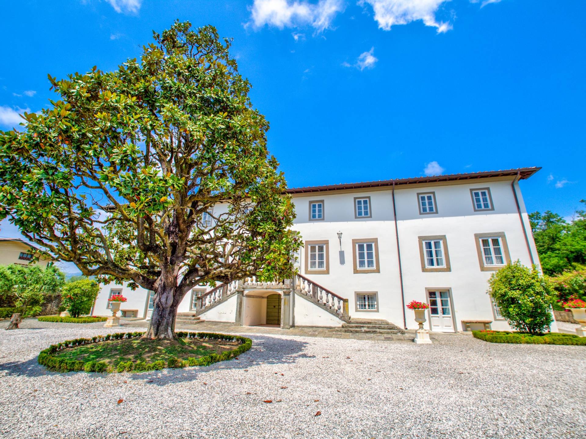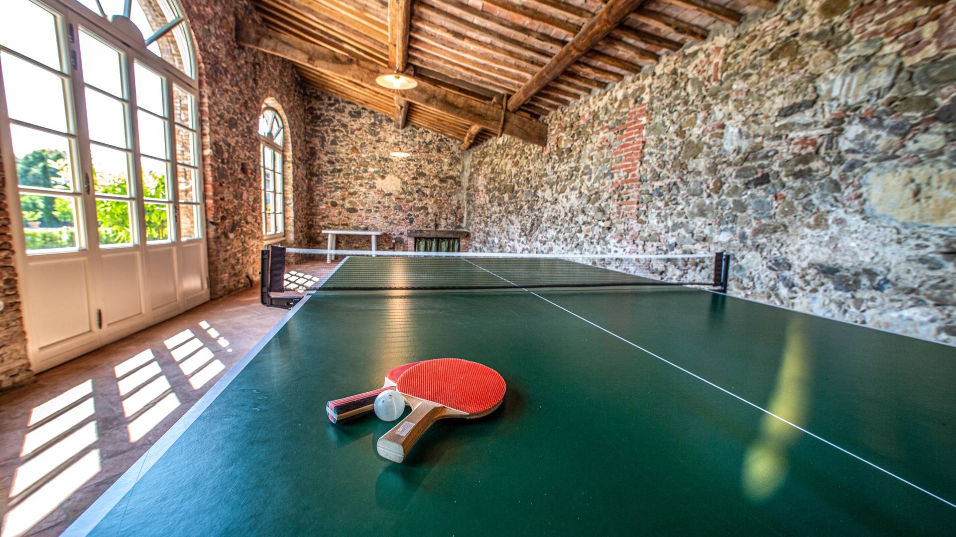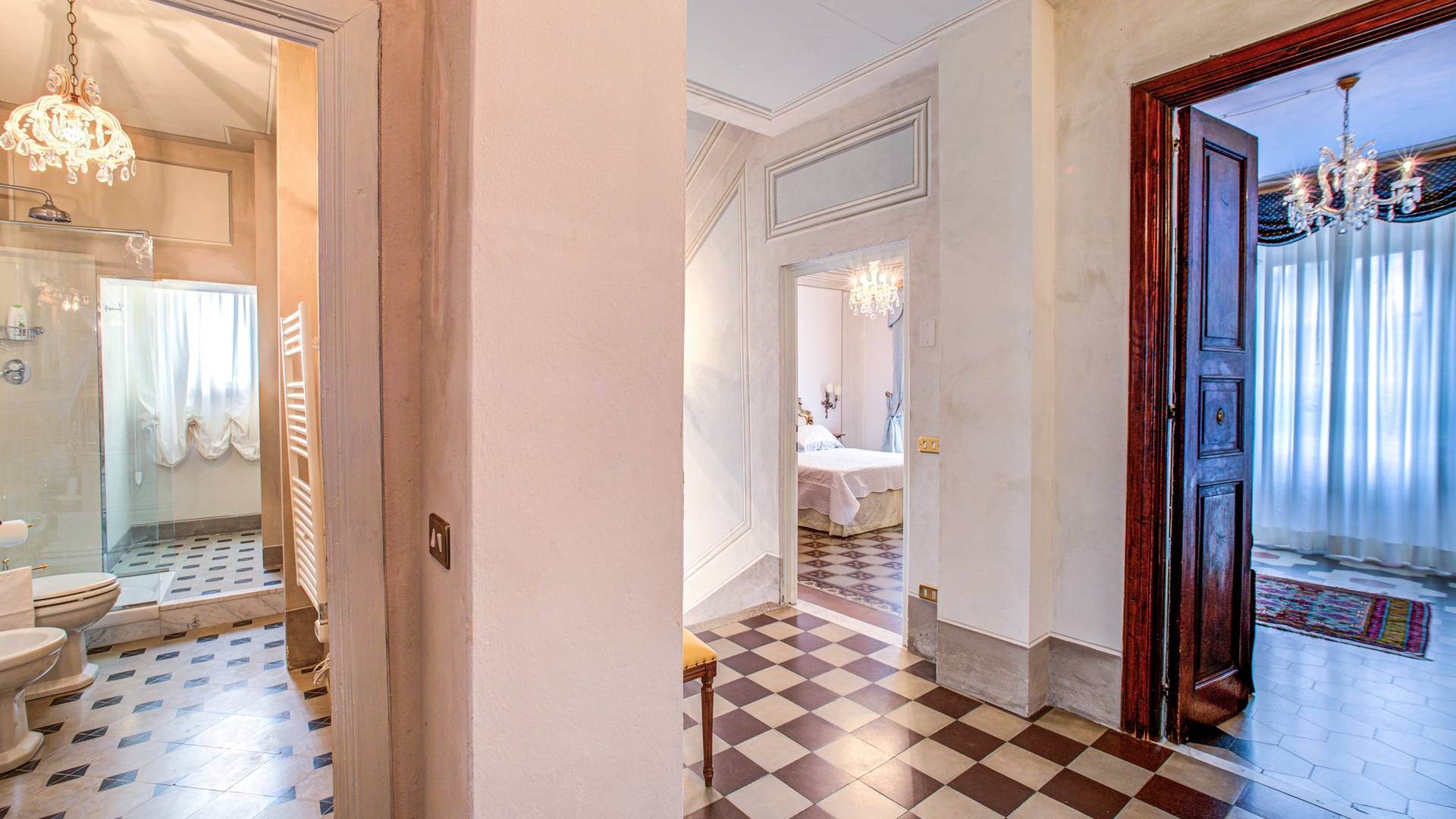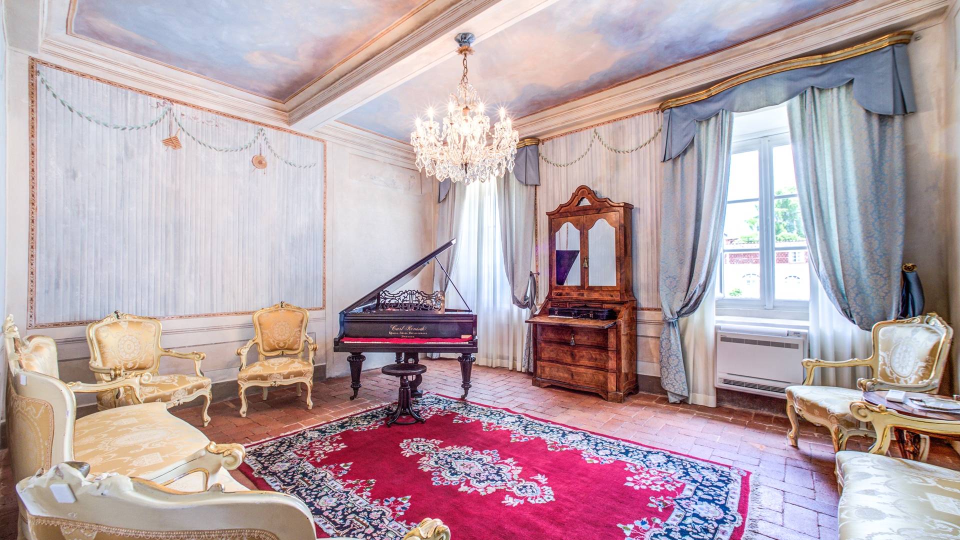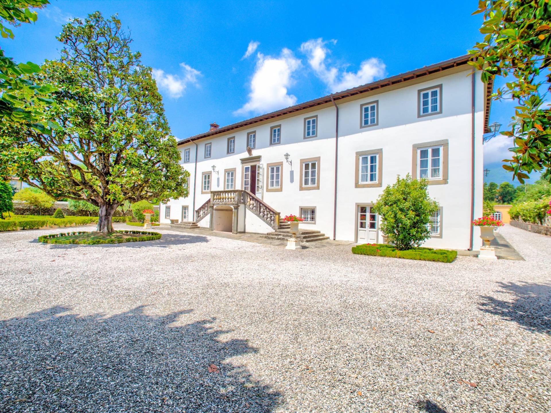 La entrada a un salón por una típica escalera del siglo XVI al estilo de Lucca. Desde este salón central se accede a: un salón con chimenea, un comedor, una cocina que da a un patio cubierto, dos habitaciones dobles, un baño compartido, otra habitación doble con baño independiente, una sala de música con frescos y piano, un estudio, un salón y un baño con ducha. En el segundo piso, hay una gran sala de fitness con todo el equipamiento deportivo moderno, 4 dormitorios dobles, otros 3 dormitorios dobles y 4 baños.