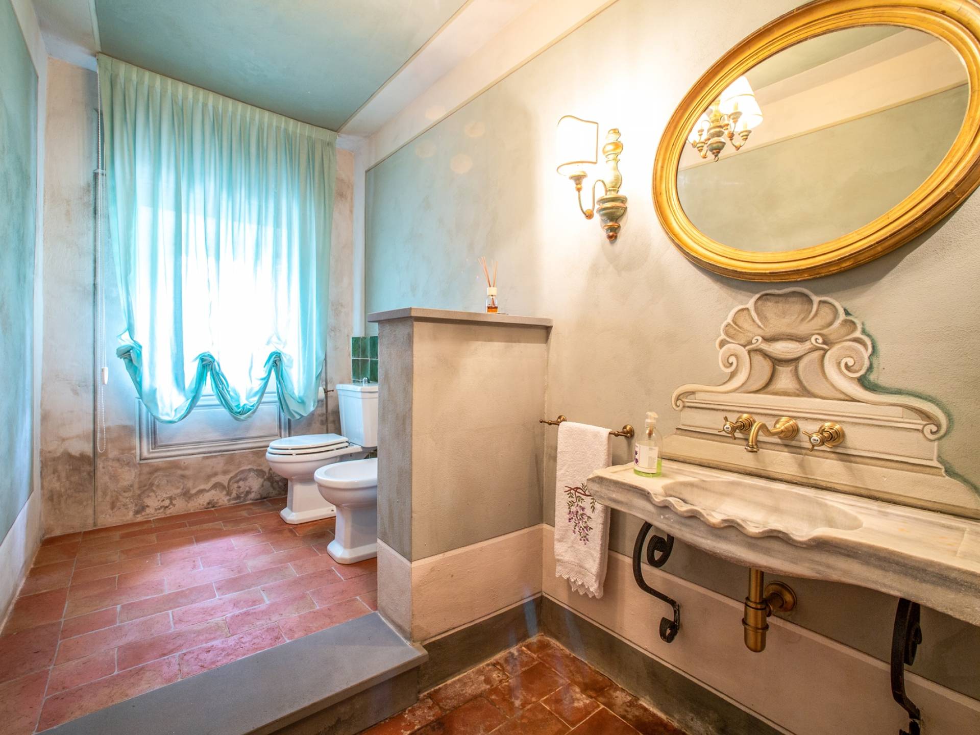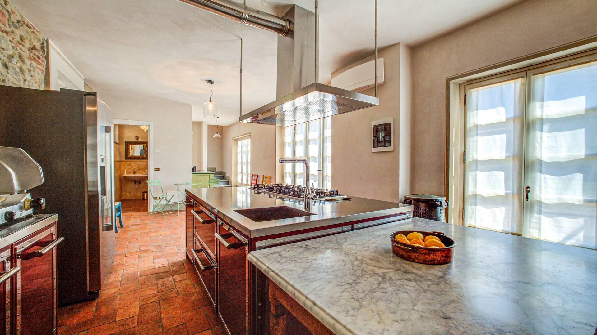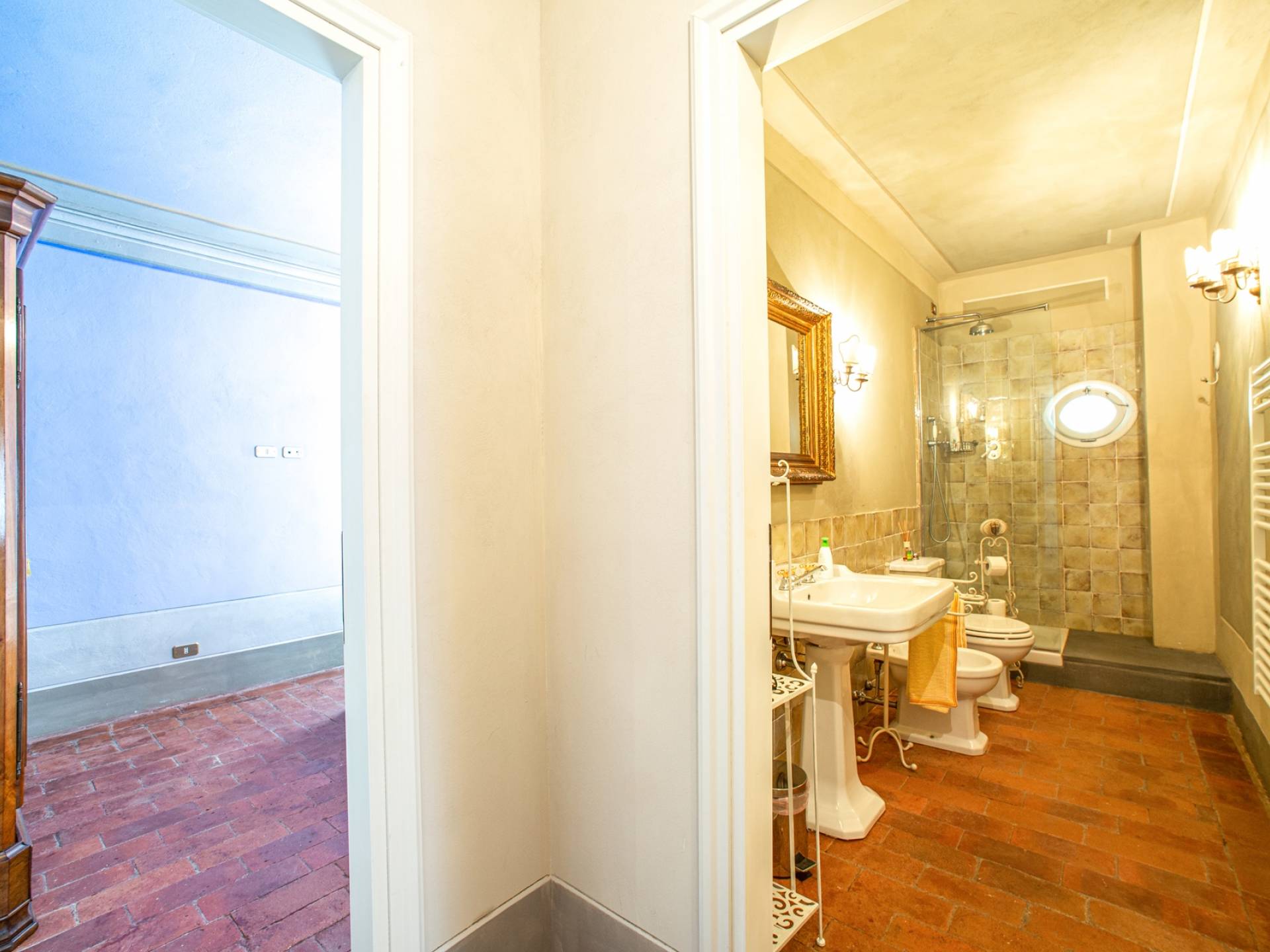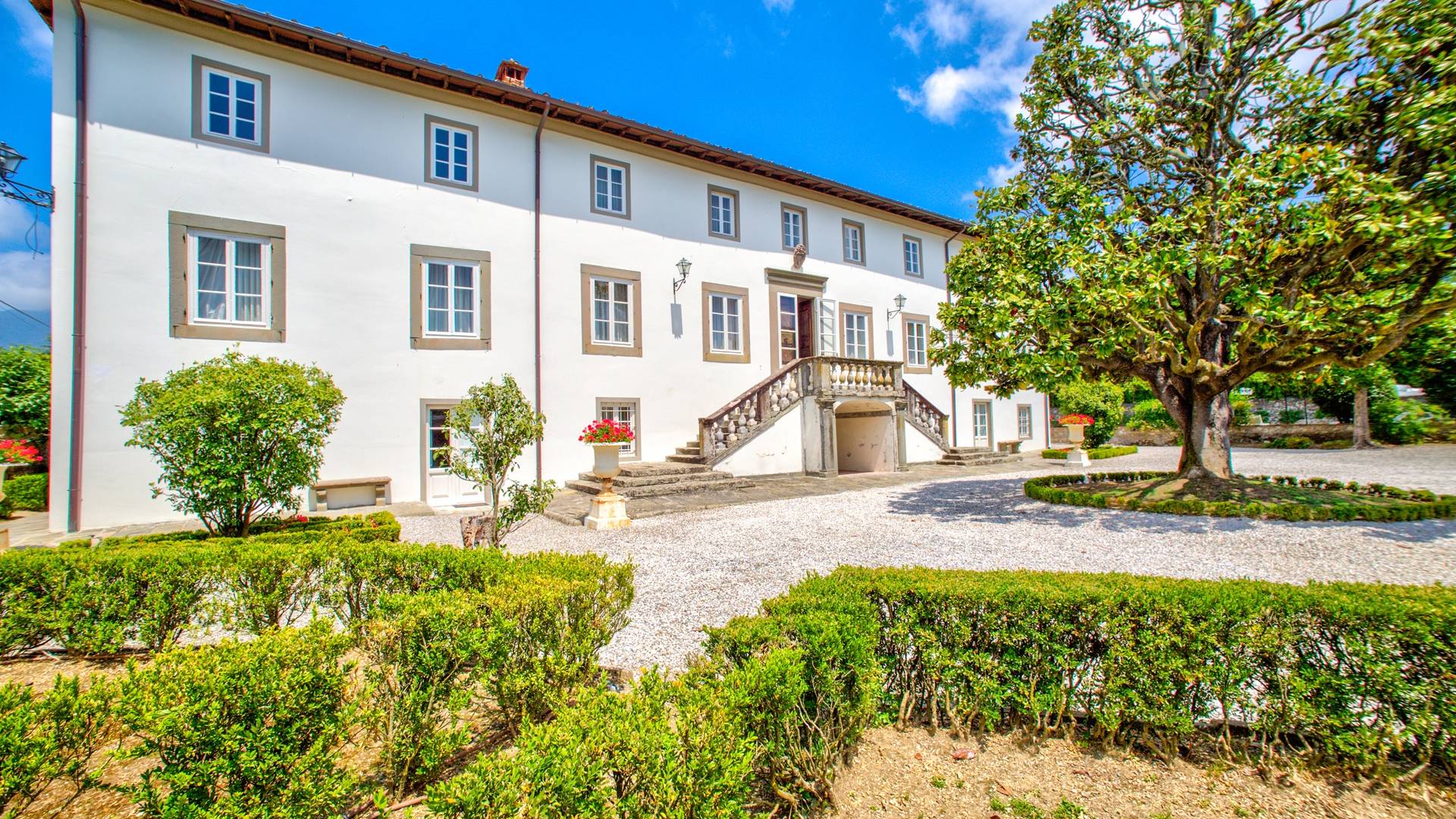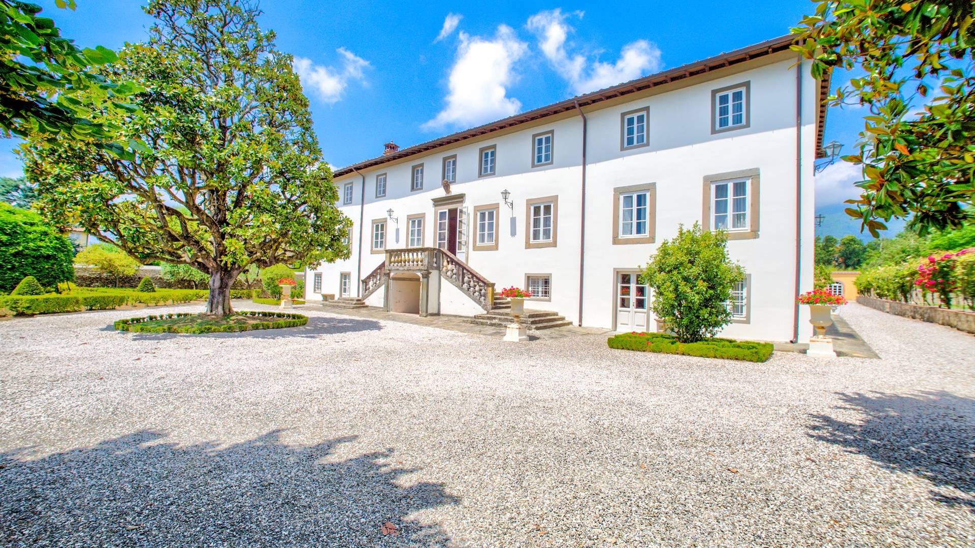 La entrada a un salón por una típica escalera del siglo XVI al estilo de Lucca. Desde este salón central se accede a: un salón con chimenea, un comedor, una cocina que da a un patio cubierto, dos habitaciones dobles, un baño compartido, otra habitación doble con baño independiente, una sala de música con frescos y piano, un estudio, un salón y un baño con ducha. En el segundo piso, hay una gran sala de fitness con todo el equipamiento deportivo moderno, 4 dormitorios dobles, otros 3 dormitorios dobles y 4 baños.