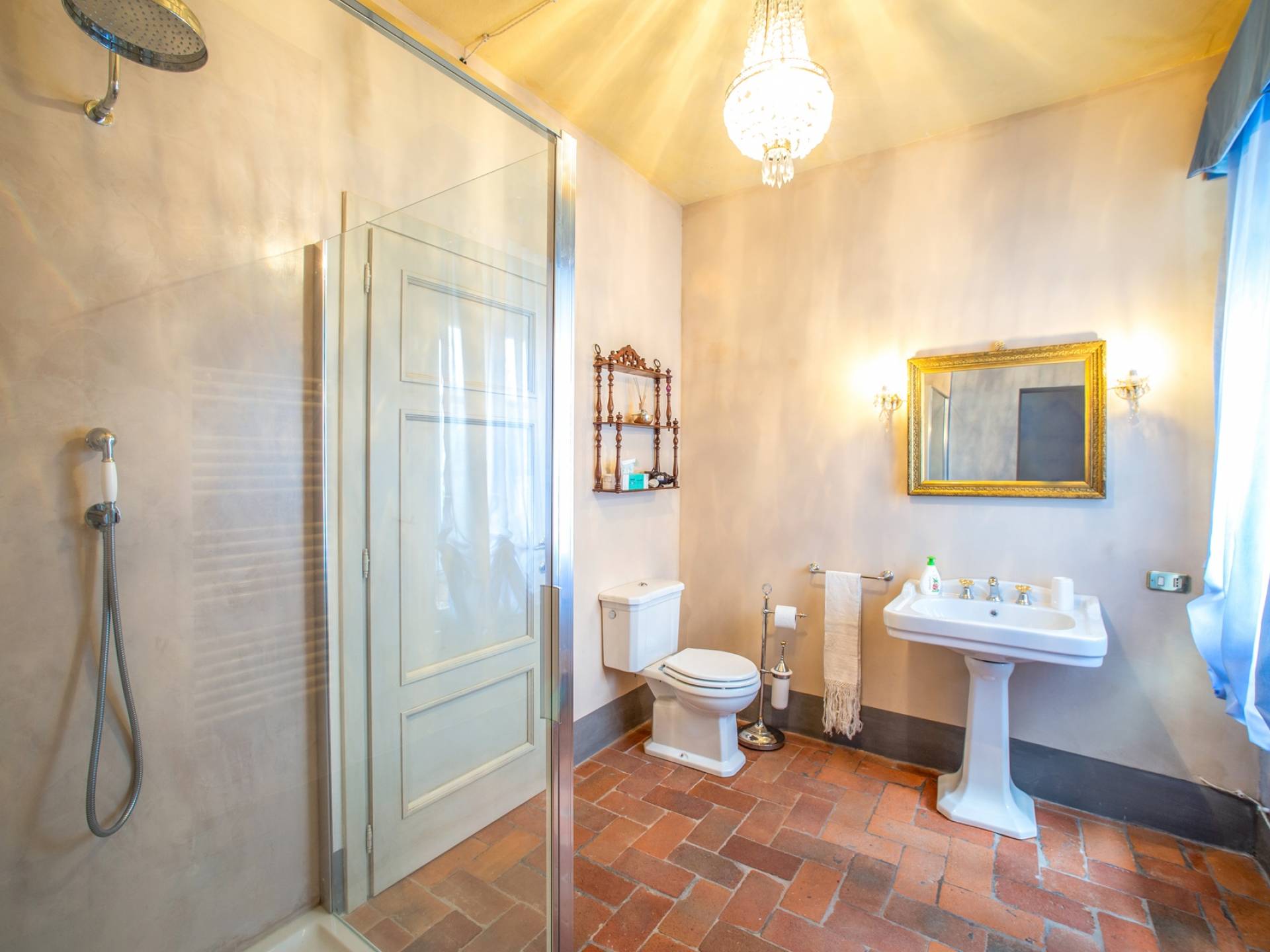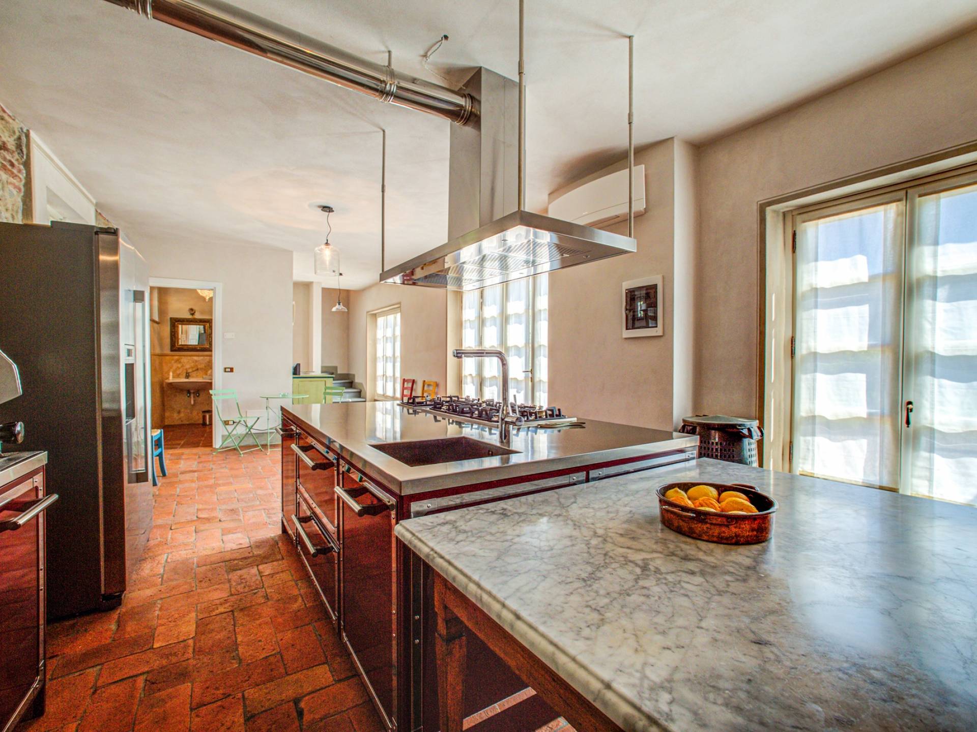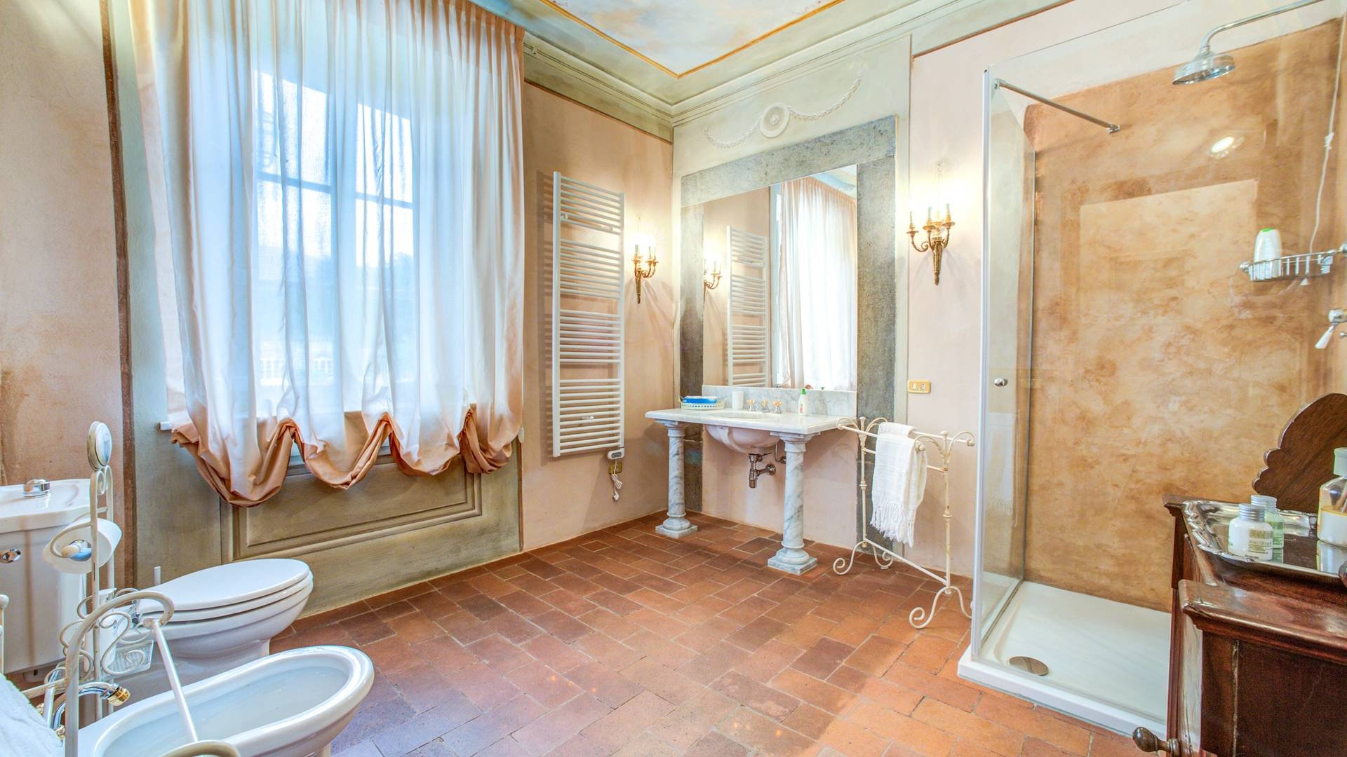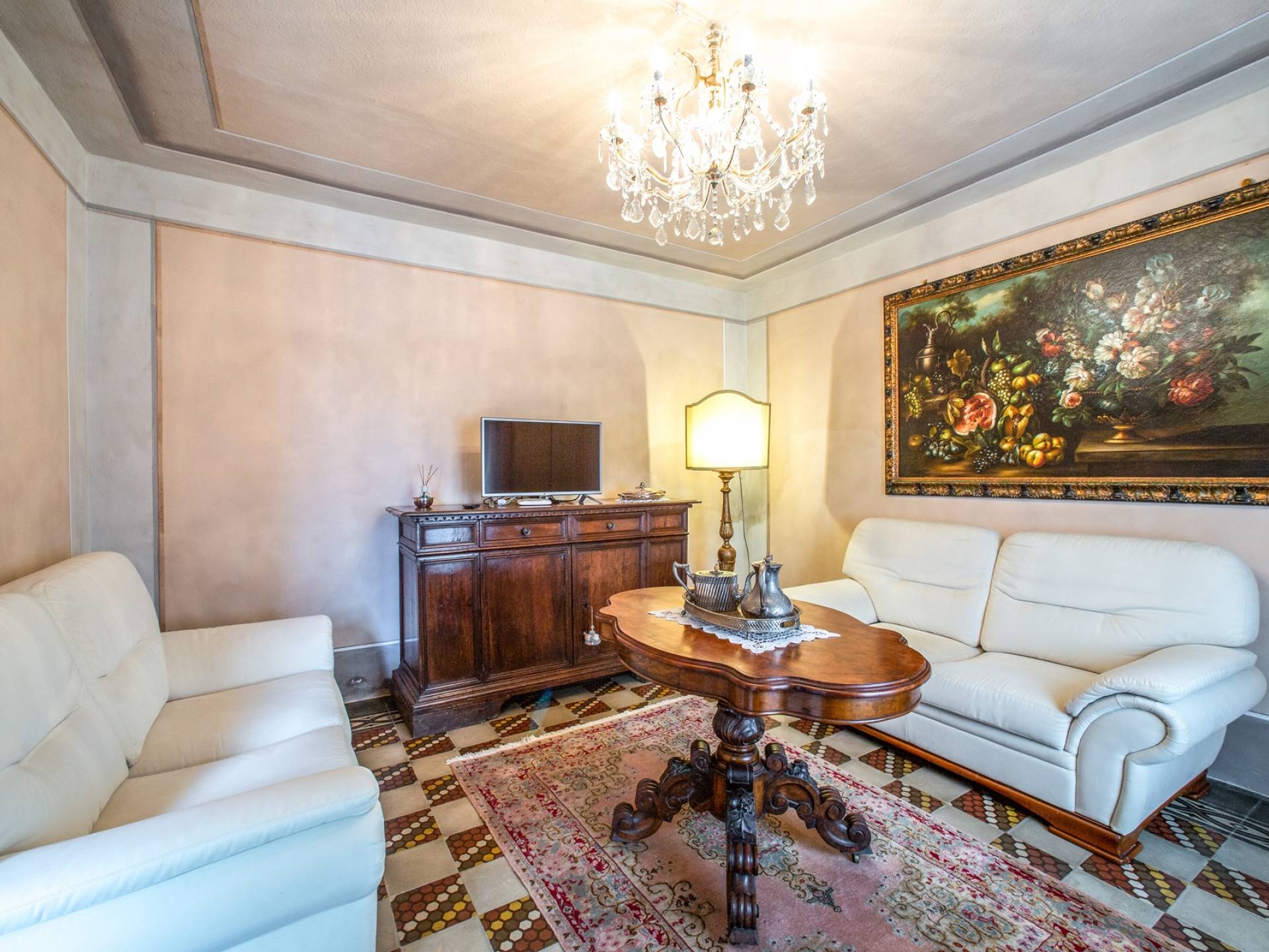 La entrada a un salón por una típica escalera del siglo XVI al estilo de Lucca. Desde este salón central se accede a: un salón con chimenea, un comedor, una cocina que da a un patio cubierto, dos habitaciones dobles, un baño compartido, otra habitación doble con baño independiente, una sala de música con frescos y piano, un estudio, un salón y un baño con ducha. En el segundo piso, hay una gran sala de fitness con todo el equipamiento deportivo moderno, 4 dormitorios dobles, otros 3 dormitorios dobles y 4 baños.