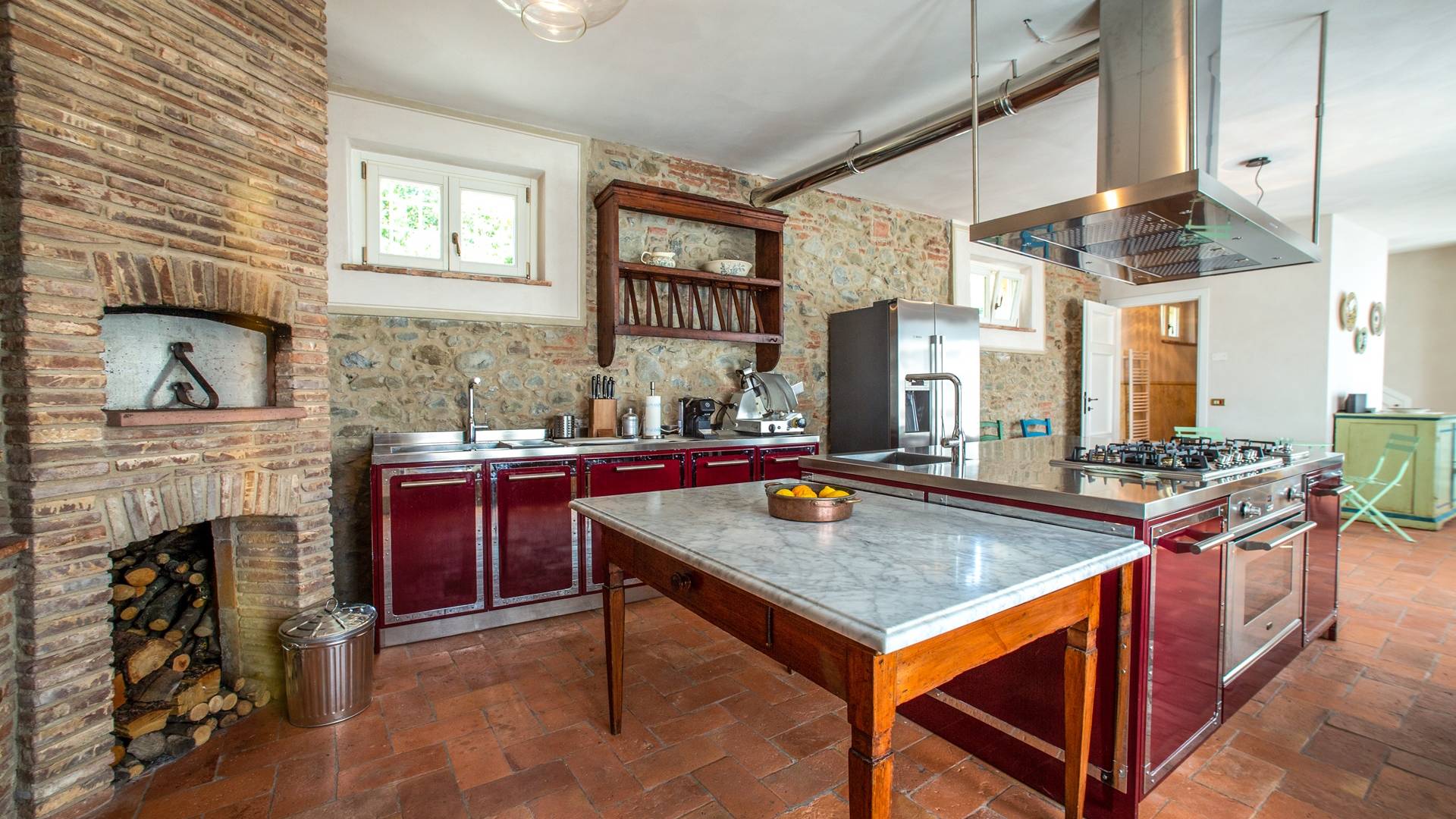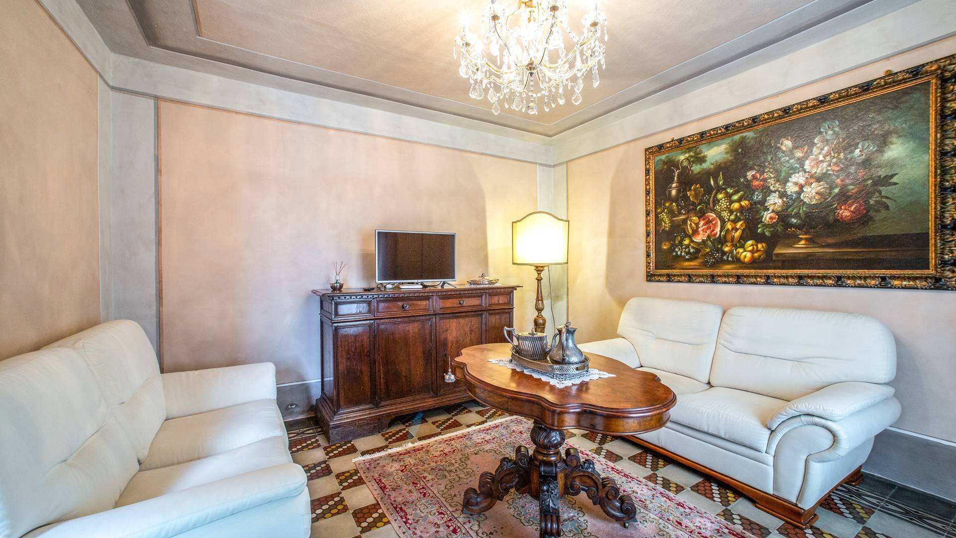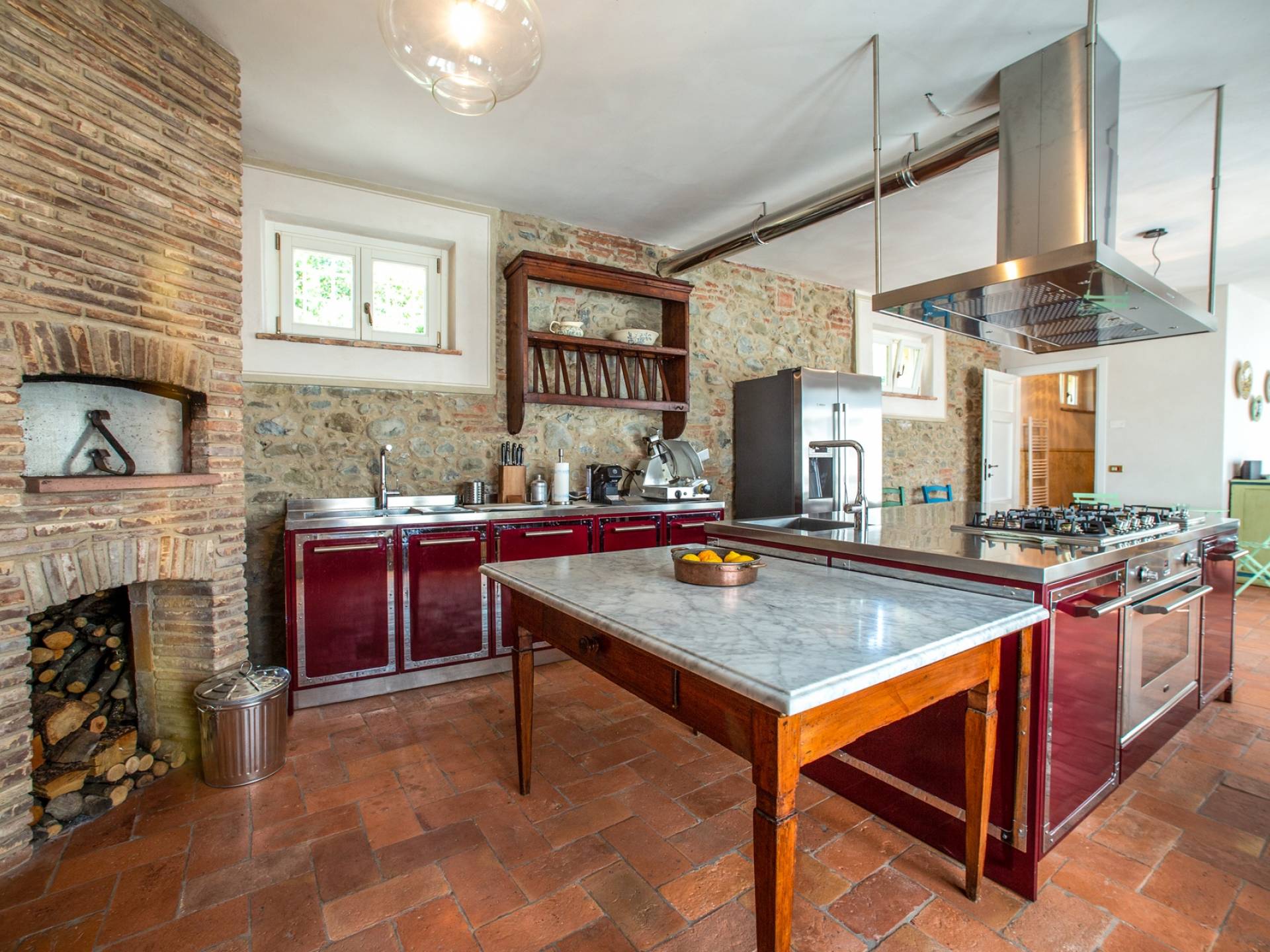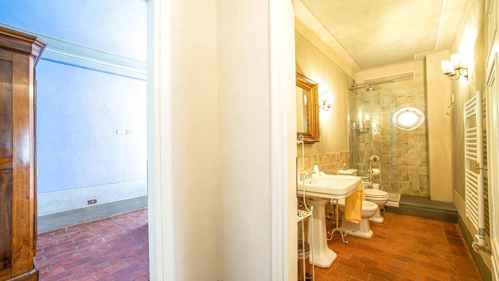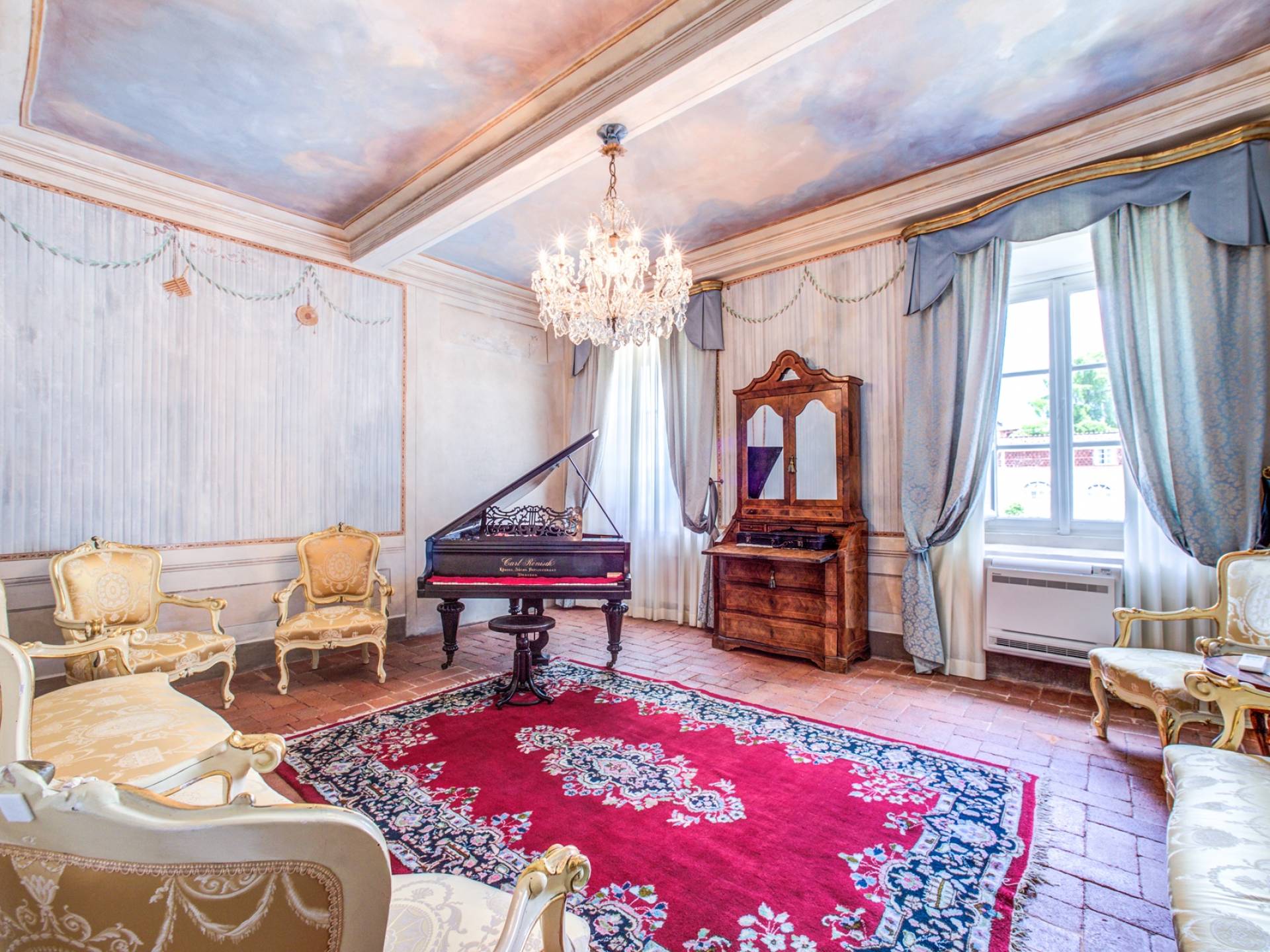 La entrada a un salón por una típica escalera del siglo XVI al estilo de Lucca. Desde este salón central se accede a: un salón con chimenea, un comedor, una cocina que da a un patio cubierto, dos habitaciones dobles, un baño compartido, otra habitación doble con baño independiente, una sala de música con frescos y piano, un estudio, un salón y un baño con ducha. En el segundo piso, hay una gran sala de fitness con todo el equipamiento deportivo moderno, 4 dormitorios dobles, otros 3 dormitorios dobles y 4 baños.