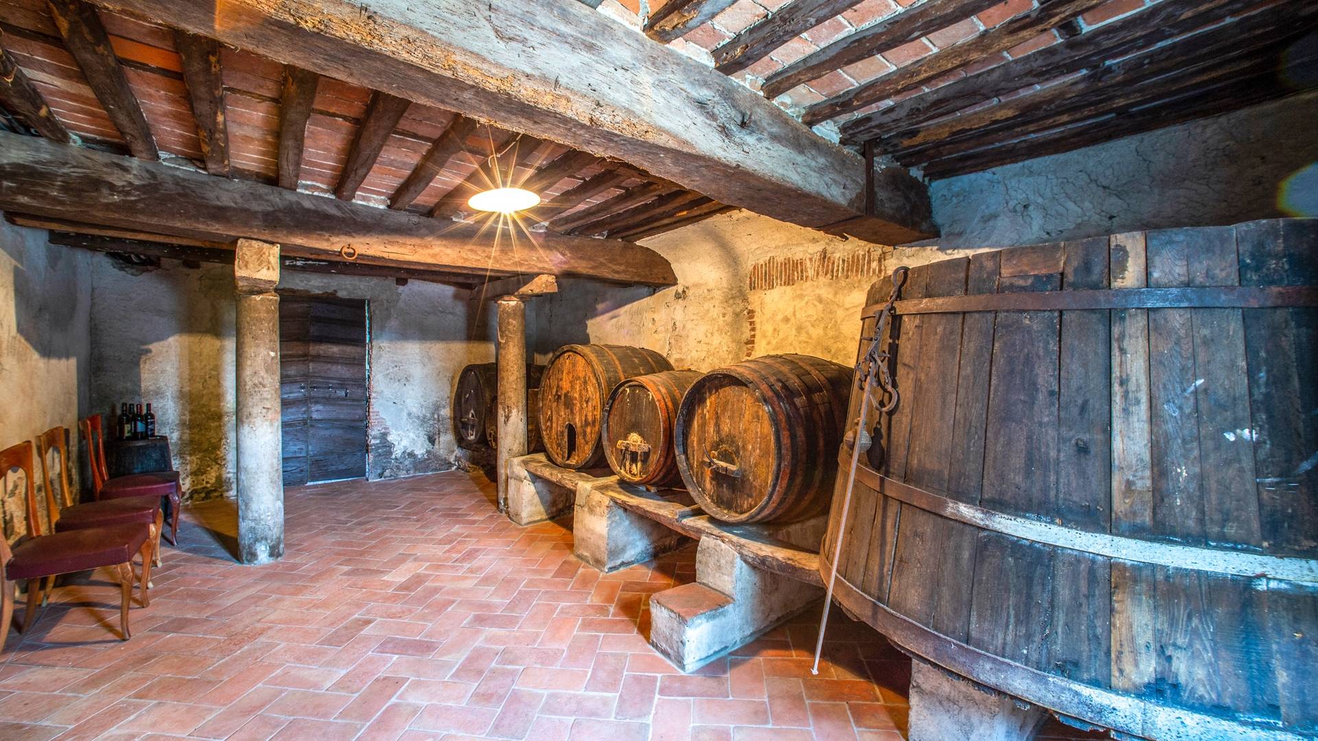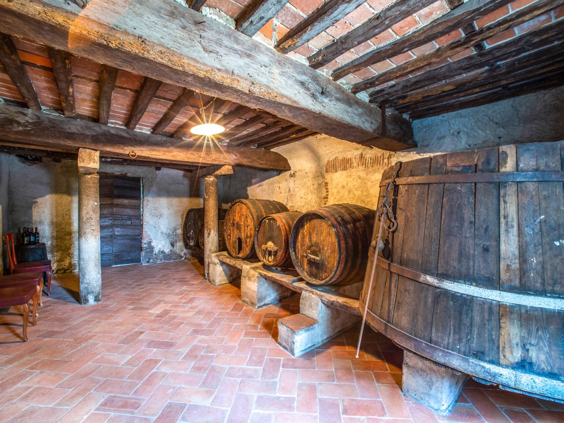 En el primer piso se encuentra la cocina principal con la estufa de leña original y se abre al jardín; el comedor, closet, dos baños con wc, bidet y lavamanos, una segunda cocina más pequeña, y una sala de estar. La bodega original se ha convertido en bodega, con las barricas de madera originales, una zona para catas y una sala especial con una excelente selección de vinos. Desde el sótano hay una entrada directa al jardín.