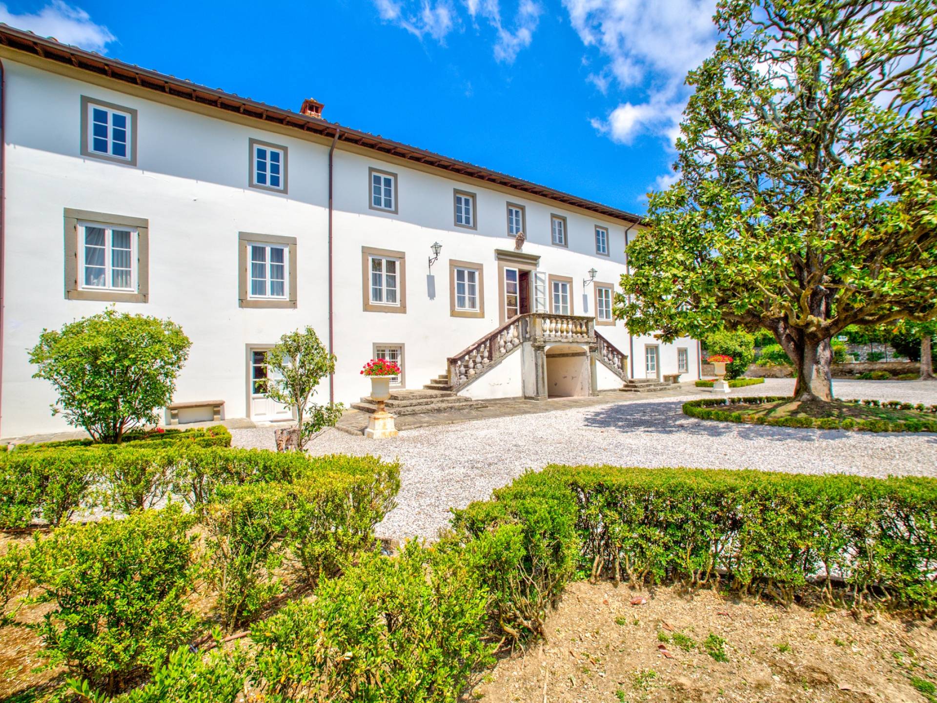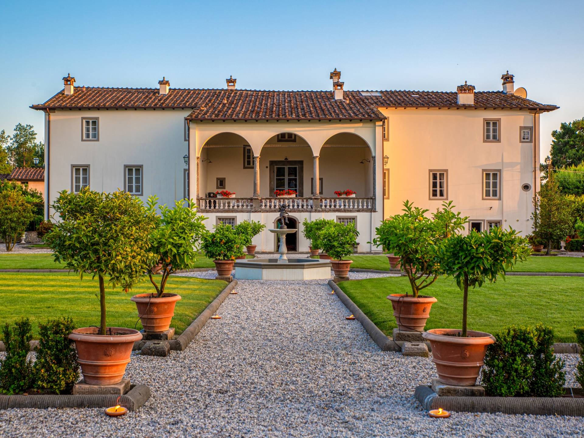 La arquitectura recuerda el estilo del siglo XV con la escalera de entrada de dos niveles en la fachada principal, con balaustrada y columnas en piedra, y la logia de tres arcos de orden típico toscano frente a la fachada posterior. La propiedad tiene un parque con árboles centenarios, espléndidas plantas mediterráneas y un jardín de frutas. Una galería de rosas atraviesa un lado del jardín, desde la piscina (13/6mtrs y de 1,10 a 1,60 de profundidad) hasta las casitas de limón una de las cuales tiene mesa de ping pong y billar mientras que la otra tiene cocina para clases de cocina y pizza fiestas. Estos también se pueden utilizar para ocasiones especiales o simplemente para leer y relajarse.