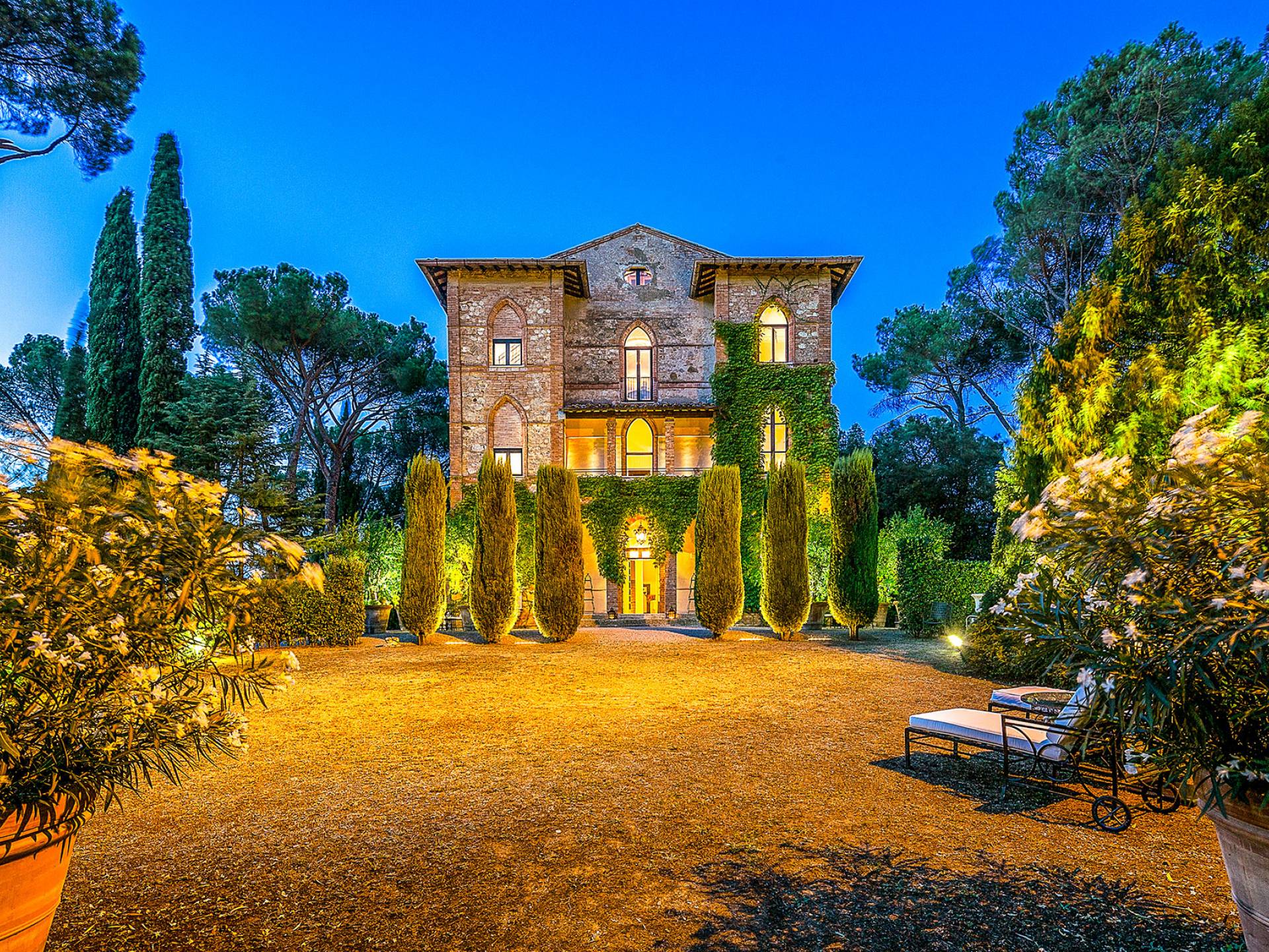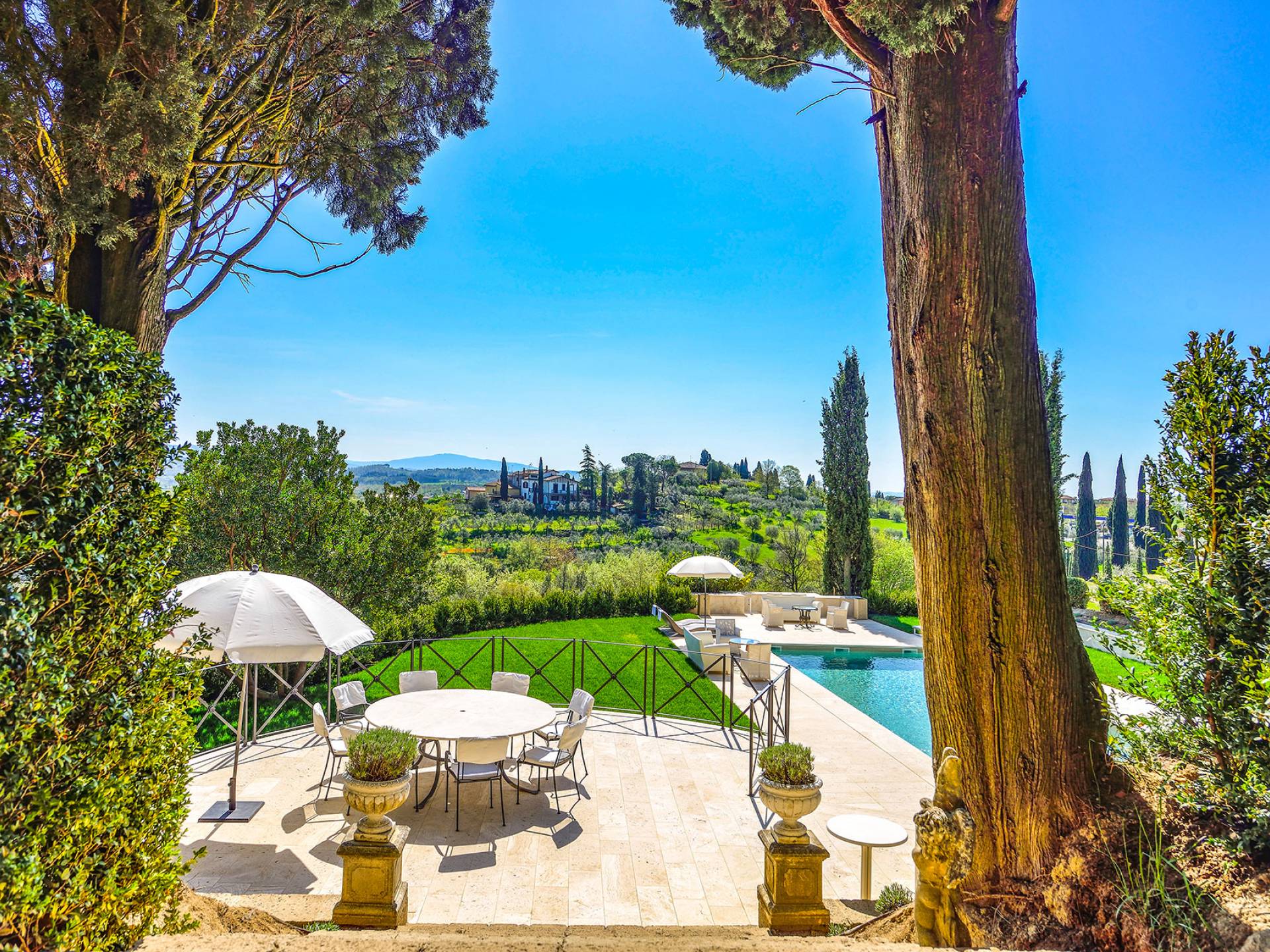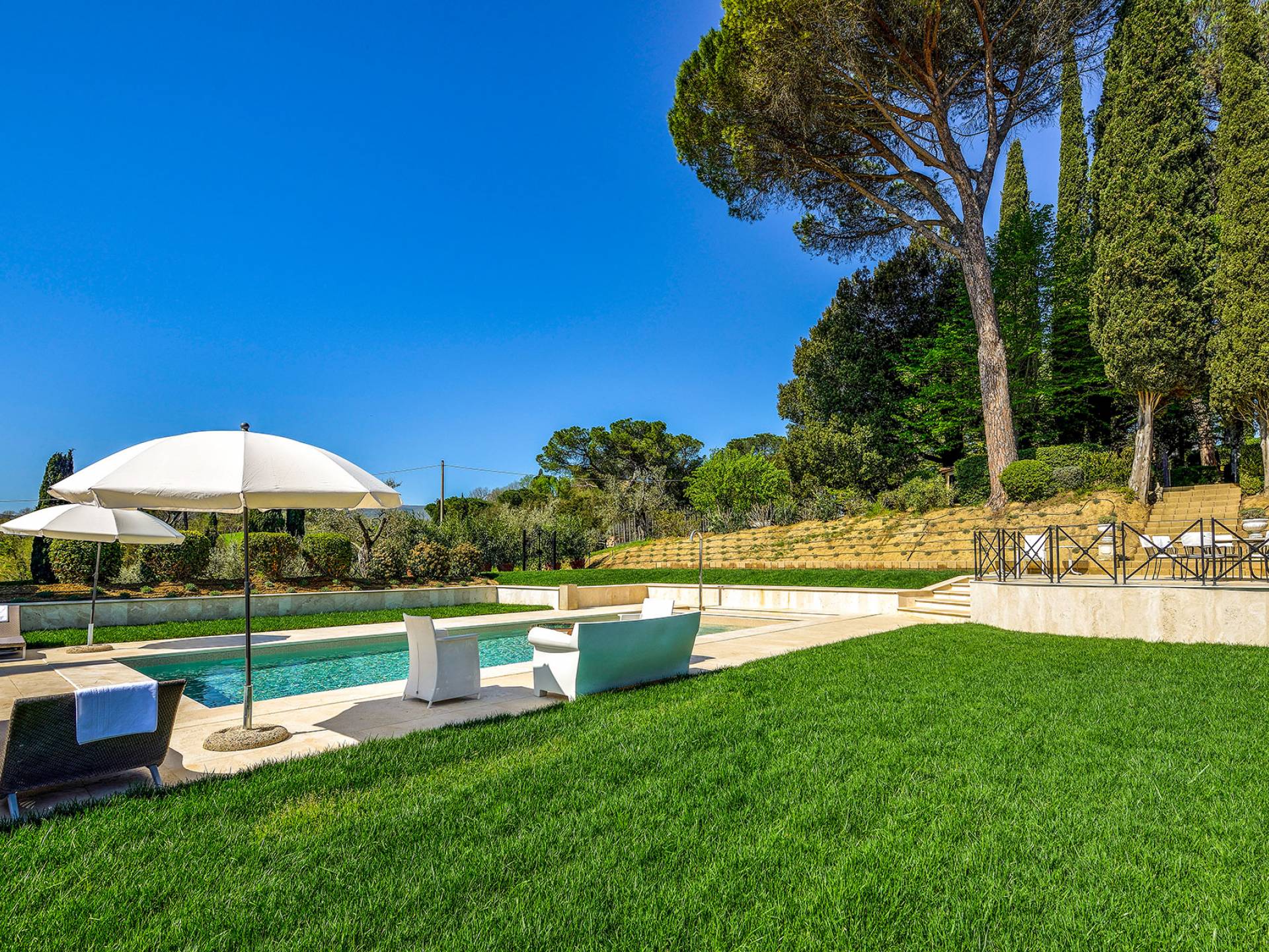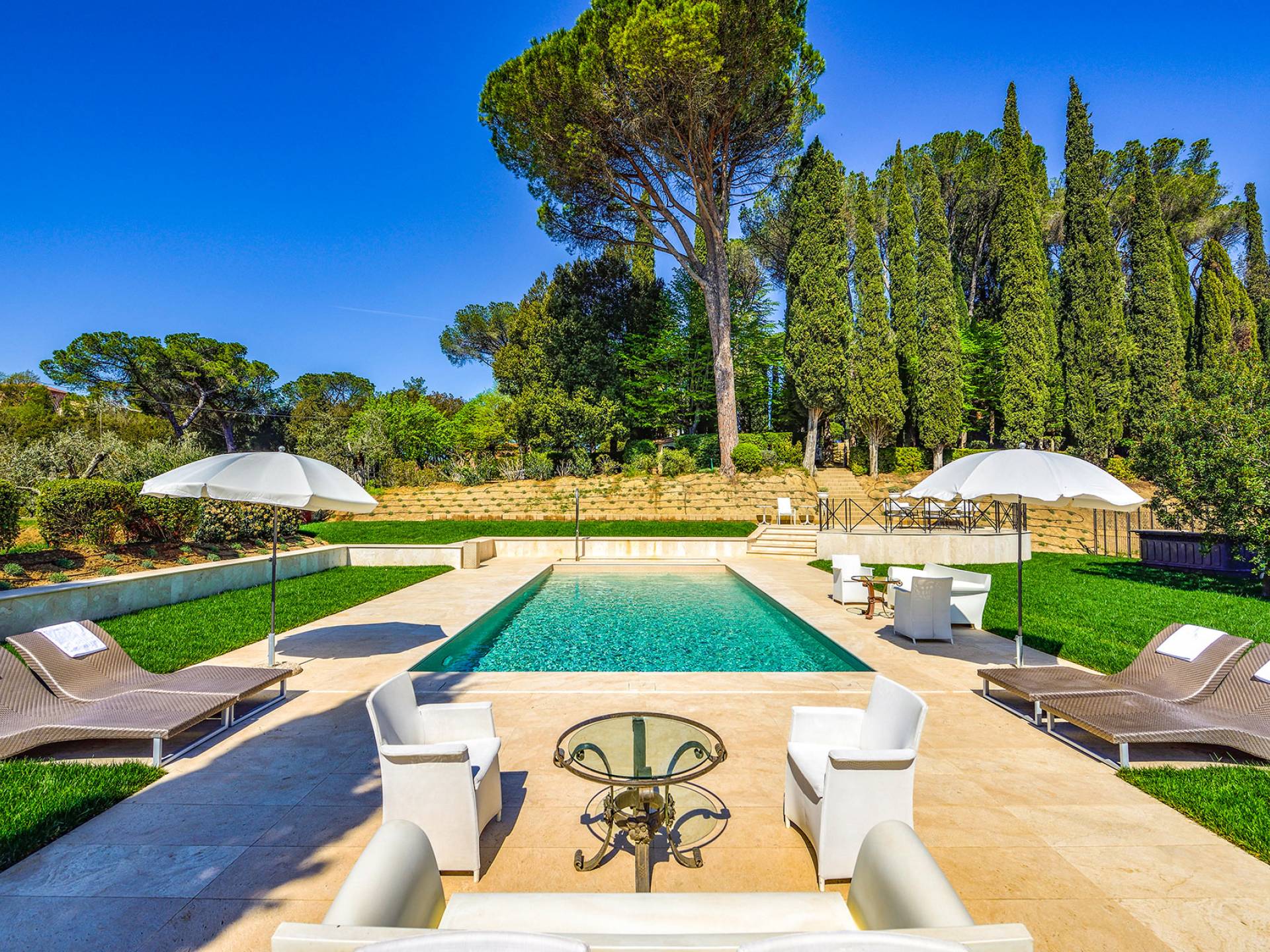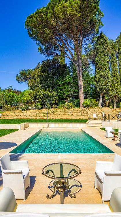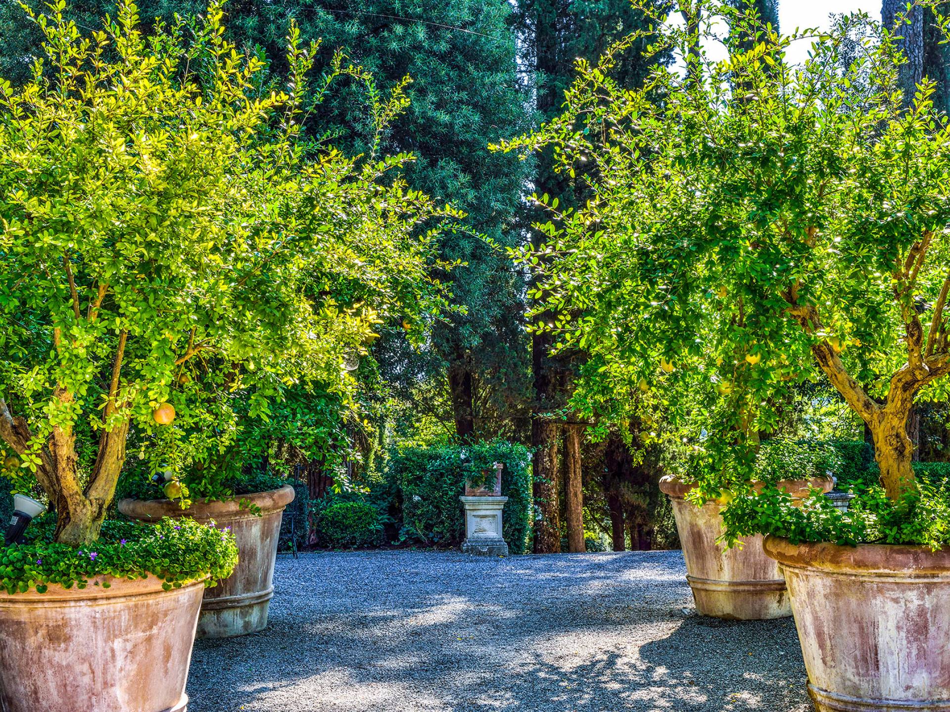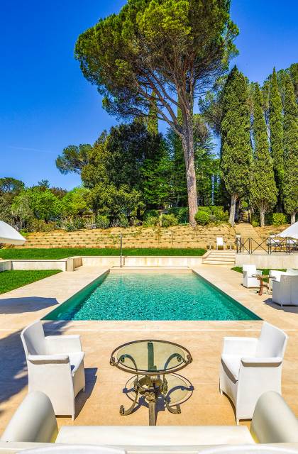 La finca tiene 398 metros y 1309 pies sobre el nivel del mar, también tiene 700 metros cuadrados y 7560 Sq. Pies de espacio habitable y casi 60 acres de tierra rodean la villa con un parque italiano totalmente privado marcado con la flora característica de los prestigiosos jardines toscanos. Los centenarios cedros, olmos, pinos mediterráneos, cipreses, arbustos de caja, laurel, limoneros y granados dominan el extenso huerto de olivos del que el propietario produce un aceite de oliva exquisito y excepcional. 8 o 12 en la villa principal o 16 en un anexo es el número máximo de huéspedes que la propiedad puede acomodar.