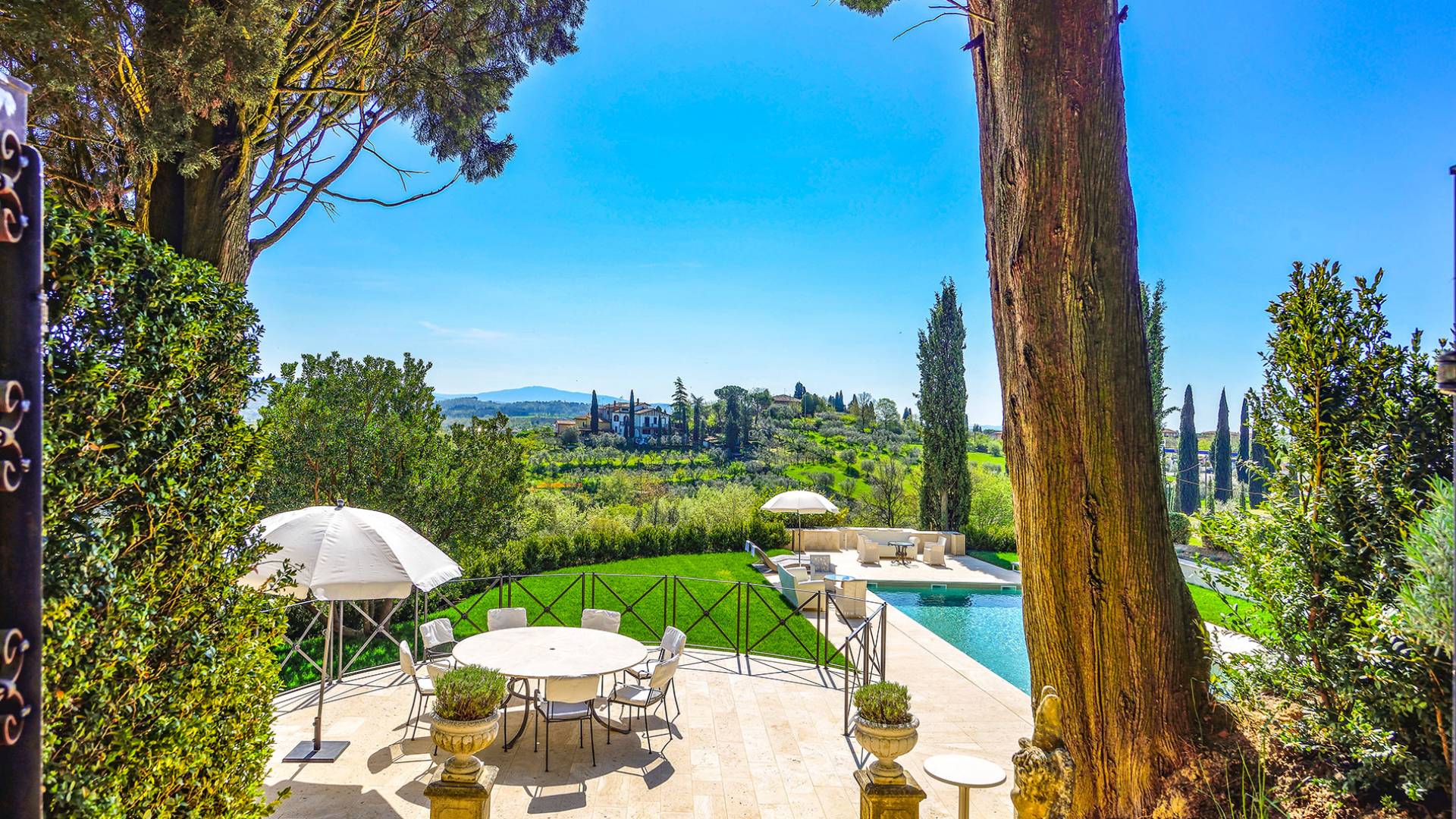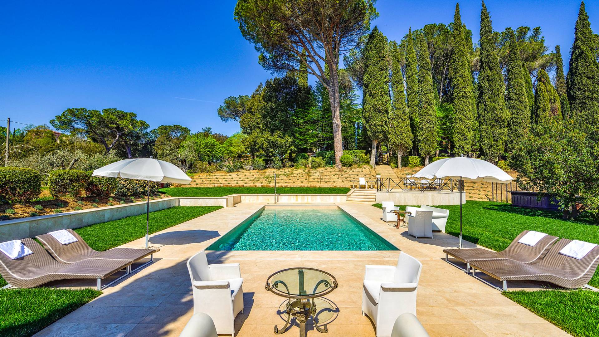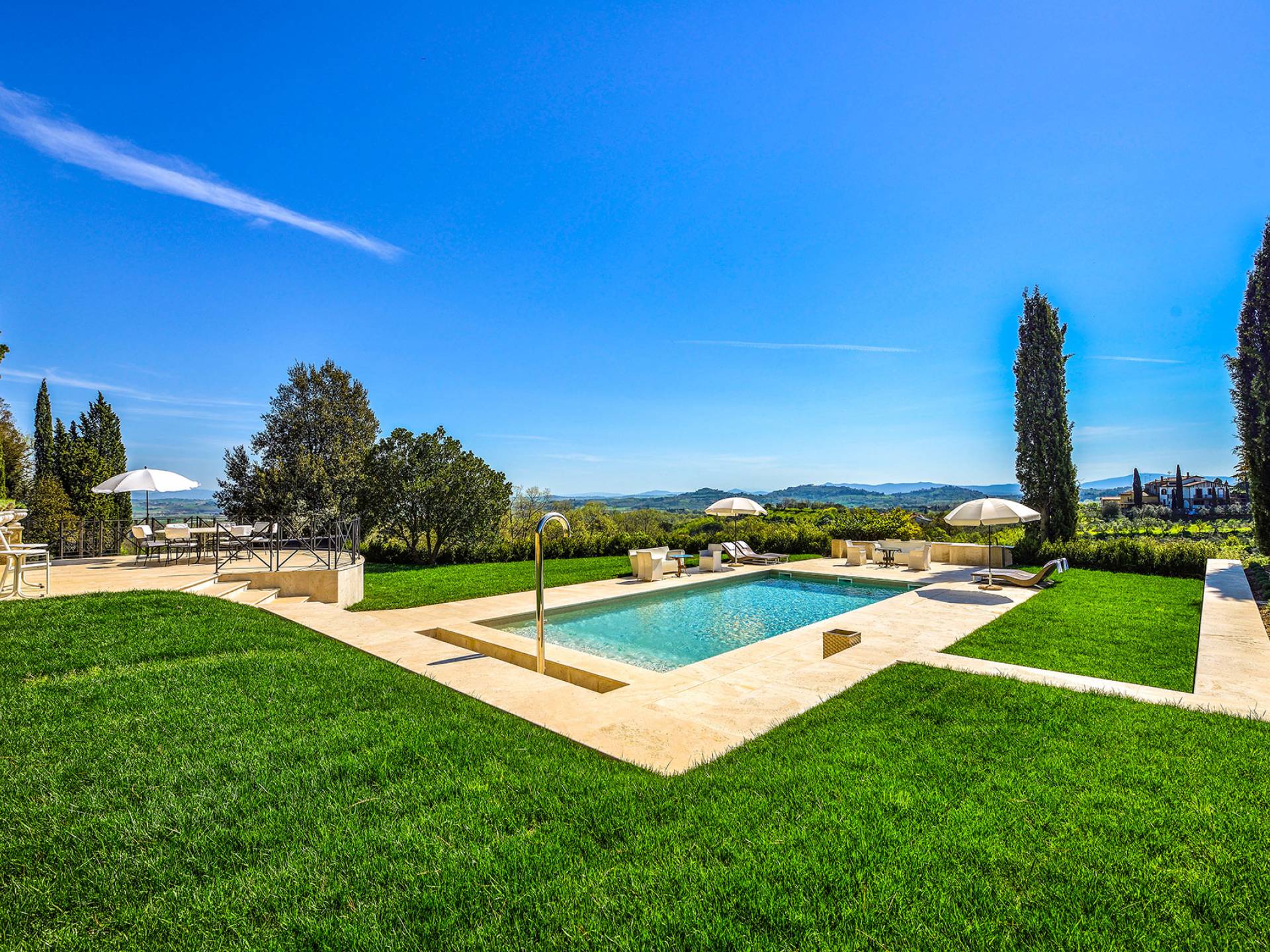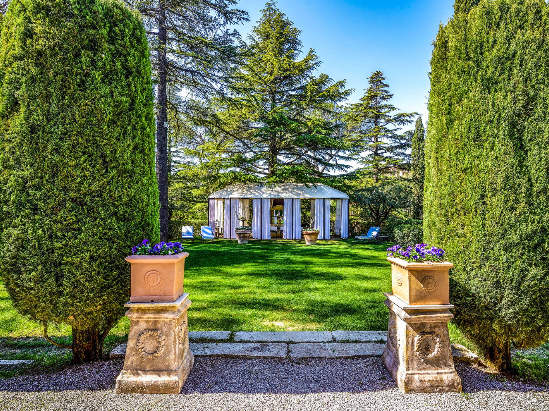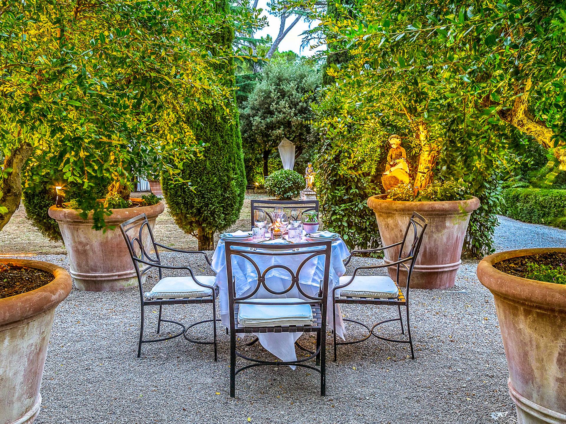 La finca tiene 398 metros y 1309 pies sobre el nivel del mar, también tiene 700 metros cuadrados y 7560 Sq. Pies de espacio habitable y casi 60 acres de tierra rodean la villa con un parque italiano totalmente privado marcado con la flora característica de los prestigiosos jardines toscanos. Los centenarios cedros, olmos, pinos mediterráneos, cipreses, arbustos de caja, laurel, limoneros y granados dominan el extenso huerto de olivos del que el propietario produce un aceite de oliva exquisito y excepcional. 8 o 12 en la villa principal o 16 en un anexo es el número máximo de huéspedes que la propiedad puede acomodar.