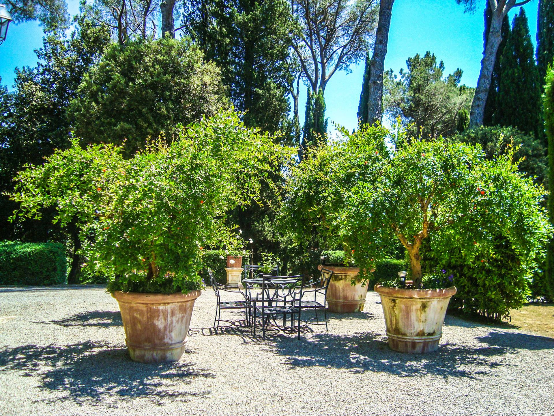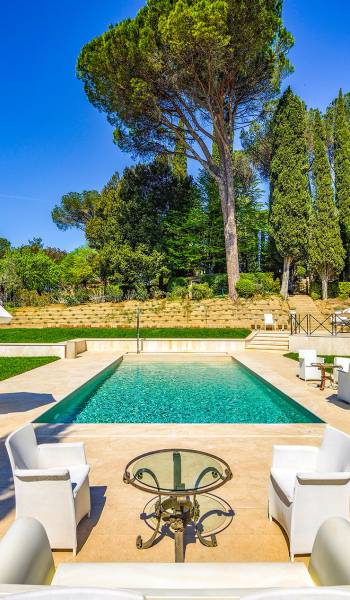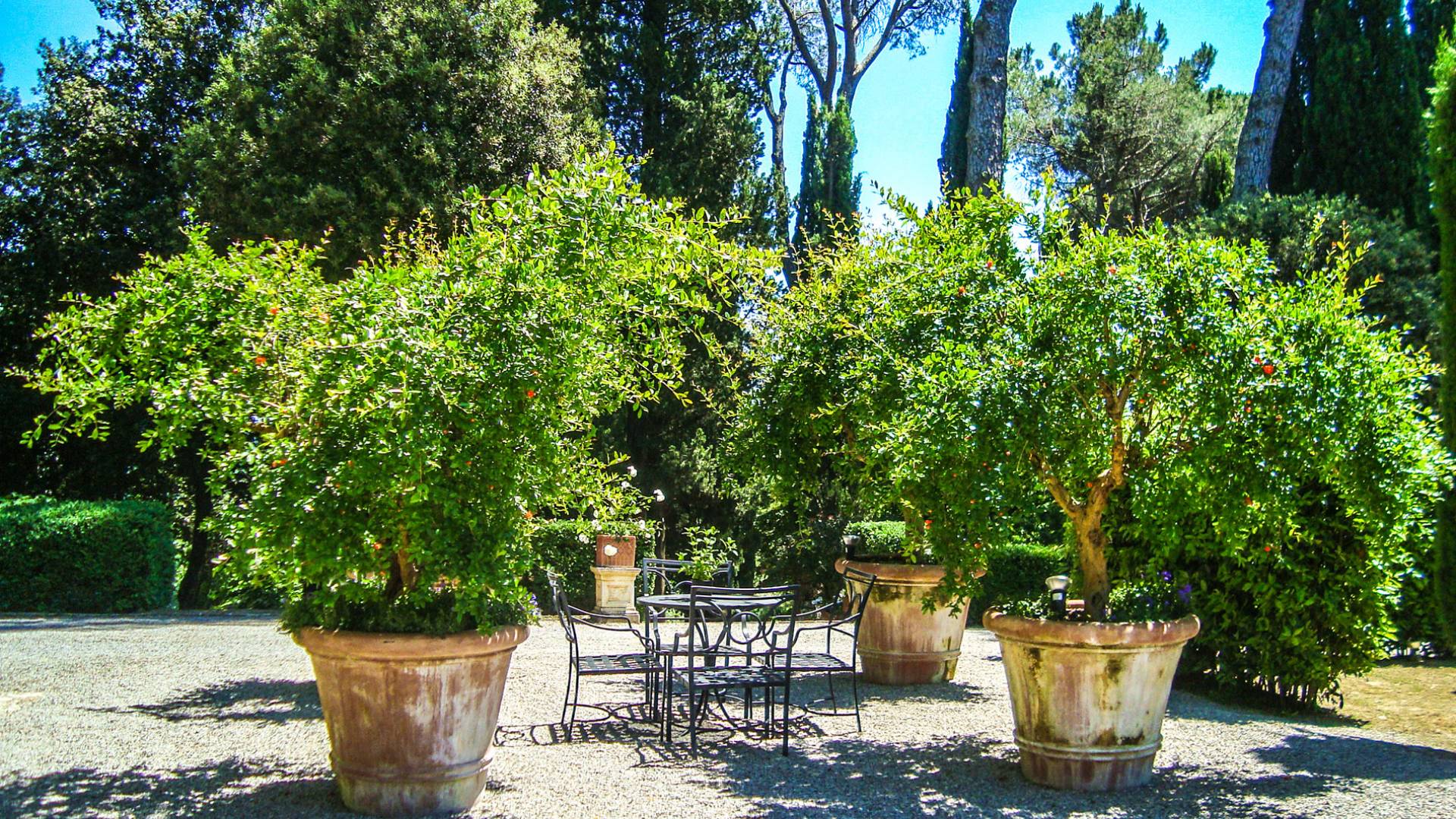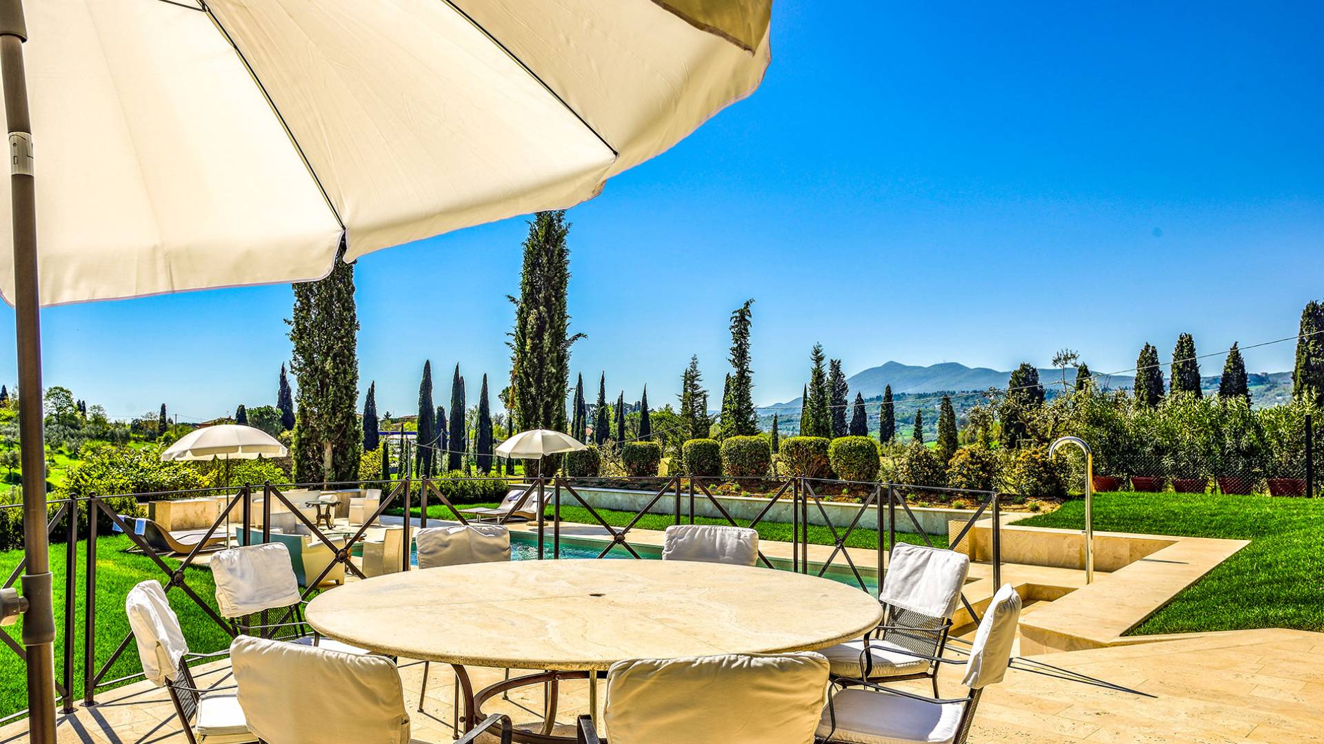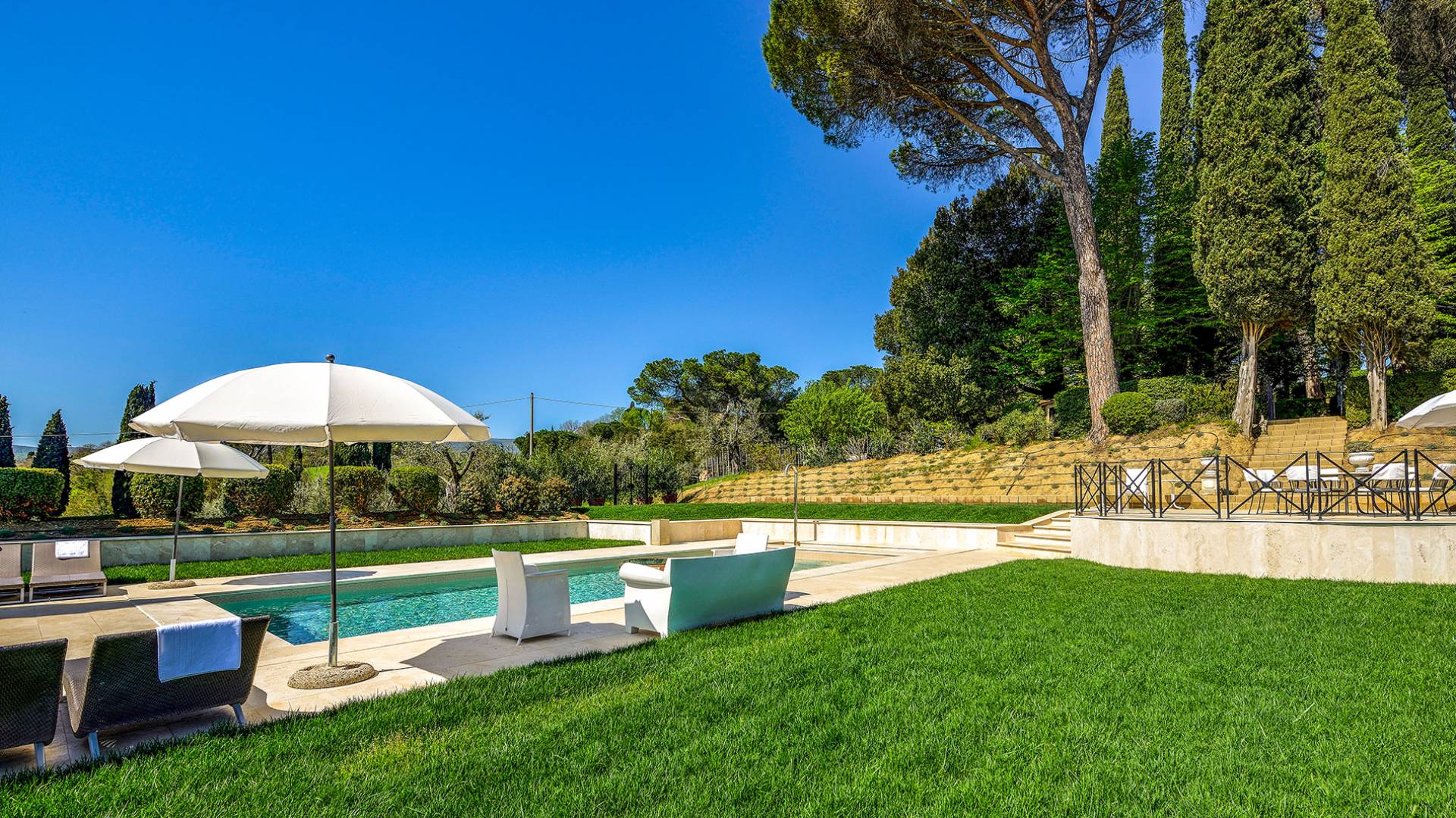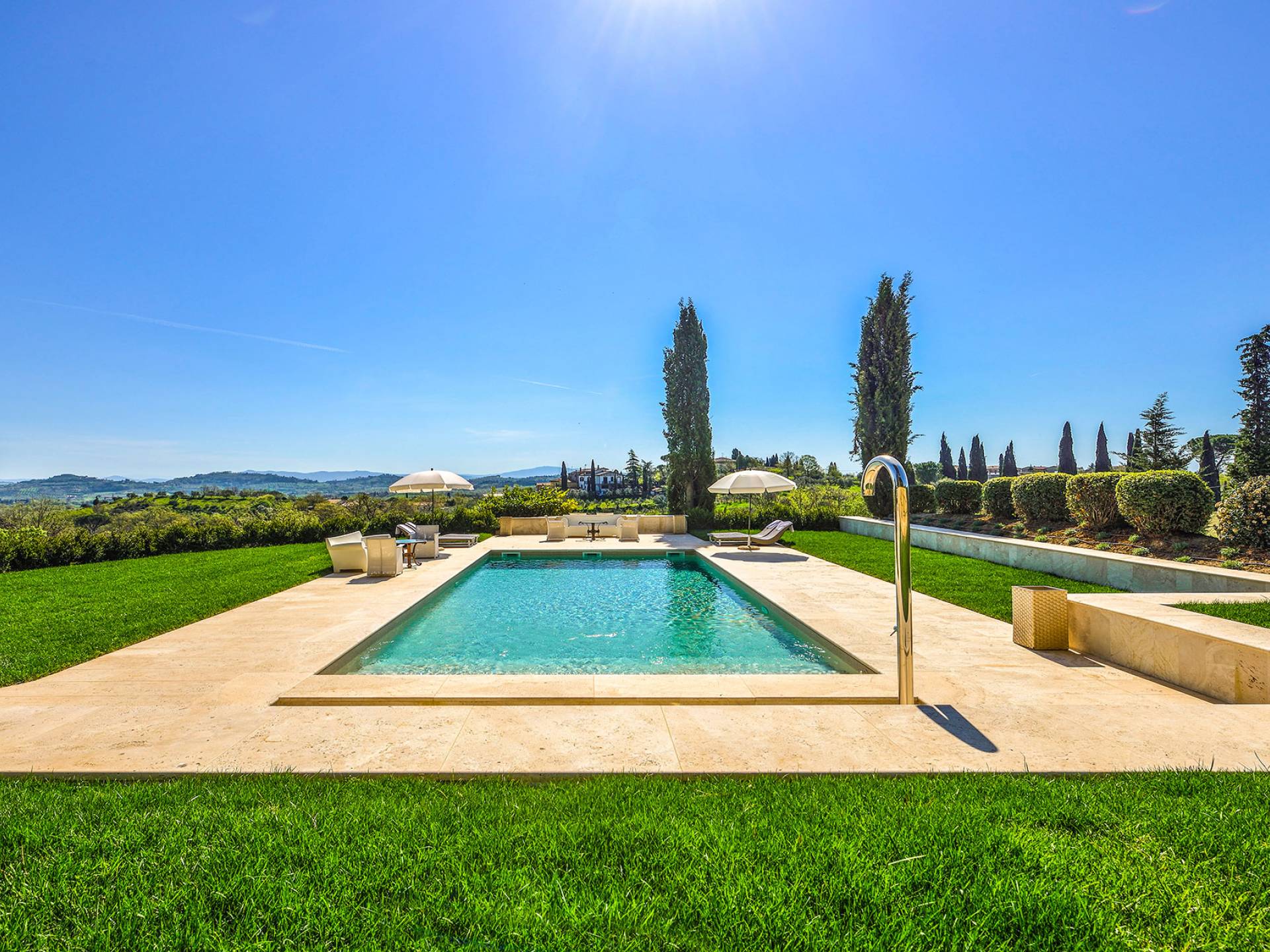 La finca tiene 398 metros y 1309 pies sobre el nivel del mar, también tiene 700 metros cuadrados y 7560 Sq. Pies de espacio habitable y casi 60 acres de tierra rodean la villa con un parque italiano totalmente privado marcado con la flora característica de los prestigiosos jardines toscanos. Los centenarios cedros, olmos, pinos mediterráneos, cipreses, arbustos de caja, laurel, limoneros y granados dominan el extenso huerto de olivos del que el propietario produce un aceite de oliva exquisito y excepcional. 8 o 12 en la villa principal o 16 en un anexo es el número máximo de huéspedes que la propiedad puede acomodar.