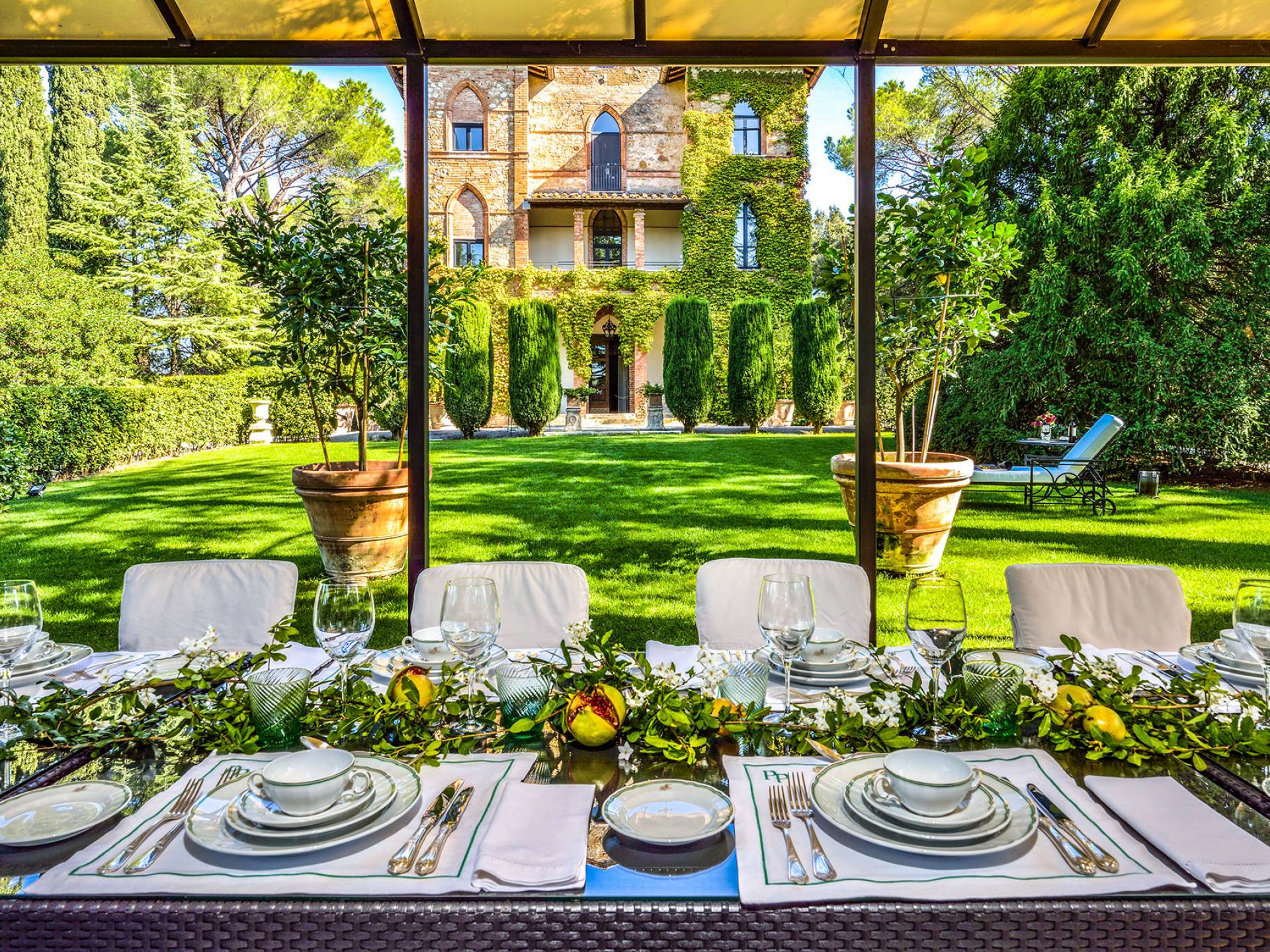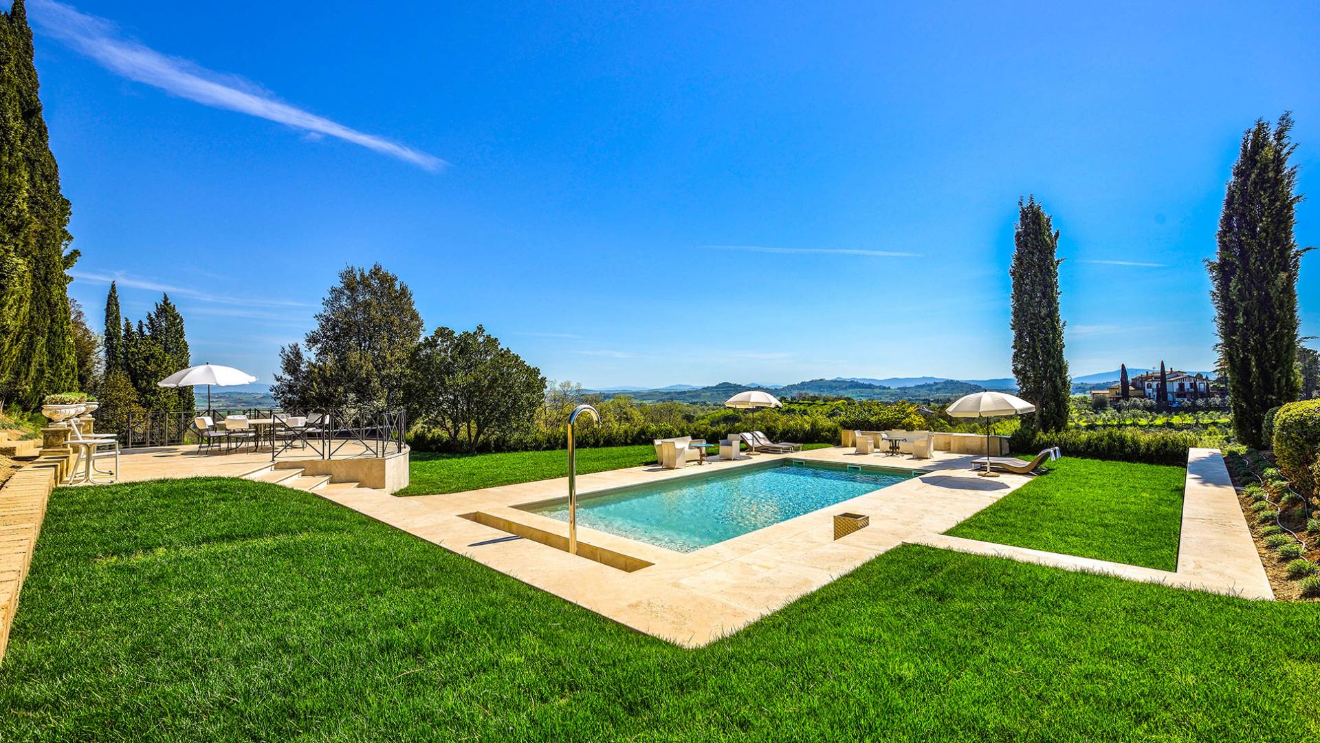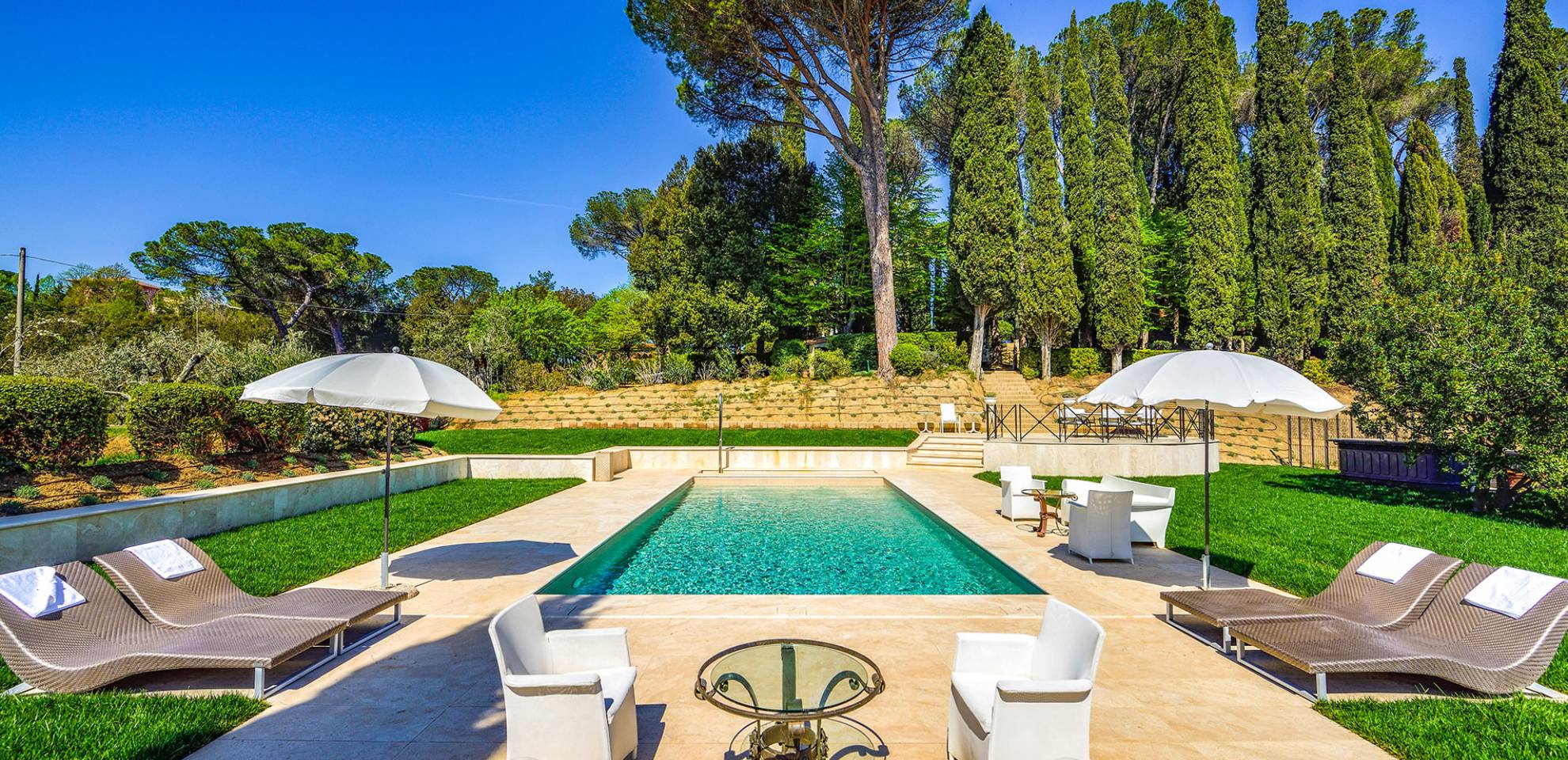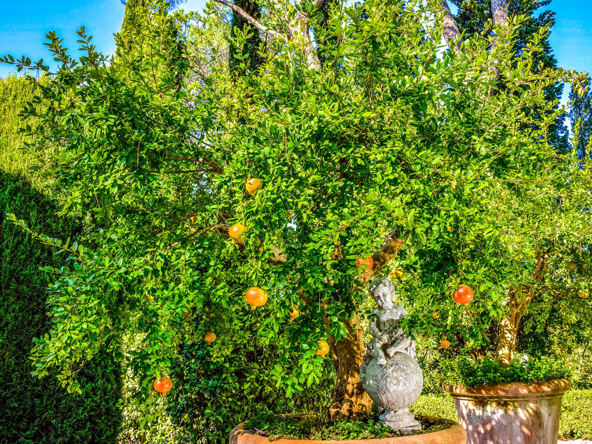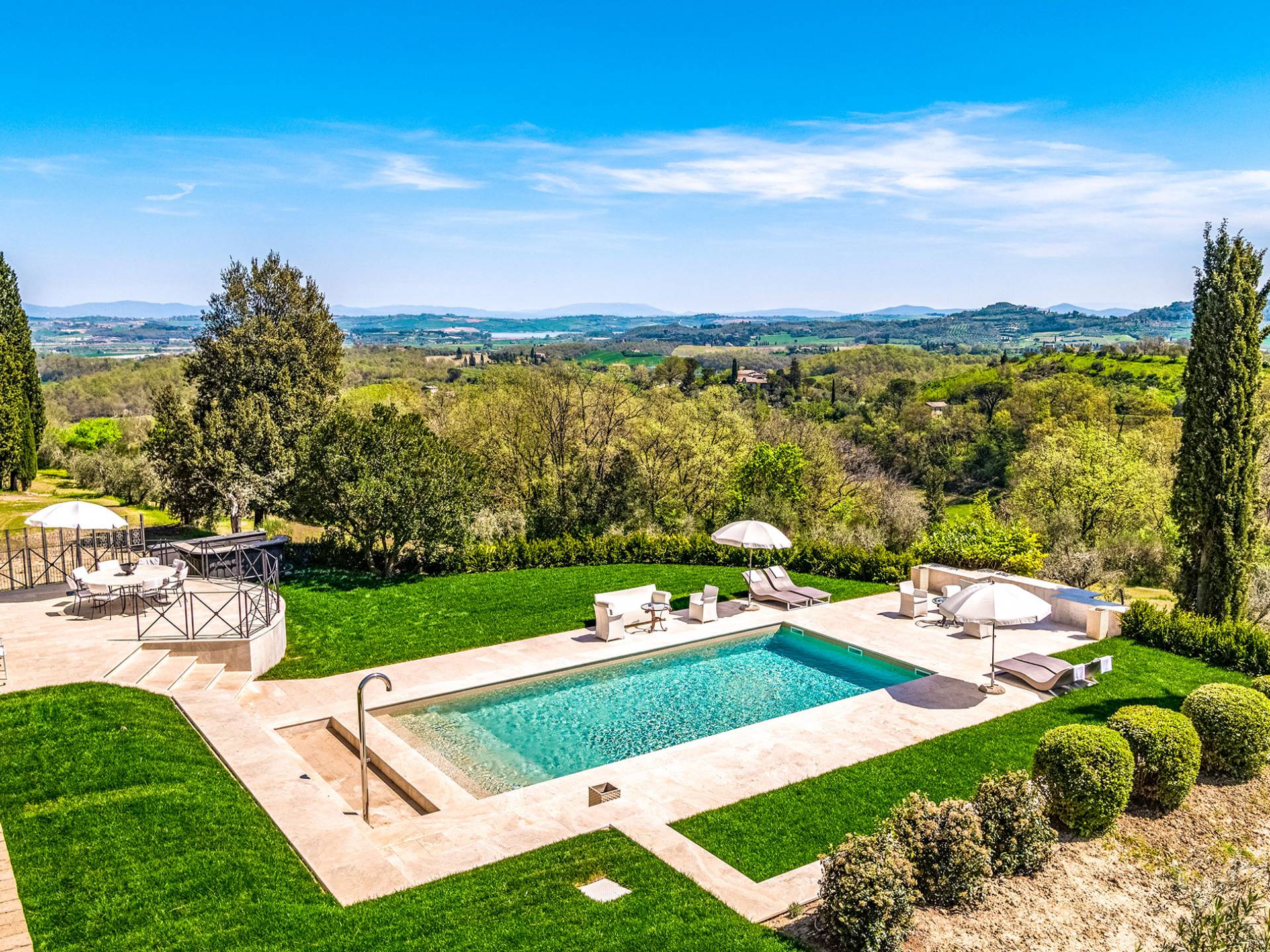 La finca tiene 398 metros y 1309 pies sobre el nivel del mar, también tiene 700 metros cuadrados y 7560 Sq. Pies de espacio habitable y casi 60 acres de tierra rodean la villa con un parque italiano totalmente privado marcado con la flora característica de los prestigiosos jardines toscanos. Los centenarios cedros, olmos, pinos mediterráneos, cipreses, arbustos de caja, laurel, limoneros y granados dominan el extenso huerto de olivos del que el propietario produce un aceite de oliva exquisito y excepcional. 8 o 12 en la villa principal o 16 en un anexo es el número máximo de huéspedes que la propiedad puede acomodar.