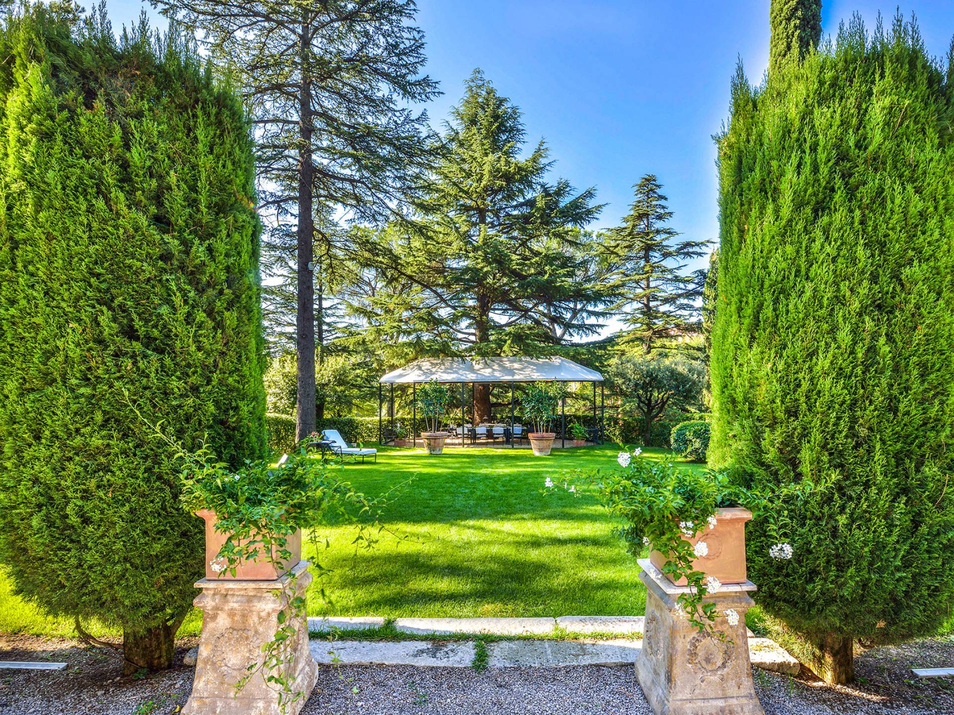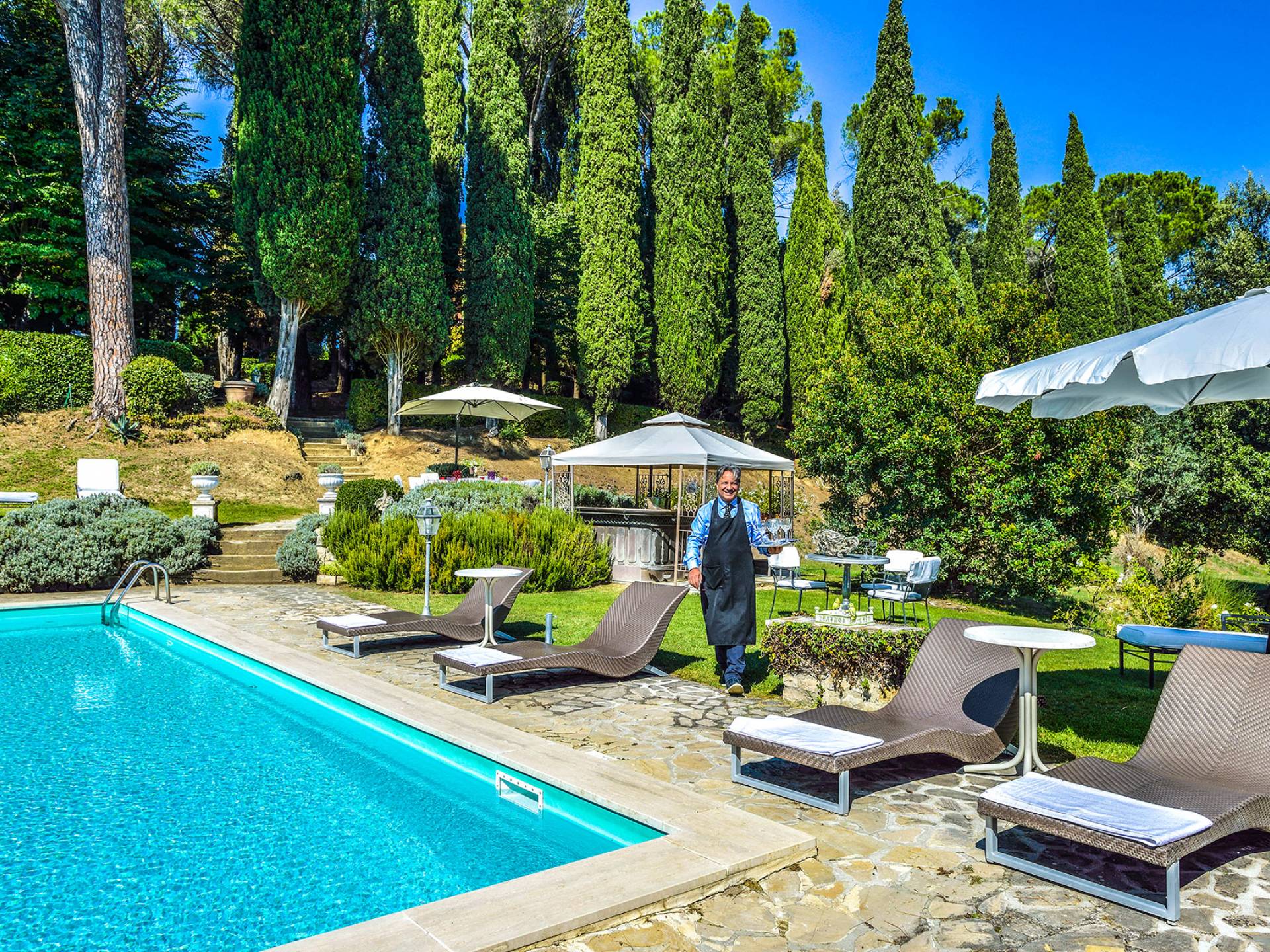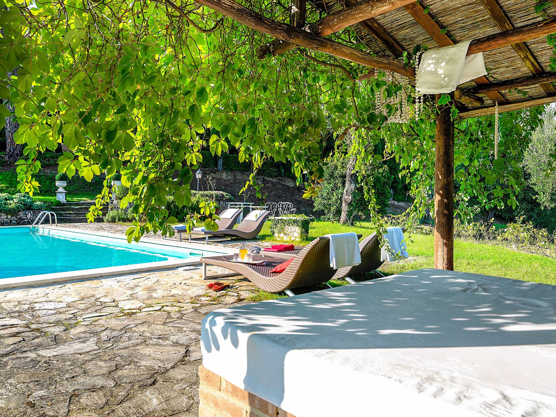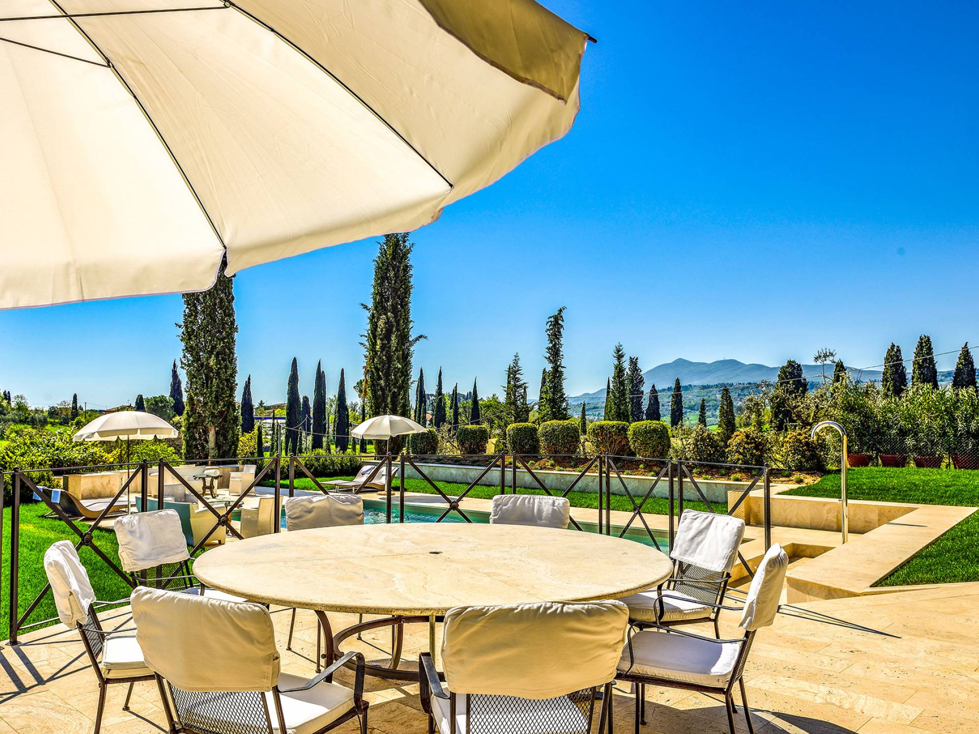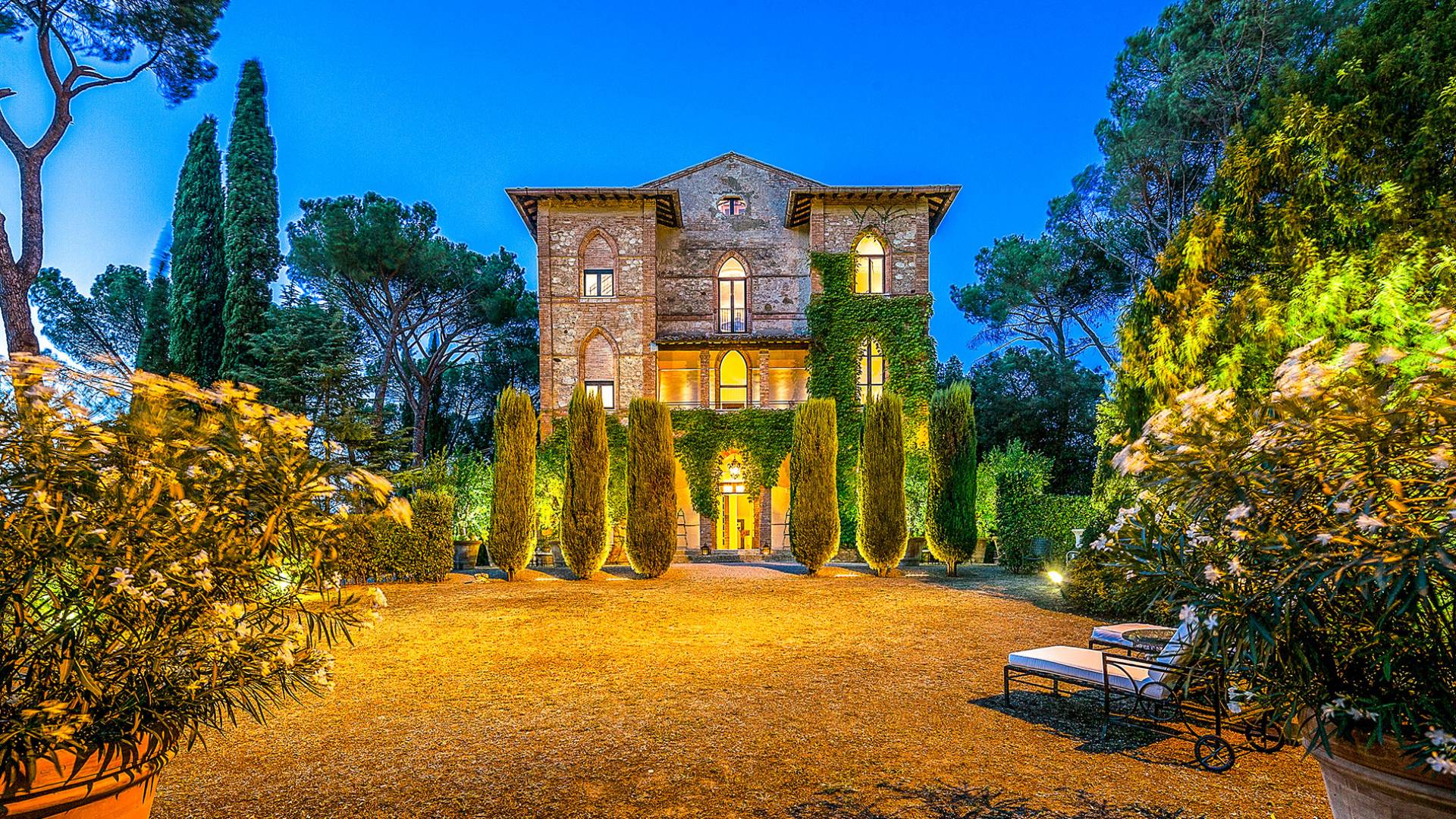 La finca tiene 398 metros y 1309 pies sobre el nivel del mar, también tiene 700 metros cuadrados y 7560 Sq. Pies de espacio habitable y casi 60 acres de tierra rodean la villa con un parque italiano totalmente privado marcado con la flora característica de los prestigiosos jardines toscanos. Los centenarios cedros, olmos, pinos mediterráneos, cipreses, arbustos de caja, laurel, limoneros y granados dominan el extenso huerto de olivos del que el propietario produce un aceite de oliva exquisito y excepcional. 8 o 12 en la villa principal o 16 en un anexo es el número máximo de huéspedes que la propiedad puede acomodar.