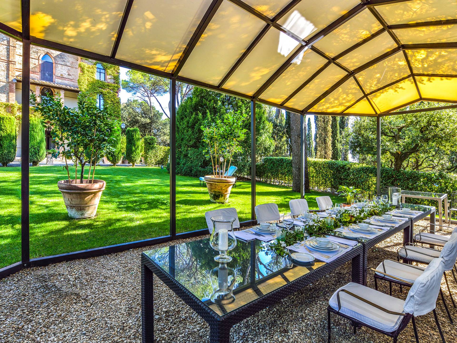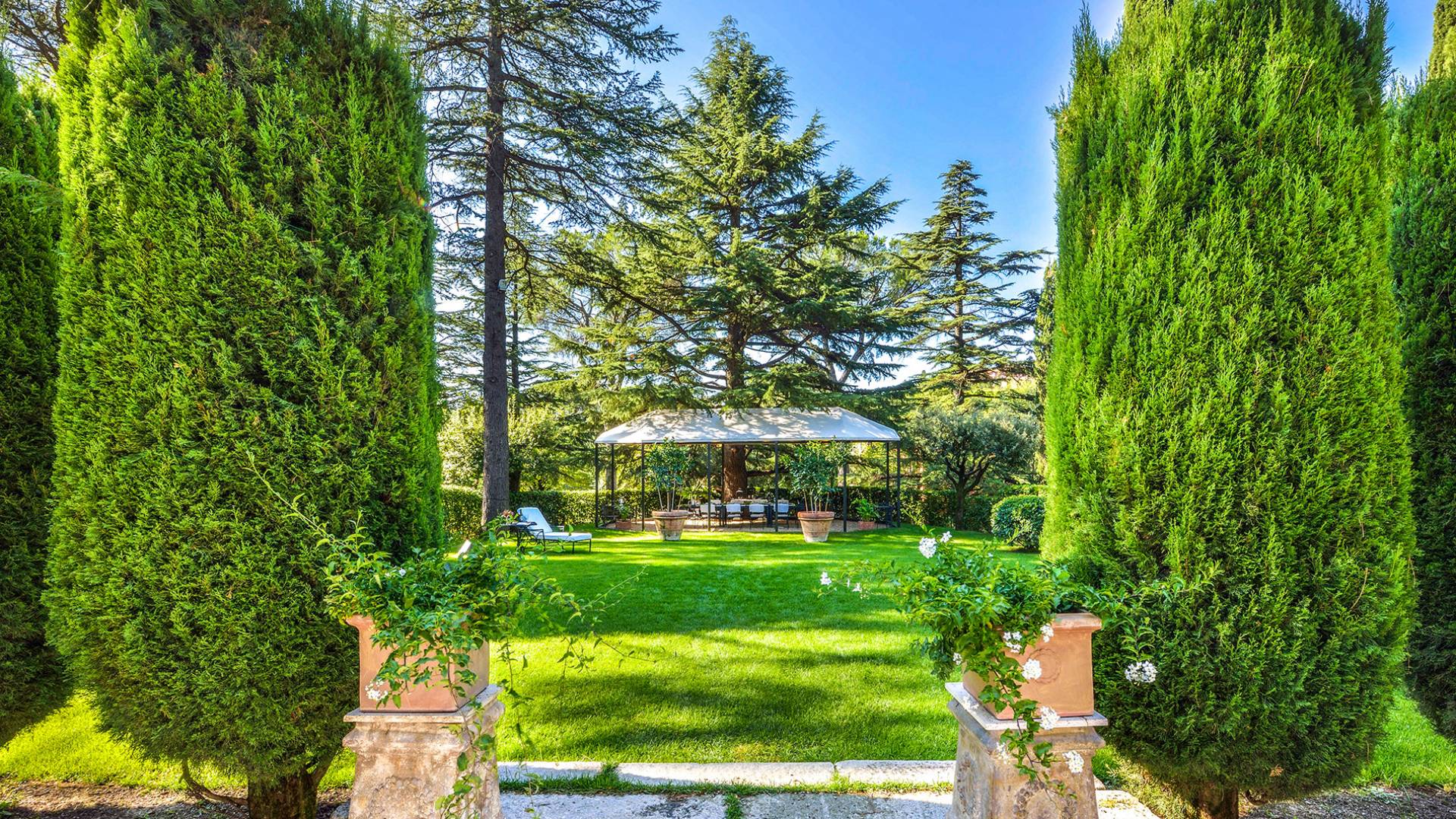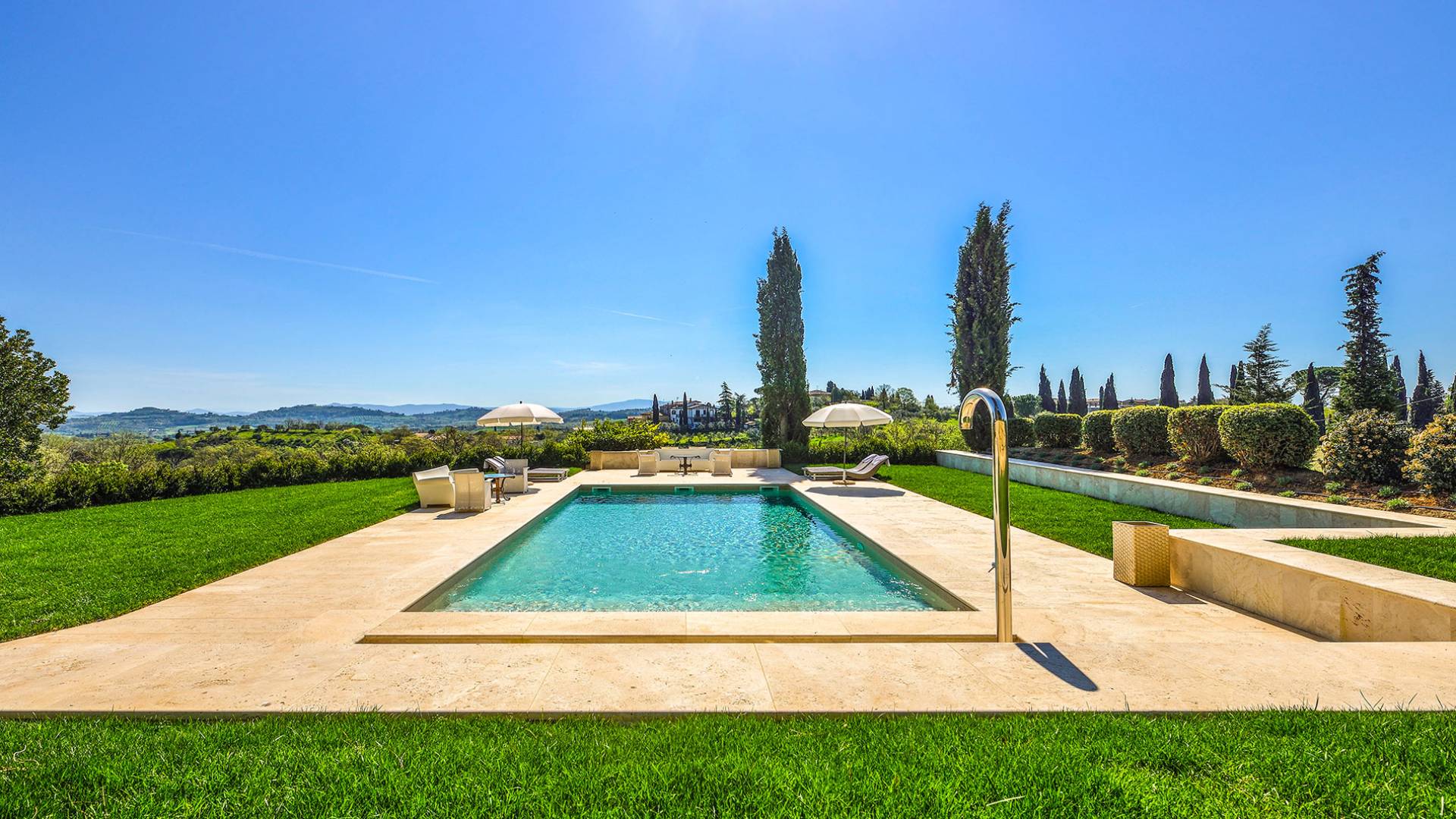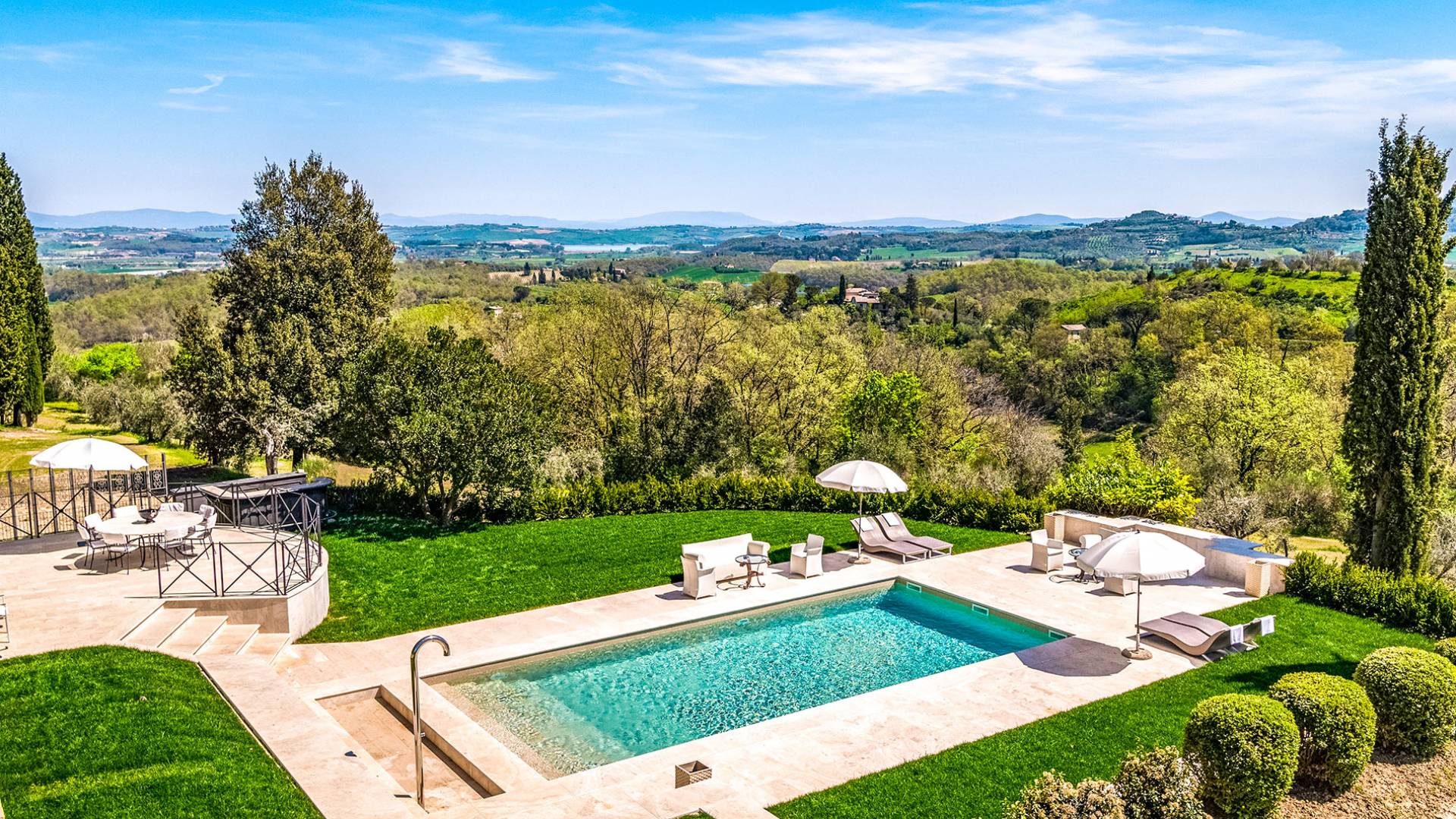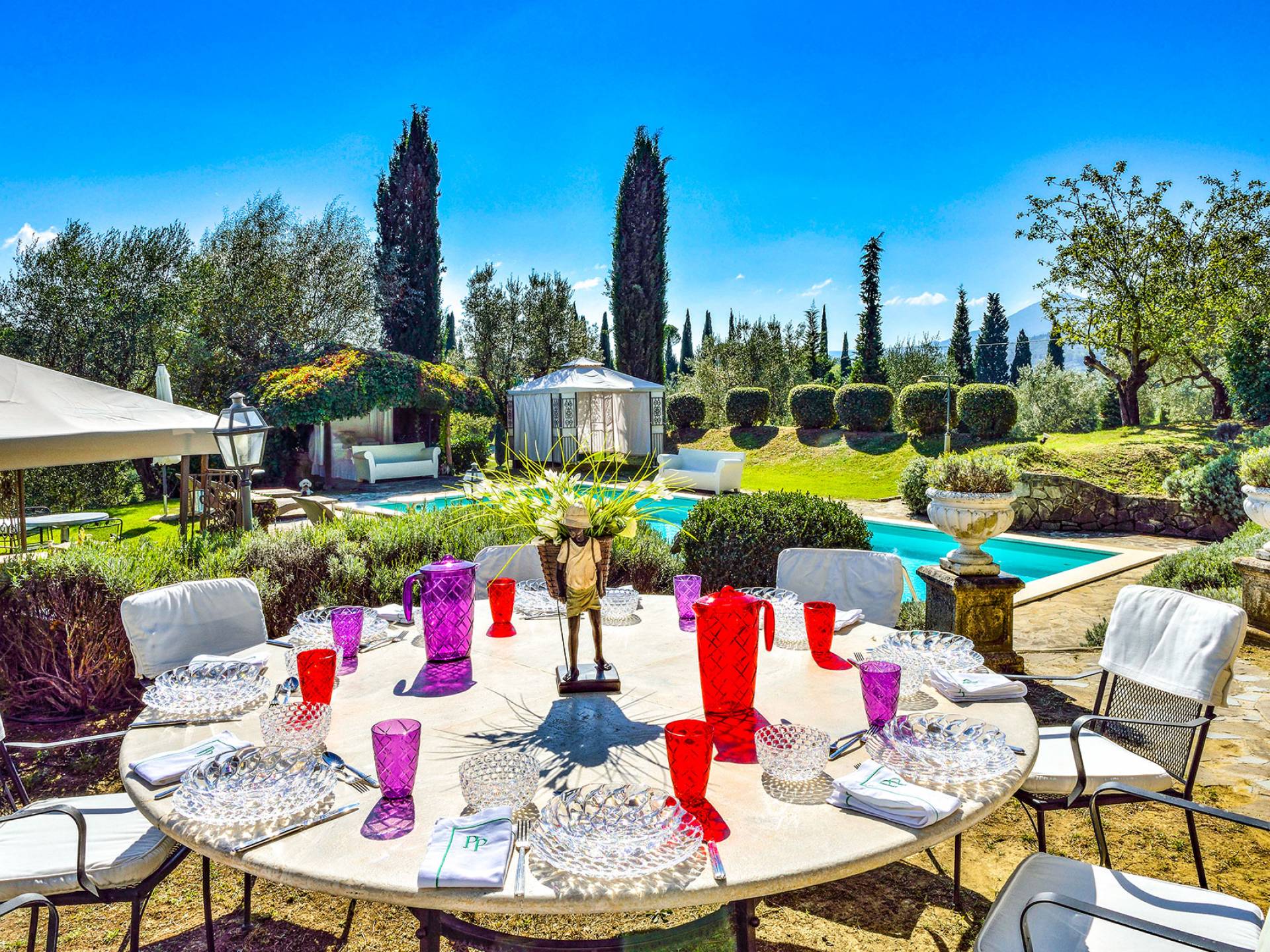 La finca tiene 398 metros y 1309 pies sobre el nivel del mar, también tiene 700 metros cuadrados y 7560 Sq. Pies de espacio habitable y casi 60 acres de tierra rodean la villa con un parque italiano totalmente privado marcado con la flora característica de los prestigiosos jardines toscanos. Los centenarios cedros, olmos, pinos mediterráneos, cipreses, arbustos de caja, laurel, limoneros y granados dominan el extenso huerto de olivos del que el propietario produce un aceite de oliva exquisito y excepcional. 8 o 12 en la villa principal o 16 en un anexo es el número máximo de huéspedes que la propiedad puede acomodar.