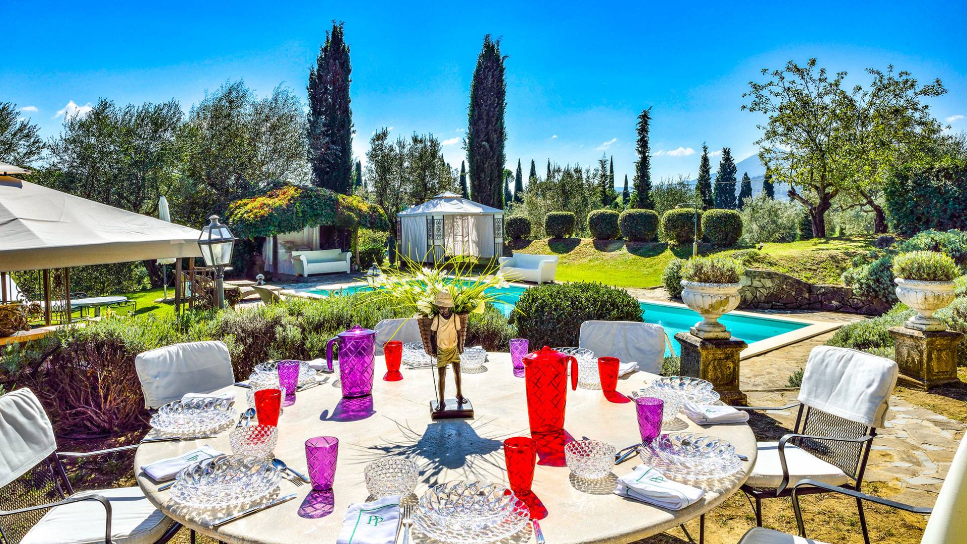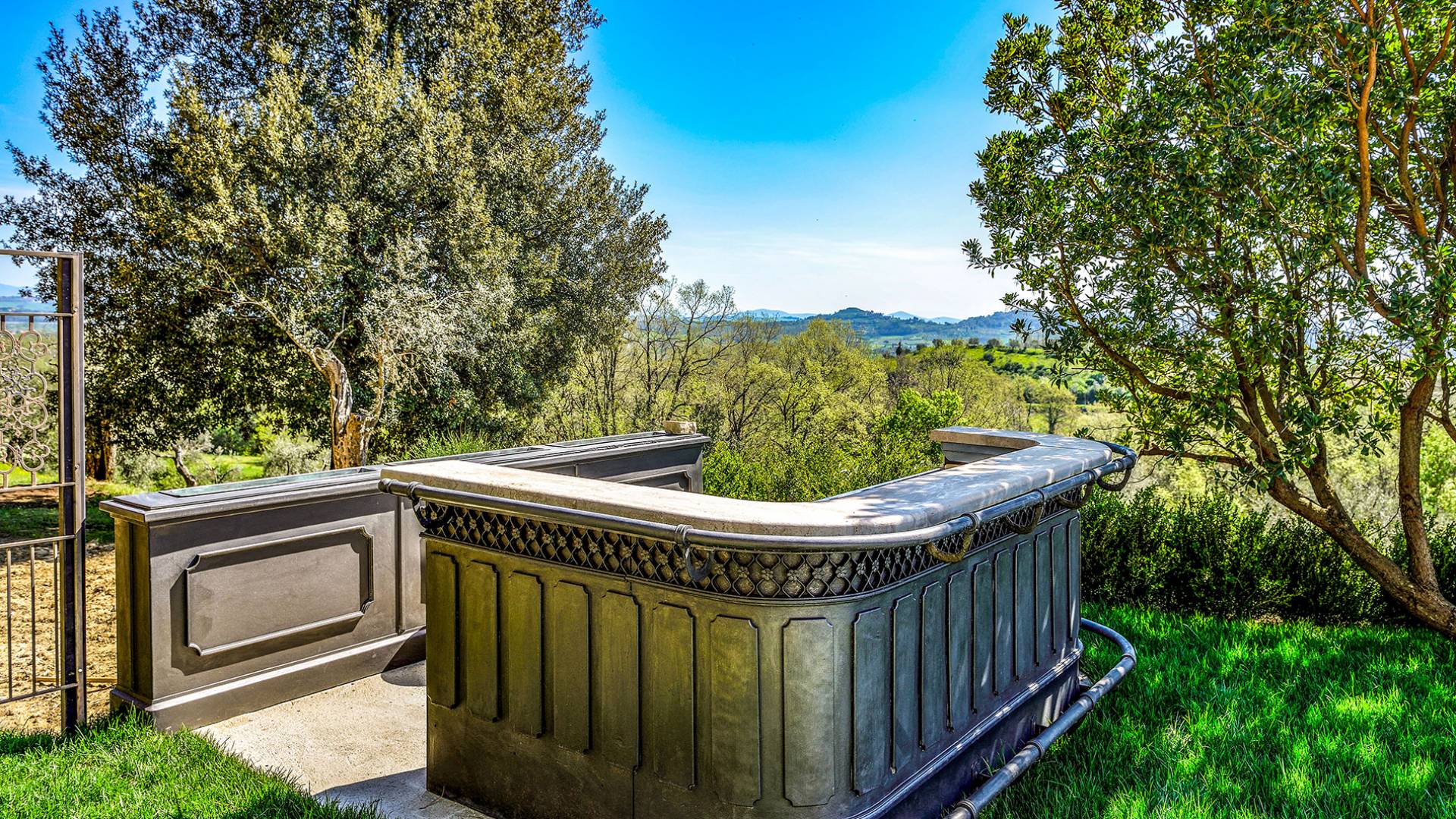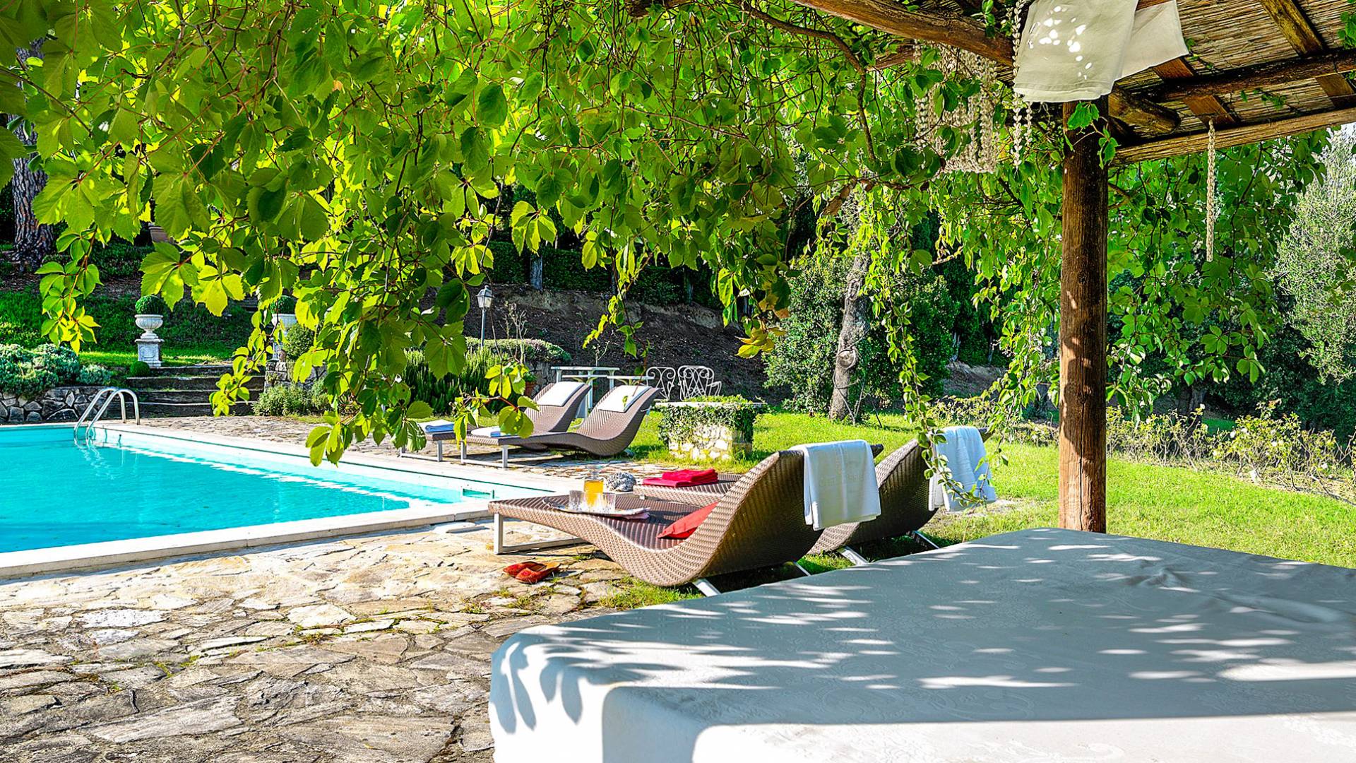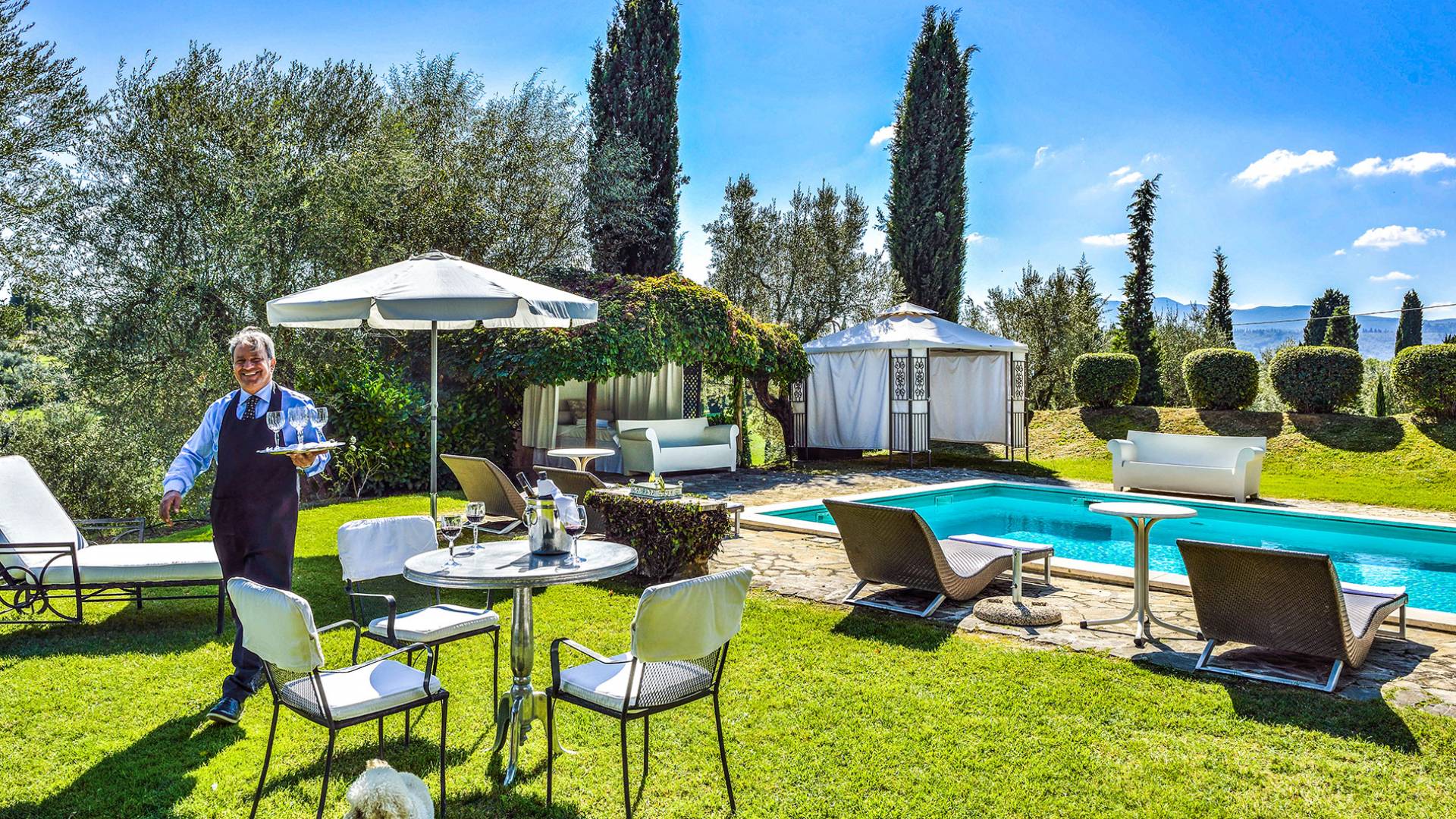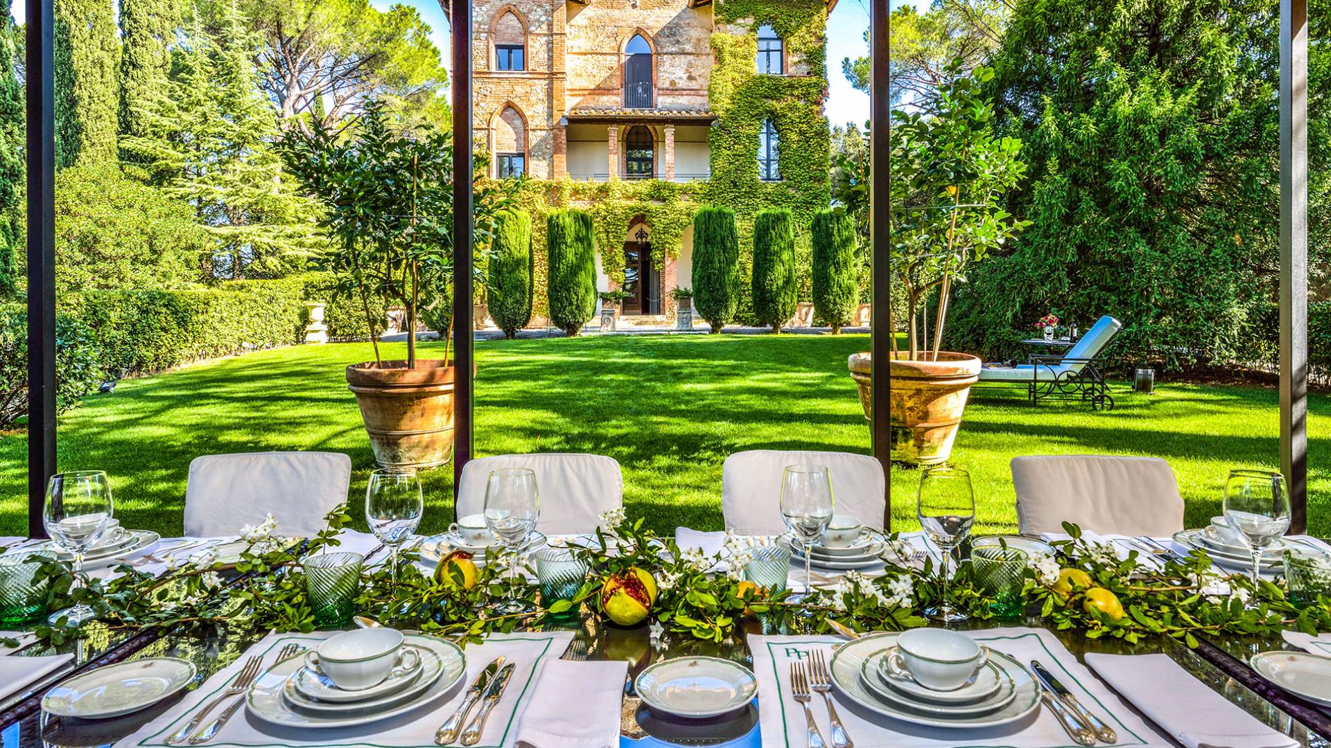 La finca tiene 398 metros y 1309 pies sobre el nivel del mar, también tiene 700 metros cuadrados y 7560 Sq. Pies de espacio habitable y casi 60 acres de tierra rodean la villa con un parque italiano totalmente privado marcado con la flora característica de los prestigiosos jardines toscanos. Los centenarios cedros, olmos, pinos mediterráneos, cipreses, arbustos de caja, laurel, limoneros y granados dominan el extenso huerto de olivos del que el propietario produce un aceite de oliva exquisito y excepcional. 8 o 12 en la villa principal o 16 en un anexo es el número máximo de huéspedes que la propiedad puede acomodar.