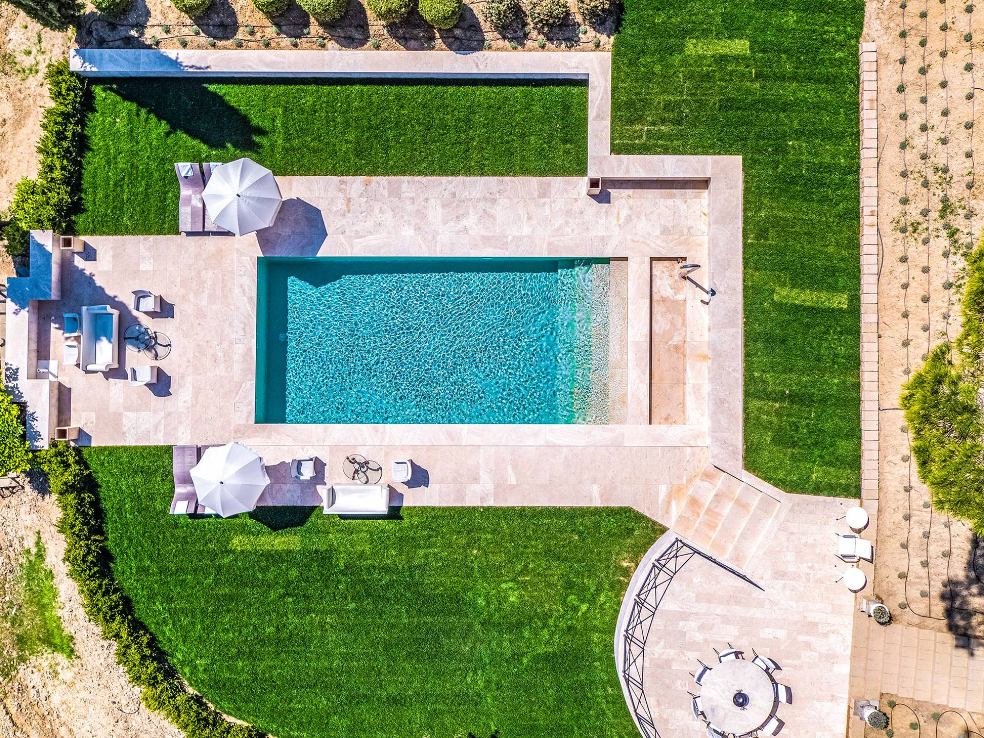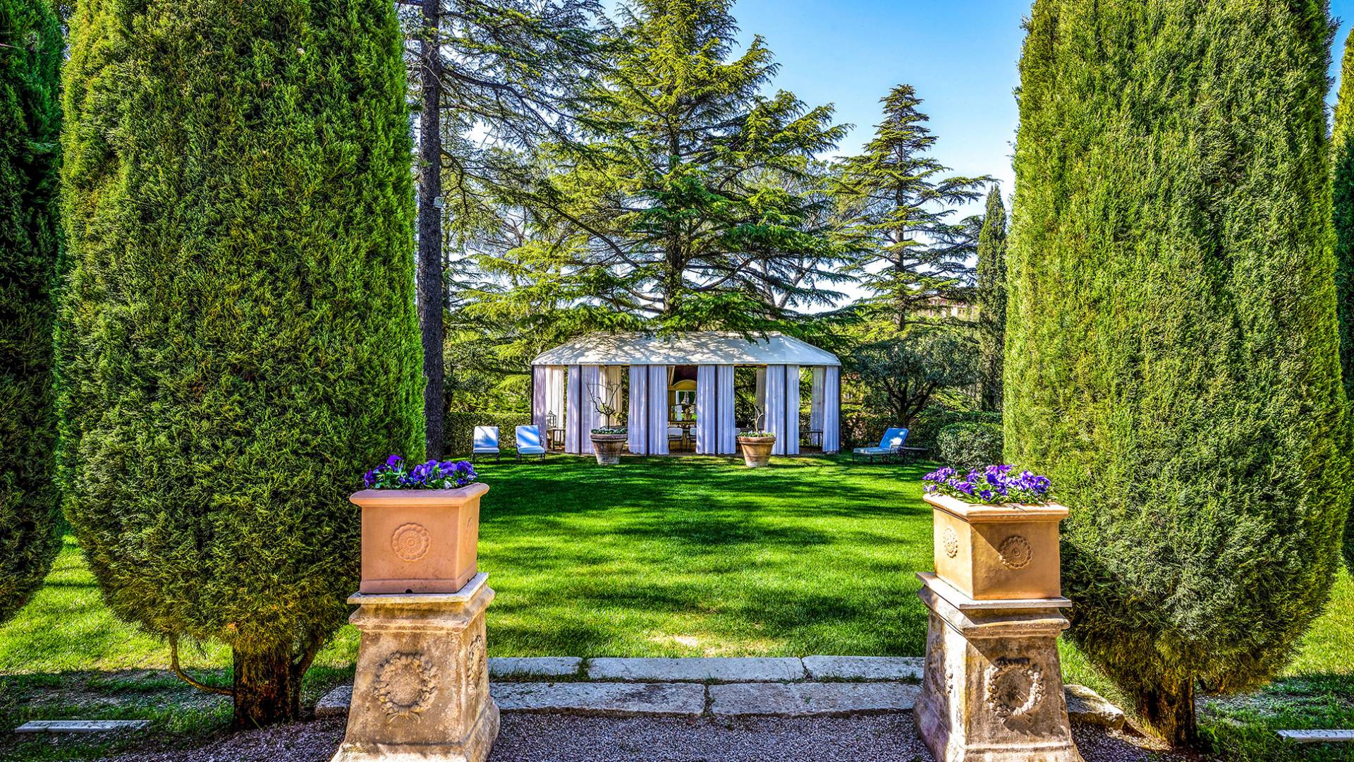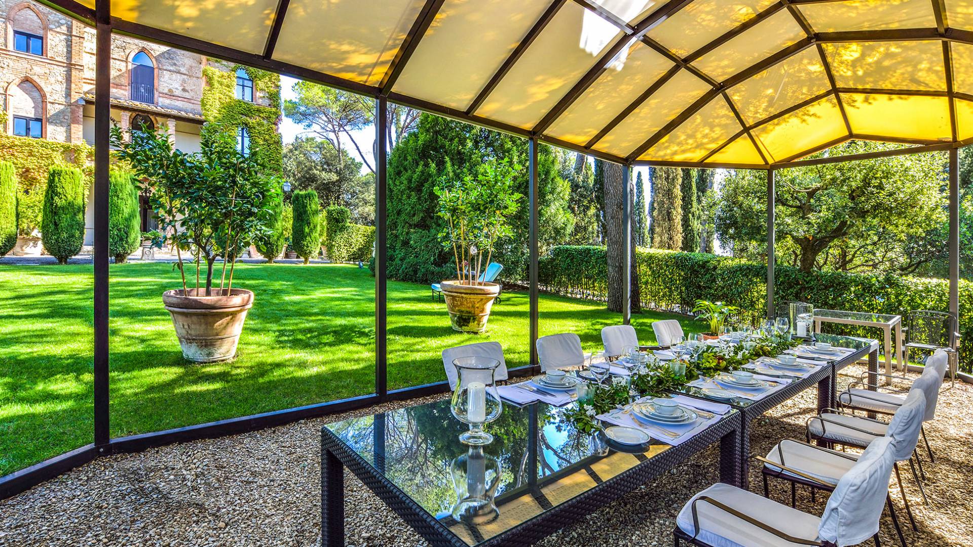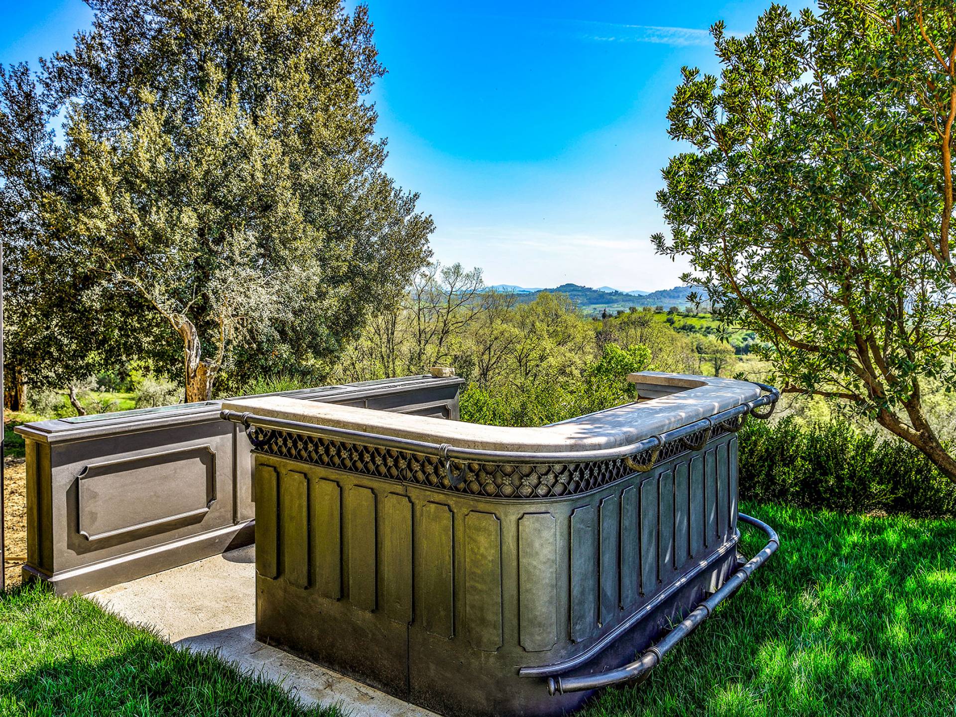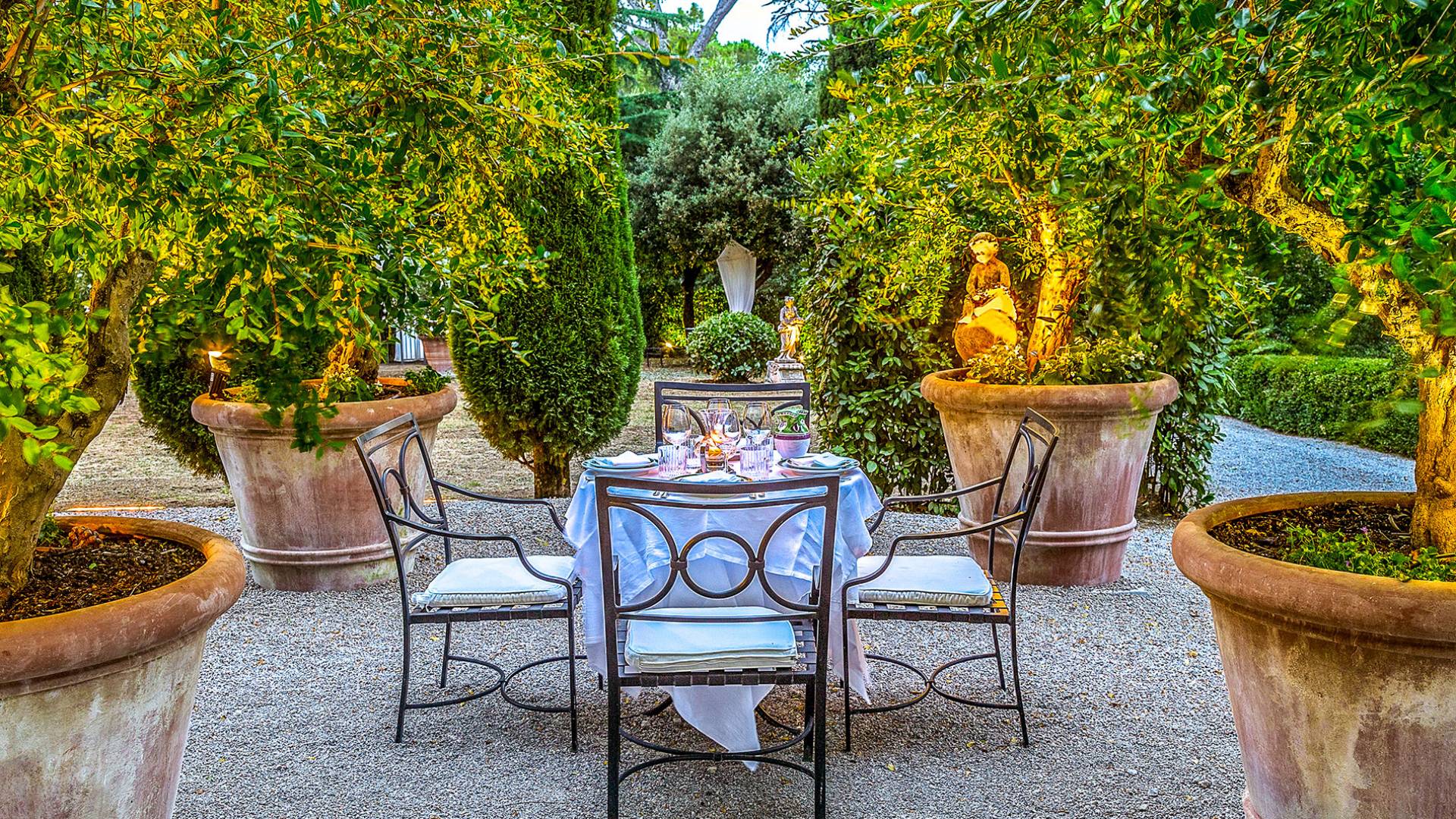La finca tiene 398 metros y 1309 pies sobre el nivel del mar, también tiene 700 metros cuadrados y 7560 Sq. Pies de espacio habitable y casi 60 acres de tierra rodean la villa con un parque italiano totalmente privado marcado con la flora característica de los prestigiosos jardines toscanos. Los centenarios cedros, olmos, pinos mediterráneos, cipreses, arbustos de caja, laurel, limoneros y granados dominan el extenso huerto de olivos del que el propietario produce un aceite de oliva exquisito y excepcional. 8 o 12 en la villa principal o 16 en un anexo es el número máximo de huéspedes que la propiedad puede acomodar.