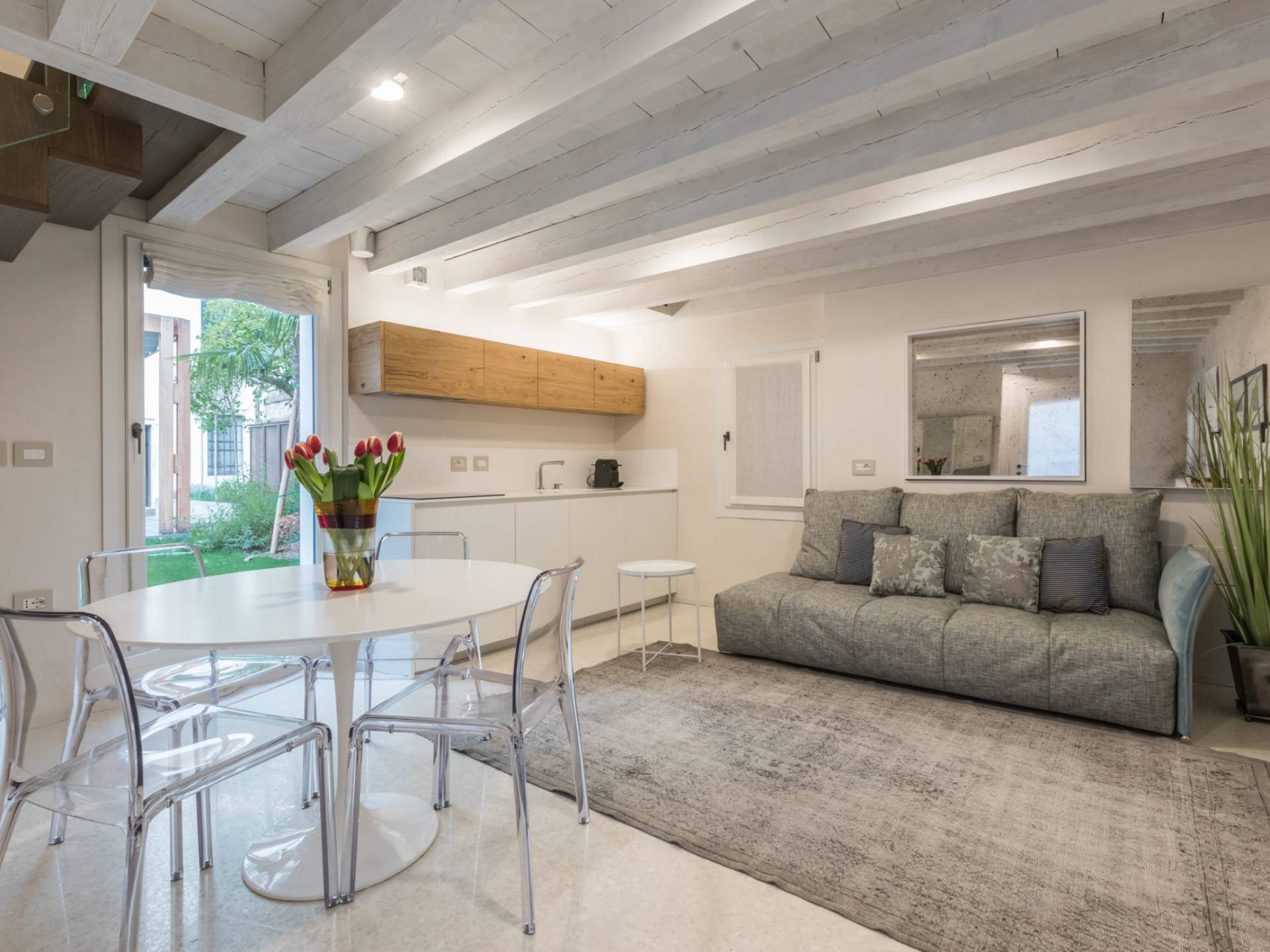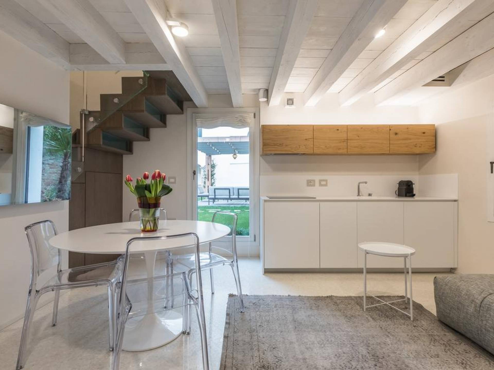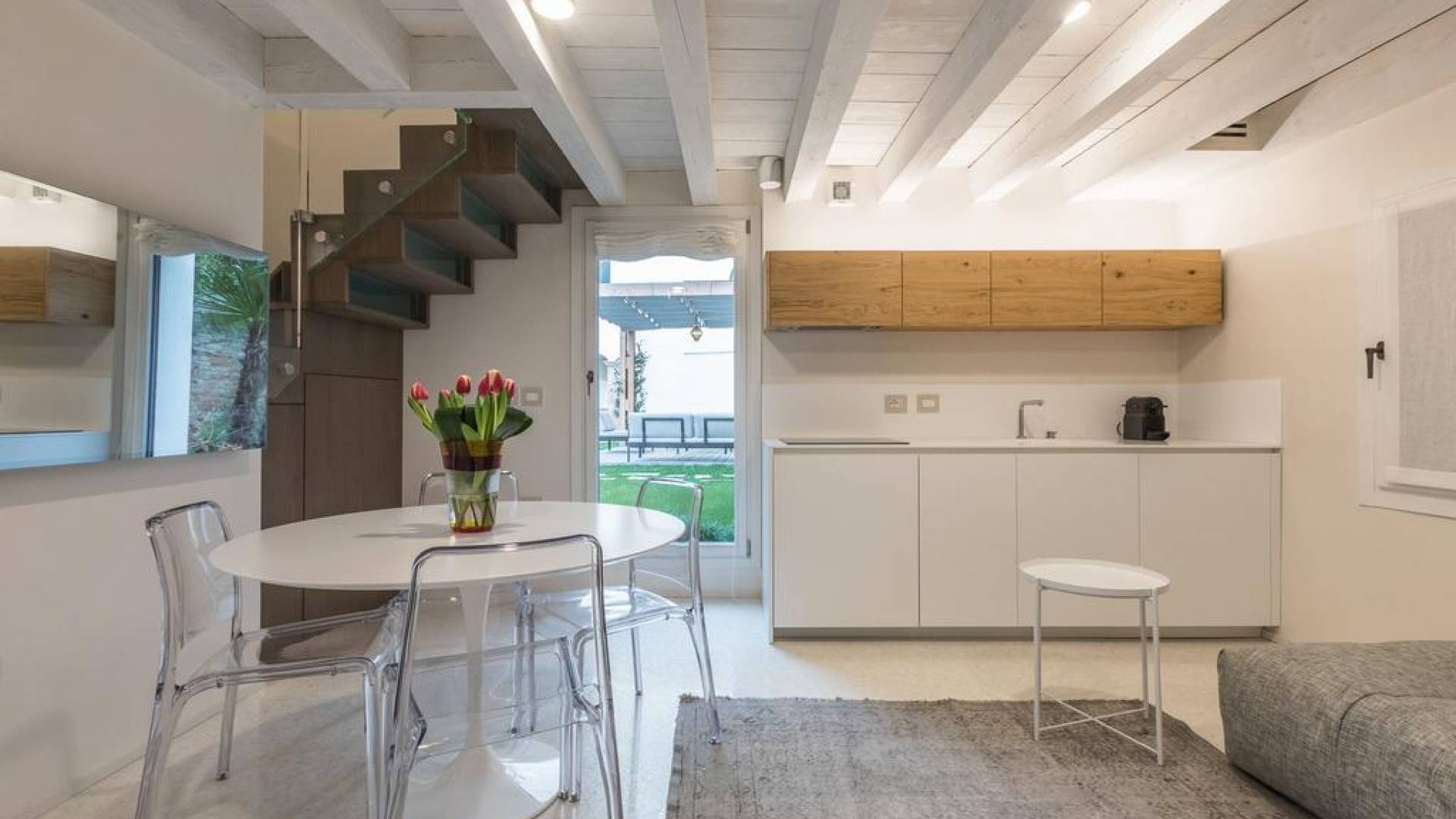 En la planta baja hay una encantadora sala de estar equipada con un cómodo y profundo sofá cama, una mesa redonda con cubierta de mármol con cuatro sillas y una elegante cocina con gabinetes hechos a medida. Su atmósfera tranquila y fortuita se ve reforzada por la naturaleza circundante traída al espacio por cuatro ventanas dispuestas en todos los lados. La magia se perpetúa en la selección de colores neutros y materiales elegidos con la intención de crear continuidad y armonía visual. Los suelos de mármol blanco roto en terrazo veneciano reflejan la abundante luz que se filtra a través de las persianas romanas y contribuyen a la sensación general de serenidad y comodidad. Las lámparas modernas en latón oscuro y dorado añaden un toque de sofisticación y dramatismo.