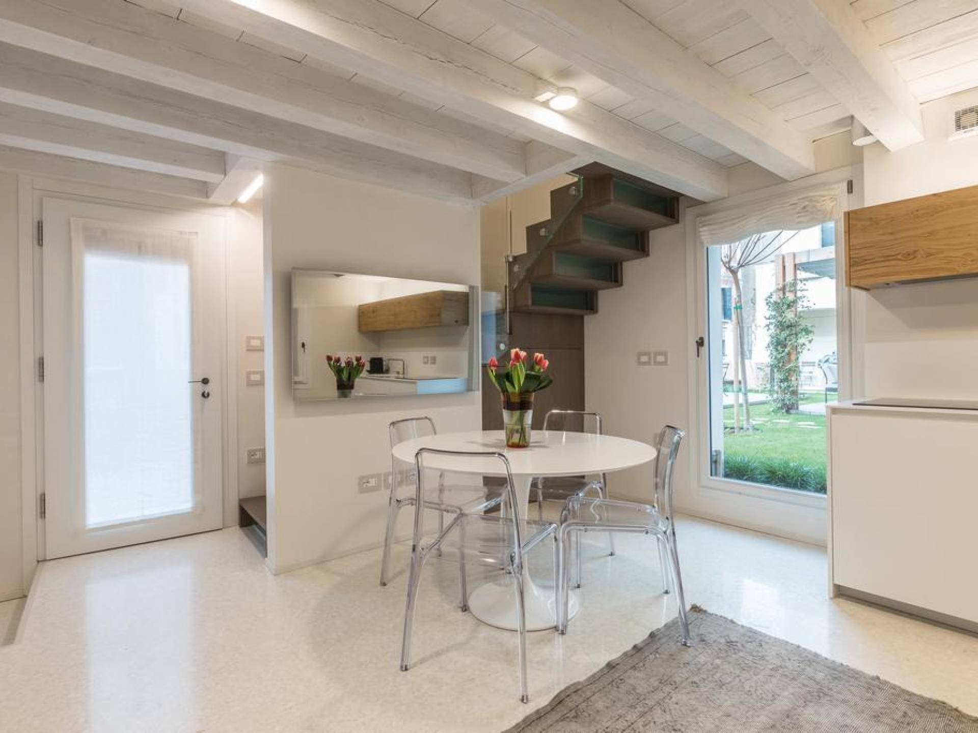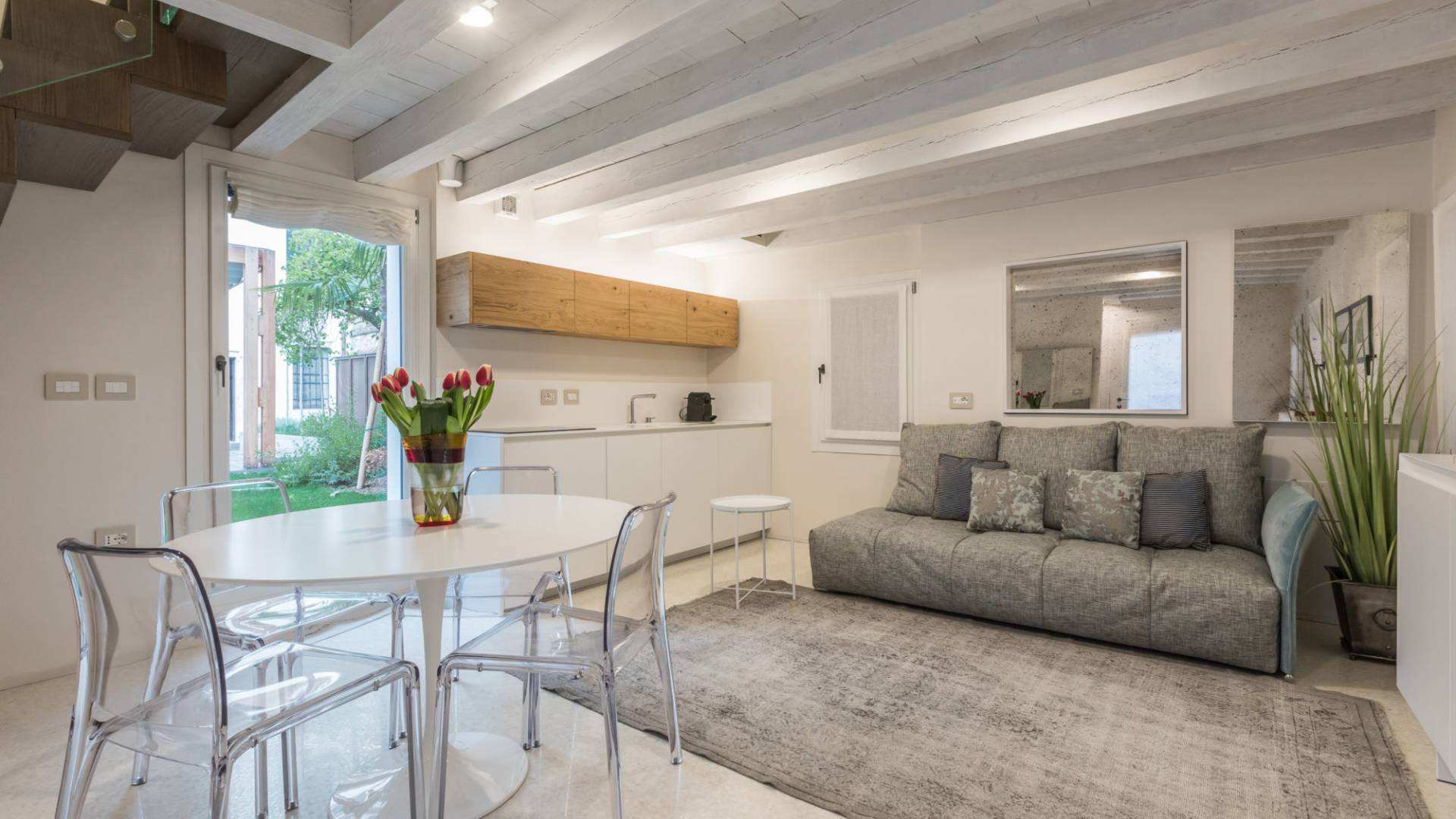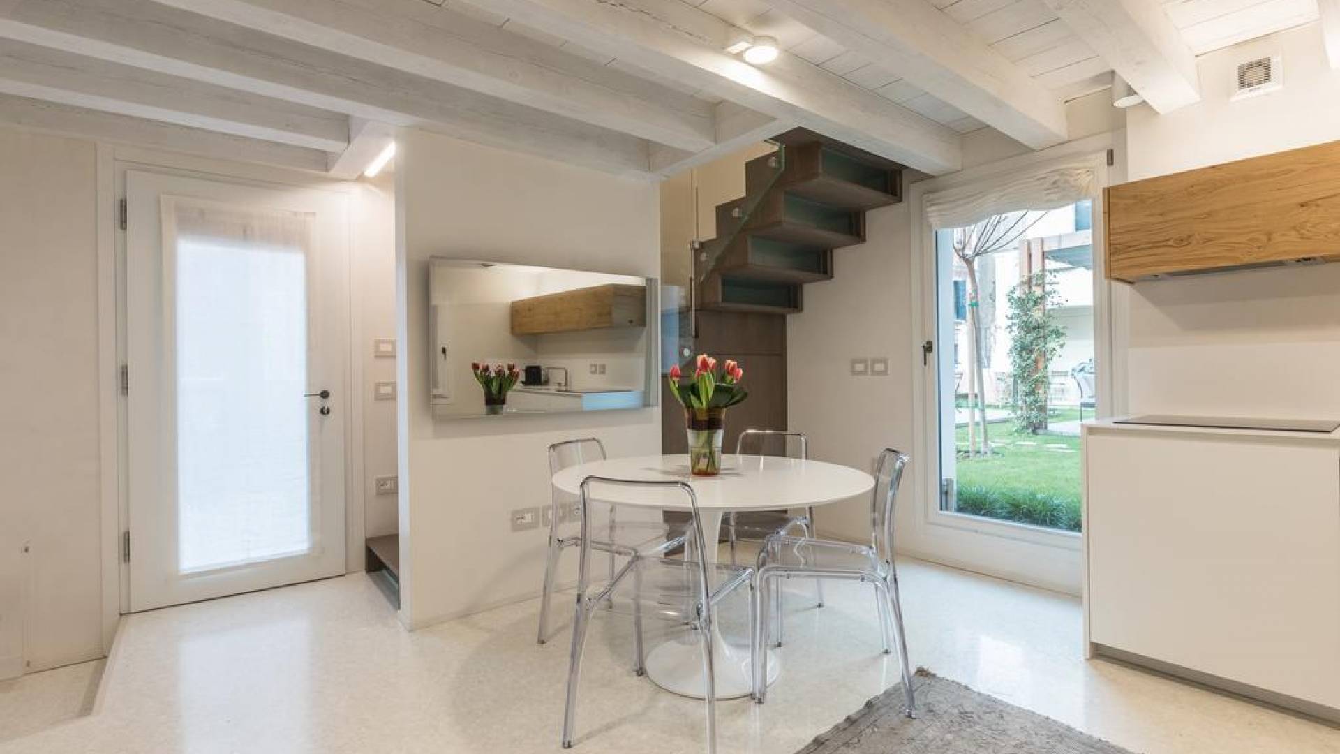 En la planta baja hay una encantadora sala de estar equipada con un cómodo y profundo sofá cama, una mesa redonda con cubierta de mármol con cuatro sillas y una elegante cocina con gabinetes hechos a medida. Su atmósfera tranquila y fortuita se ve reforzada por la naturaleza circundante traída al espacio por cuatro ventanas dispuestas en todos los lados. La magia se perpetúa en la selección de colores neutros y materiales elegidos con la intención de crear continuidad y armonía visual. Los suelos de mármol blanco roto en terrazo veneciano reflejan la abundante luz que se filtra a través de las persianas romanas y contribuyen a la sensación general de serenidad y comodidad. Las lámparas modernas en latón oscuro y dorado añaden un toque de sofisticación y dramatismo.