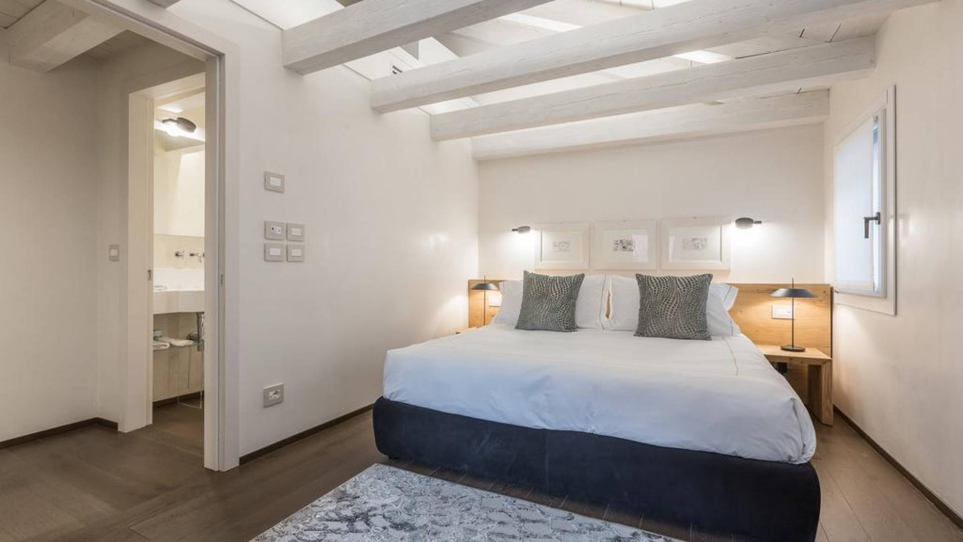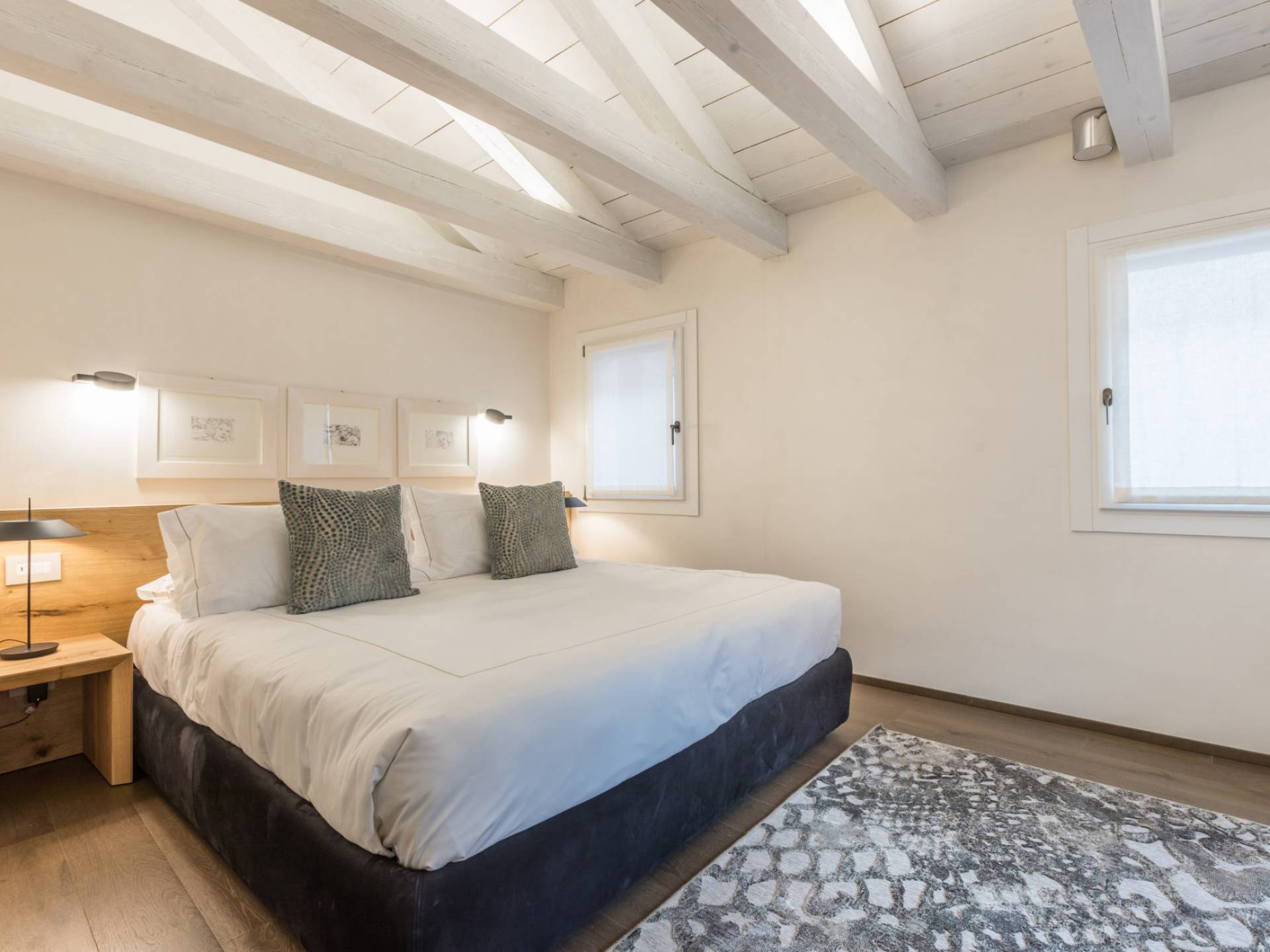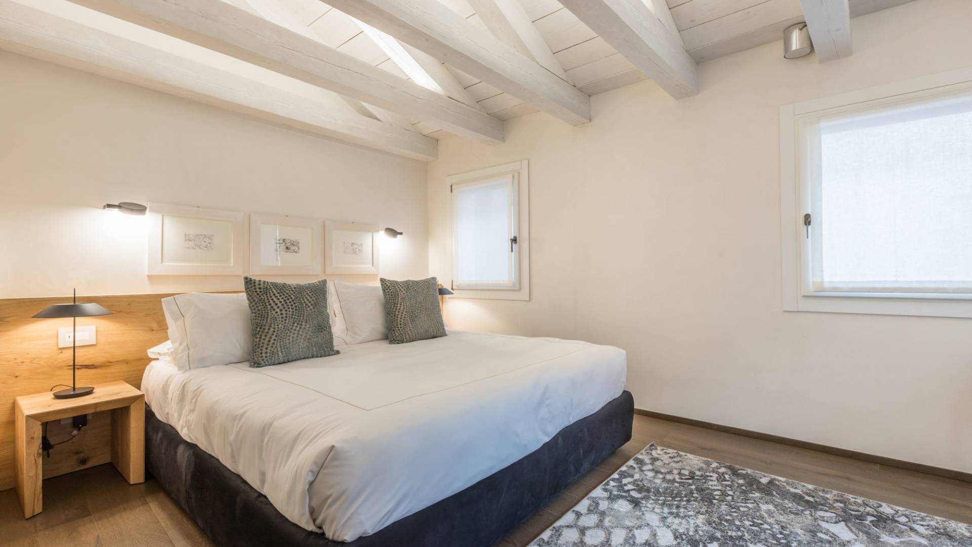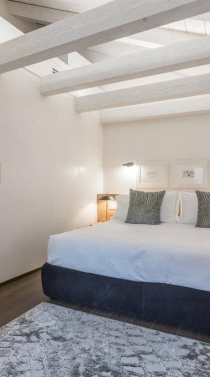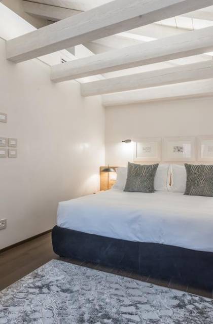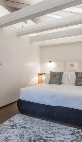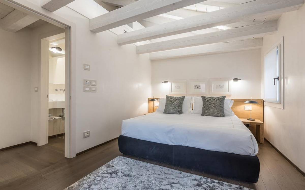 El diseño interior del apartamento presenta una combinación de telas naturales y preciosas como el algodón italiano combinado con seda bordada hecha en Venecia. Las paredes están acabadas en yeso veneciano, los suelos son de mármol terrazo y los apliques y lámparas son de cristal de Murano, imbuyendo el espacio moderno con acentos locales que recuerdan la vida veneciana. El efecto general es una impresionante exhibición de elegancia moderna con un encanto local que hace que los huéspedes se sientan como en casa y en el extranjero.