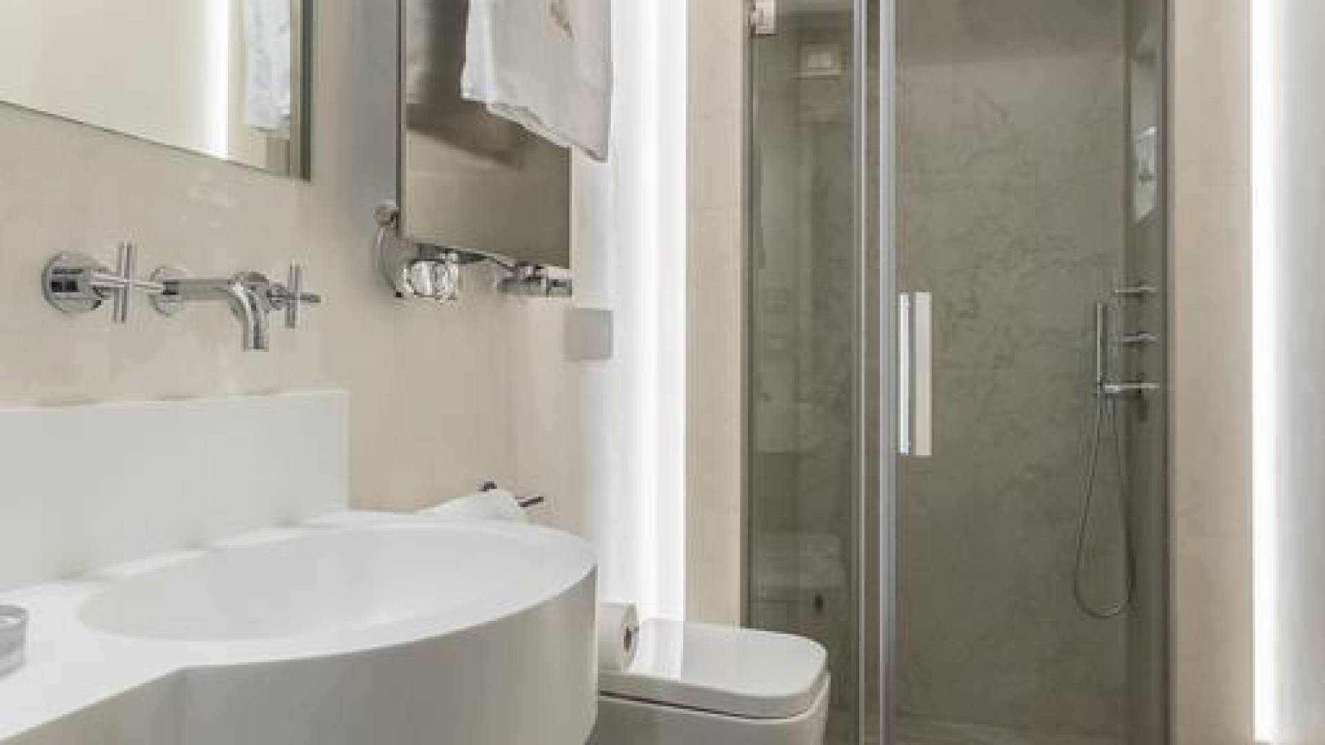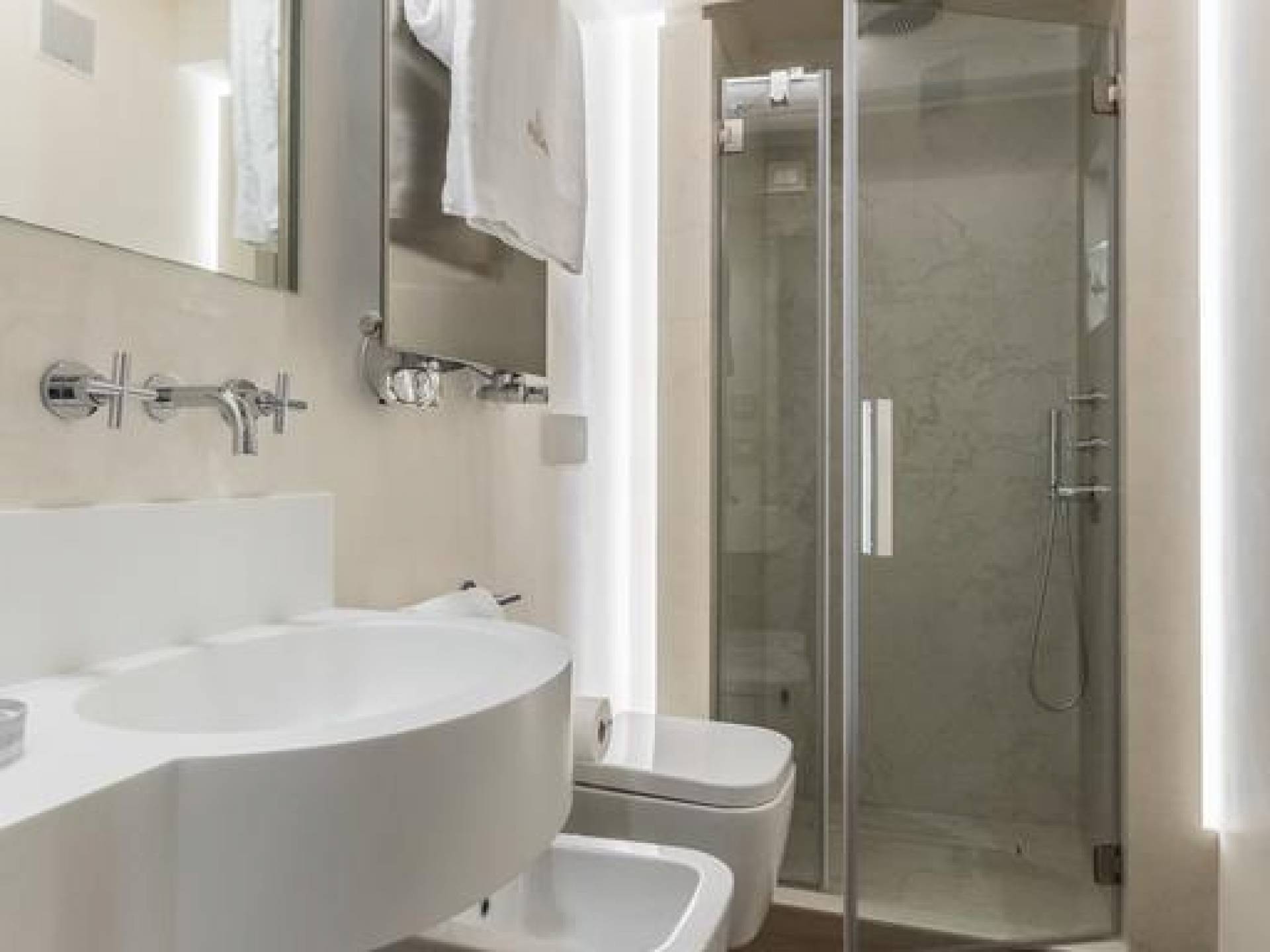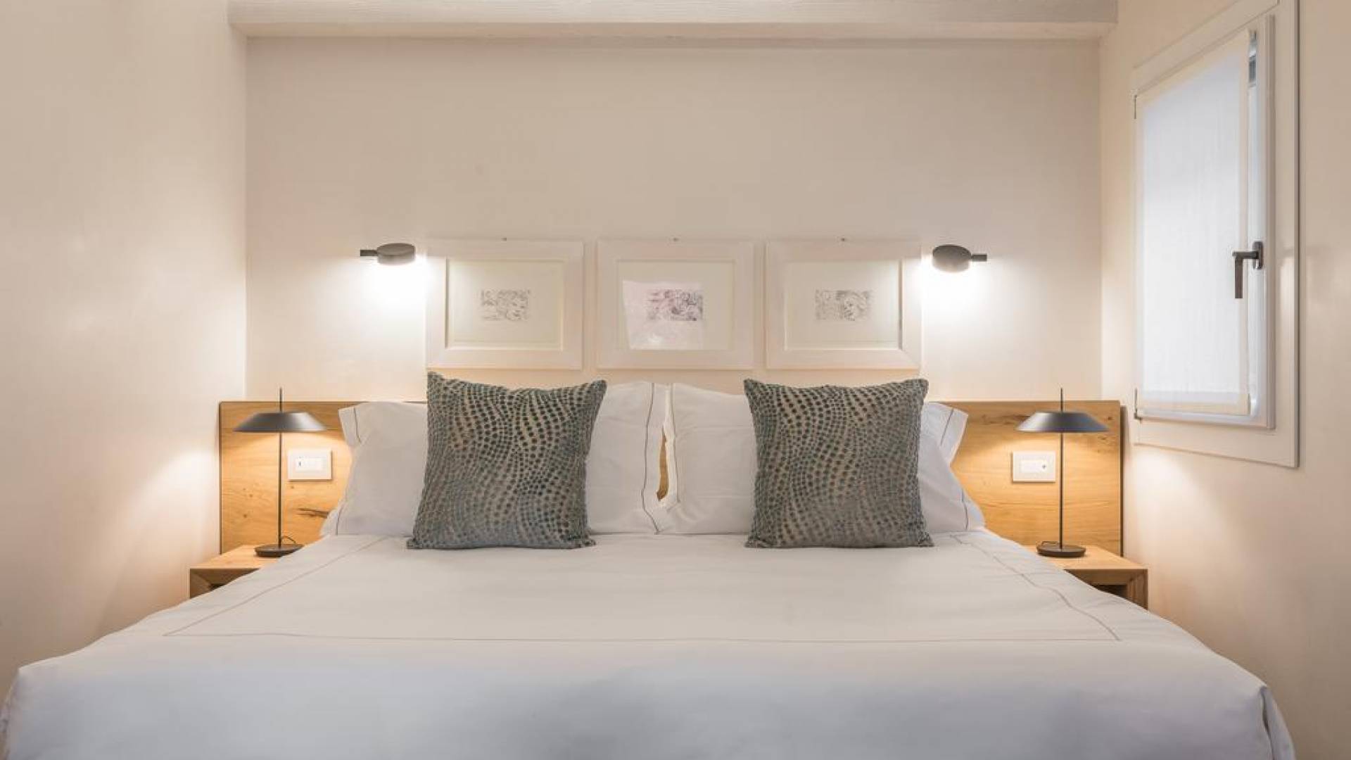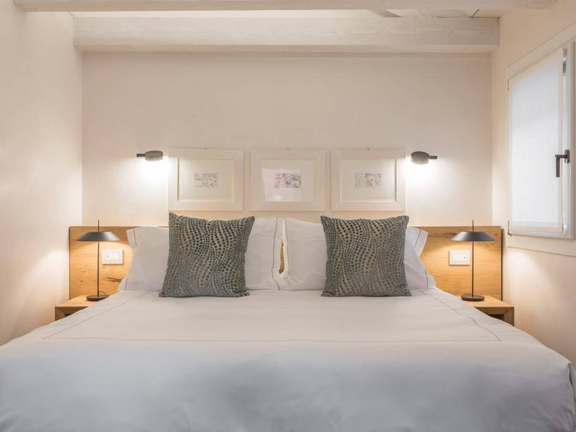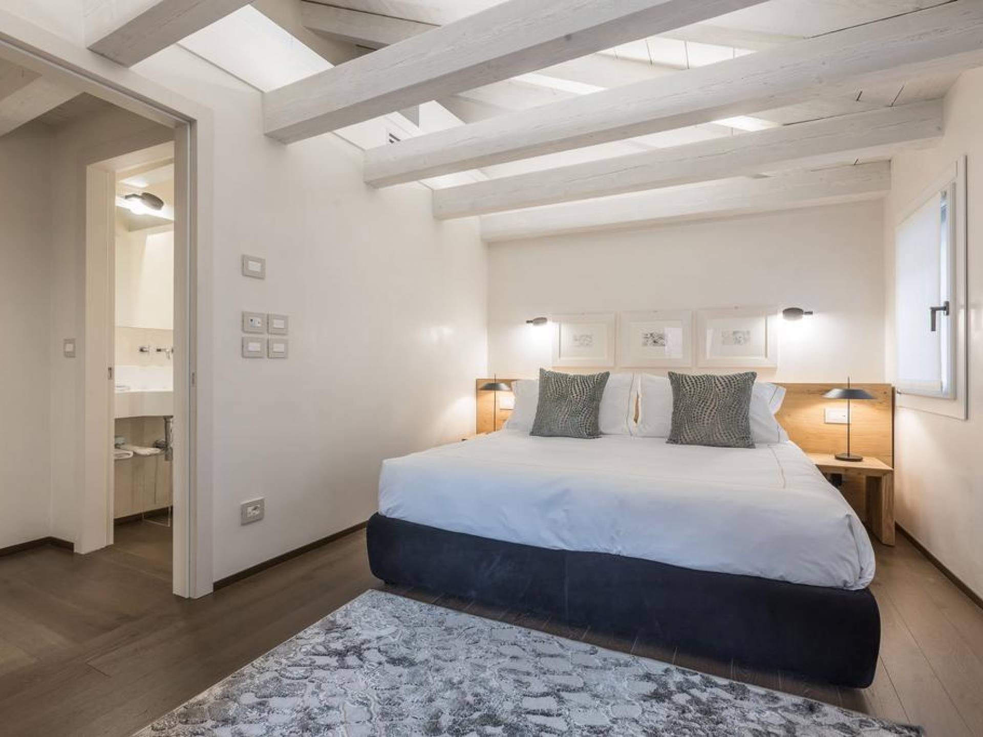 El diseño interior del apartamento presenta una combinación de telas naturales y preciosas como el algodón italiano combinado con seda bordada hecha en Venecia. Las paredes están acabadas en yeso veneciano, los suelos son de mármol terrazo y los apliques y lámparas son de cristal de Murano, imbuyendo el espacio moderno con acentos locales que recuerdan la vida veneciana. El efecto general es una impresionante exhibición de elegancia moderna con un encanto local que hace que los huéspedes se sientan como en casa y en el extranjero.