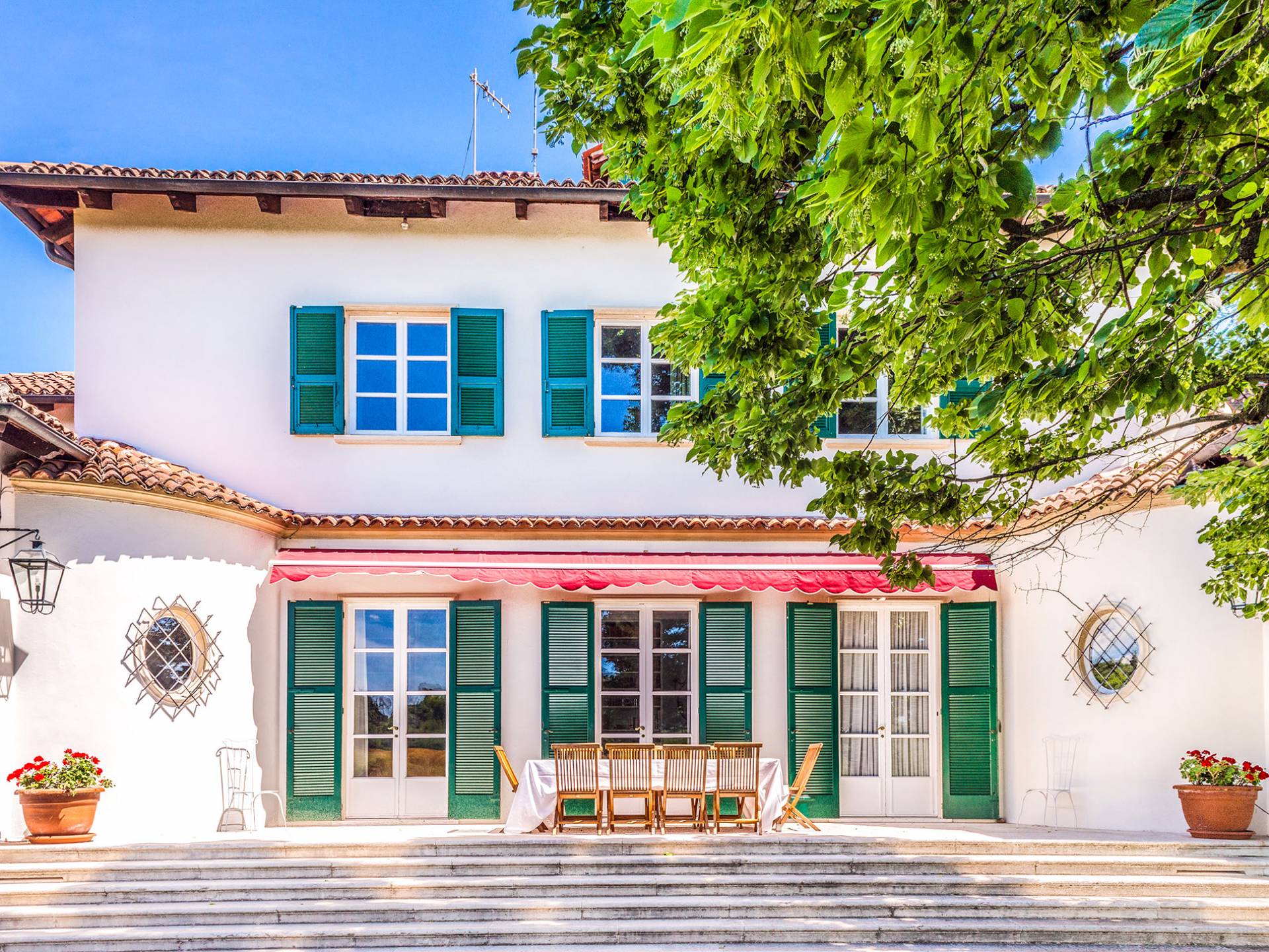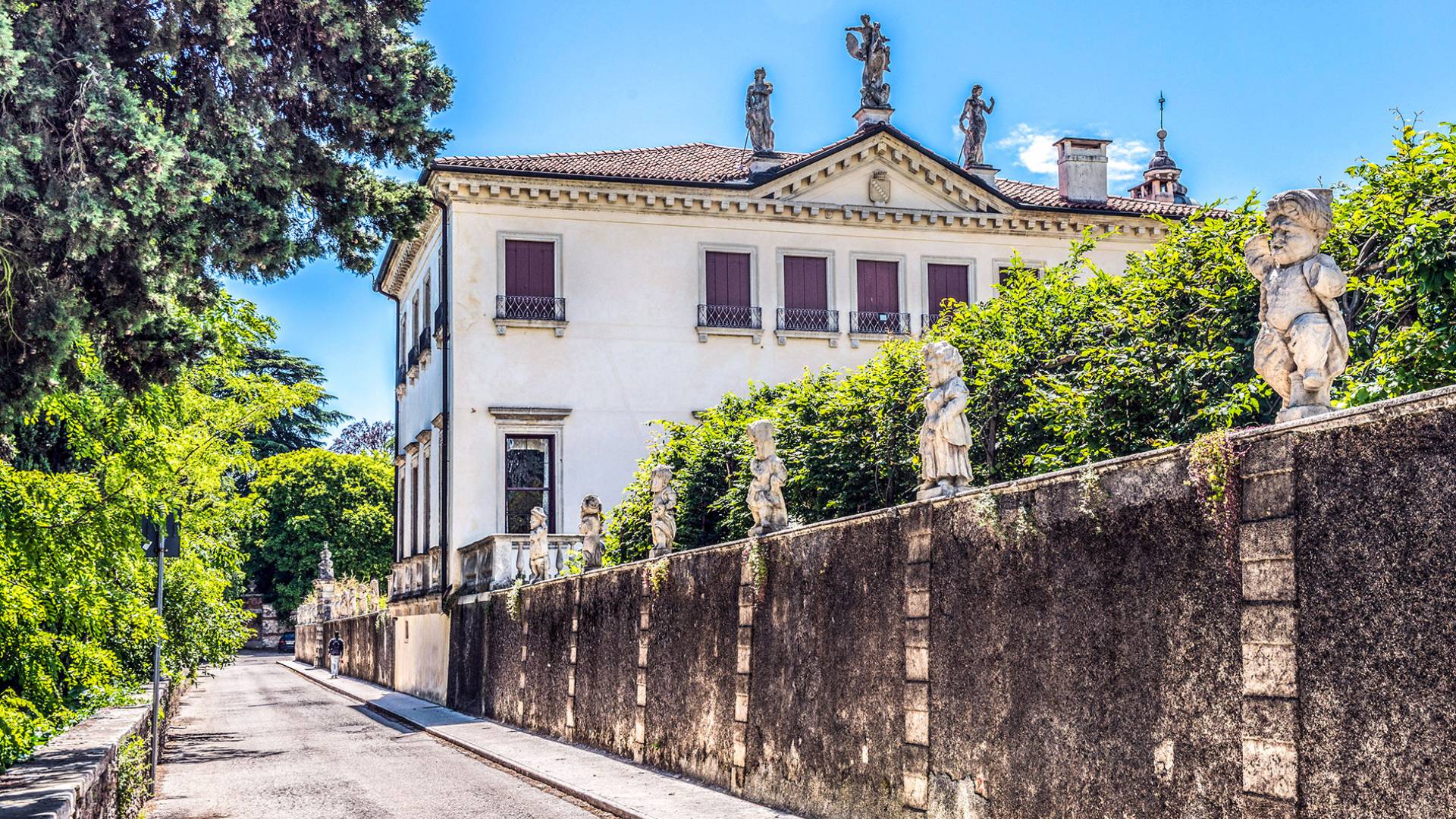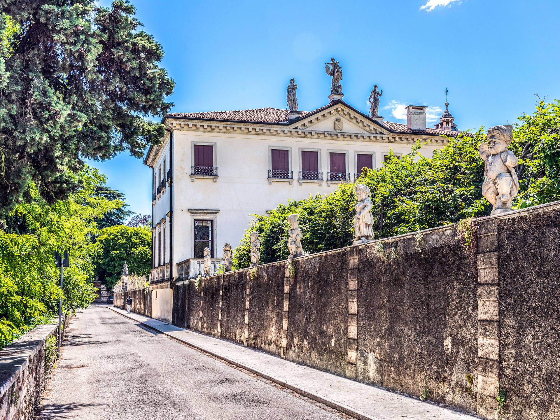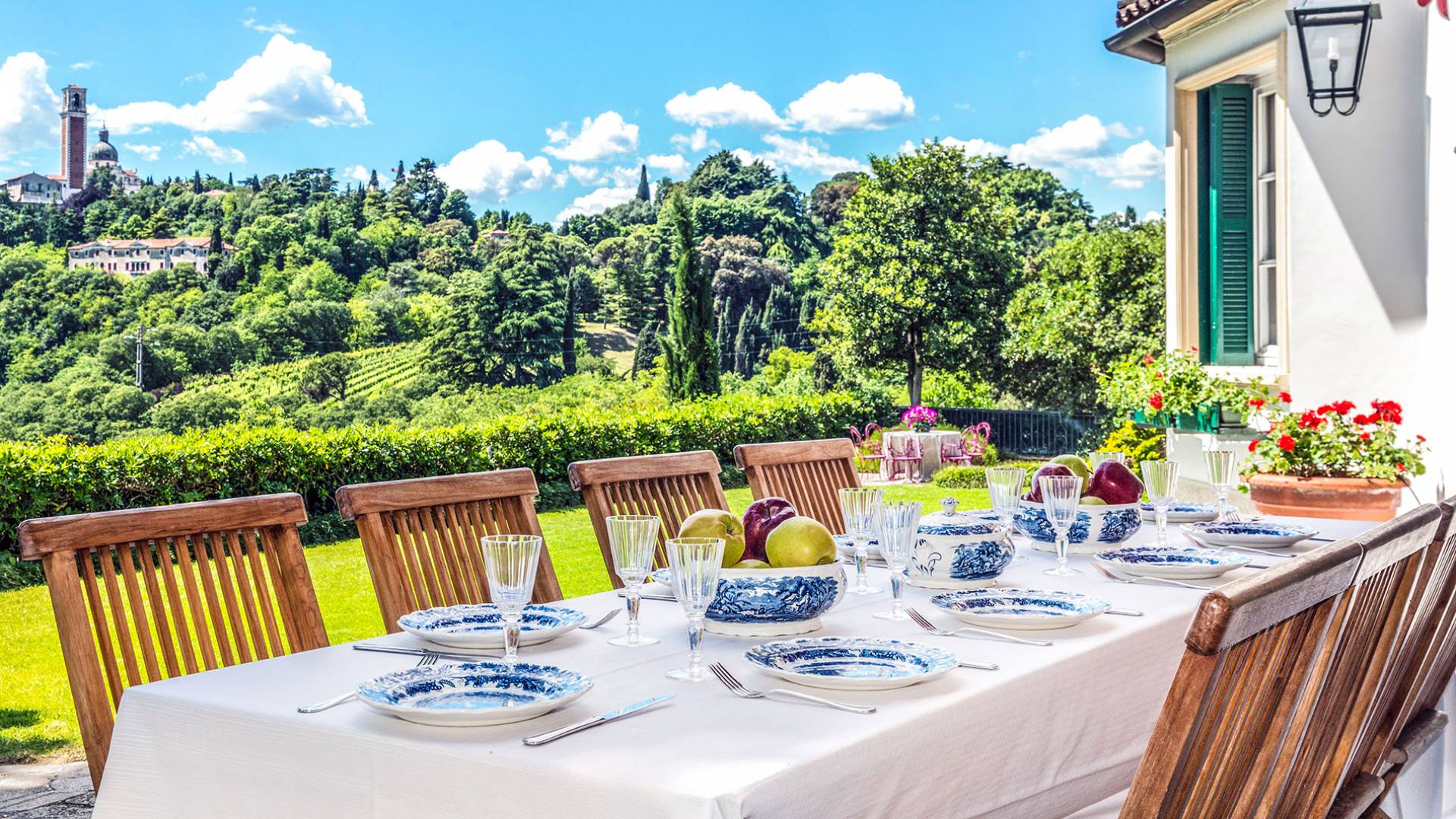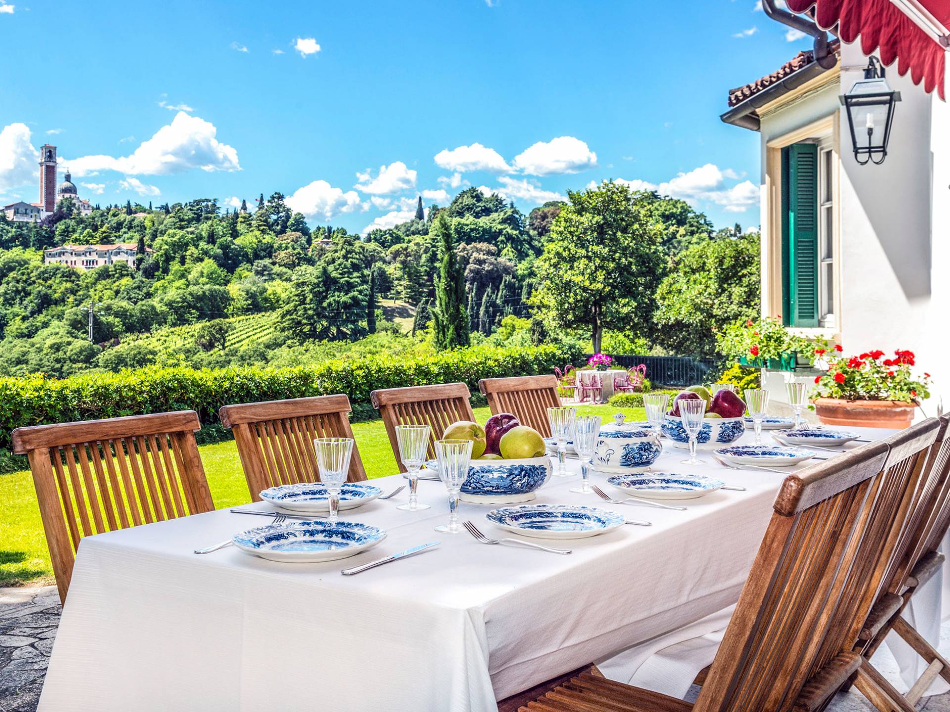 Esta mansión increíblemente elegante ha sido bendecida por muchos invitados distinguidos a lo largo del tiempo y pintores como Gianbattista y Giandomenico Tiepolo, cuyos frescos de obra maestra adornan la cercana Villa Valmarana ai Nani también se inspiraron en la belleza de la zona. Con su amplia terraza panorámica frente a los atardeceres dorados en medio de antiguos cipreses, cedros, pinos y las rosas, geranios y lirios más perfumados, esta finca es uno de los mejores ejemplos de villas nobles clásicas en Véneto.