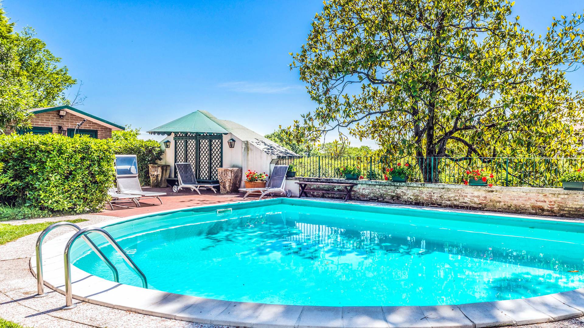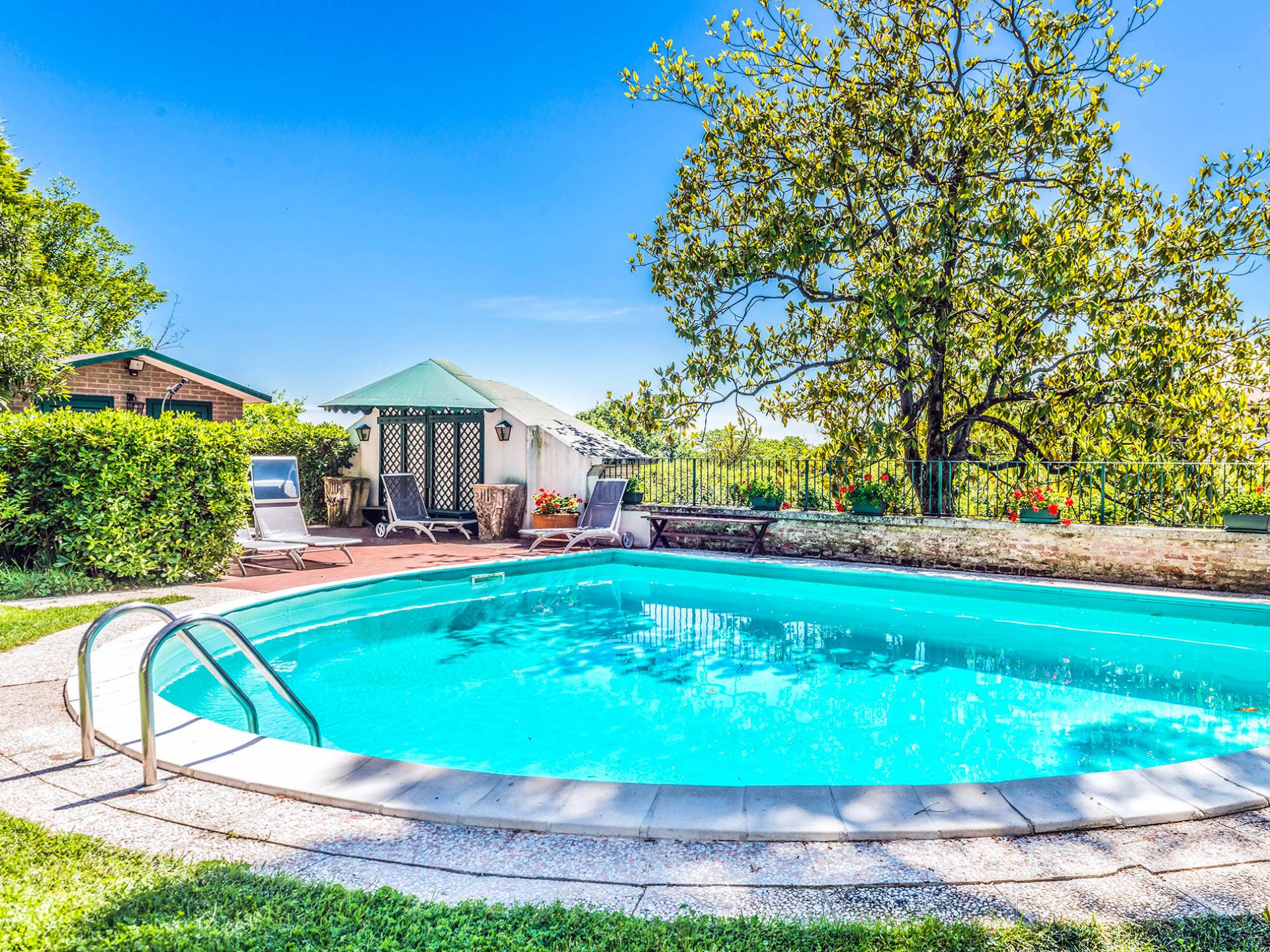 La puerta de entrada a la propiedad se activa de forma remota y abundan las cámaras de seguridad dentro del jardín y el perímetro de Villa Ludovica Vicenza, lo que hace que esta propiedad sea especialmente adecuada para huéspedes en busca de privacidad y alta seguridad. La piscina al lado de la casa tiene vistas a la Villa Valmarana y uno es recordado constantemente, incluso durante las actividades de ocio más informales, de la historia, el arte y la cultura de los alrededores. Hay un vestuario con nevera, ducha y muchos sillones para tomar el sol del verano. El aire acondicionado está presente en los dormitorios principales, el pasillo de la habitación de invitados del primer piso y las áreas de estar principales, mientras que se proporciona ventilación para la comodidad de los huéspedes durante los meses de verano.