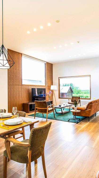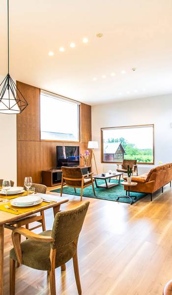 La elegante sala de estar, con ventanas que dan al bosque verde, tiene sofás mullidos y acogedores con TV de pantalla plana donde puedes sentarte y relajarte, leer un libro, reunirte con tus amigos o familiares para ver una película o Jugar juegos de mesa. La mesa de comedor es espaciosa y perfecta para una reunión para disfrutar de una deliciosa comida acompañada de una copa de buen vino. La cocina moderna contiene todas las comodidades que necesita para preparar su café, alimentos y bebidas. Las habitaciones son grandes y cómodas con colchones firmes para una relajación absoluta y un sueño profundo.
