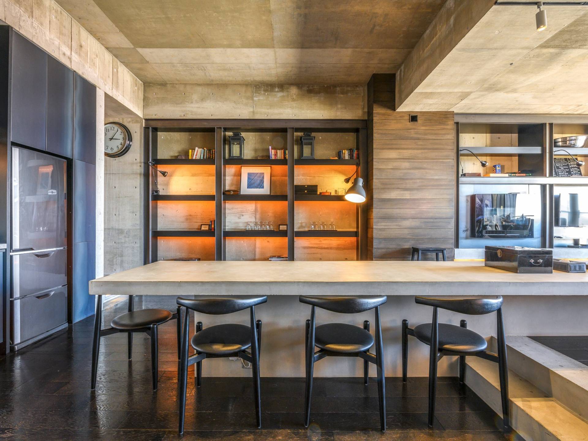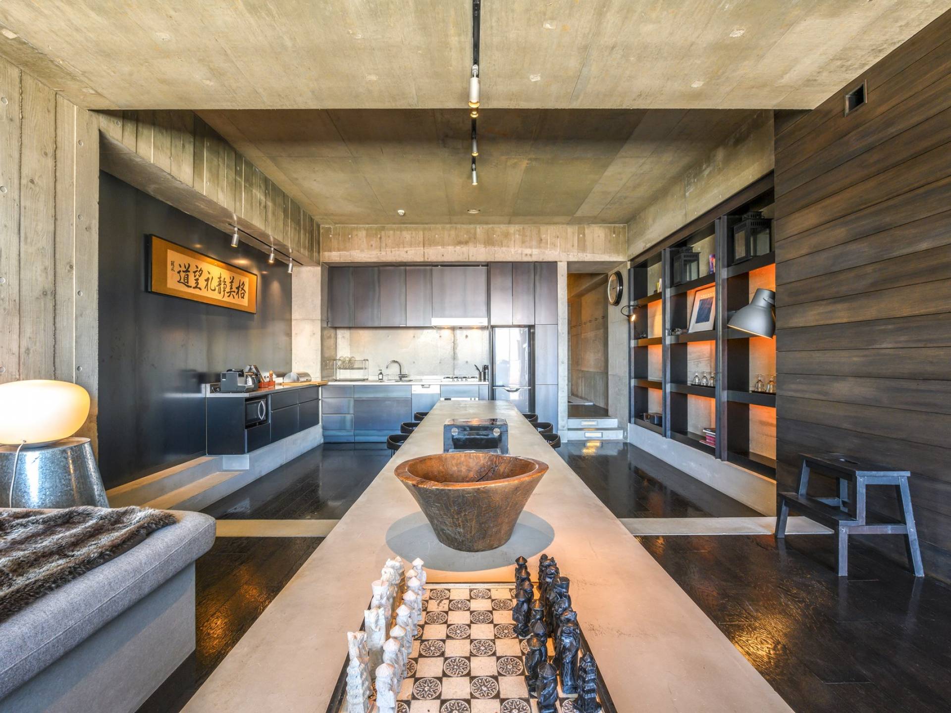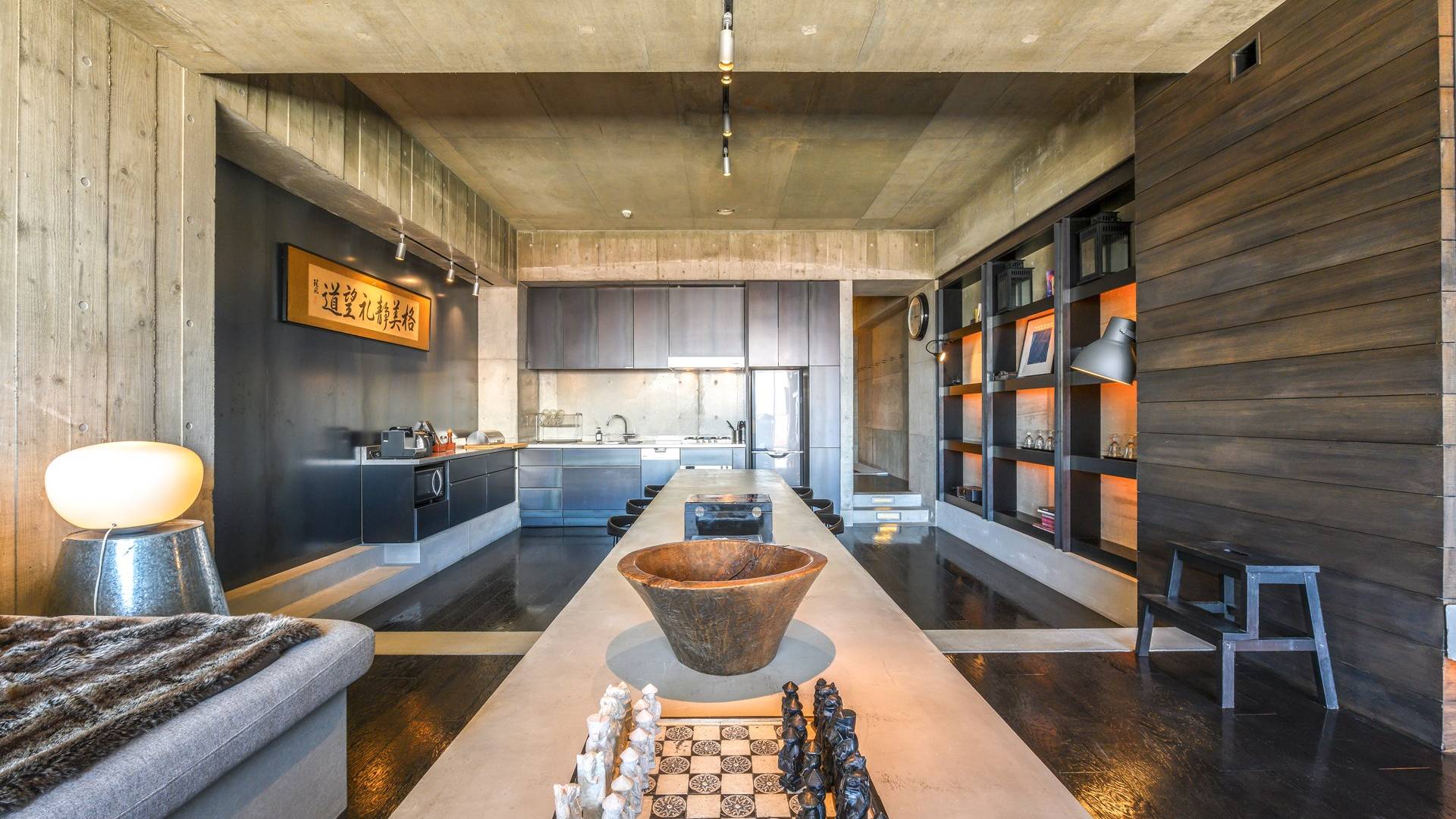 La estética industrial se atempera por completo con la calidez y el carácter que emanan de los materiales no artificiales y los lujosos acentos japoneses.