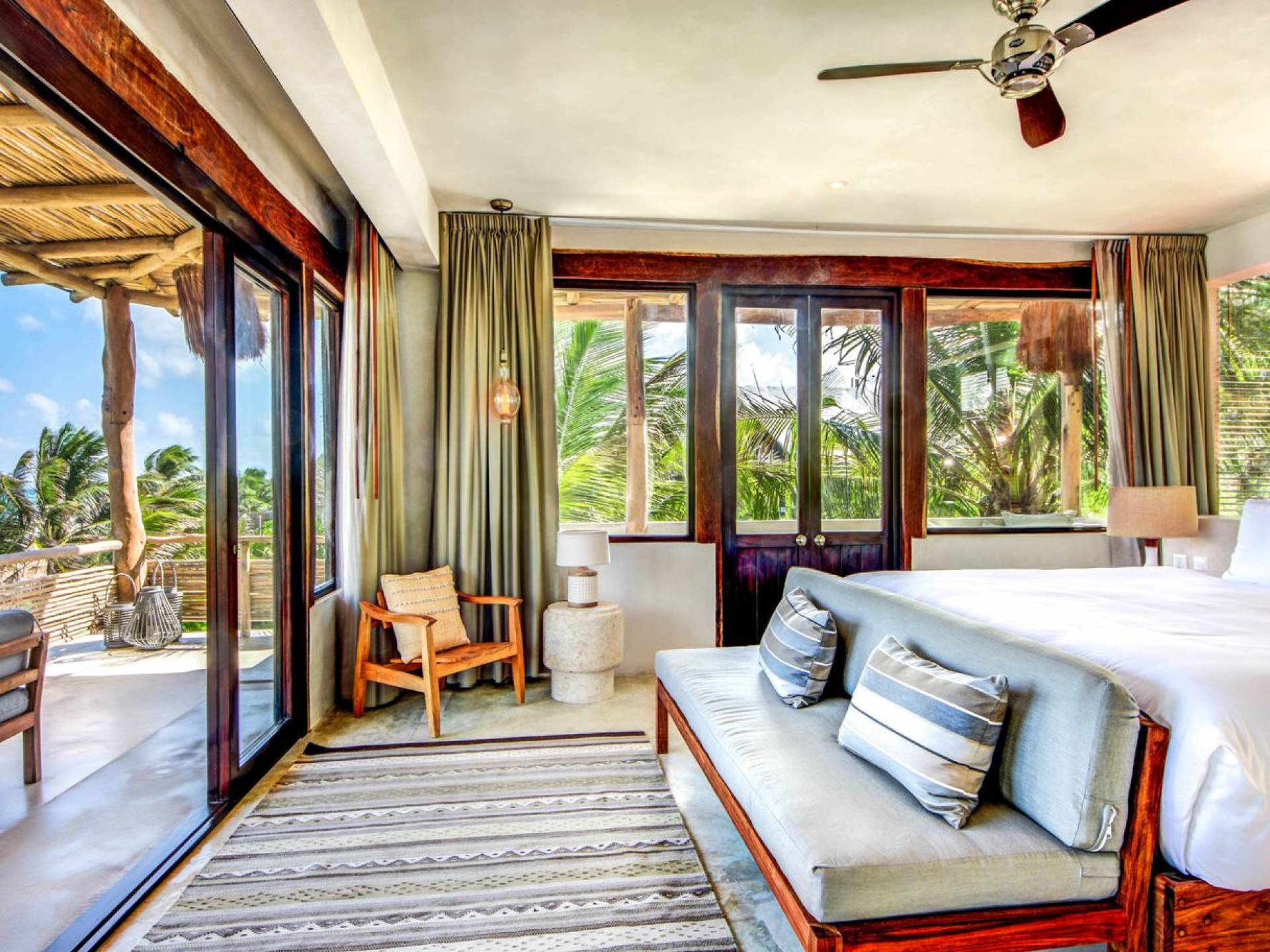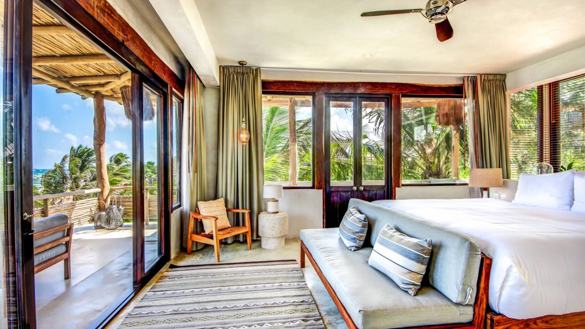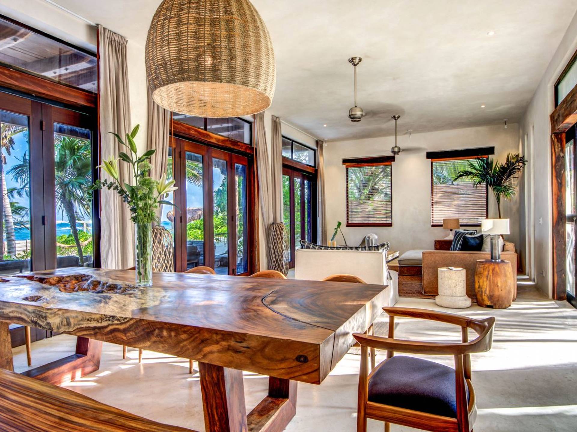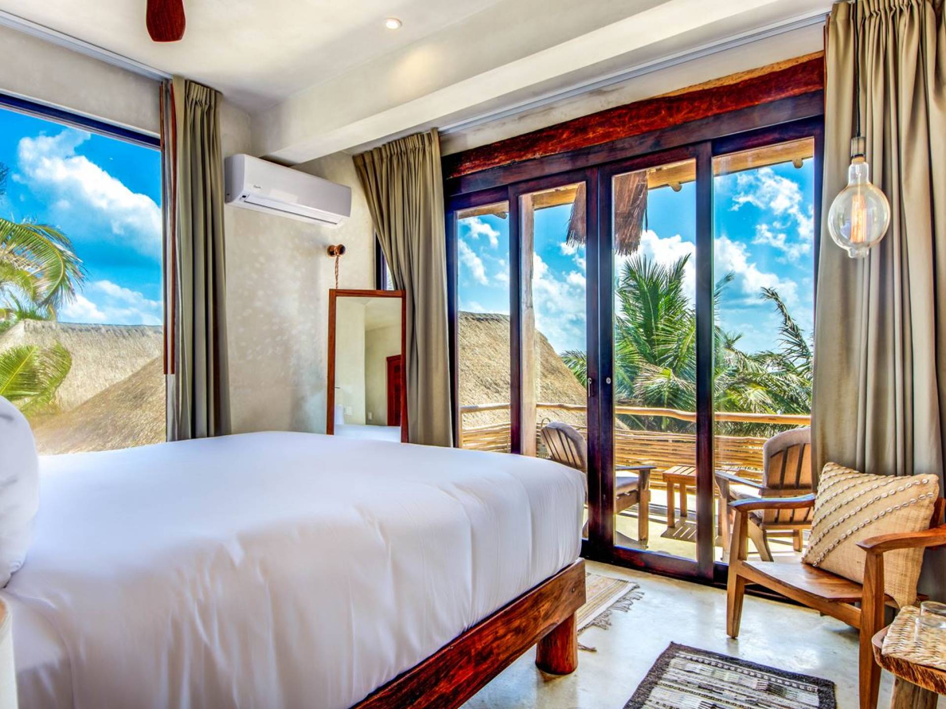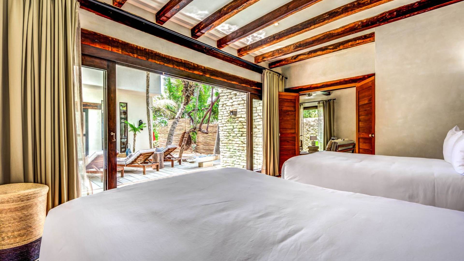 Casa Chukum cuenta con una hermosa casa principal con una terraza privada frente al mar y una azotea con una enorme tumbona y vistas espectaculares del océano y las puestas de sol en la jungla. Además, ofrece una casa de la piscina, un bar al aire libre y un patio central privado con hamacas junto a una acogedora piscina privada. La casa ofrece cuatro amplias habitaciones con baños en suite, amplias áreas comunes interiores y exteriores que incluyen sala de estar, comedor para diez personas, baño de visitas, cocina totalmente equipada y una magnífica terraza frente al mar. Esta espaciosa casa de 3895 pies cuadrados permite que familias y amigos disfruten de un paraíso privado en uno de los destinos de playa más modernos del mundo.