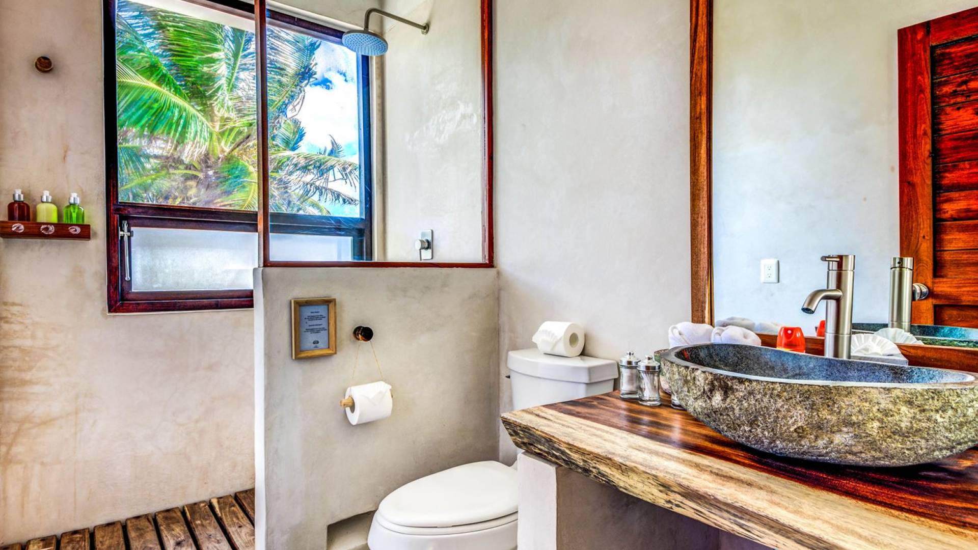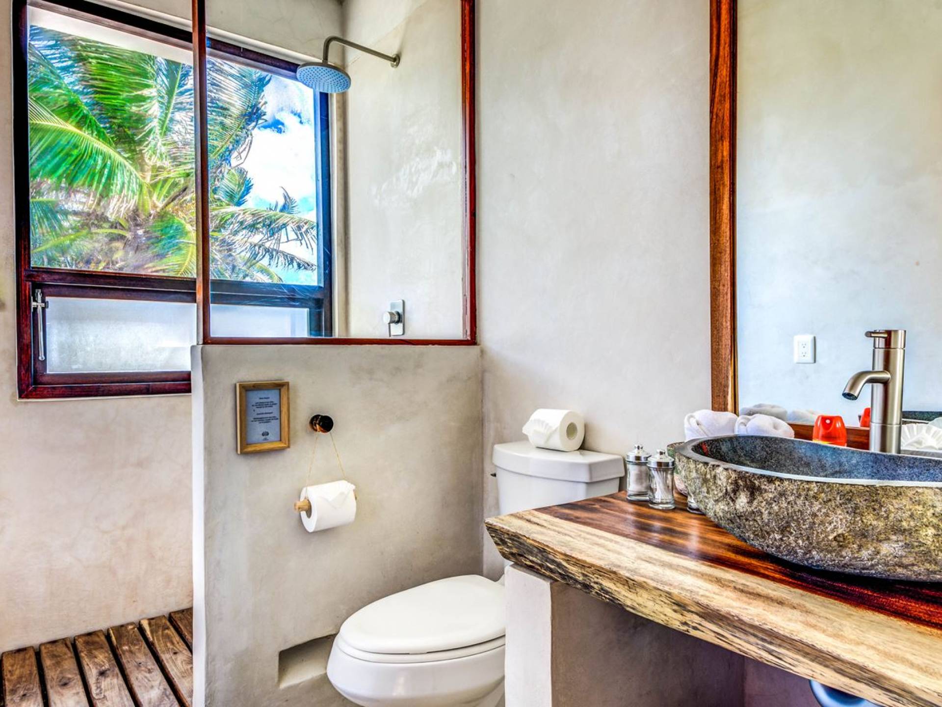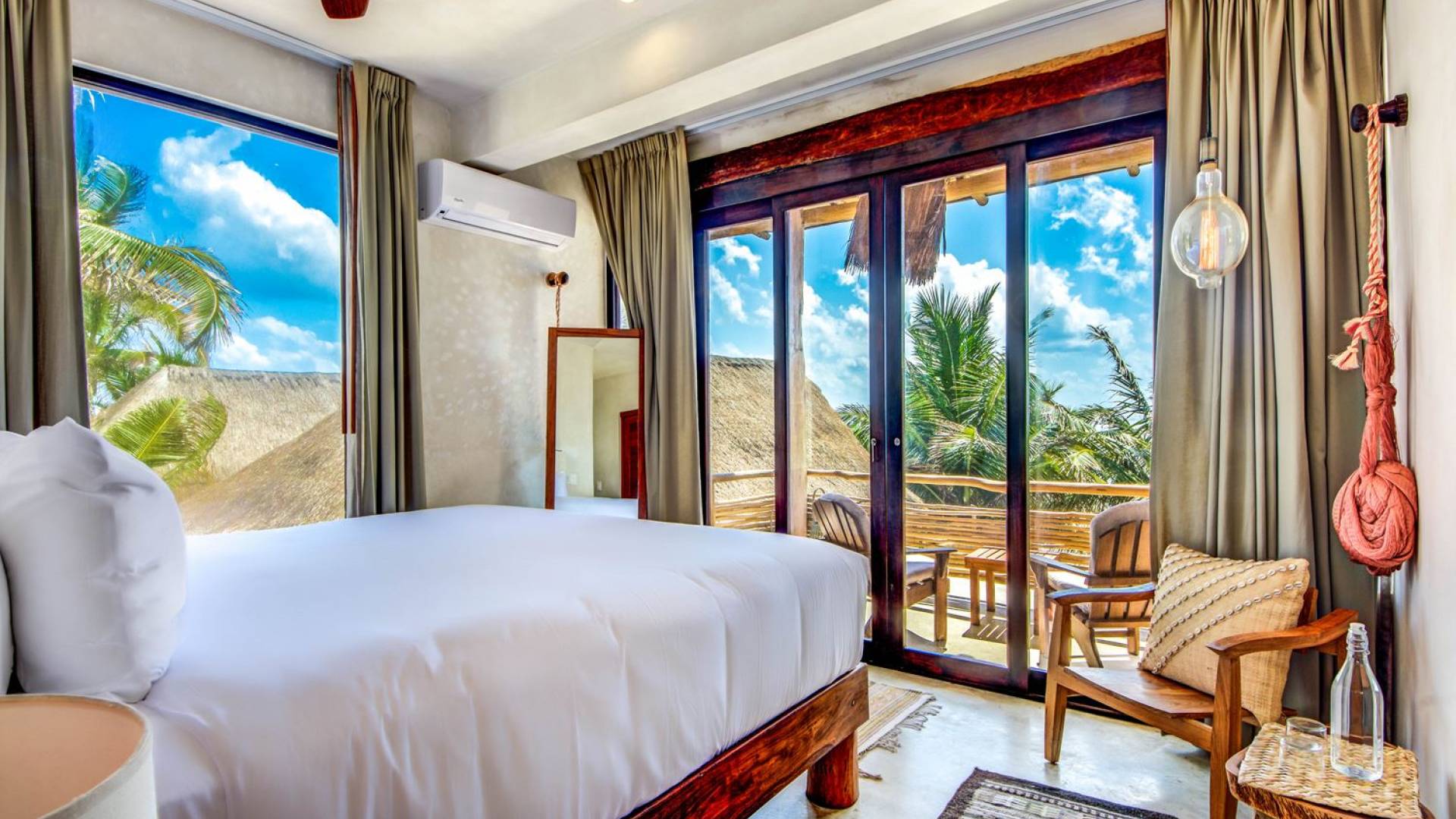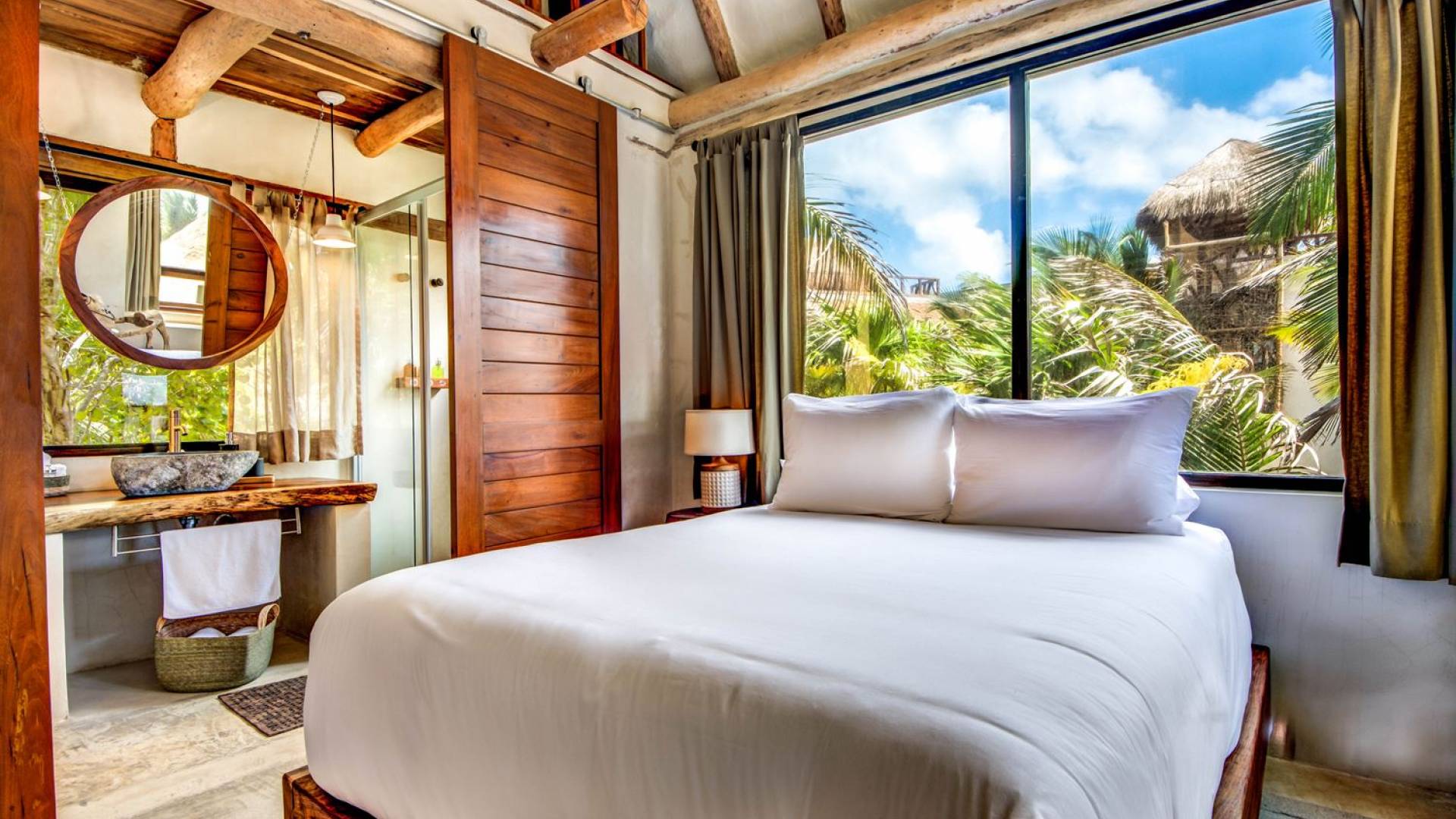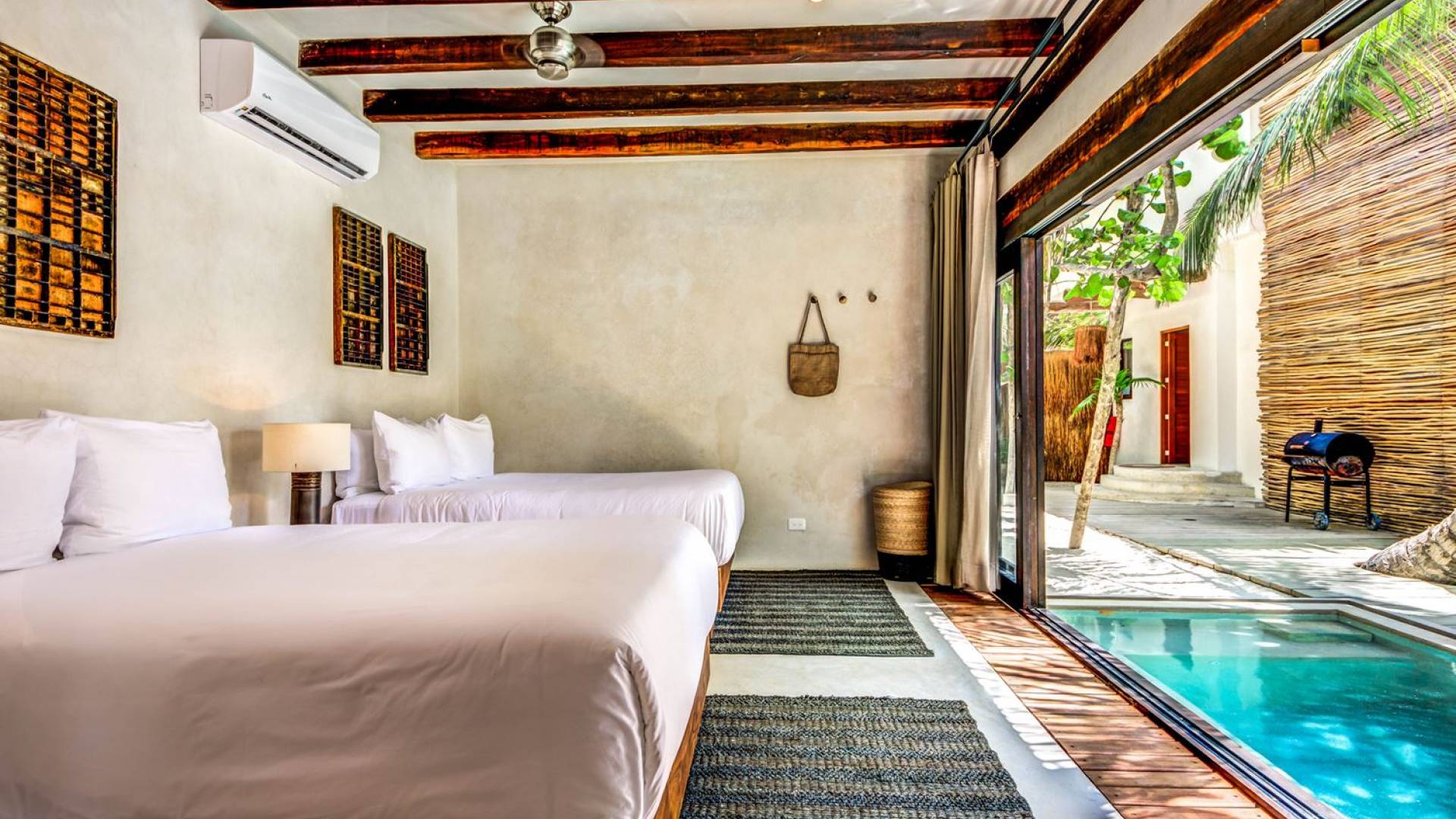 Casa Chukum cuenta con una hermosa casa principal con una terraza privada frente al mar y una azotea con una enorme tumbona y vistas espectaculares del océano y las puestas de sol en la jungla. Además, ofrece una casa de la piscina, un bar al aire libre y un patio central privado con hamacas junto a una acogedora piscina privada. La casa ofrece cuatro amplias habitaciones con baños en suite, amplias áreas comunes interiores y exteriores que incluyen sala de estar, comedor para diez personas, baño de visitas, cocina totalmente equipada y una magnífica terraza frente al mar. Esta espaciosa casa de 3895 pies cuadrados permite que familias y amigos disfruten de un paraíso privado en uno de los destinos de playa más modernos del mundo.