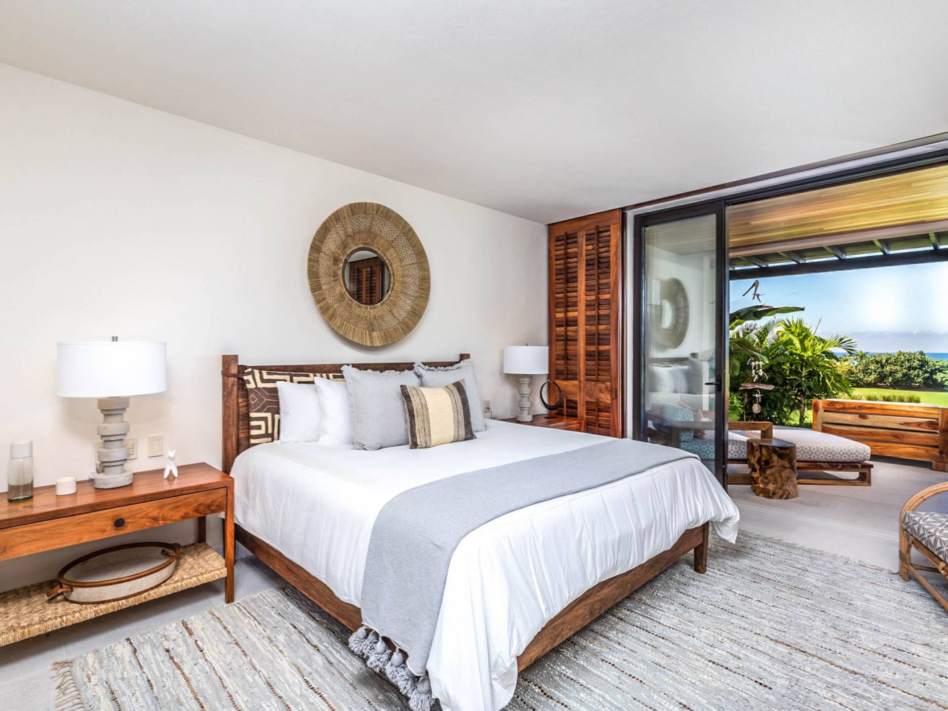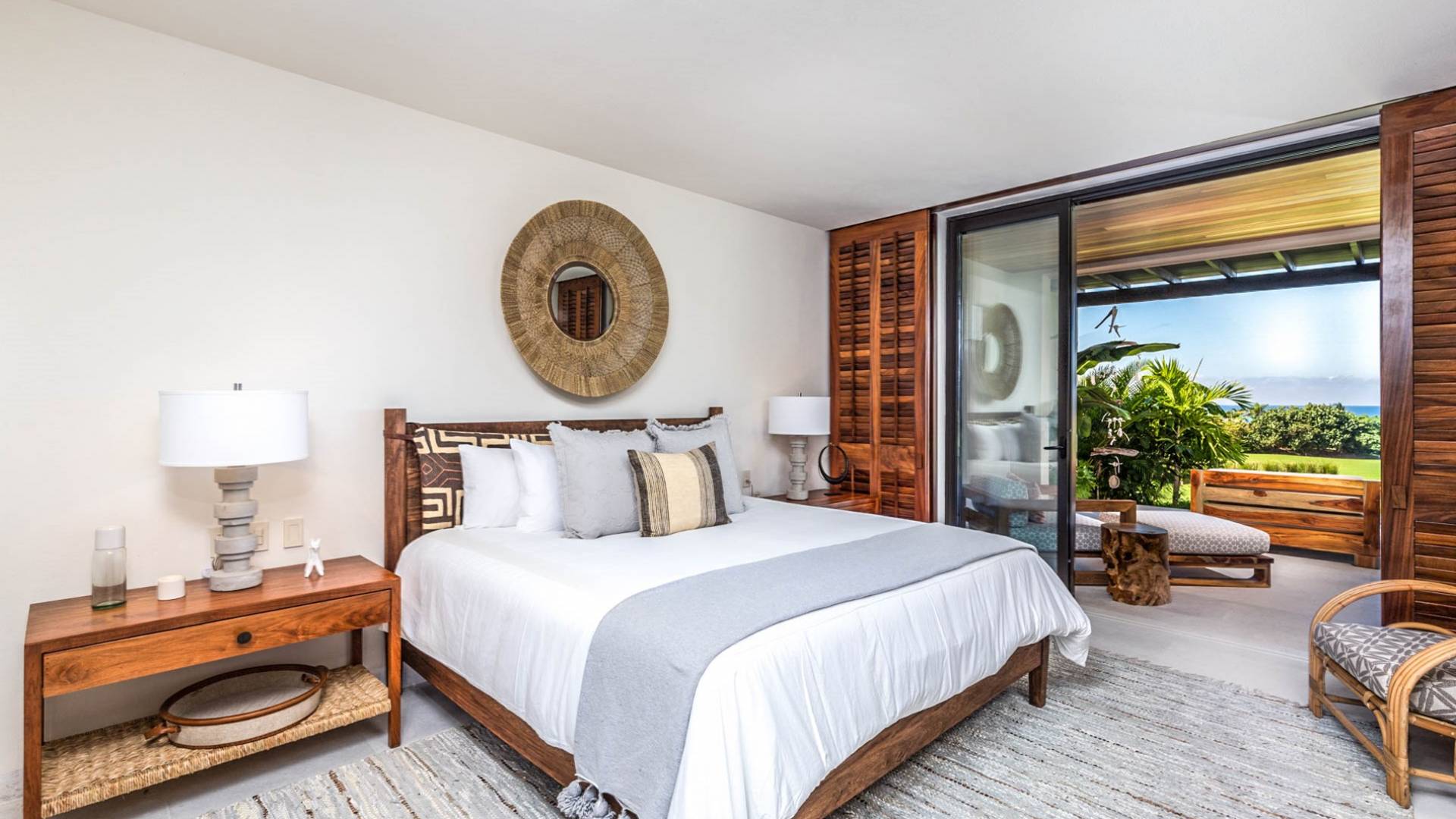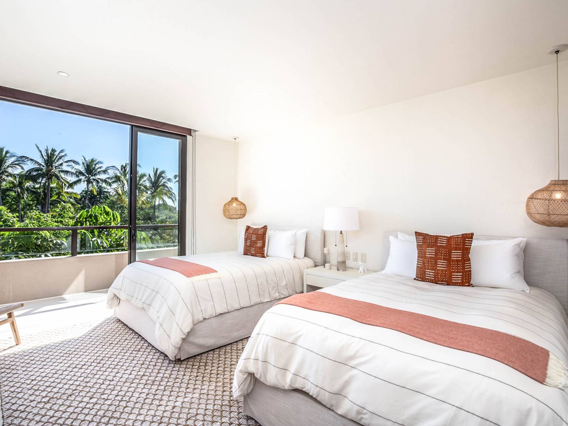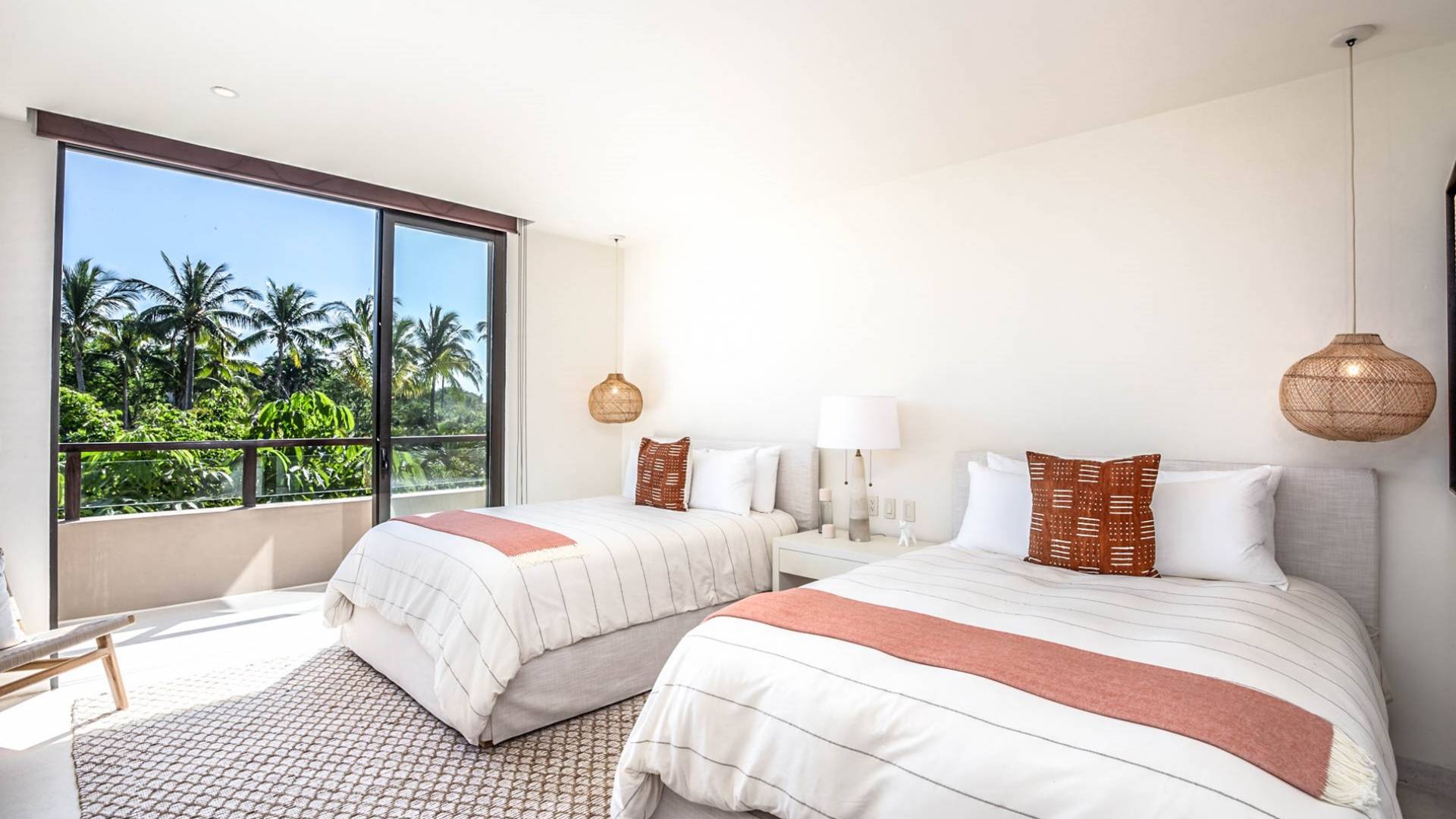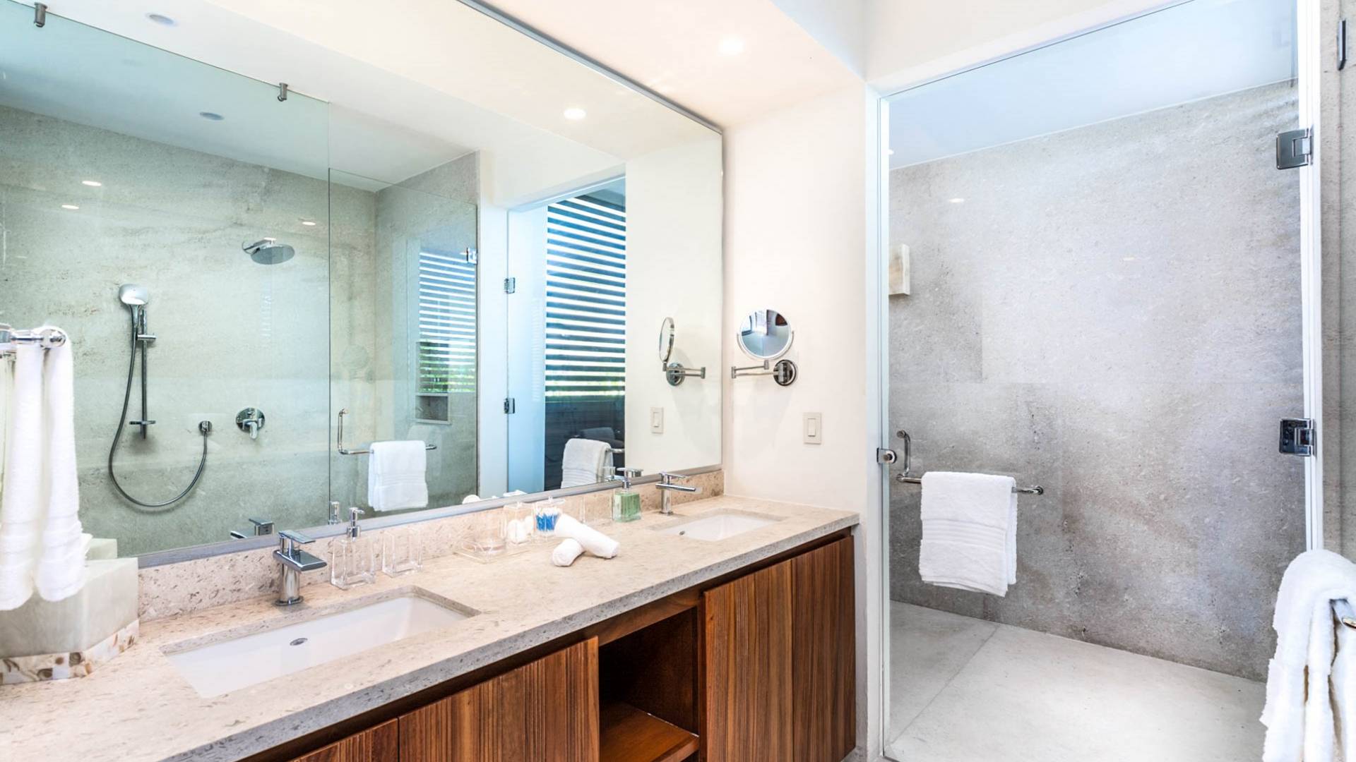 En el dormitorio 1 hay una cama King, baño privado con bañera, ducha de lluvia independiente al aire libre, tocador doble, acceso directo a la terraza, muebles de exterior. En el dormitorio 2 hay una cama tamaño King, baño privado con bañera, ducha de lluvia interior independiente, tocador doble, acceso directo a la terraza, muebles de exterior En el dormitorio 3 hay 2 camas tamaño Queen, baño privado con bañera independiente ducha de efecto lluvia y bañera de interior, tocador doble, acceso directo al balcón.