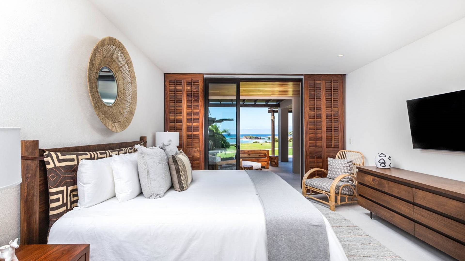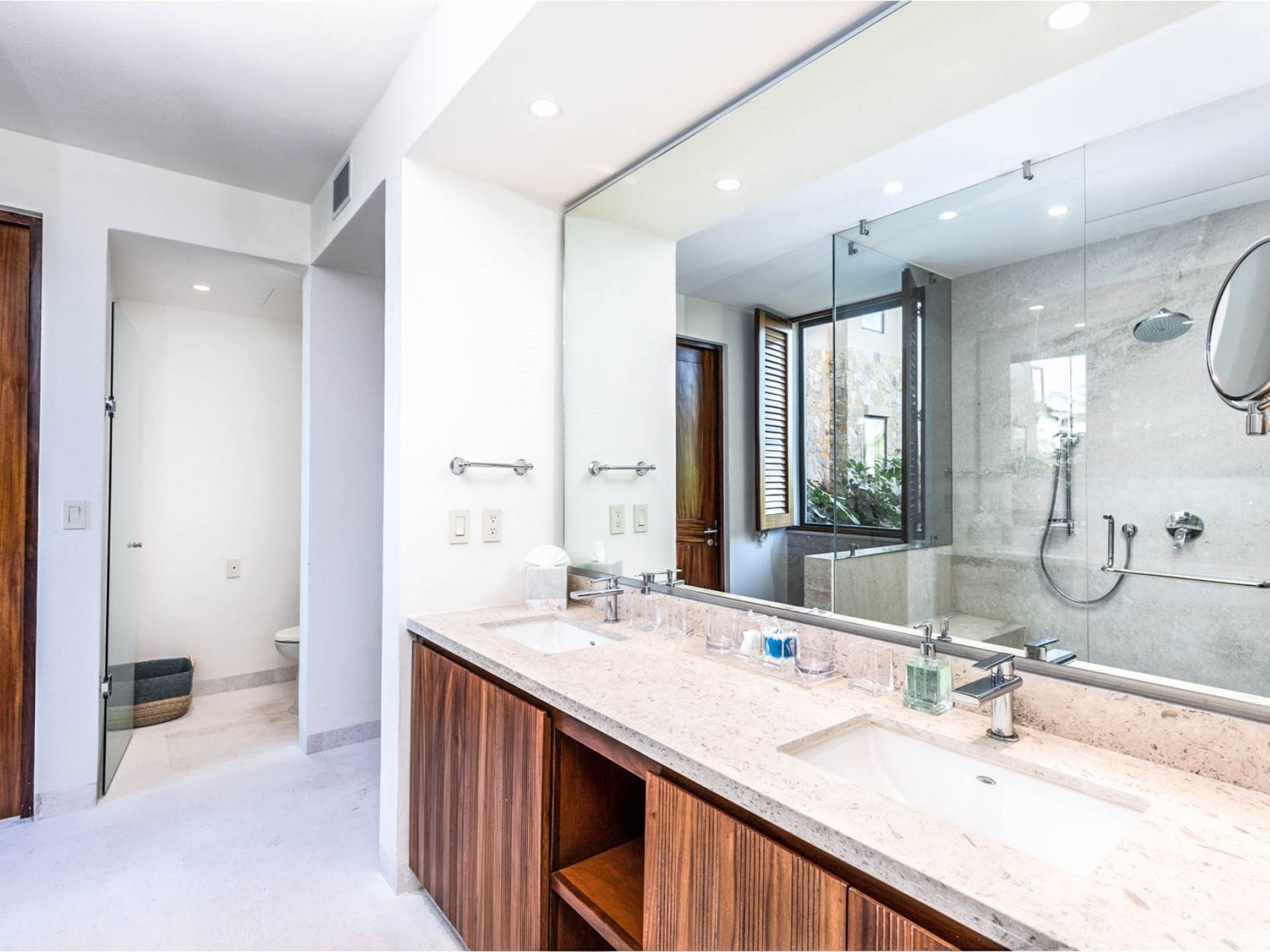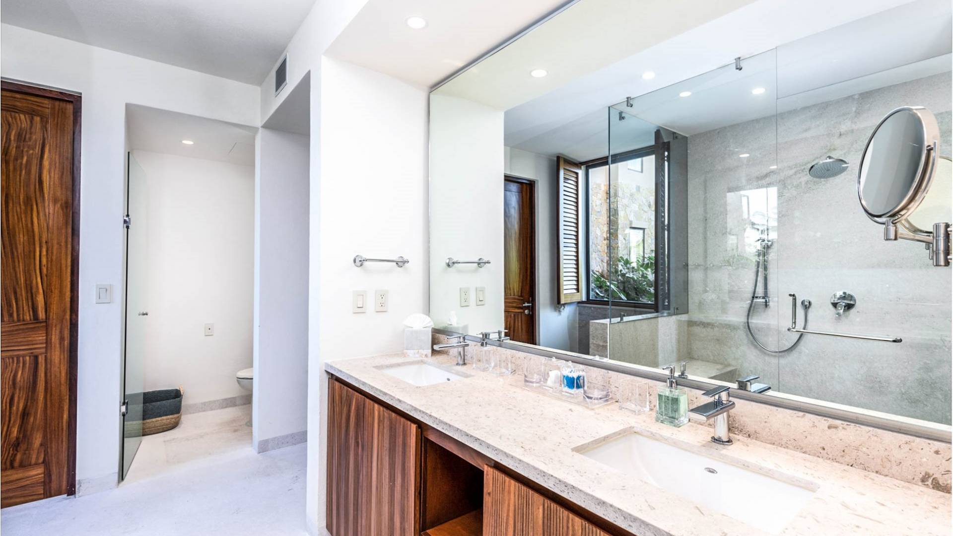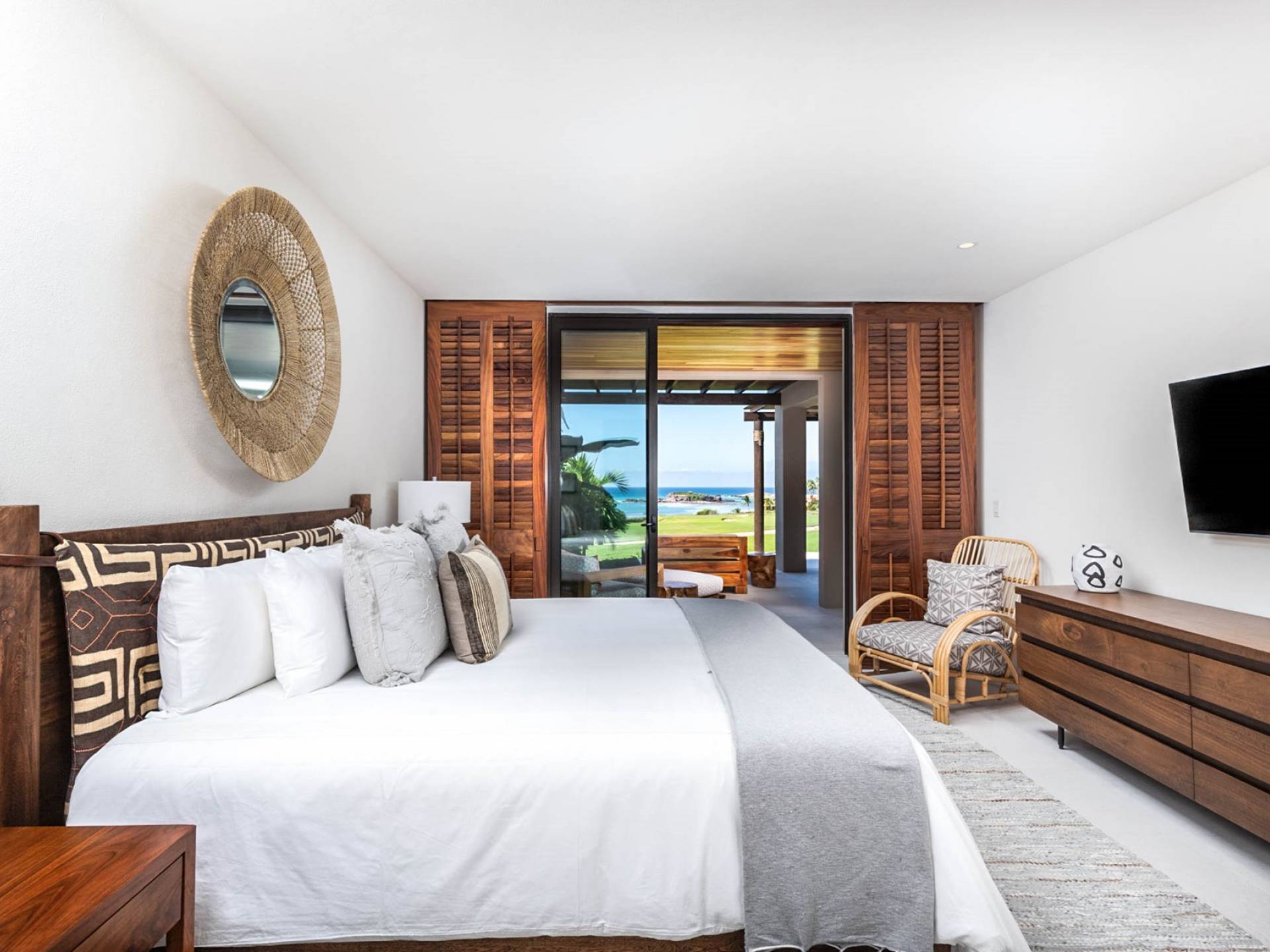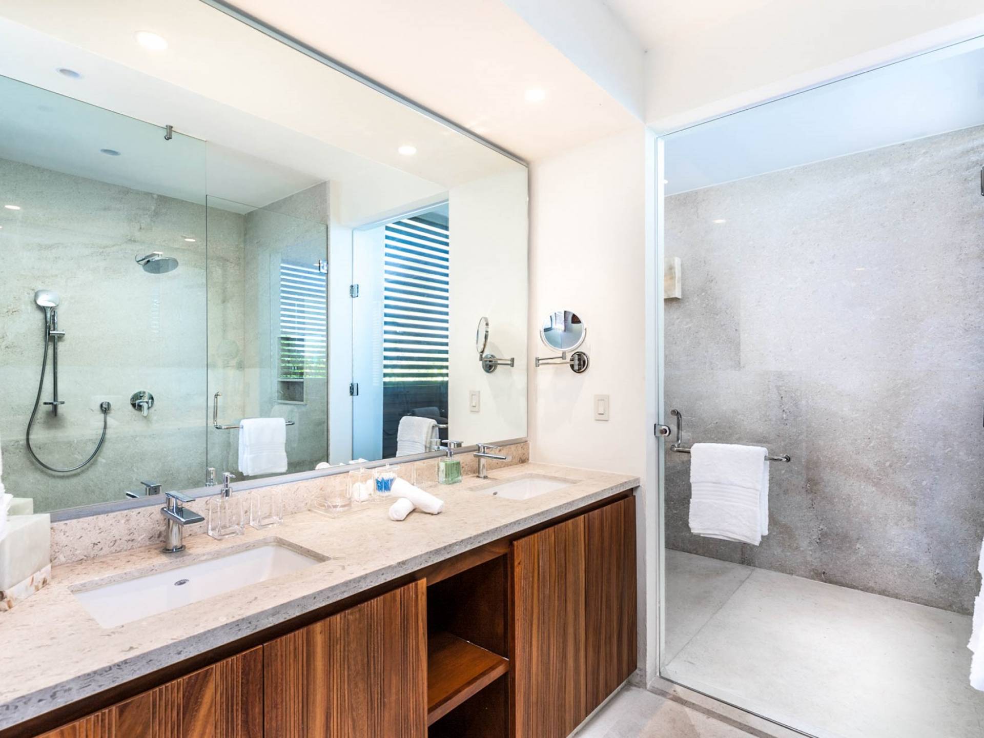En el dormitorio 1 hay una cama King, baño privado con bañera, ducha de lluvia independiente al aire libre, tocador doble, acceso directo a la terraza, muebles de exterior. En el dormitorio 2 hay una cama tamaño King, baño privado con bañera, ducha de lluvia interior independiente, tocador doble, acceso directo a la terraza, muebles de exterior En el dormitorio 3 hay 2 camas tamaño Queen, baño privado con bañera independiente ducha de efecto lluvia y bañera de interior, tocador doble, acceso directo al balcón.