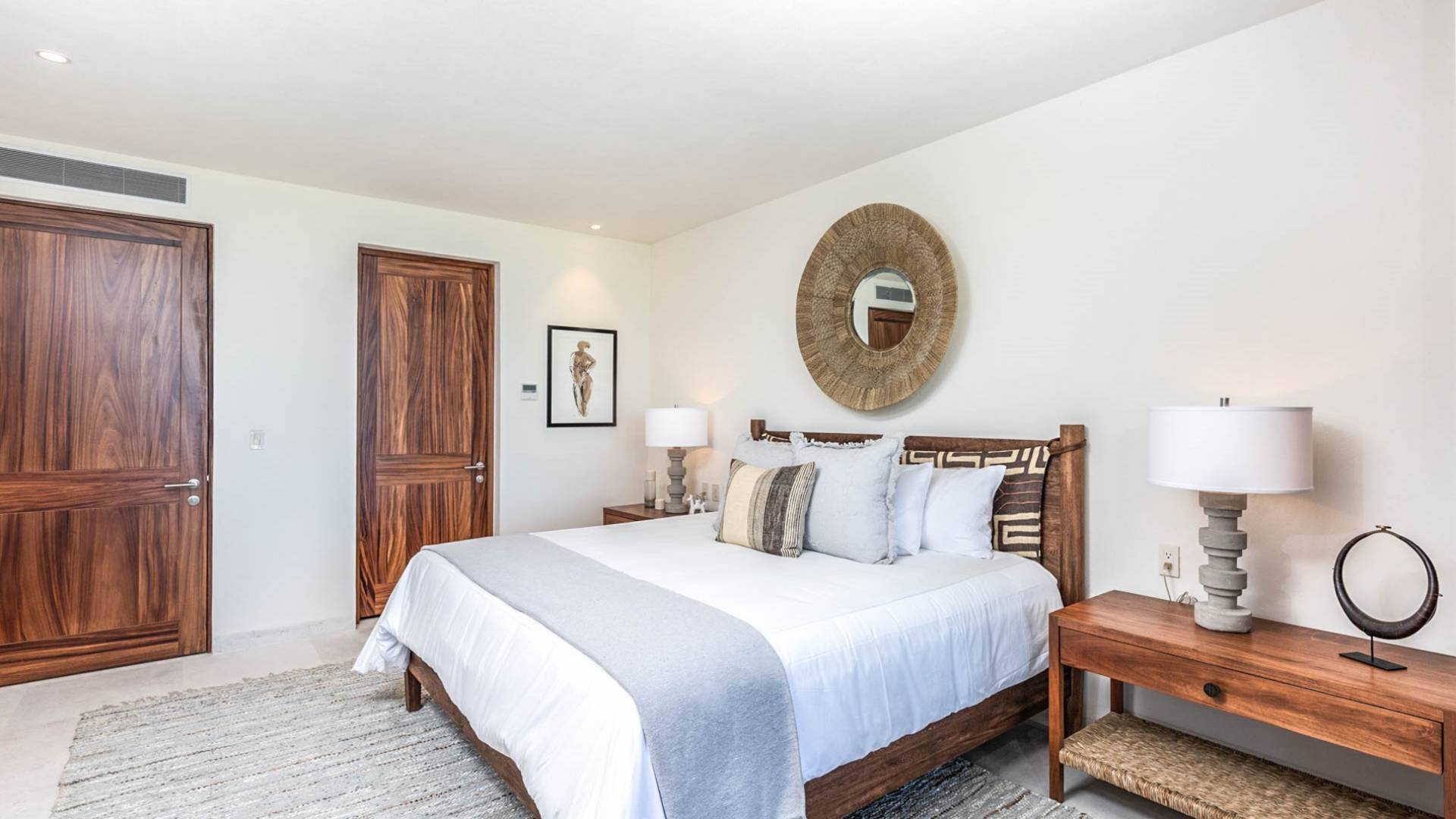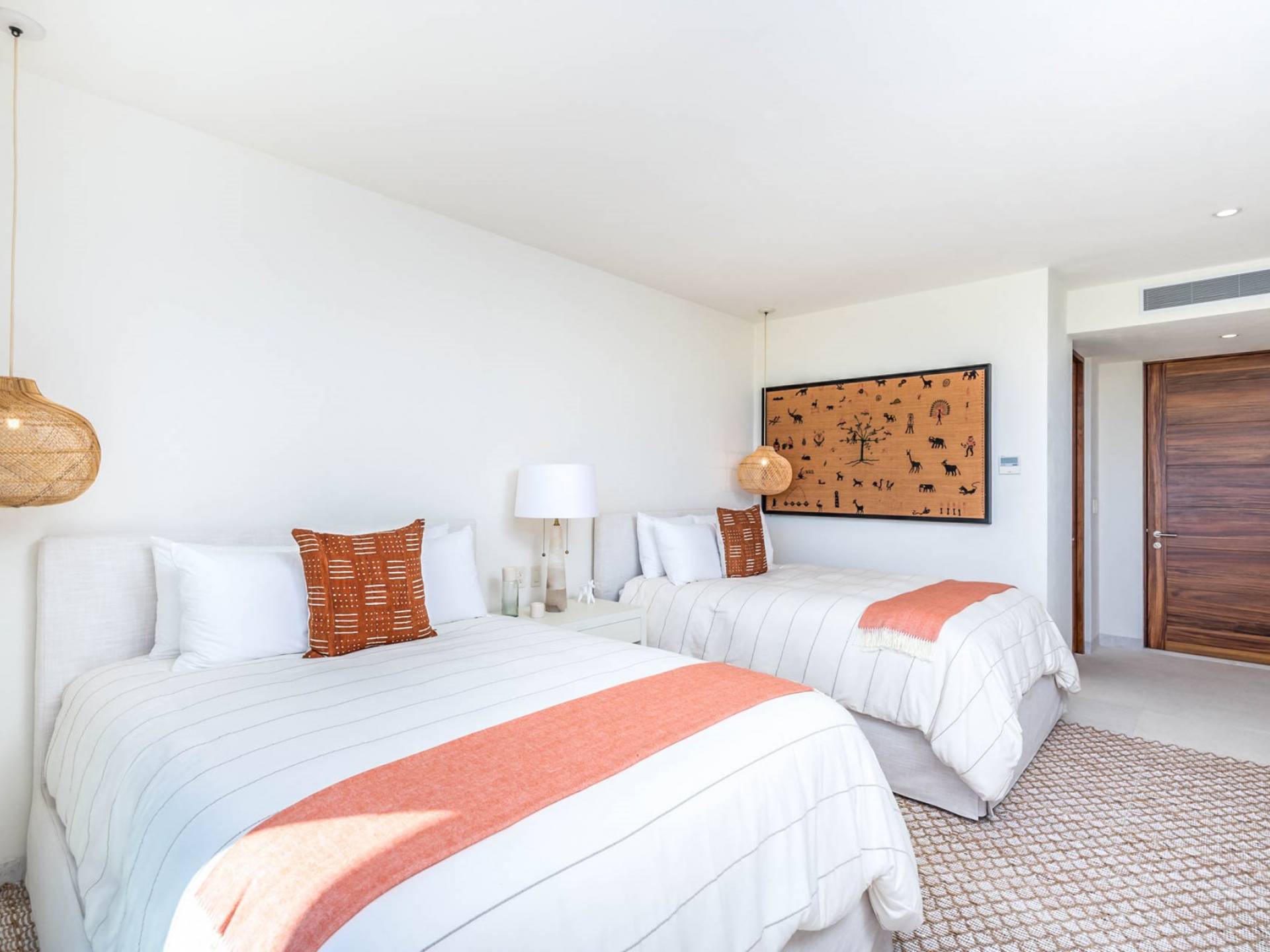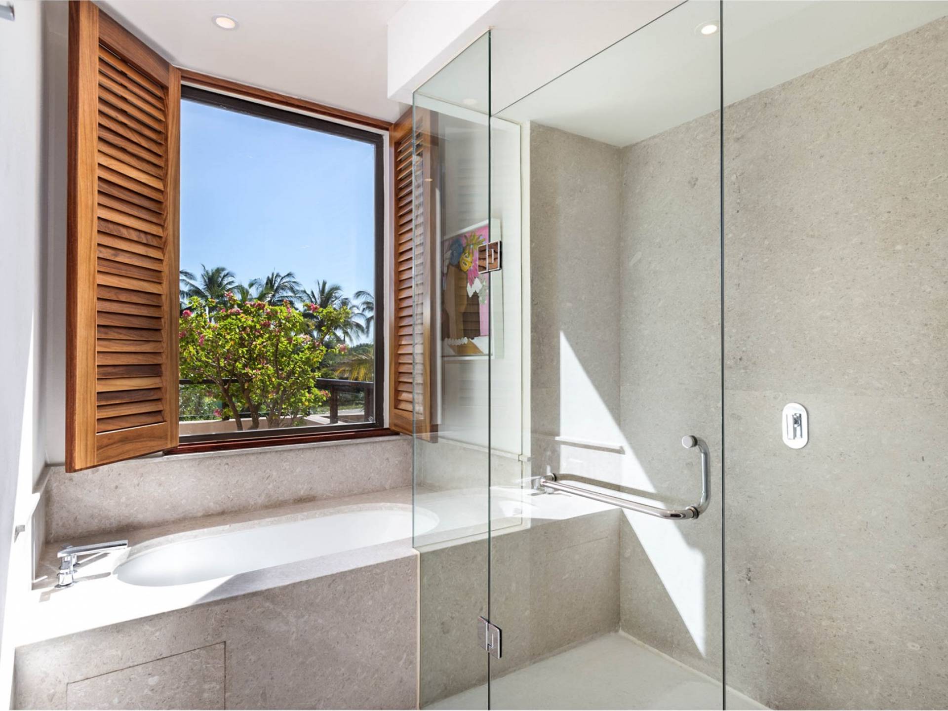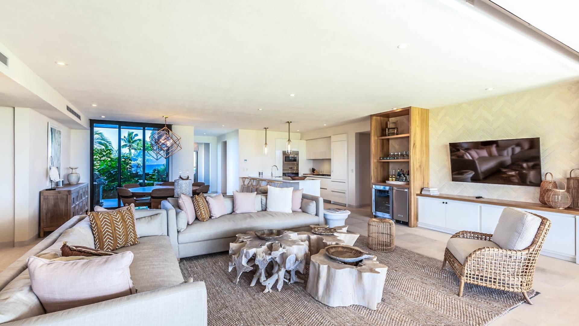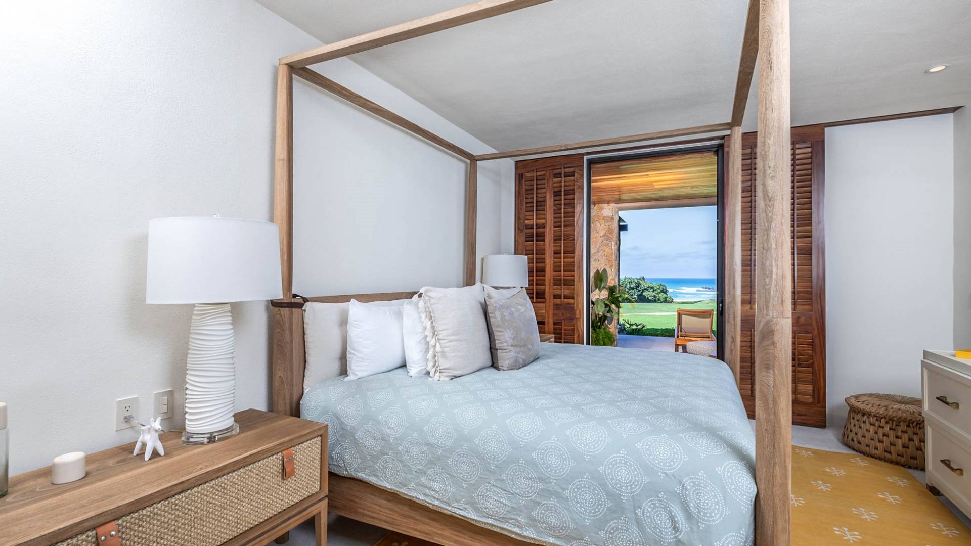 En el dormitorio 1 hay una cama King, baño privado con bañera, ducha de lluvia independiente al aire libre, tocador doble, acceso directo a la terraza, muebles de exterior. En el dormitorio 2 hay una cama tamaño King, baño privado con bañera, ducha de lluvia interior independiente, tocador doble, acceso directo a la terraza, muebles de exterior En el dormitorio 3 hay 2 camas tamaño Queen, baño privado con bañera independiente ducha de efecto lluvia y bañera de interior, tocador doble, acceso directo al balcón.