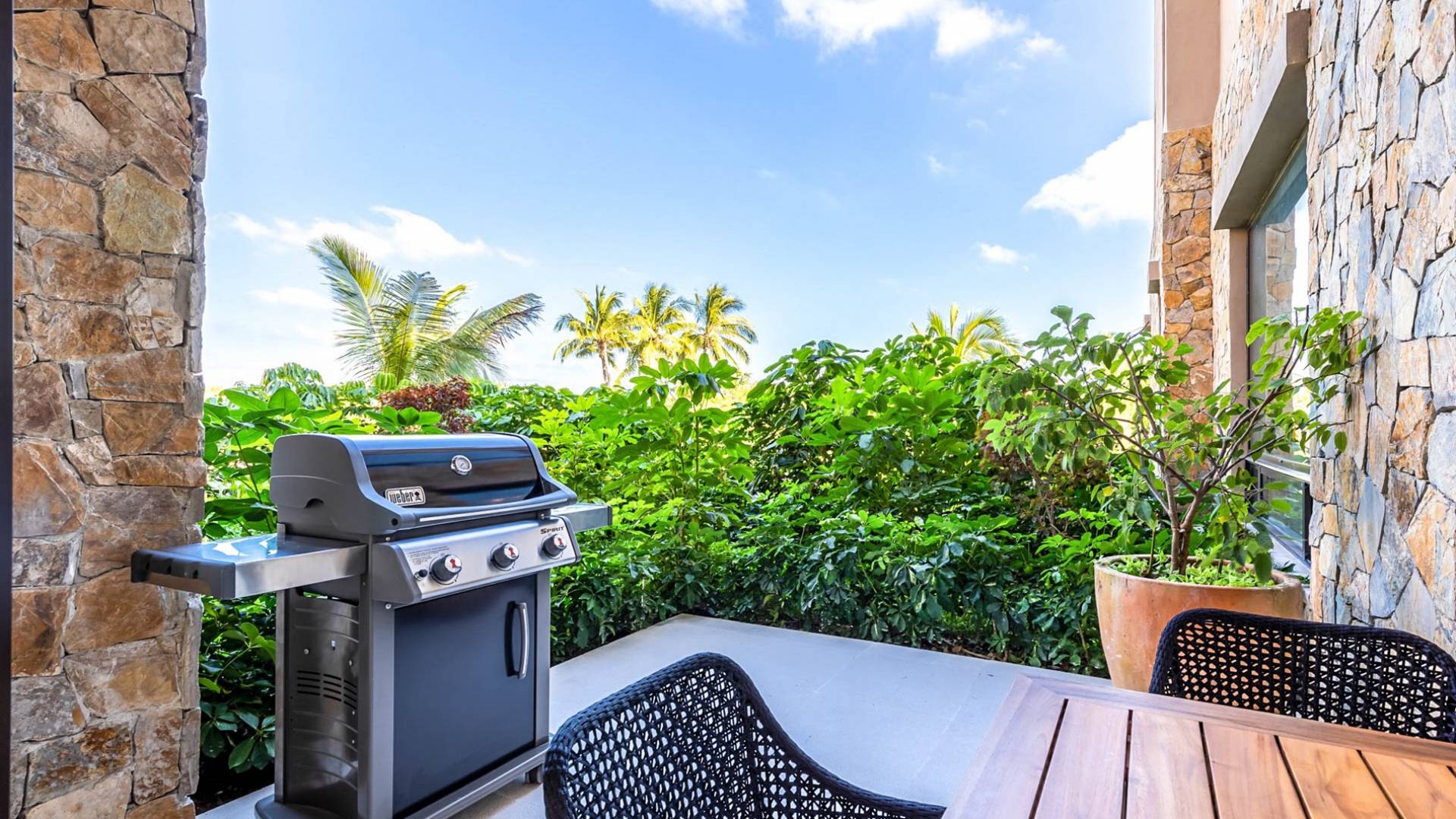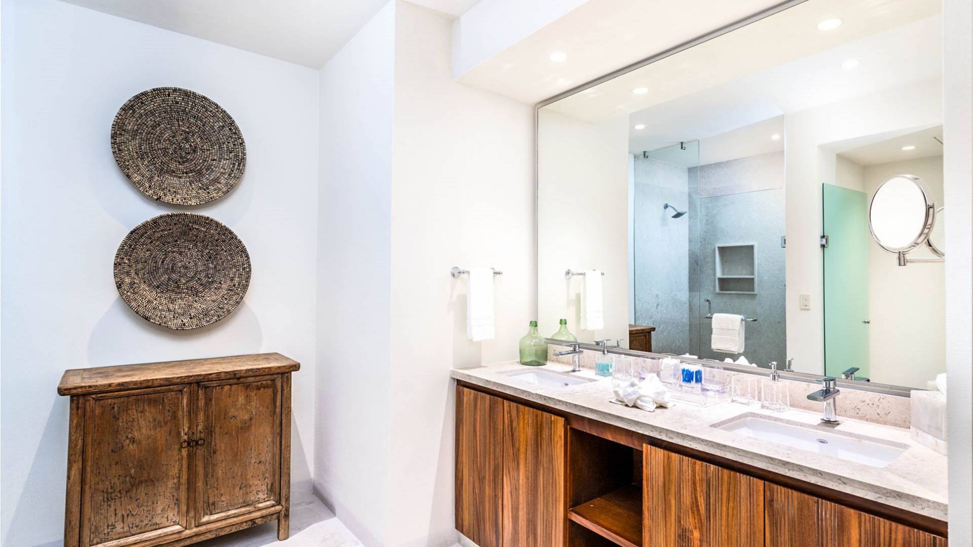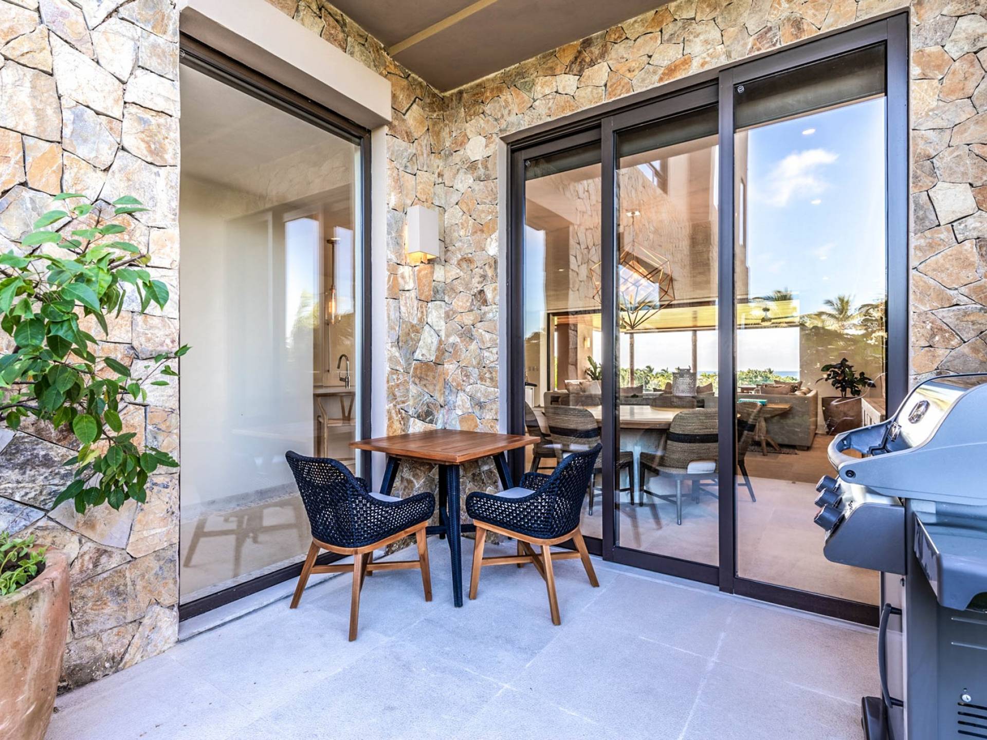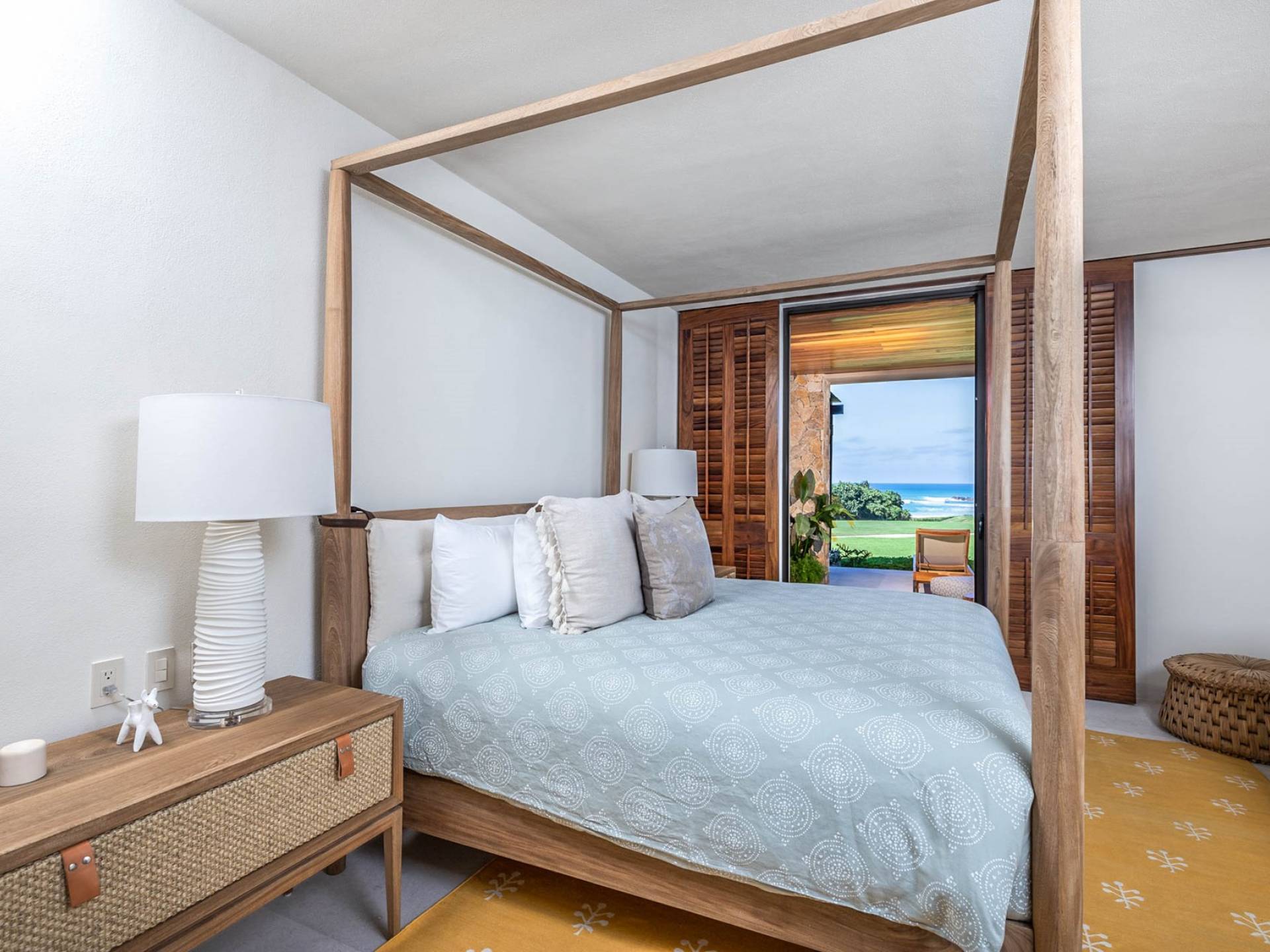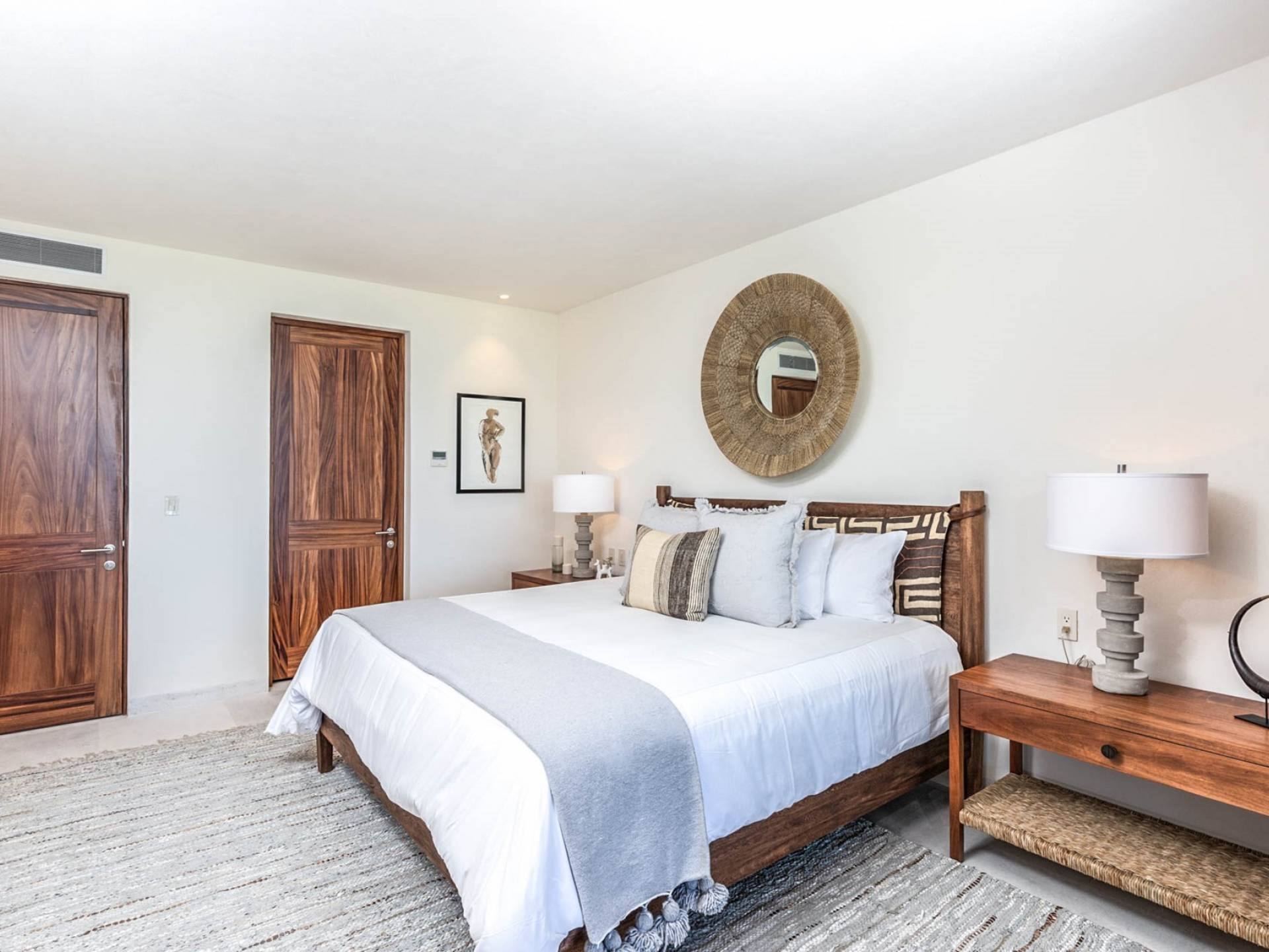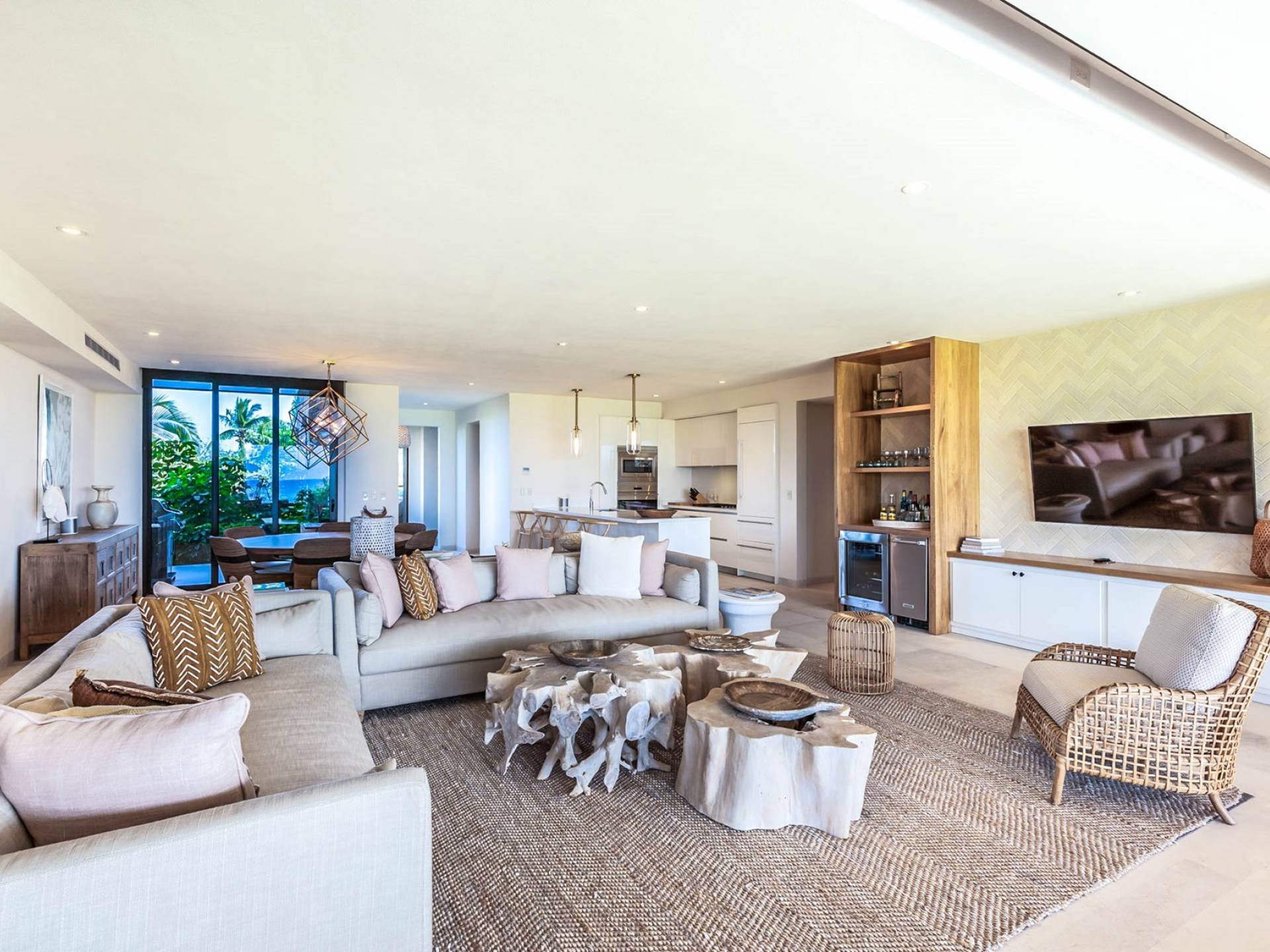 En el dormitorio 1 hay una cama King, baño privado con bañera, ducha de lluvia independiente al aire libre, tocador doble, acceso directo a la terraza, muebles de exterior. En el dormitorio 2 hay una cama tamaño King, baño privado con bañera, ducha de lluvia interior independiente, tocador doble, acceso directo a la terraza, muebles de exterior En el dormitorio 3 hay 2 camas tamaño Queen, baño privado con bañera independiente ducha de efecto lluvia y bañera de interior, tocador doble, acceso directo al balcón.
