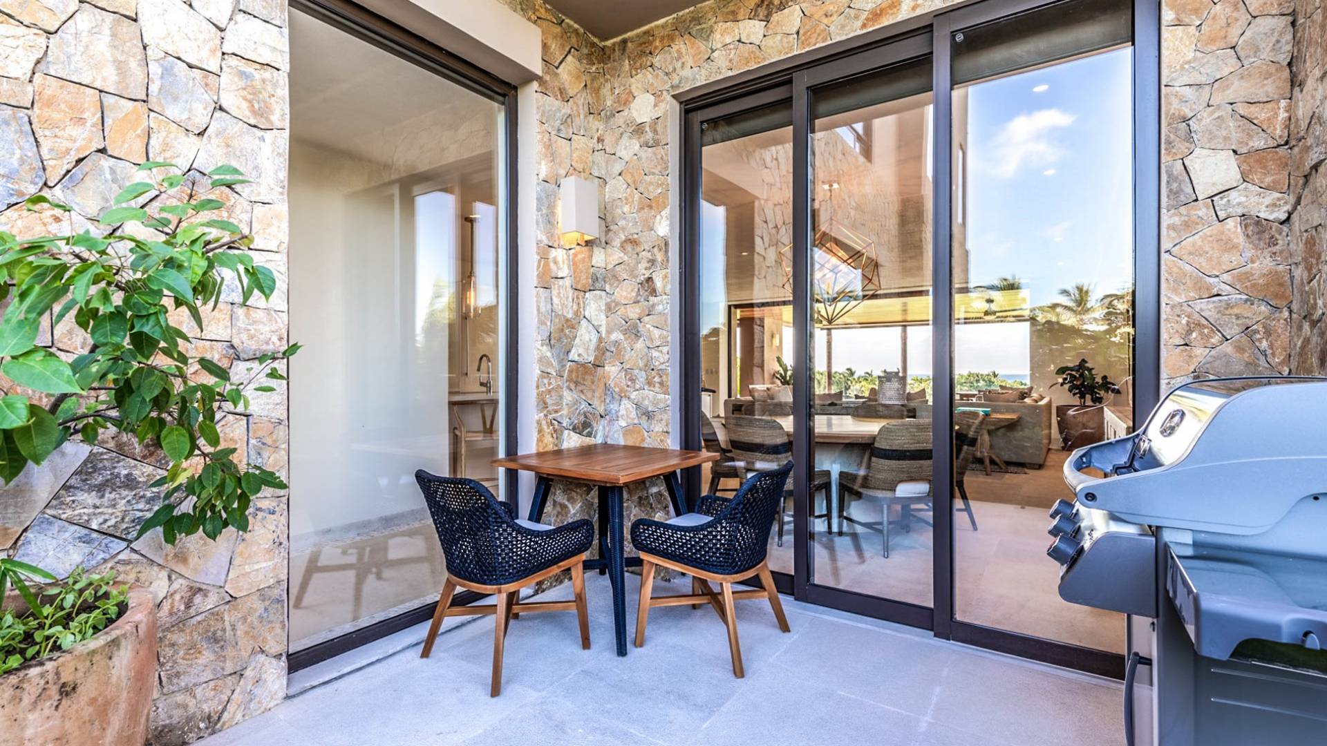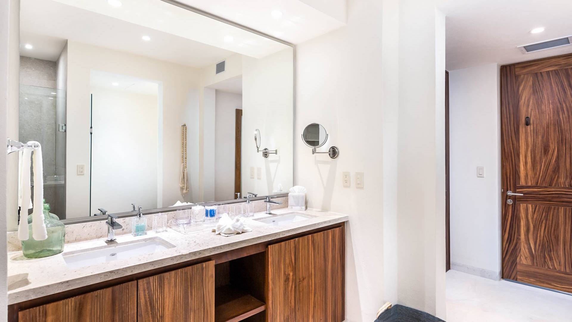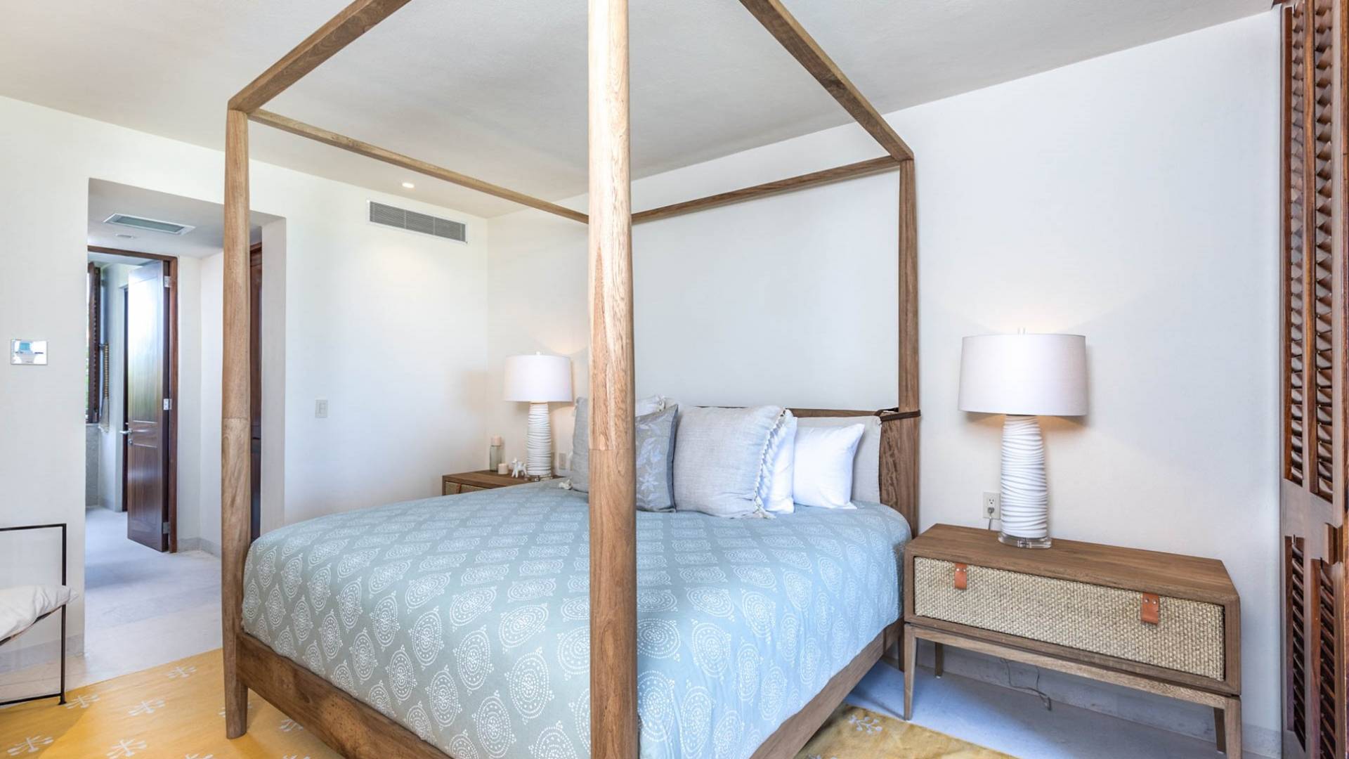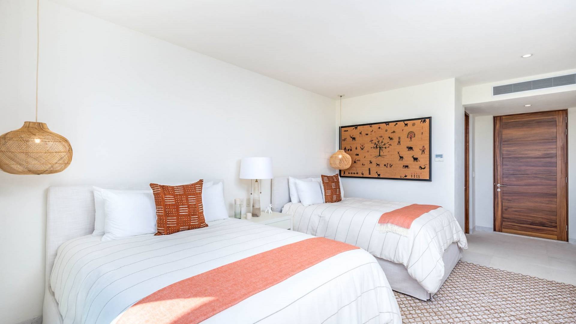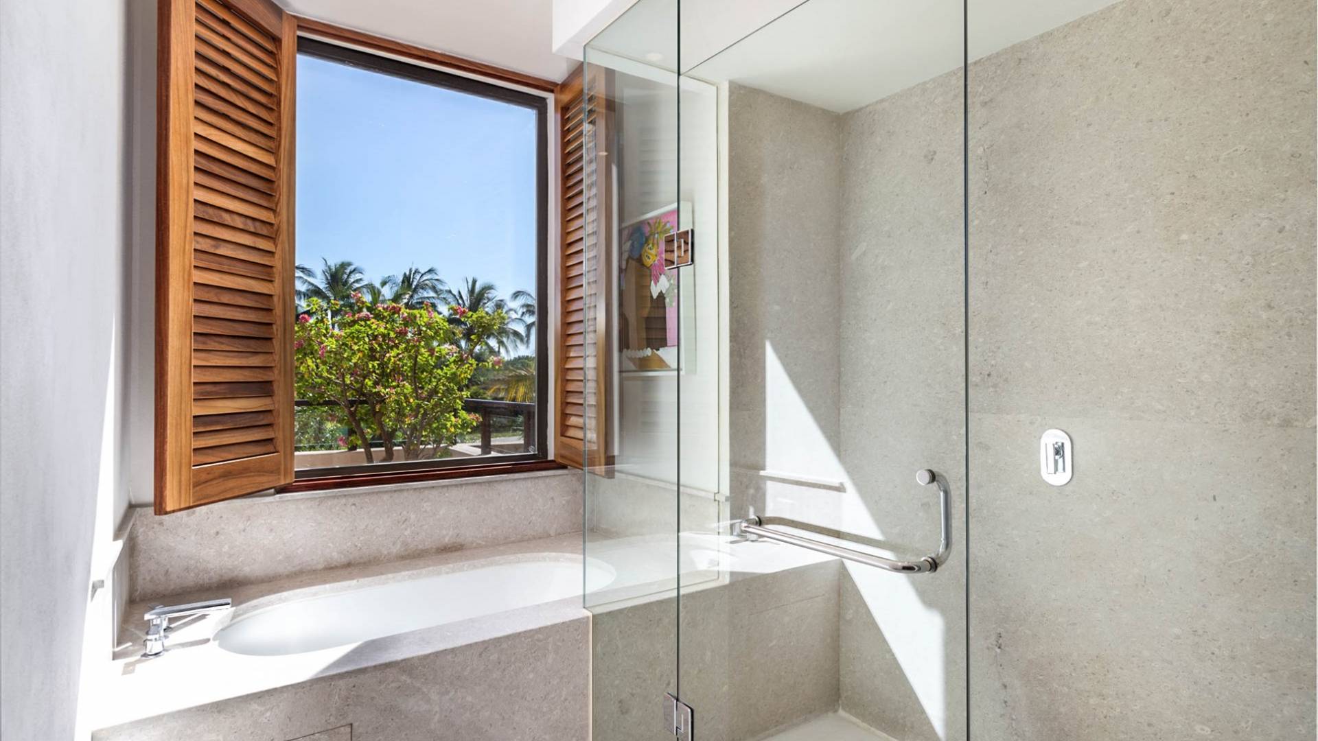 En el dormitorio 1 hay una cama King, baño privado con bañera, ducha de lluvia independiente al aire libre, tocador doble, acceso directo a la terraza, muebles de exterior. En el dormitorio 2 hay una cama tamaño King, baño privado con bañera, ducha de lluvia interior independiente, tocador doble, acceso directo a la terraza, muebles de exterior En el dormitorio 3 hay 2 camas tamaño Queen, baño privado con bañera independiente ducha de efecto lluvia y bañera de interior, tocador doble, acceso directo al balcón.