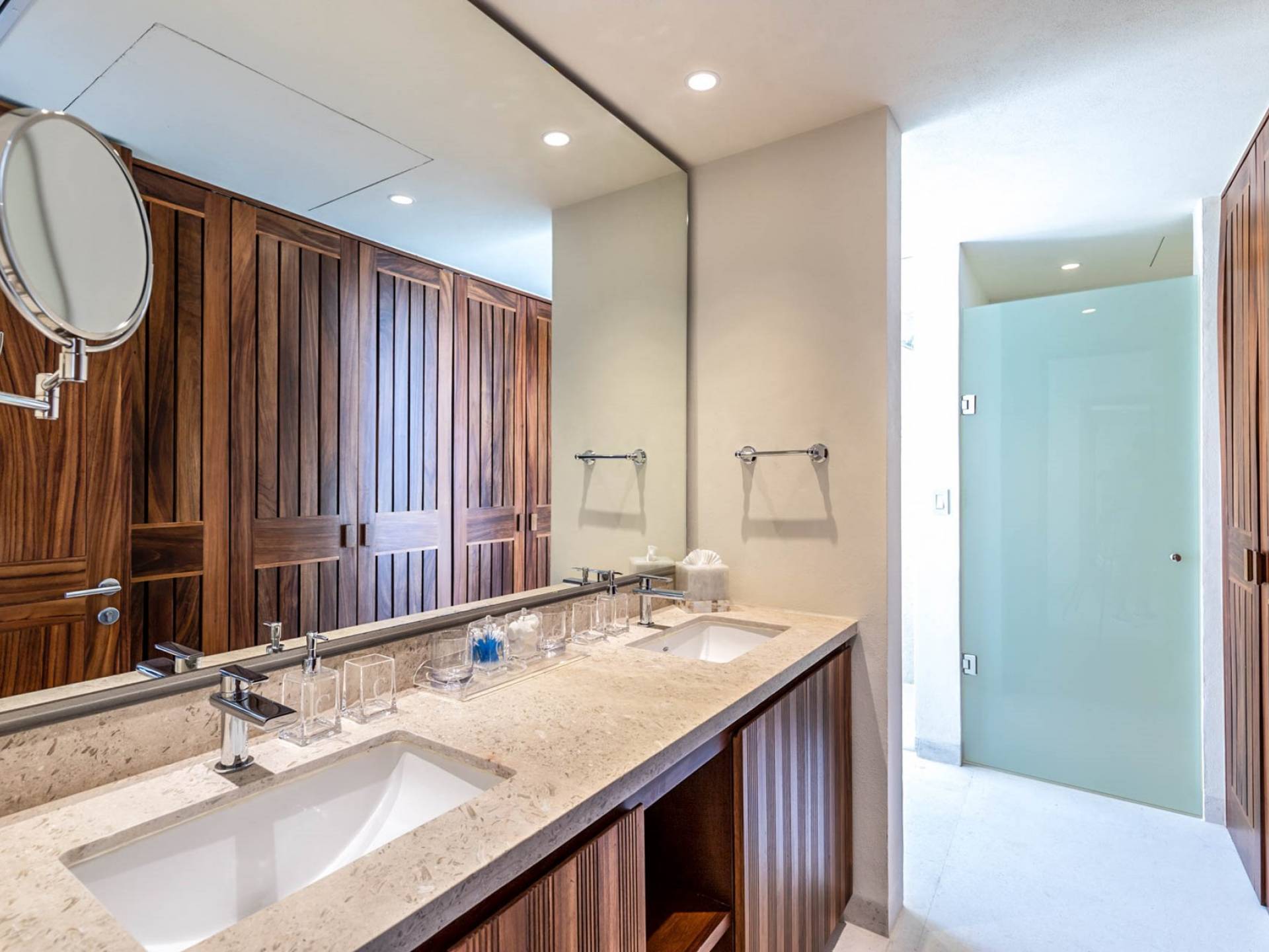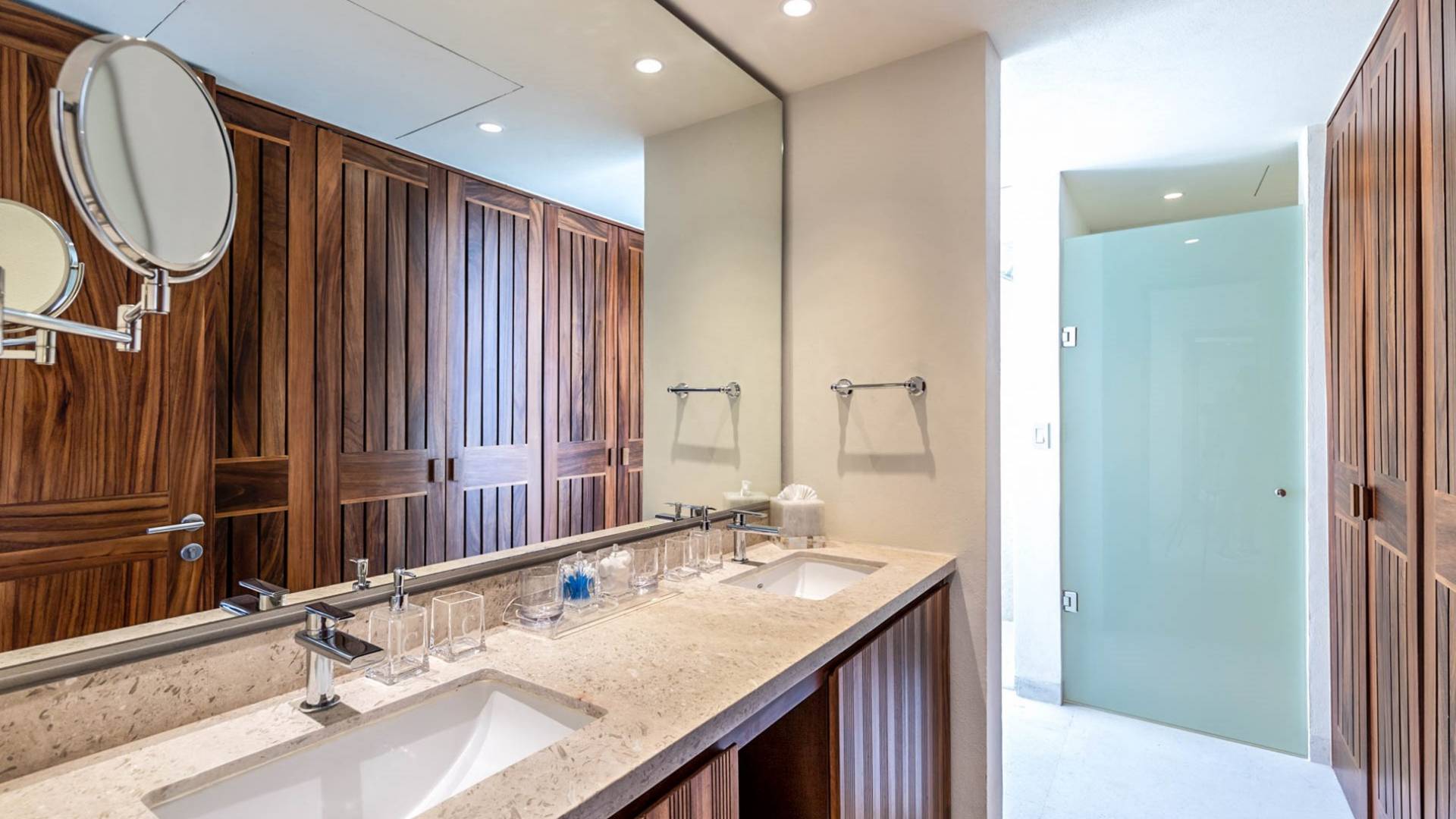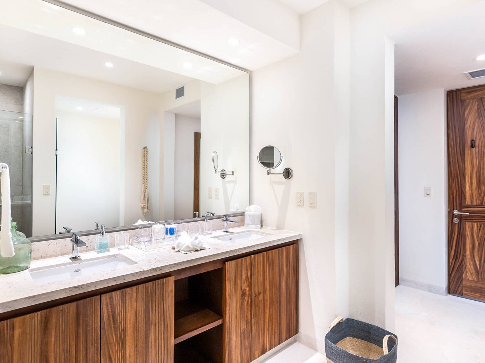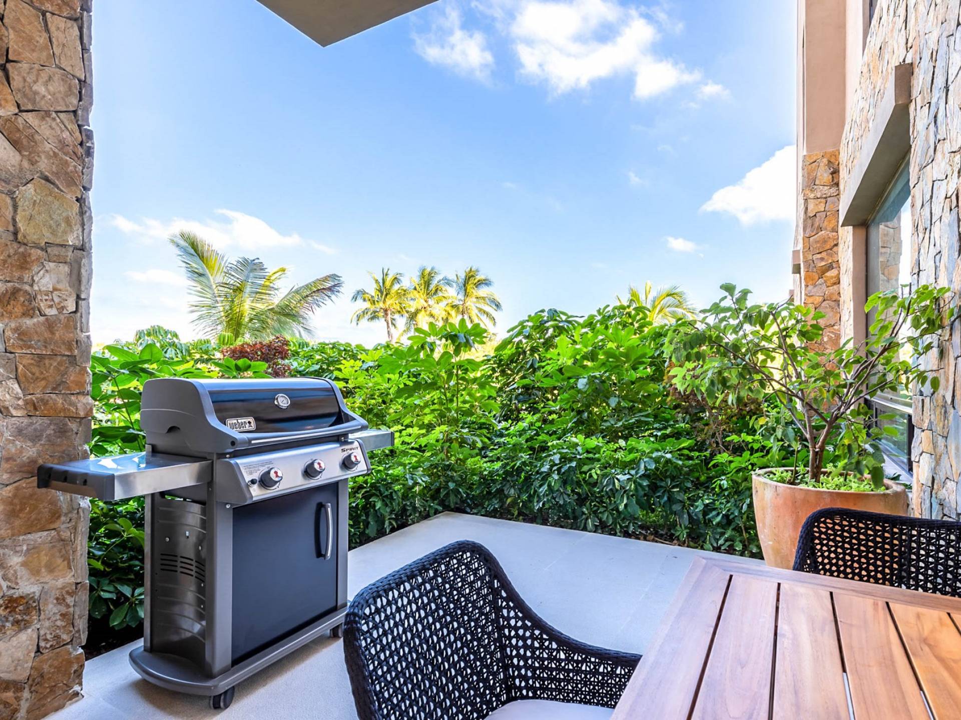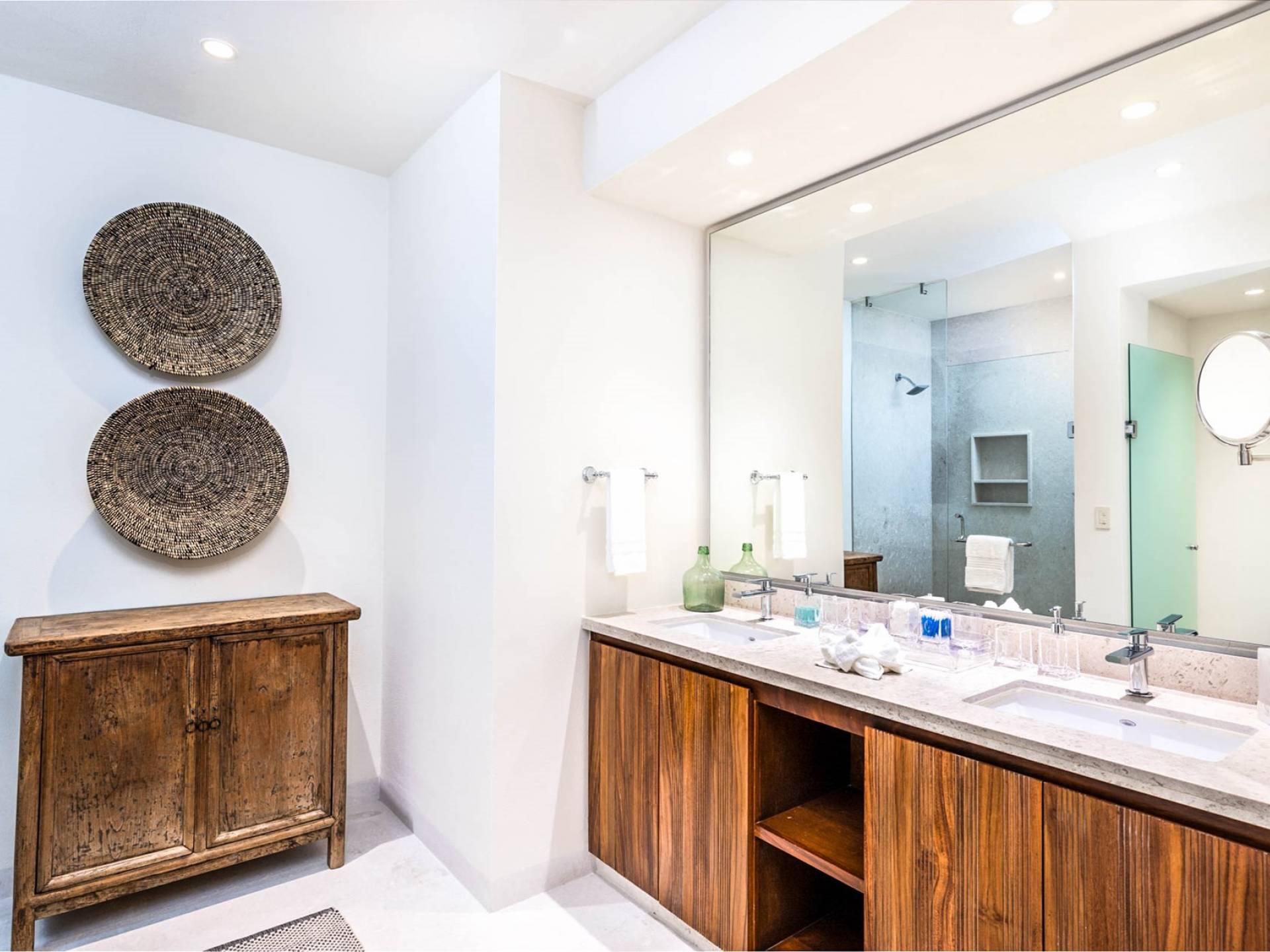 En el dormitorio 1 hay una cama King, baño privado con bañera, ducha de lluvia independiente al aire libre, tocador doble, acceso directo a la terraza, muebles de exterior. En el dormitorio 2 hay una cama tamaño King, baño privado con bañera, ducha de lluvia interior independiente, tocador doble, acceso directo a la terraza, muebles de exterior En el dormitorio 3 hay 2 camas tamaño Queen, baño privado con bañera independiente ducha de efecto lluvia y bañera de interior, tocador doble, acceso directo al balcón.