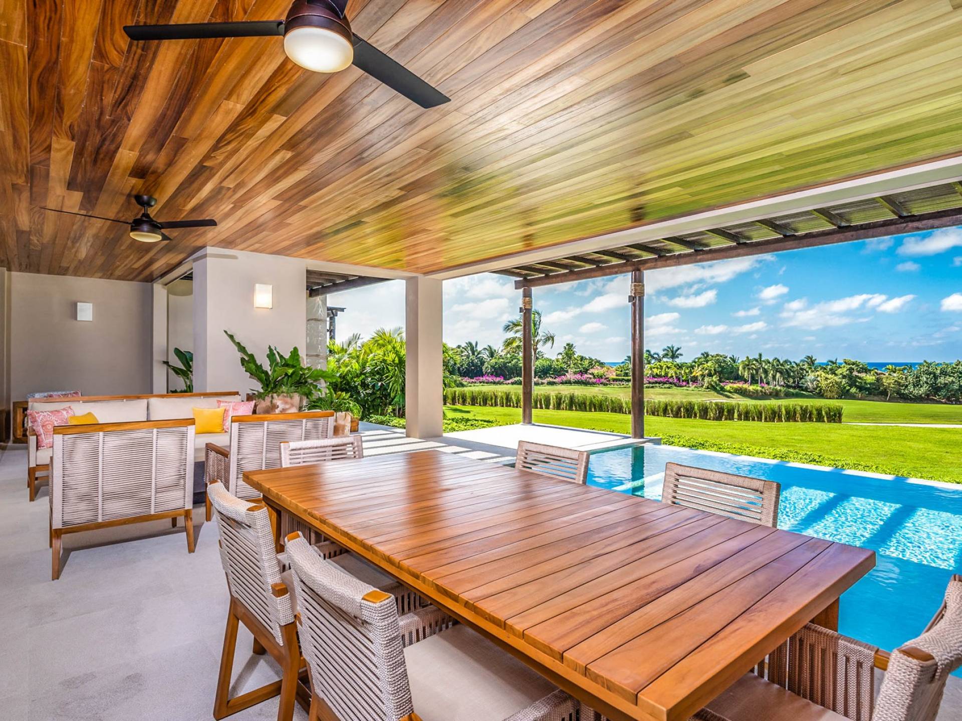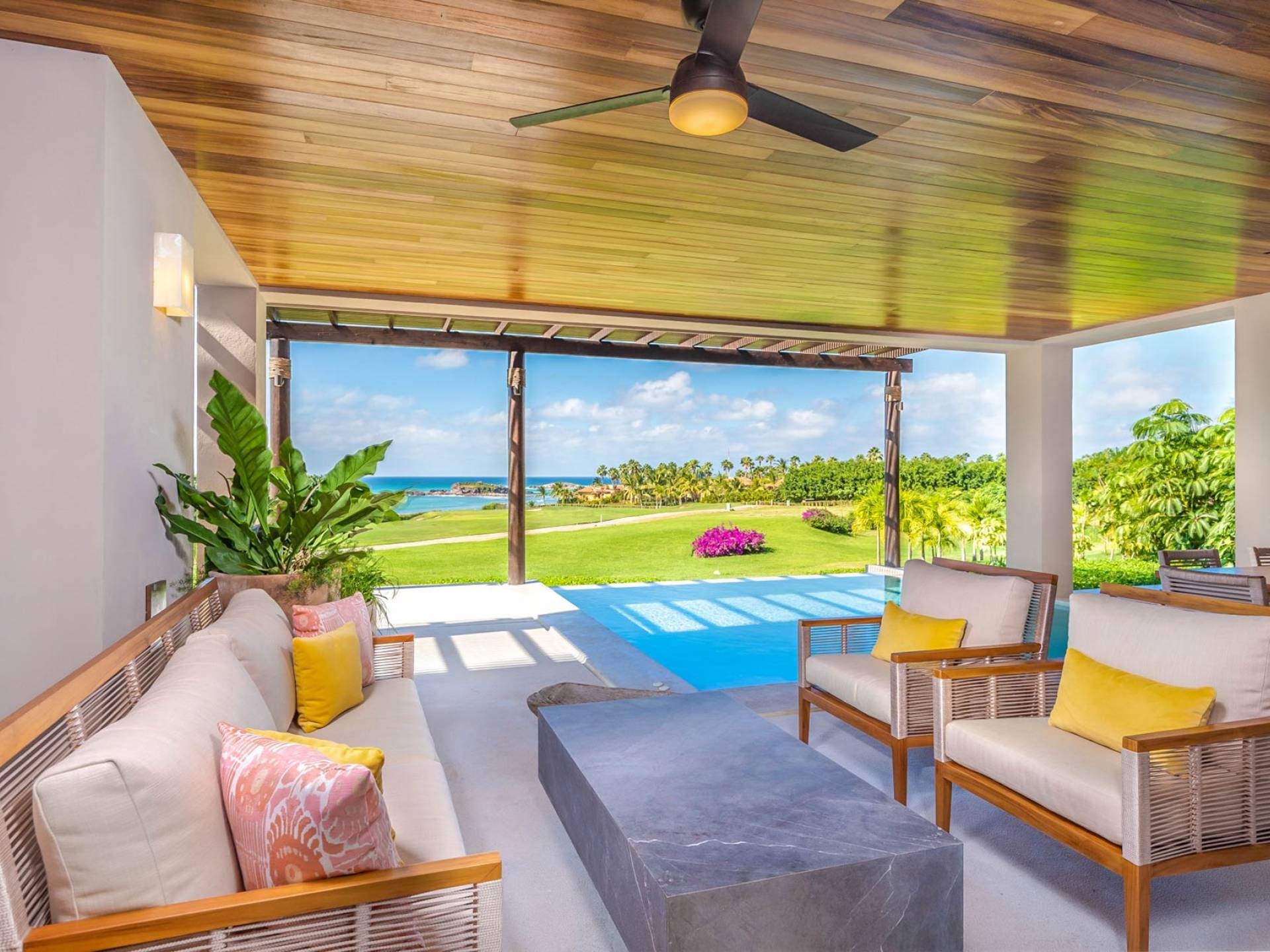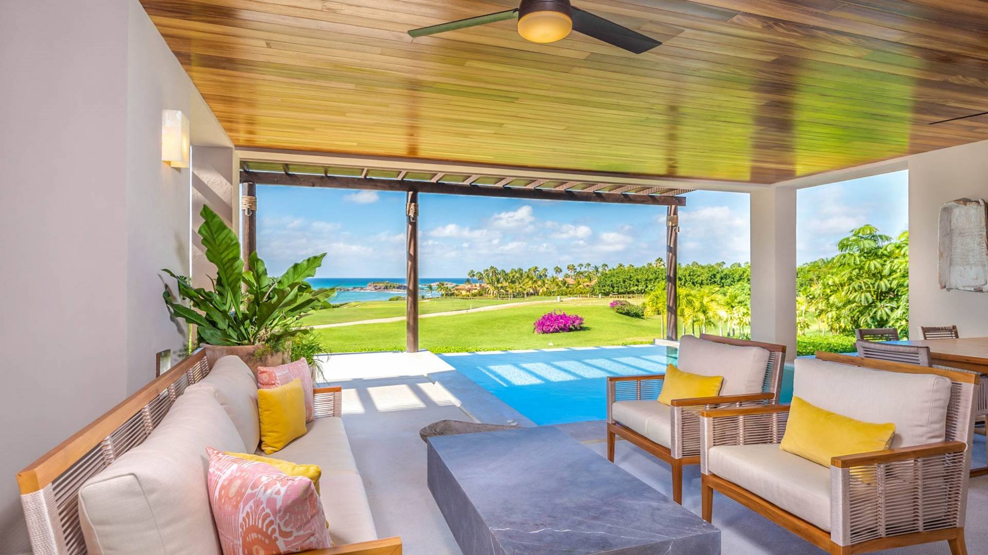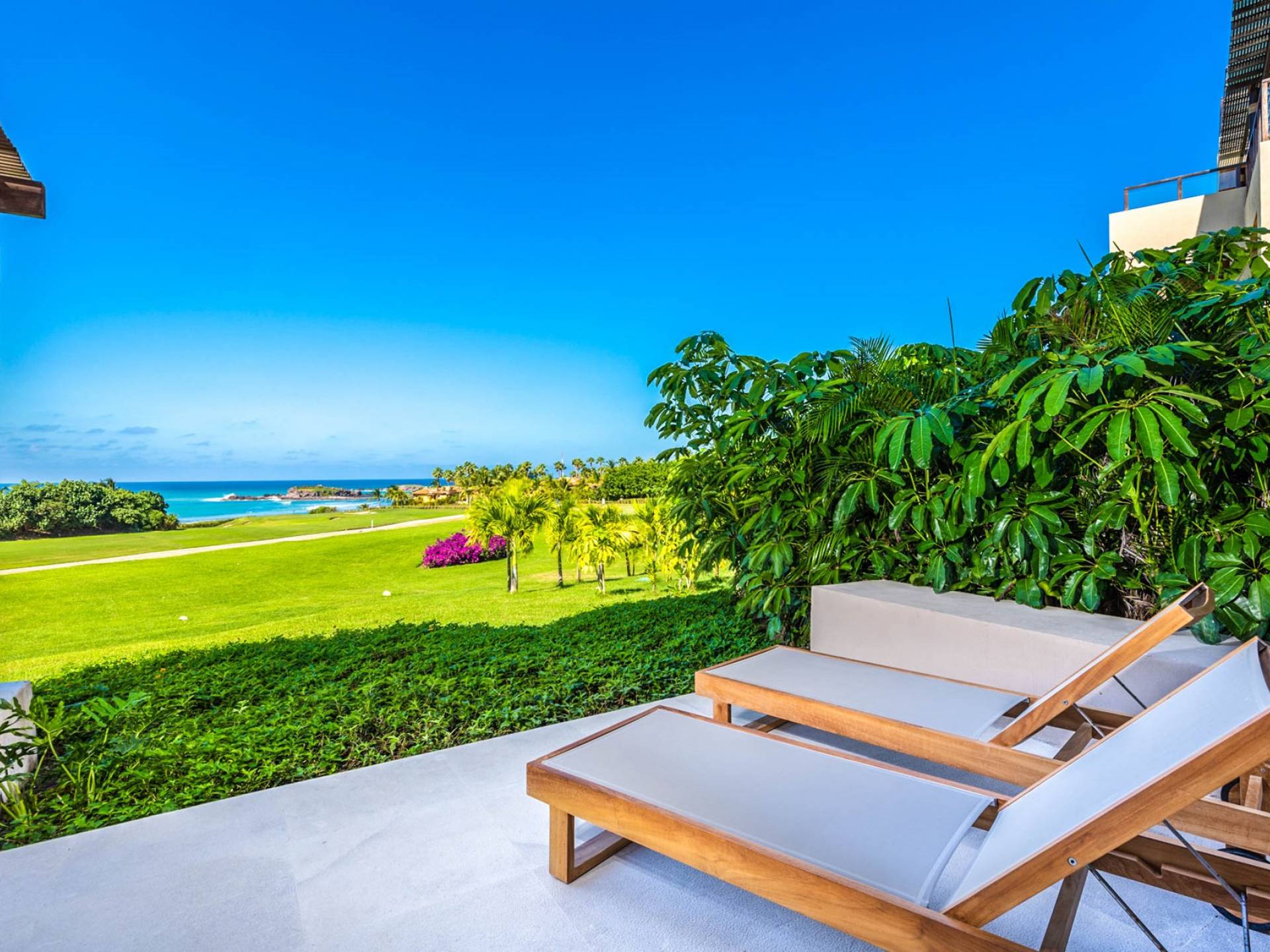 Cocina totalmente equipada, comedor interior formal con capacidad para 6 personas, lavavajillas, Wi-Fi, Smart TV con Netflix, aire acondicionado, lavadora/secadora, plancha/tabla de planchar. Vista al mar, vista al campo de golf, piscina: calefacción incluida, tumbonas, muebles de exterior, comedor al aire libre con capacidad para 6 personas, sala de estar al aire libre, garaje: 1 espacio, complejo privado.