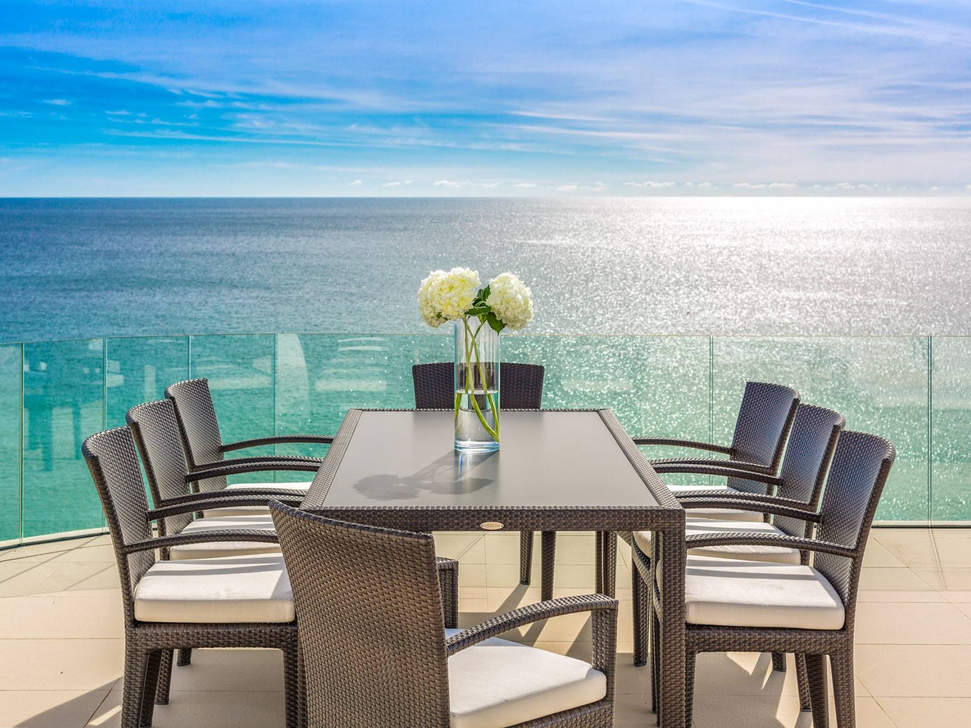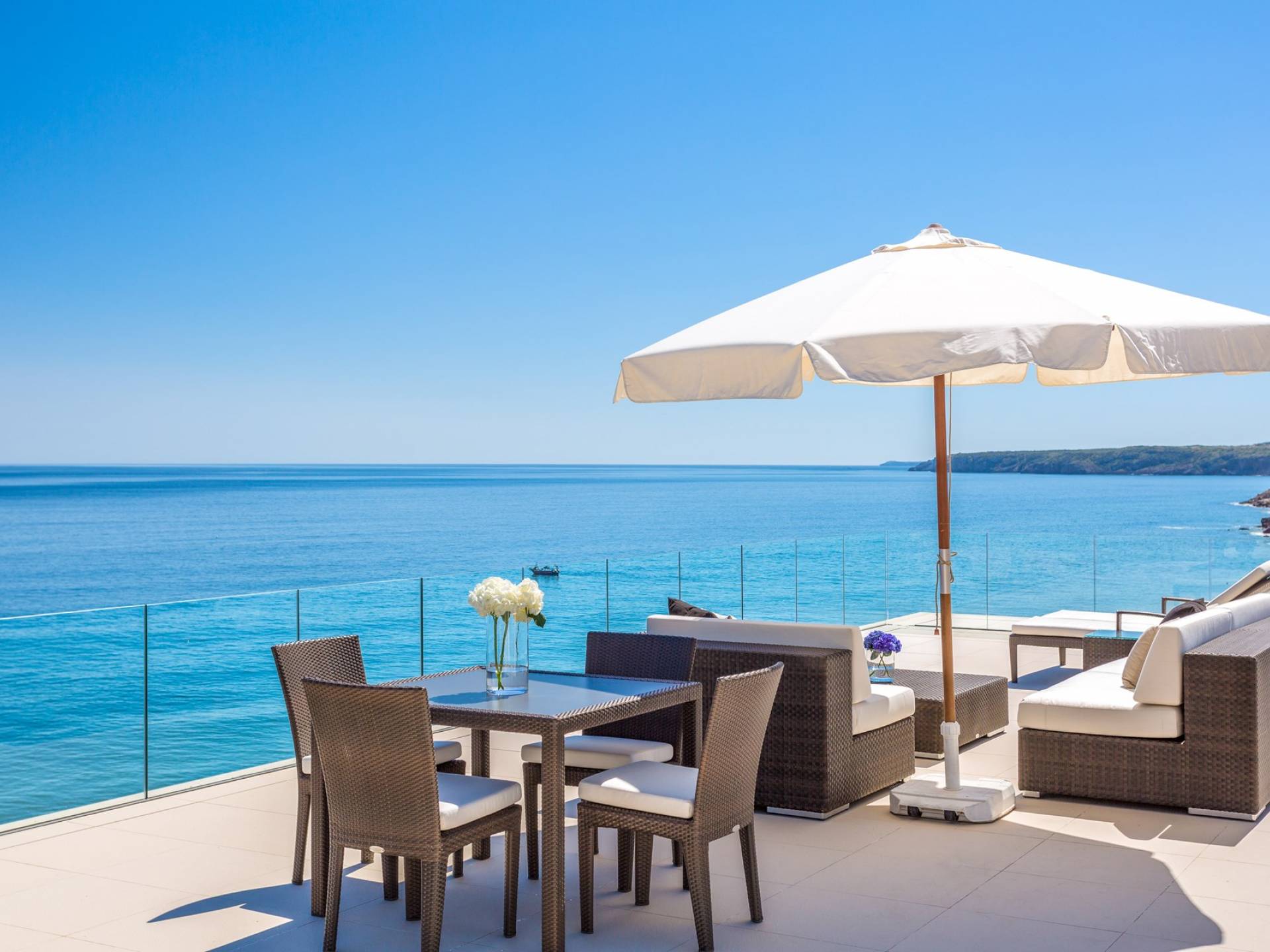 Finalmente, pasando a la terraza de la azotea, hay una piscina infinita privada con vista a la costa con terraza y sombrillas completamente amuebladas, lo que permite la vida al aire libre y el entretenimiento.