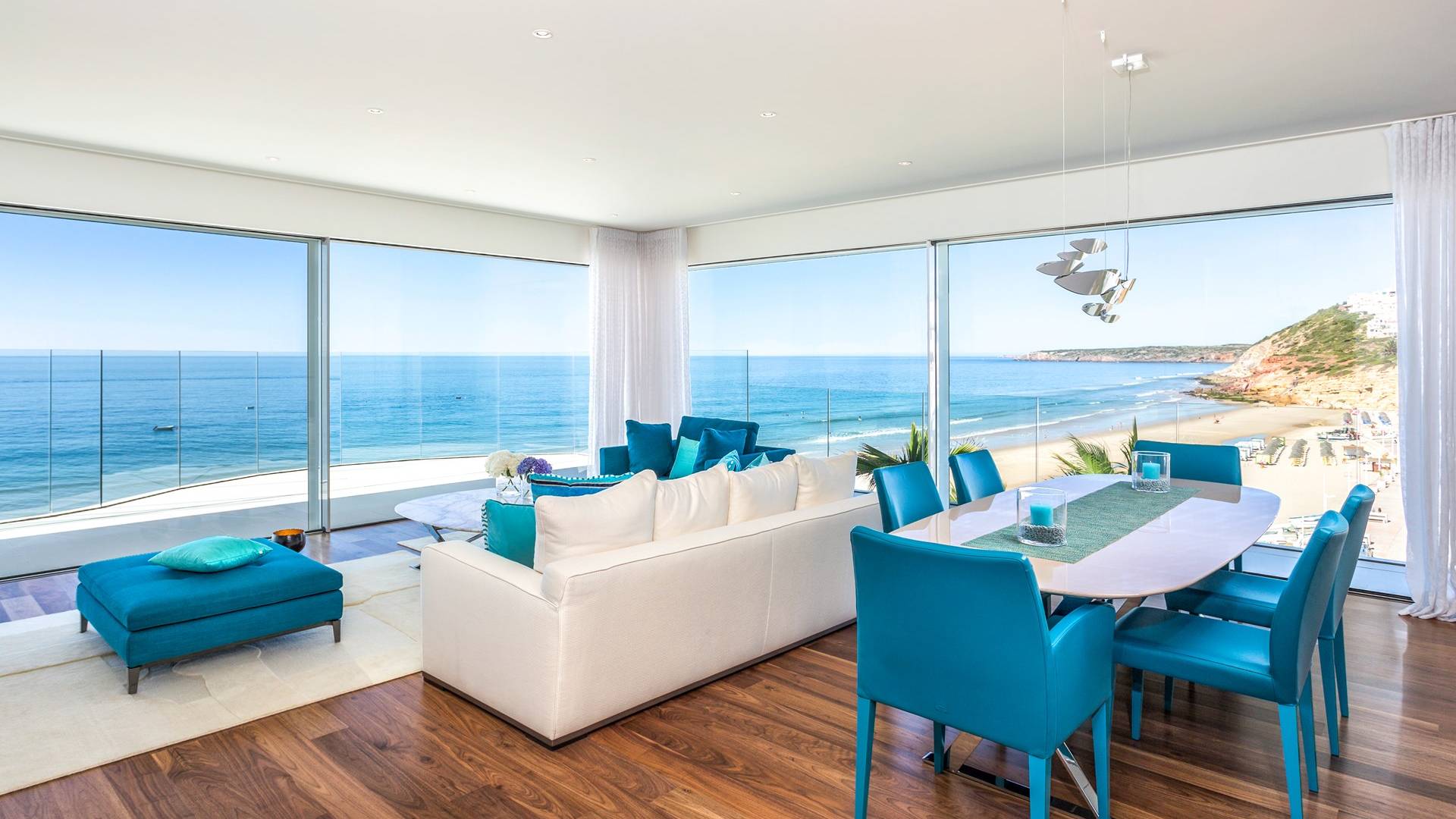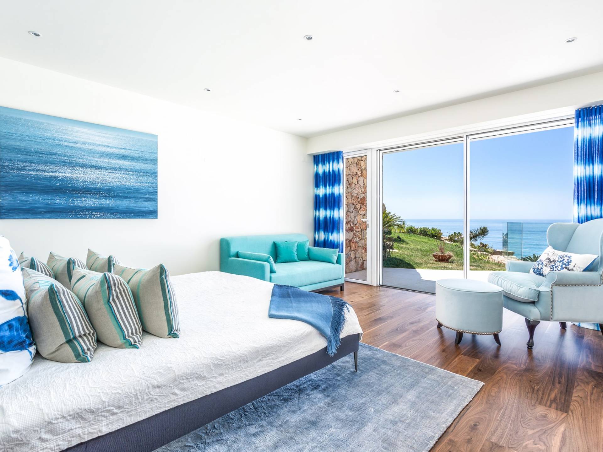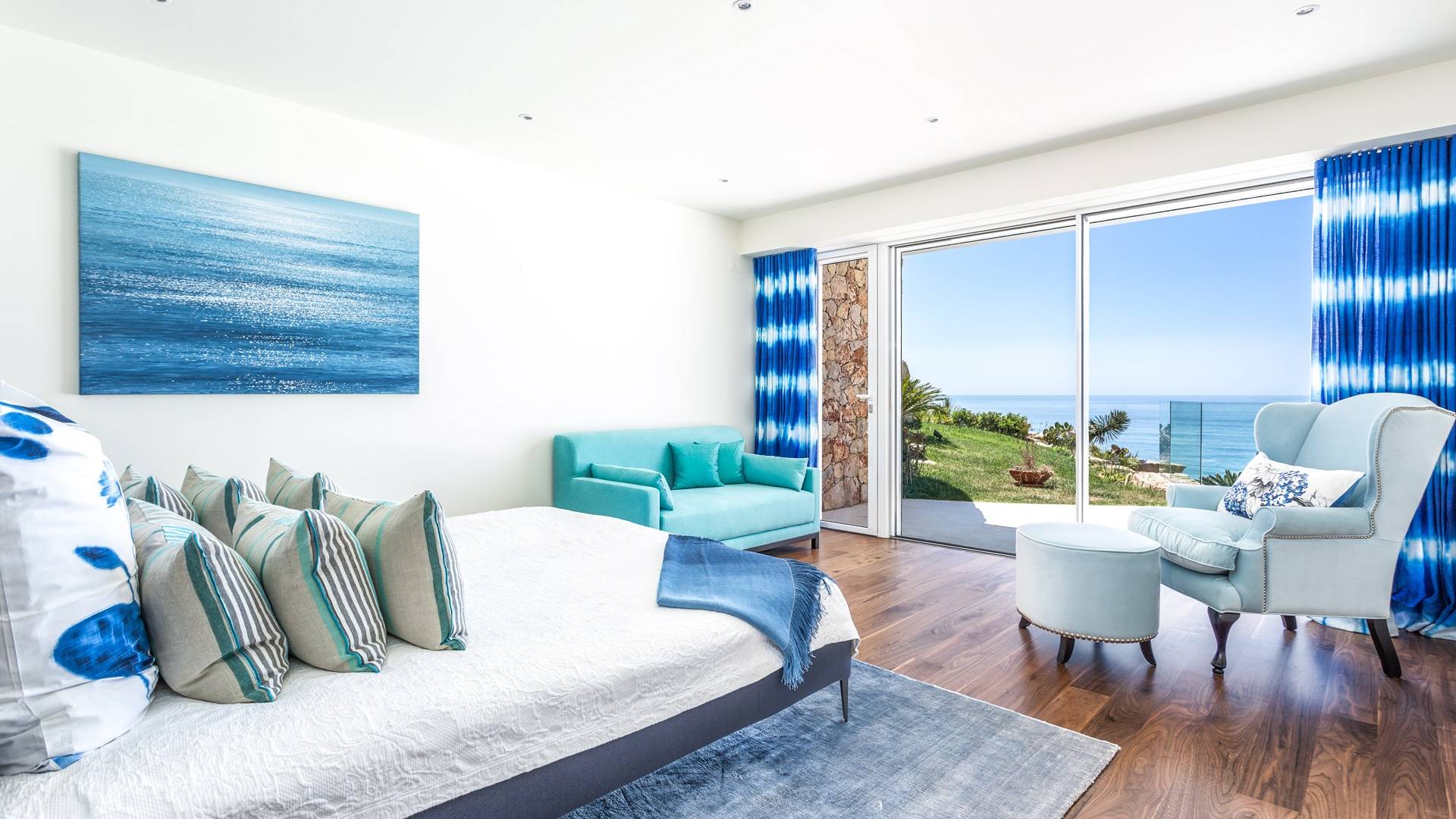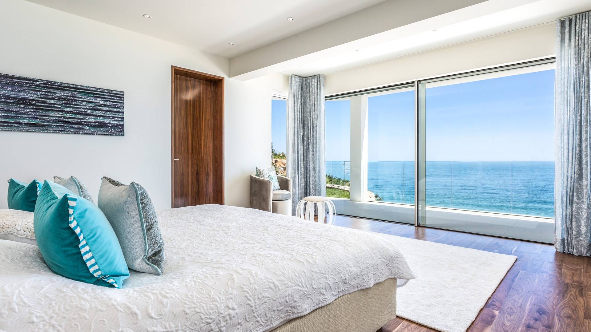 Villa Alegria Algarve consta de 4 dormitorios, amplias puertas corredizas de vidrio que conducen directamente a terrazas, jardines y una piscina privada en la azotea con vista al océano infinito, está decorada en un estilo mediterráneo limpio y contemporáneo, en llamativos blancos, azules, y lilas, con amplias zonas de estar y abundante luz natural que entra por las ventanas.