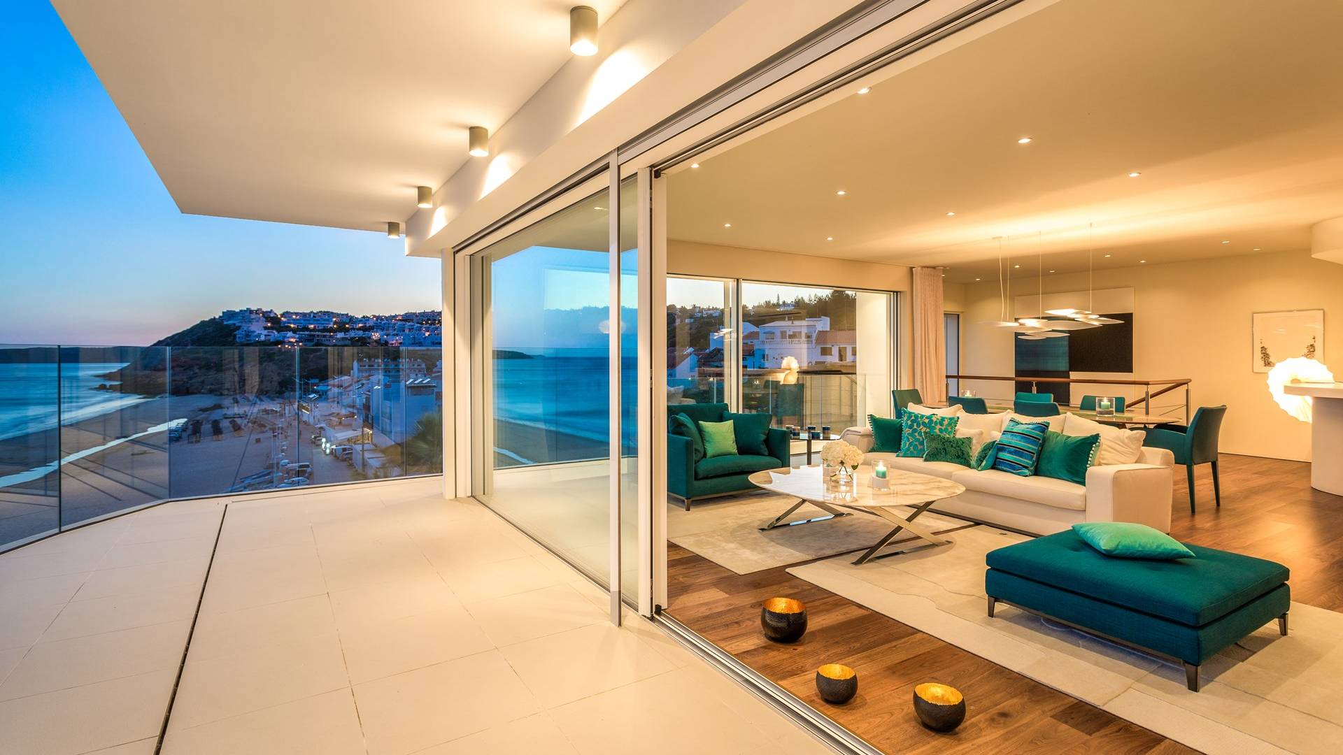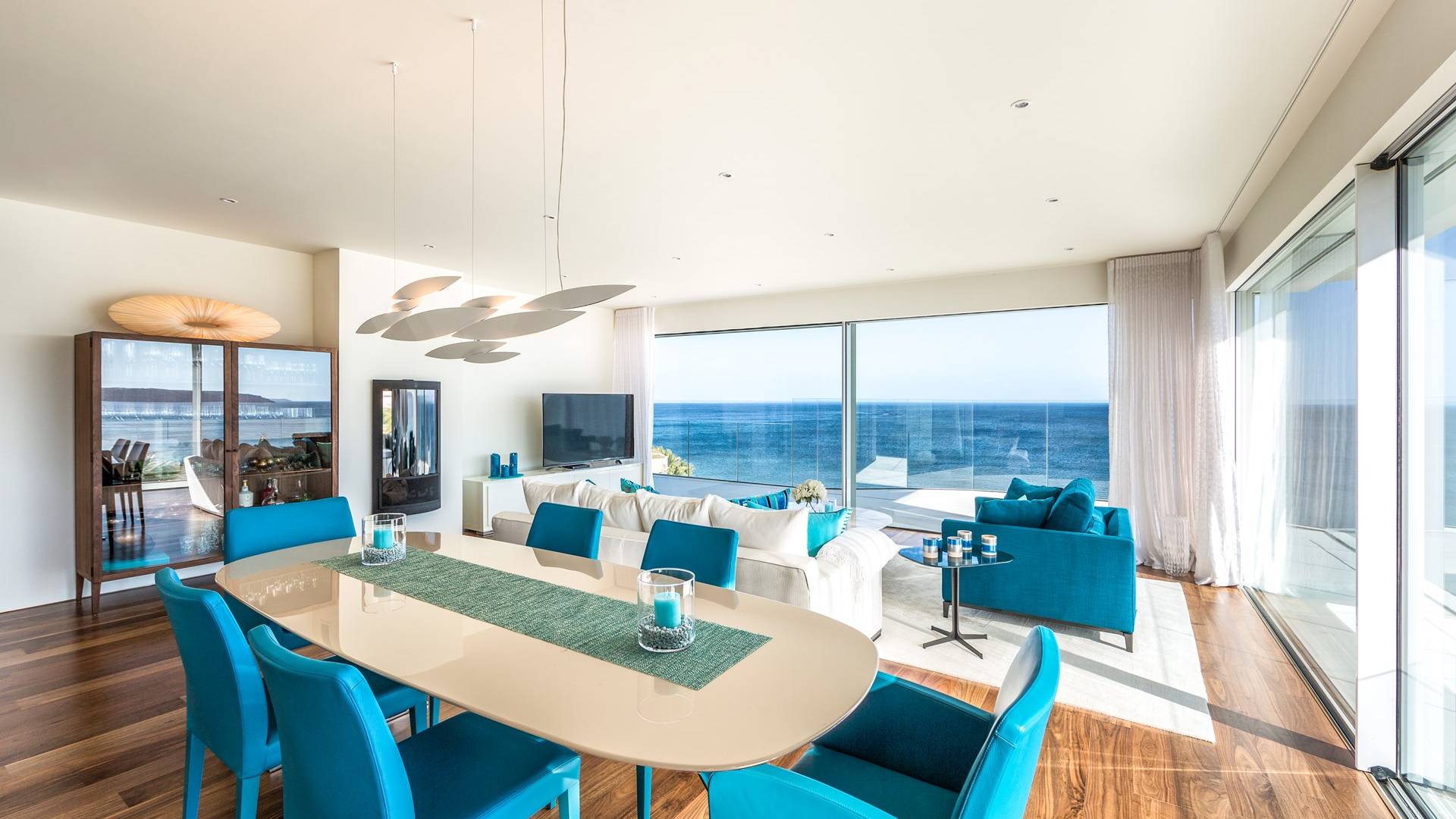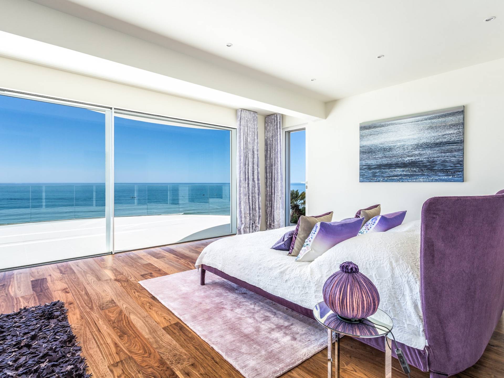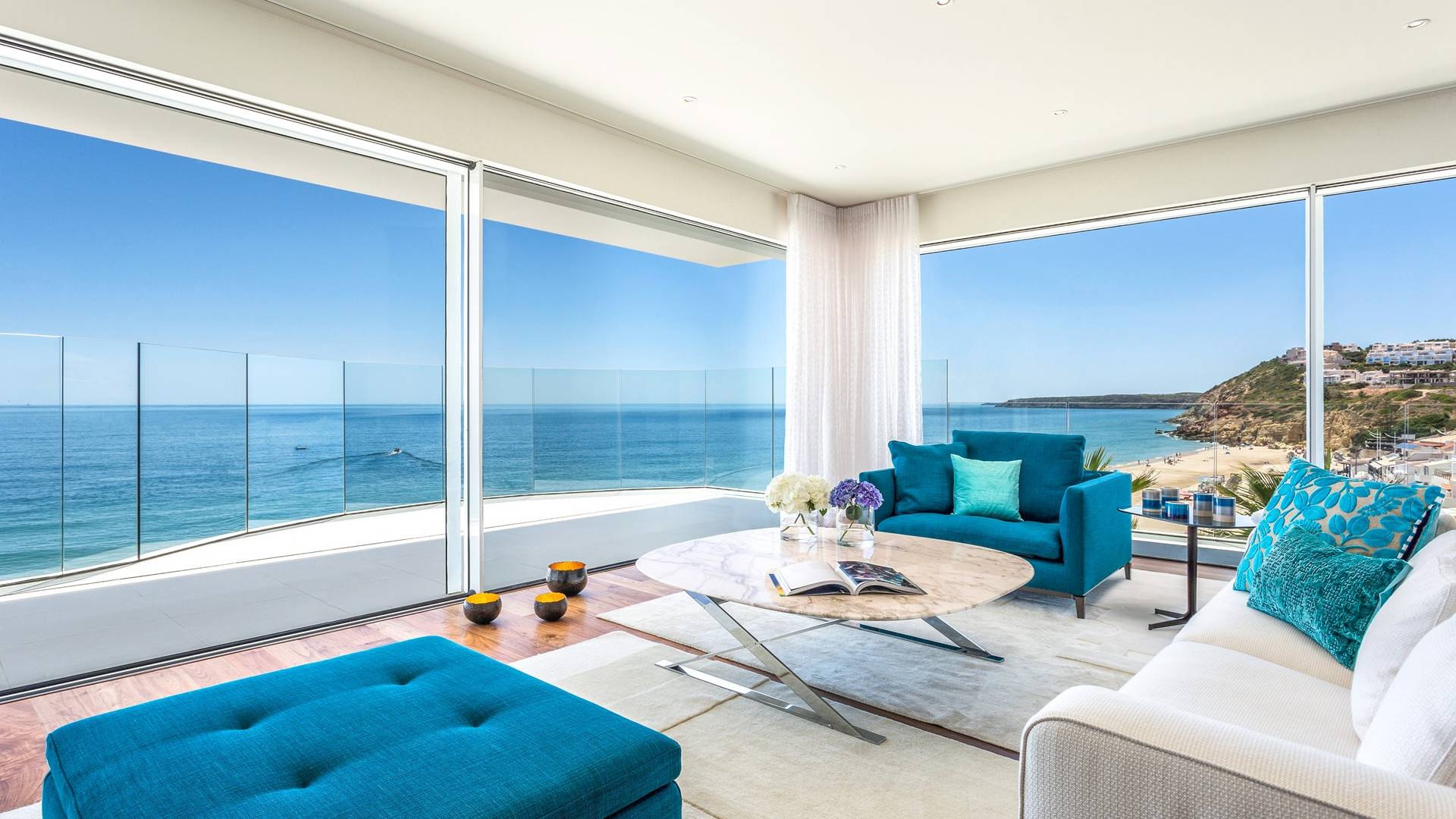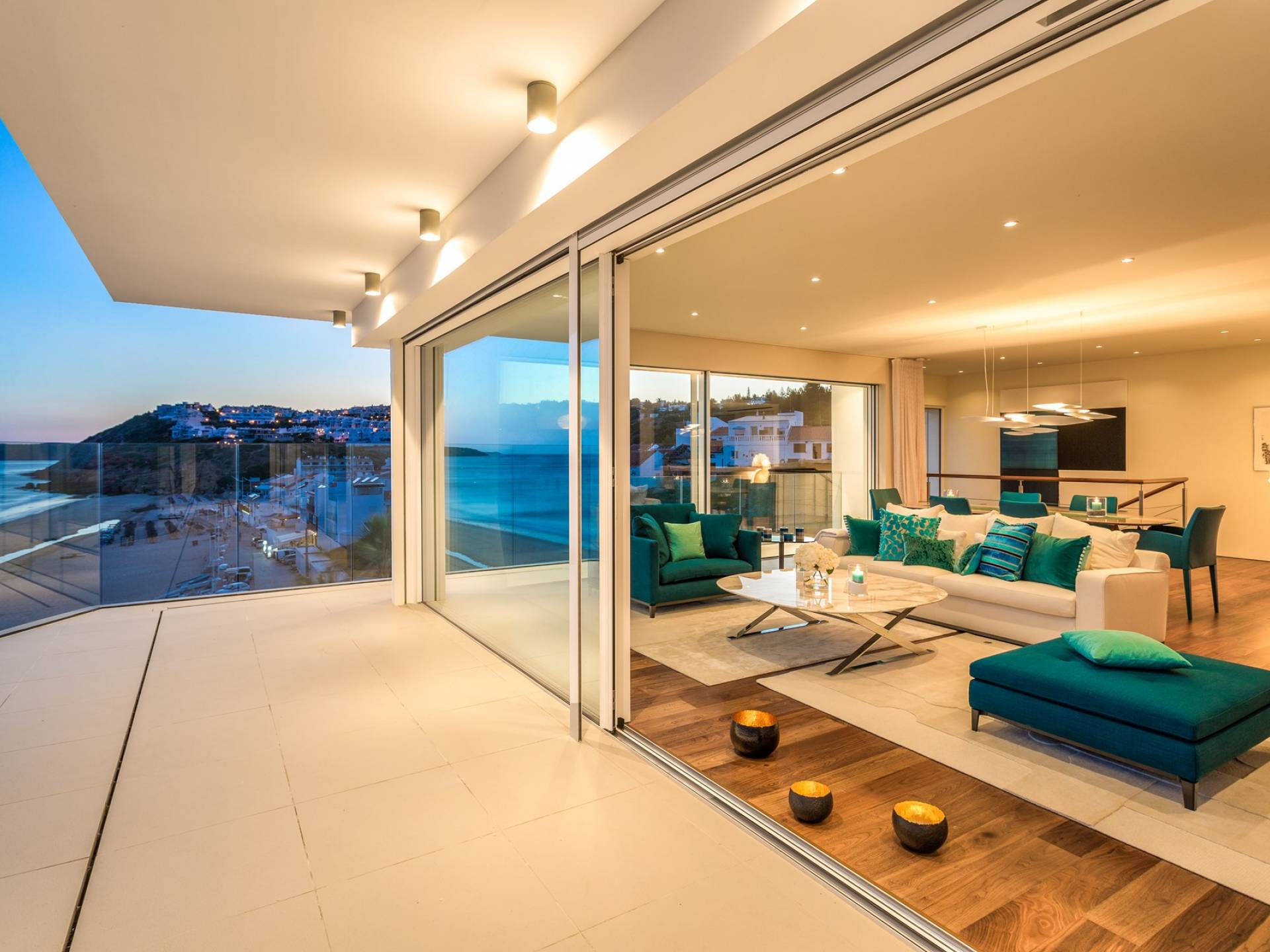 Villa Alegria Algarve consta de 4 dormitorios, amplias puertas corredizas de vidrio que conducen directamente a terrazas, jardines y una piscina privada en la azotea con vista al océano infinito, está decorada en un estilo mediterráneo limpio y contemporáneo, en llamativos blancos, azules, y lilas, con amplias zonas de estar y abundante luz natural que entra por las ventanas.
