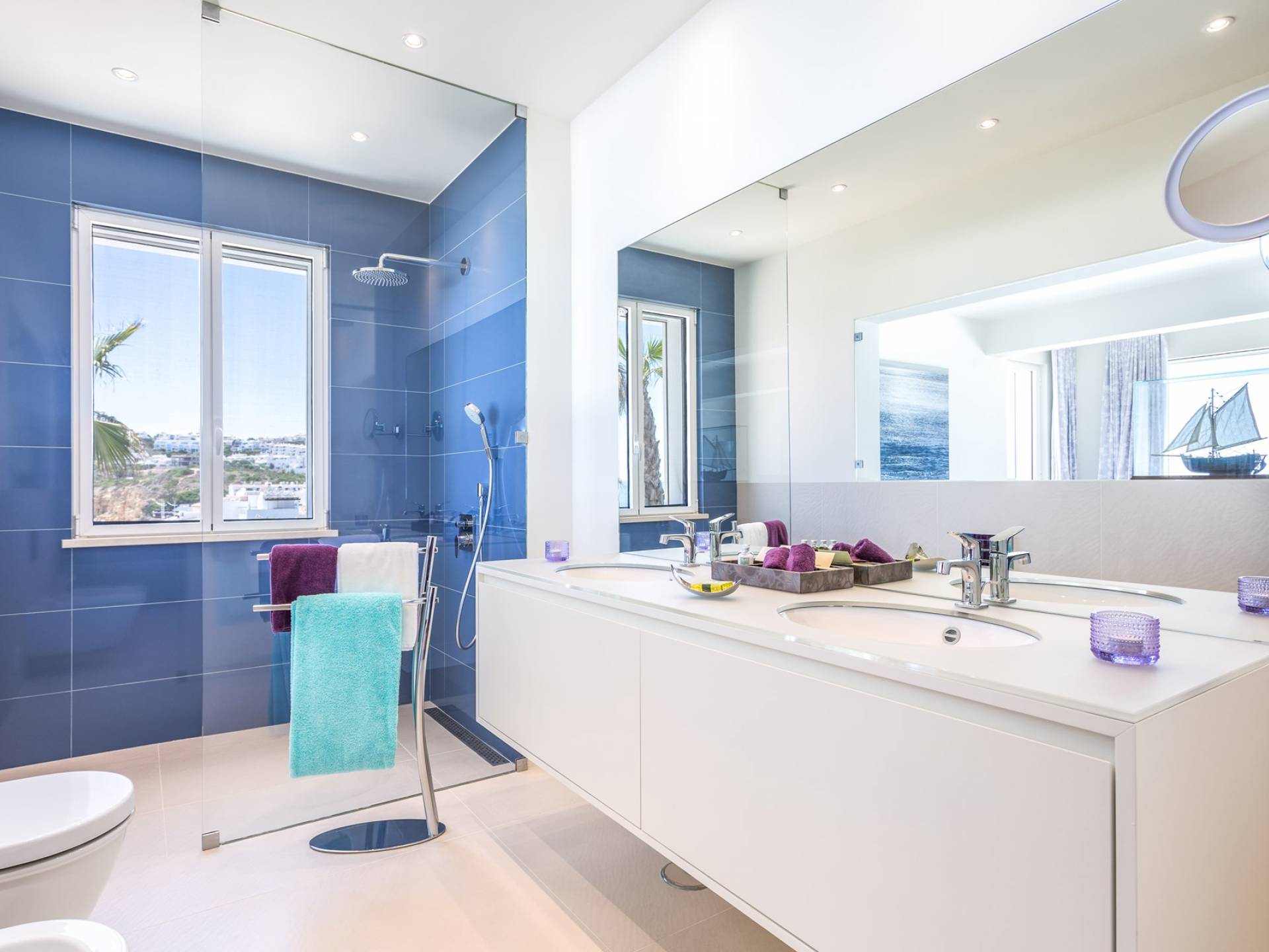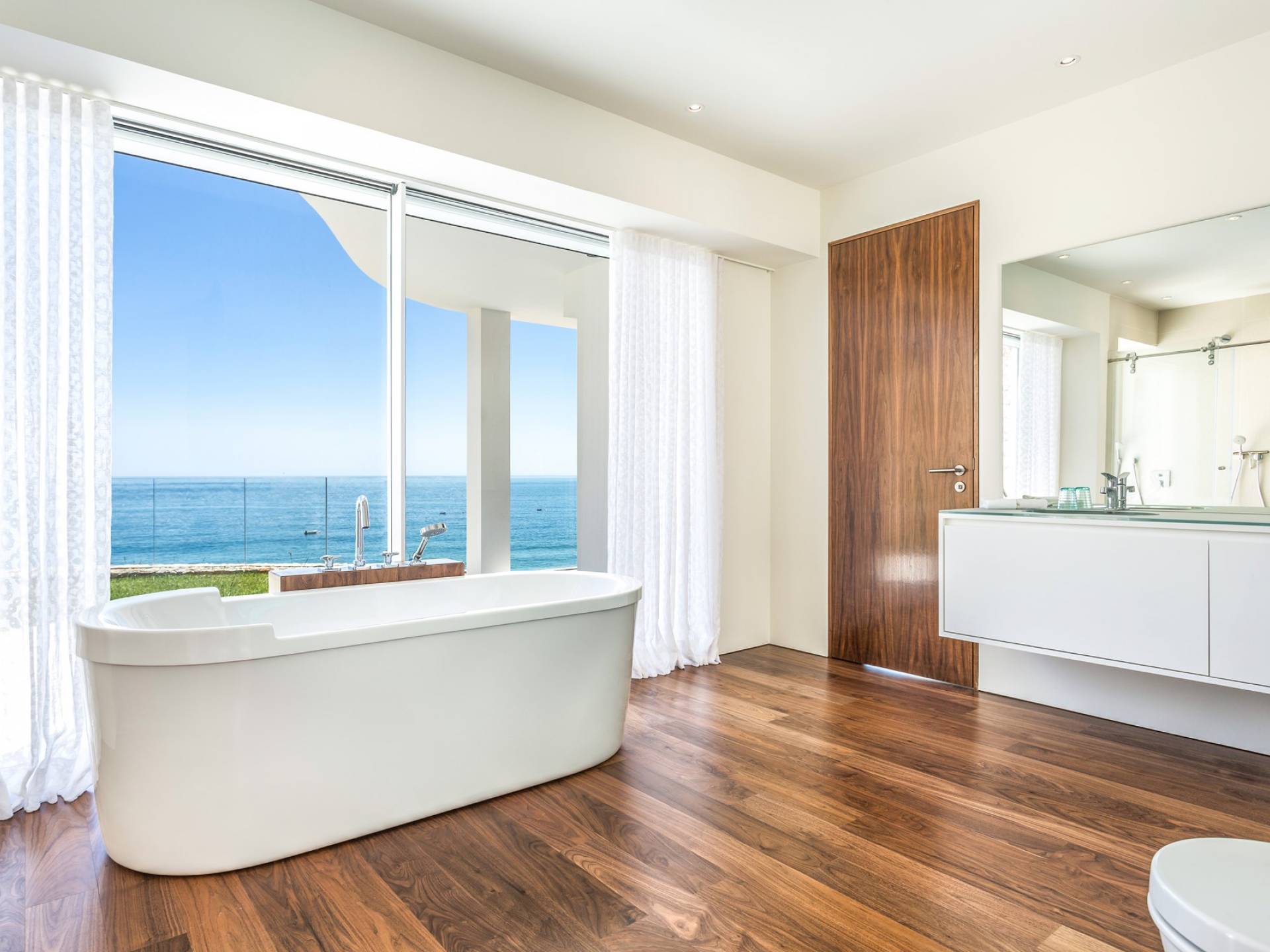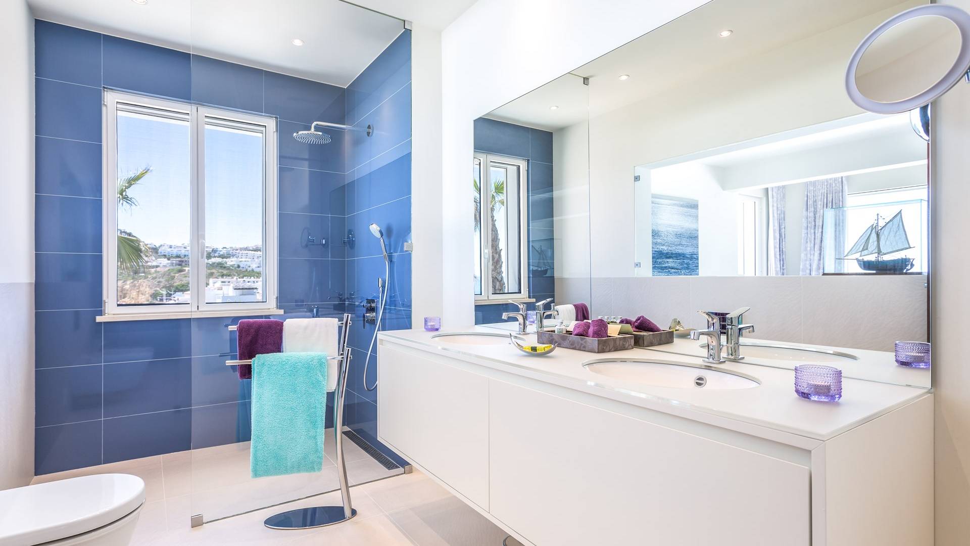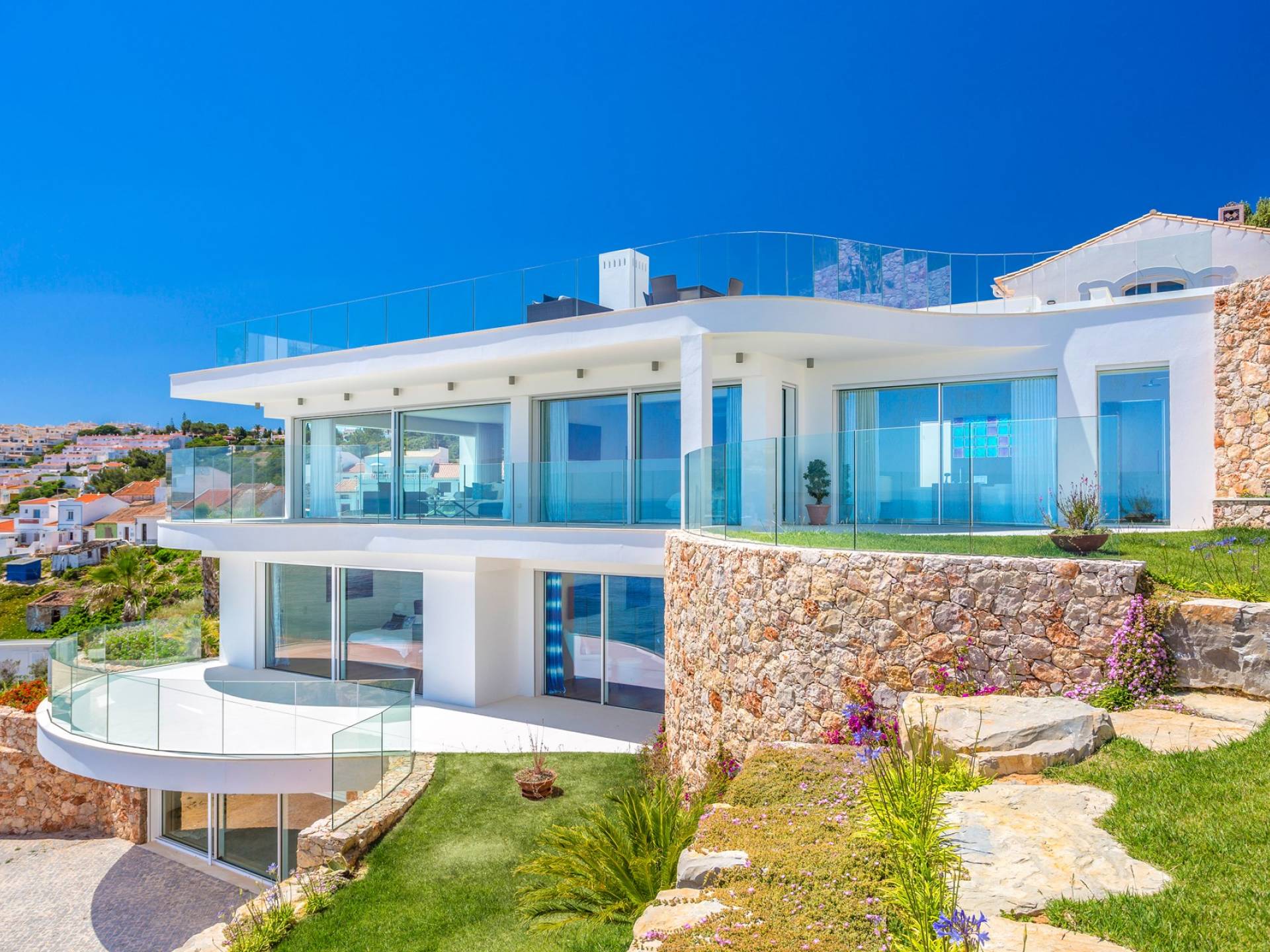 Villa Alegria Algarve consta de 4 dormitorios, amplias puertas corredizas de vidrio que conducen directamente a terrazas, jardines y una piscina privada en la azotea con vista al océano infinito, está decorada en un estilo mediterráneo limpio y contemporáneo, en llamativos blancos, azules, y lilas, con amplias zonas de estar y abundante luz natural que entra por las ventanas.