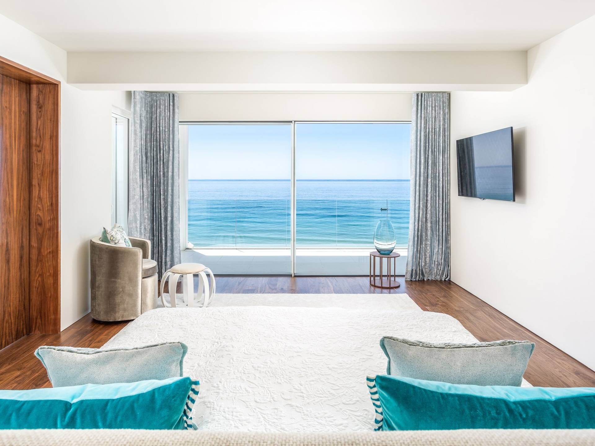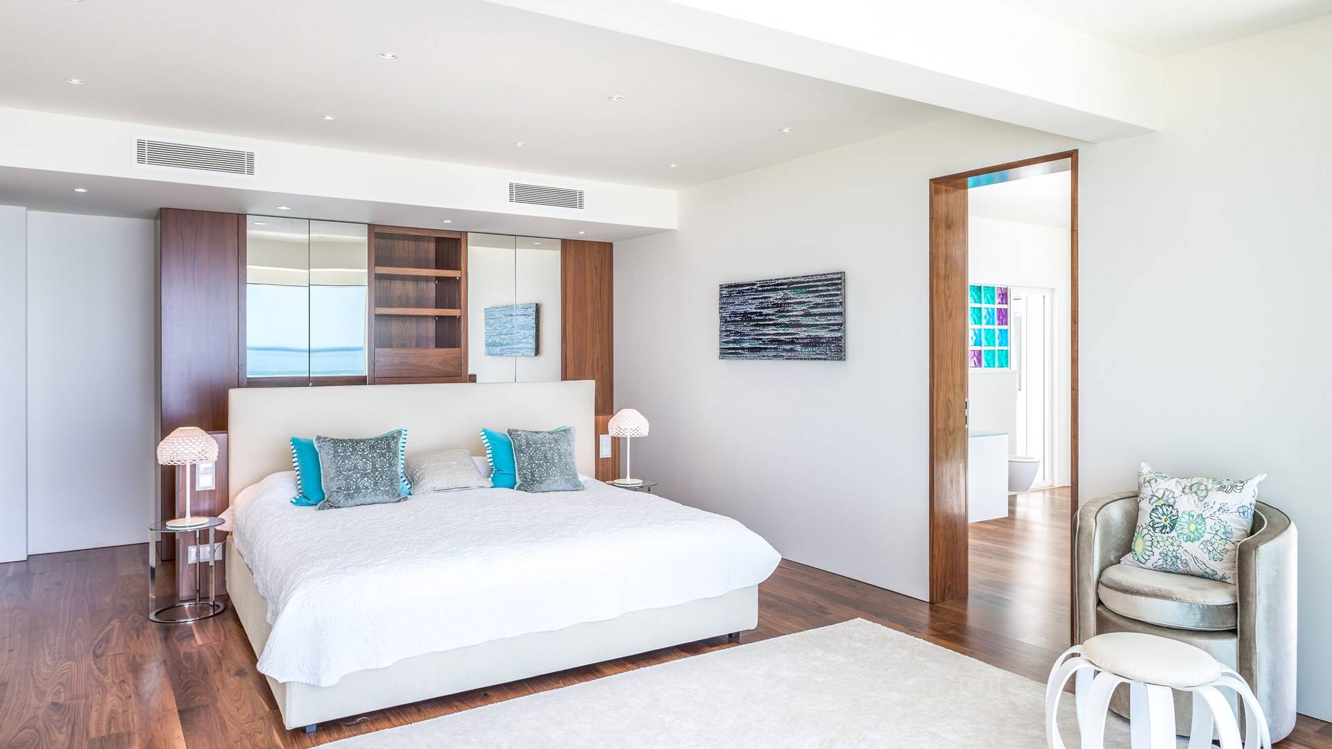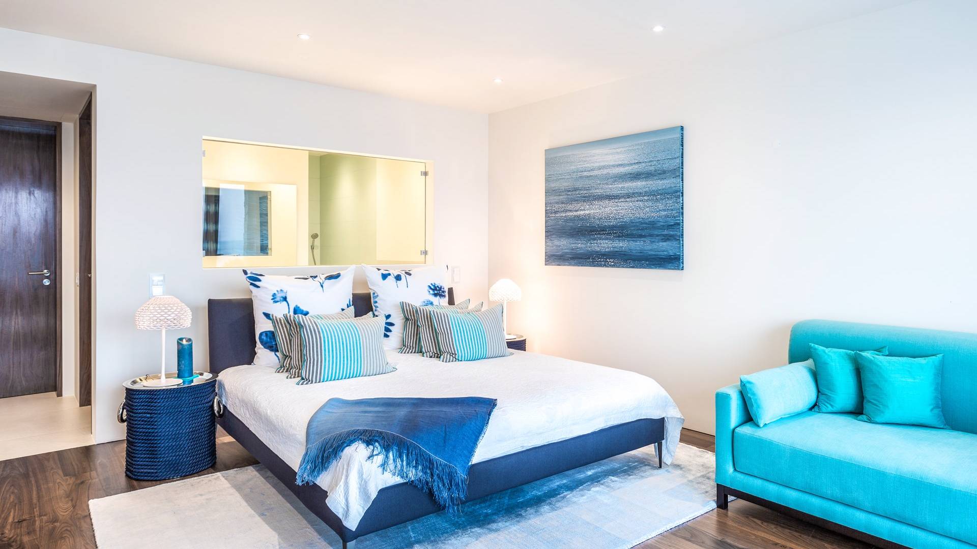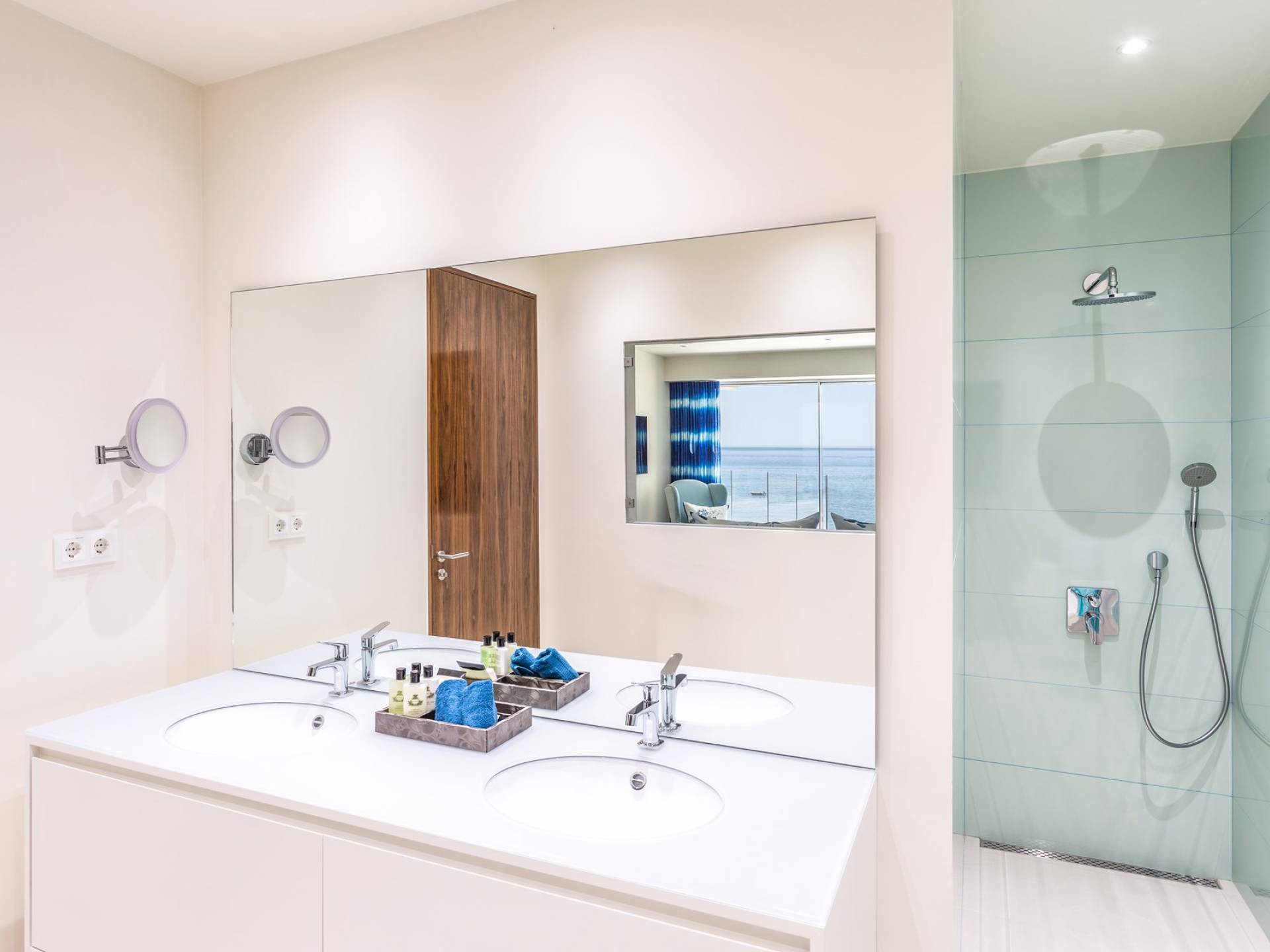 El nivel de entrada tiene dos dormitorios con vista al mar en primera línea, cada uno con una gran cama doble, TV de pantalla plana, cuarto de ducha en suite y vestidor independiente.