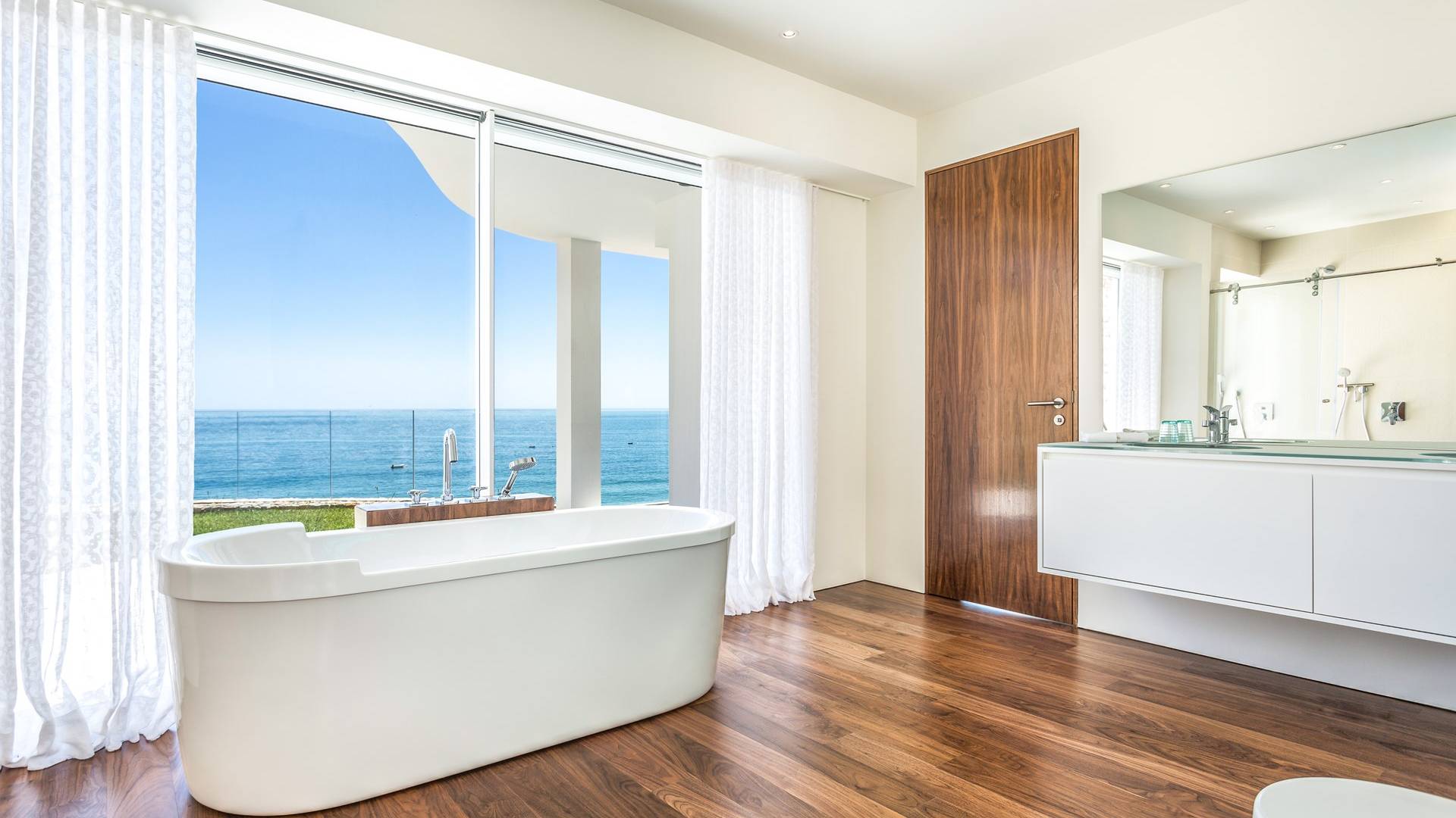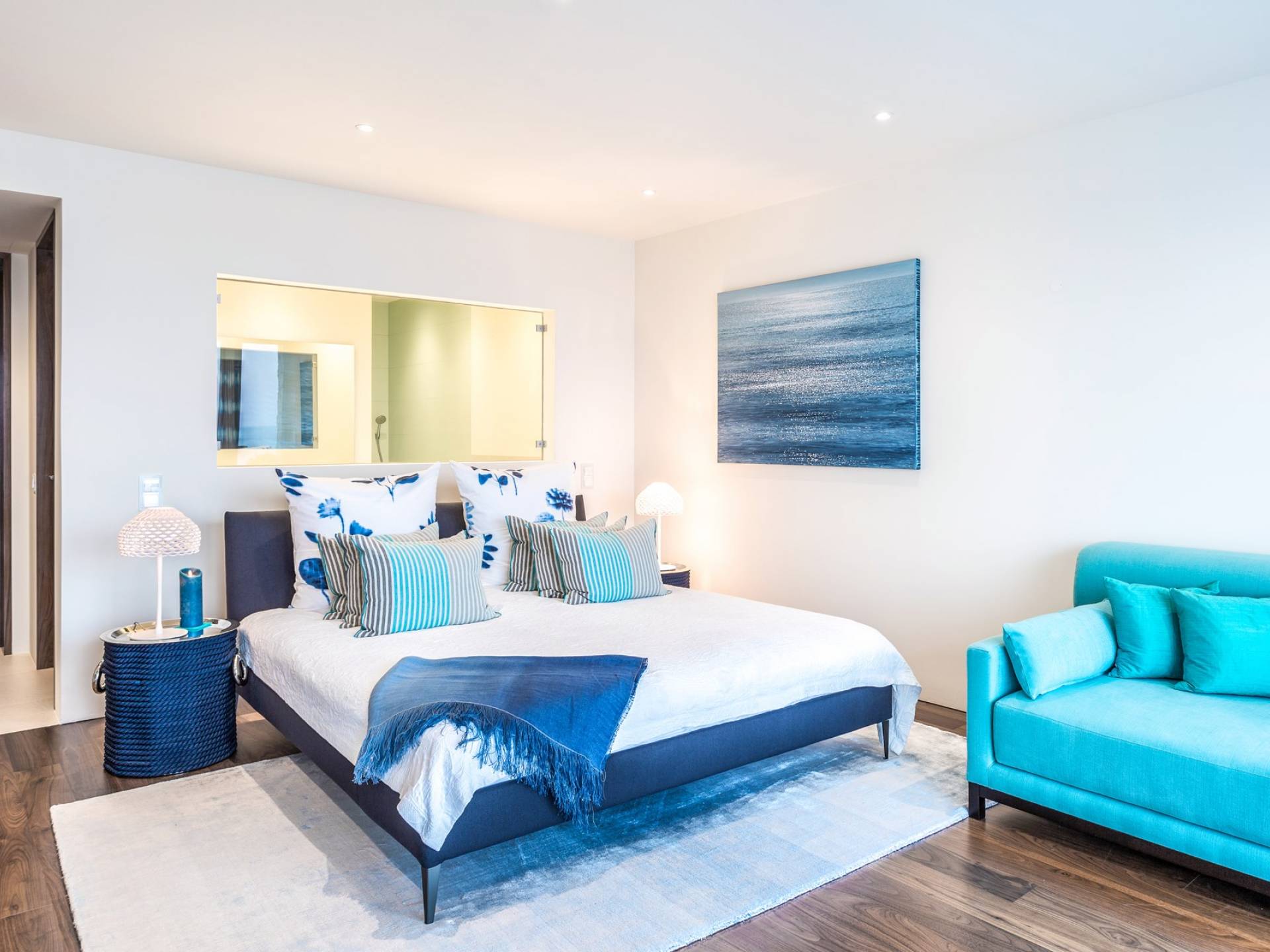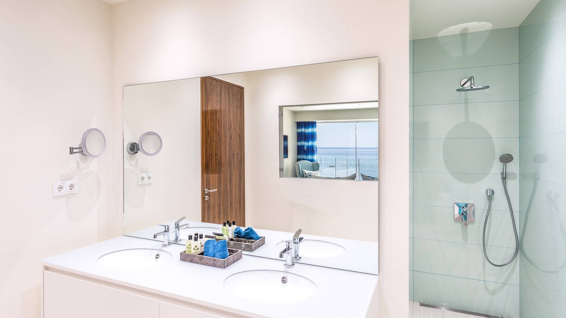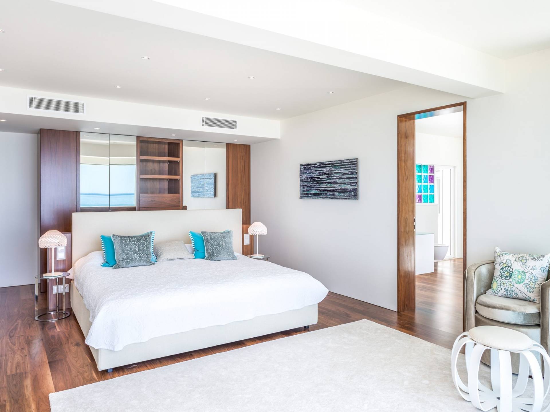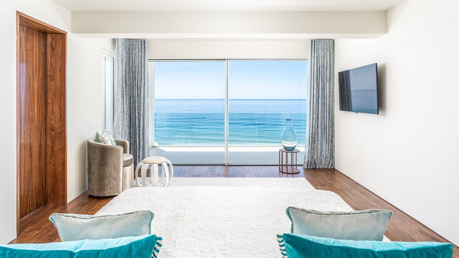 El nivel de entrada tiene dos dormitorios con vista al mar en primera línea, cada uno con una gran cama doble, TV de pantalla plana, cuarto de ducha en suite y vestidor independiente.